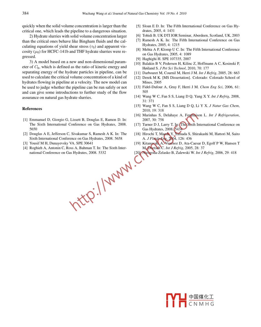 Available online at www.sciencedirect.com| Joumal ofScienceDirect7I Natural GasChemistryEL SEVIERJournal of Natural Gas Chemistry 19(2010)380 ,384www.elsevier.com/locate/jngcA model for estimating flow assurance of hydrate slurry in pipelinesWuchang Wangl*,Yuxing Lil1. Department of Storage and Transportation Engineering, China University of Petroleum, Qingdao 266555, Shandong, China;2. South China university of Technology, Key Laboratory of Enhanced Heat Transfer and Energy Conservation, MOE, Guangzhou 510640, Guangdong, China;3. Guangzhou Institute of Energy Conversion, Chinese Academy of Sciences, Guangzhou 5 10640, Guangdong, ChinaI Manuscript received February 6, 2010; revised April 21, 2010 ]AbstractThe problem of hydrate blockage of pipelines in offshore production is becoming ever-increasing severe because oil fields in ever-increasingunusual environments have been brought in production. HCFC- 141b and THF were selected as the substitutes to study the flow assurance ofthe hydrates in pipelines. There are critical hydrate volume concentrations for these two slurries. Hydrate slurries behave like Bingham fluidsand have high agglomerating tendency when the hydr + volume conqentrations arf larger than the critical ones. Based on rheological behaviorsof these two hydrates, a non-dimensional parameter proposed rotgh studyin, the driving forces of agglomeration among hydrate particles,which shows the agglomerating probability of hydrate particles ip pipeline and ct be used to judge the safety of the pipeline. Moreover, a safemodel to judge the safely flow hydrate surries was pressdhtedand Hr夫AAA中he experimental data, which demonstrates that the model |effective to judge whether the pipeline can be ryp say o not.Key wordshydrate slurry; flow assurance; rheological behavior; afe model1. IntroductionIn this paper, HCFC- 141b and THF were chosen as thesubstitutes, since HCFC- 141b can not unite with water whileOver the past decade, hydrates have become the numberTHF can mix with water very well, to study the flow assur-one issue in flow assurance, especial in offshore condensateance of hydrate slurry on the flow loop. And both of them canpipeline running at high pressure and relative low temperatureform hydrate of structure II at atmosphere pressure. The de-[1,2. However, the limitation of traditional methods by pre-tailed flow behaviors of HCFC- 141b and THF were reportedventing the formation of hydrates is obviously ever-increasingin Refs. [14,15], respectively. In this work the flow assuin costs [3,4]. So there is an interest in developing technologyance was presented in detail and a model to judge the fl(that hydrates can be transported as a slury, while avoidingassurance based on the flow behaviors of hydrate slurries wasdeduced.plugs [5-7].Understanding the formation and flow characters of hy-drates in pipeline is necessary to prevent the formation of2. Experimentalplugs and let pipeline systems work safely [8]. Unfortunately,litle is known about the phenomena involved in the hydrateExperiments on flow characters of hydrate slurry wereplug formation [9]. While many works were devoted to theperformed on the flow loop in Guangzhou Institute of Energystudy of hydrate structures as well as rheological behaviorsConversion (Giec, China). This flow loop (Figure 1), which is .of some kinds of slurries in pipeline and several authors have a two pass loop consisting of a 42.0 mm diameter pipe, 30.0 mstudied the formation of pipeline hydrates and hydrates plugslong, was specially built to perform experiments on hydratewith low-pressure flow system, such as CH3CCl2F (HCFC-slurry in low pressure (no more than 1.5 MPa). The flow loop141b) hydrae, tetrahydrofuran (THF) hydrate, TBAB hydrateis enclosed in a temperature chamber (4.83x 3.30x2.55 m),as well as R11 hydrate, there are short of systematic re-which can keep a stable and constant temperature environmentsearches on hydrates morphology and blockage in pipelinewith a temperature ranging from - 40°C to 80 °C. More de-[10-13]. .tails about the flow loop can be found in Ref. [14].中國(guó)煤化工' Corresponding author. Tel: 0532-86981223-091; E-mail: wangwuchangupc@ 126.comMYHCNM HGCopyrightO2010, Dalian Institute of Chemical PChinese Academy olSciences. All rights reserved.doi: 10.1016/S 10039953(09)60094-3w.st,Journal of Natural Gas Chemistry Vol. 19 No.4 2010381_DP-_B240 rpm and the pressure drop rise began at 18% hydrates at520 rpm. Moreover, the trend of increasing flow loop pres-sure drop with hydrate volume fraction is qualitatively similar4to the increase in viscosity observed in the laboratory rheolog-ical studies [12]. .All these above mentioneQfacts suggest that agglomer-ation may be the cause of the-suddenly and/or steadily in-crease at the critical volume concentration zone of hydrate.Hydrate particles begin to agglomerate and slush-like hydratesare formed when the solid volume concentration reaches thegure 1. Schematic of the flow loop. 1- _Ta 2- _Mg etic centrifu-criticalcentration, which may be responsible forpump; 3- - Flowmeter; 4--Buffer tankelines in offshore production.o-Drain valve; 7- Pressure sensor;8- T hpe atures sor; A- Sideline,! B- - Sideline for flowmeter, C- Dip part,1 ewpe,E- Venrcalpart3.2. eounve aviors of hydrate slurries in pipelineCommercial THF with a certit edpurity pf 99.9 % andHCFC-141b of 99.5 wt% certified purity (4 pjiang 9 nhuanstand the agglomerating characters of hy-Chemical Co., Zhejiang, China) were used in these t以peri-drate particles when the hydrate volume concentrations arements. More details about the experimental protocols of theselarger than the critical ones, rheological behaviors of thesetwo materials can be found in Refs. [14,15].two kinds of hydrates were analyzed with the assistance ofexperimental data on their flow behaviors. The following sec-3. Results and discussionstion aims at the correlation of the measured data (Q, OP) withthe classical rheological parameters: the sh