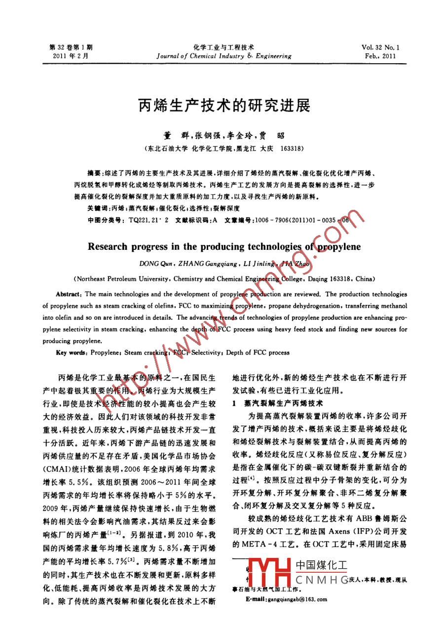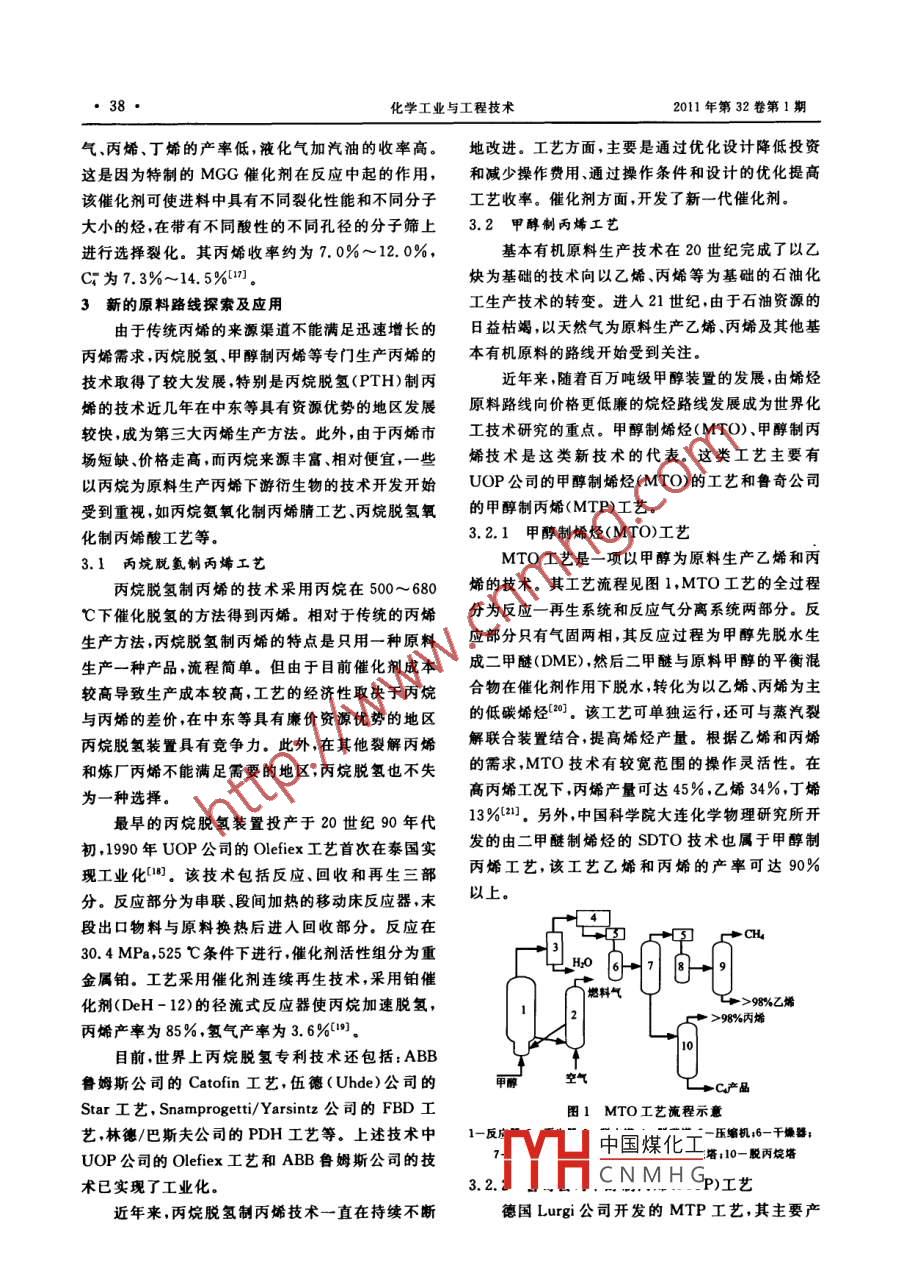 第32卷第1期化學(xué)工業(yè)與工程技術(shù)Vol 32 No. 12011年2月Journal of Chemical Industry &. EngineeringFeb.,2011丙烯生產(chǎn)技術(shù)的研究進(jìn)展董群,張鋼強(qiáng),李金玲,賈昭(東北石油大學(xué)化學(xué)化工學(xué)院,黑龍江大慶163318)摘要:綜述了丙烯的主要生產(chǎn)技術(shù)及其進(jìn)展詳細(xì)介紹了烯烴的蒸汽裂解、催化裂化優(yōu)化增產(chǎn)丙烯丙烷脫氫和甲醇轉(zhuǎn)化成烯烴等制取丙烯技術(shù)。丙烯生產(chǎn)工藝的發(fā)展方向是提高裂解的選擇性,進(jìn)一步提高催化裂化的裂解深度并加大重質(zhì)原料的加工力度,以及尋找生產(chǎn)丙烯的新原料關(guān)鍵詞:丙烯;蒸汽裂解;催化裂化;選擇性;裂解深度中圖分類號:TQ221.21·2文獻(xiàn)標(biāo)識碼:A文章編號:1006-7906(2011)01-0035-06Research progress in the producing technologies of propyleneDONG Qun, ZHANG Gangqiang, LI Jinling, JIA ZhaoNortheast Petroleum University, Chemistry and Chemical Engineering College, Daqing 163318, China)Abstract: The main technologies and the development of propylene production are reviewed. The production technologiesof propylene such as steam cracking of olefins, FCC to maximizing propylene, propane dehydrogenation, transferring methanolinto olefin and so on are introduced in details. the advancing trends of technologies of propylene production are enhancing pro-pylene selectivity in steam cracking, enhancing the depth. of FCC process using heavy feed stock and finding new sources forKey words: Propylene: Steam cracking: FCC, Selectivity Depth of FCC process丙烯是化學(xué)工業(yè)最基本的原料之一,在國民生地進(jìn)行優(yōu)化外,新的烯烴生產(chǎn)技術(shù)也在不斷進(jìn)行開產(chǎn)中起著極其重要的作用。丙烯行業(yè)為大規(guī)模生產(chǎn)發(fā)試驗,有些已進(jìn)行工業(yè)化應(yīng)用。行業(yè),即使是技術(shù)經(jīng)濟(jì)性能的較小提高也會產(chǎn)生較1蒸汽裂解生產(chǎn)丙烯技術(shù)大的經(jīng)濟(jì)效益。因此人們對該領(lǐng)域的科技開發(fā)非常為提高蒸汽裂解裝置丙烯的收率,許多公司開重視,科技投人歷來較大,丙烯產(chǎn)品鏈技術(shù)開發(fā)一直發(fā)了增產(chǎn)丙烯的技術(shù),概括來說主要是將烯烴歧化十分活躍。近年來丙烯下游產(chǎn)品鏈的迅速發(fā)展和和烯烴裂解技術(shù)與裂解裝置結(jié)合,從而提高丙烯的丙烯供應(yīng)量的不足存在矛盾,美國化學(xué)品市場協(xié)會收率。烯烴歧化反應(yīng)(又稱易位反應(yīng)、復(fù)分解反應(yīng))(CMAI)統(tǒng)計數(shù)據(jù)表明2006年全球丙烯年均需求是指在金屬催化下的碳-碳雙鍵斷裂并重新結(jié)合的增長率5.5%該組織預(yù)測2006~2011年間全球過程。按照反應(yīng)過程中分子骨架的變化,可分為丙烯需求的年均增長率將保持略小于5%的水平。開環(huán)復(fù)分解、開環(huán)復(fù)分解聚合、非環(huán)二烯復(fù)分解聚2009年,丙烯產(chǎn)量繼續(xù)保持快速增長,由于生物燃合閉環(huán)復(fù)分解及交又復(fù)分解等5種反應(yīng)料的相關(guān)法令會影響汽油需求,其結(jié)果反過來會影較成熟的烯烴歧化工藝技術(shù)有ABB魯姆斯公響煉廠的丙烯產(chǎn)量1-。另據(jù)報道,到2010年,我司開發(fā)的OCT工藝和法國 Axens(FP)公司開發(fā)國的丙烯需求量年均增長速度為5.8%,高于丙烯的META-4工藝。在OCT工藝中,采用固定床易產(chǎn)能的平均增長率5.7%。丙烯需求量不斷增加中國煤化工的同時,其生產(chǎn)技術(shù)也在不斷發(fā)展和更新,原料多樣CNMHG慶人,本科教授現(xiàn)從化、低能耗、提高丙烯收率是丙烯技術(shù)發(fā)展的大方事石油與天向。除了傳統(tǒng)的蒸汽裂解和催化裂化在技術(shù)上不斷Ermall: gangqiangab@ 163, co36·化學(xué)工業(yè)與工程技術(shù)2011年第32卷第1期位反應(yīng)器,以乙烯和丁烯為原料。催化劑促使乙烯分子的C和C烯烴,生成的長鏈烴進(jìn)一步在β位和2-丁烯反應(yīng)生成丙烯同時使1-丁烯異構(gòu)化為斷裂。理論上,催化裂化產(chǎn)物應(yīng)該含有大量的丙烯,2-丁烯。將反應(yīng)產(chǎn)物分餾得到高純度聚合級丙烯,但丙烯的實際產(chǎn)率并沒有預(yù)期的高。這是由于在提乙烯和丁烯循環(huán)使用。該工藝對丙烯的選擇性大于升管以及沉降器的稀相中發(fā)生的二次反應(yīng)飽和或破98%正丁烯的轉(zhuǎn)化率為85%~92%。乙烯和丁烯壞了烯烴,其中最為嚴(yán)重的是氫轉(zhuǎn)移反應(yīng)實際上影進(jìn)料可來自蒸汽裂解裝置或煉油廠,丁烯也可來自響烯烴產(chǎn)率的很多副反應(yīng)都與氫轉(zhuǎn)移反應(yīng)有關(guān)乙烯二聚{5。因此,為了多產(chǎn)丙烯,FCC技術(shù)應(yīng)強(qiáng)化裂化反應(yīng),抑目前,世界范圍內(nèi)利用烯烴歧化反應(yīng)制備丙烯制氫轉(zhuǎn)移反應(yīng)并已工業(yè)化的工藝有 ABB Lummus公司所持有的近年來,世界各石化公司通過優(yōu)化催化劑和操OCT-C4歧化反應(yīng)工藝,共有3套工業(yè)裝置在運(yùn)行作條件,已經(jīng)使煉廠有效地提高了丙烯的產(chǎn)量。中,其中1套由日本三菱株式會社于208年投Fcc裝置提高丙烯收率的方法主要是使用ZsM-5產(chǎn),另有IFP-CPC公司的1套CCR-Meta4等催化劑控制氫轉(zhuǎn)移反應(yīng)提高烯烴的產(chǎn)率。傳統(tǒng)歧化反應(yīng)工藝正在臺灣的示范裝置上運(yùn)行FCC裝置的丙烯收率僅為原料質(zhì)量的3%~5%通這些烯烴歧化裝置或與蒸
