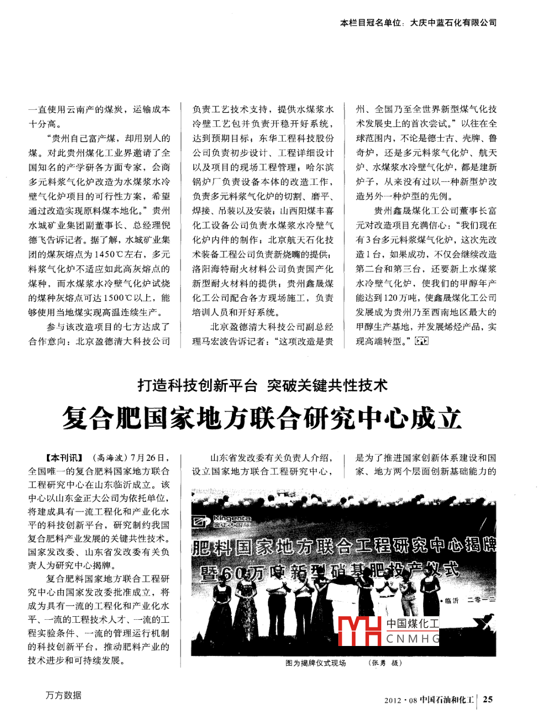 本欄目冠名單位:大慶中藍(lán)石化有限公司-直使用云南產(chǎn)的煤炭,運輸成本負(fù)責(zé)工藝技術(shù)支持,提供水煤漿水州、全國乃至全世界新型煤氣化技十分高。冷壁工藝包并負(fù)責(zé)開穩(wěn)開好系統(tǒng),術(shù)發(fā)展史上的首次嘗試?!币酝谌百F州自己富產(chǎn)煤,卻用別人的達(dá)到預(yù)期目標(biāo),東華工程科技股份球范圍內(nèi),不論是德士古、殼牌、魯煤。對此貴州煤化工業(yè)界邀請了全公司負(fù)責(zé)初步設(shè)計、工程詳細(xì)設(shè)計奇爐,還是多元料漿氣化爐、航天國知名的產(chǎn)學(xué)研各方面專家,會商以及項目的現(xiàn)場工程管理;哈爾濱爐、水煤漿水冷壁氣化爐,都是建新多元料漿氣化爐改造為水煤漿水冷鍋爐廠負(fù)責(zé)設(shè)備本體的改造工作,爐子,從來沒有過以一種新型爐改壁氣化爐項目的可行性方案,希望負(fù)責(zé)多元料漿氣化爐的切割、磨平、造另外一種爐型的先例。通過改造實現(xiàn)原料煤本地化。”貴州焊接、吊裝以及安裝;山西陽煤豐喜貴州鑫晟煤化工公司董事長富水城礦業(yè)集團副董事長、總經(jīng)理倪化工設(shè)備公司負(fù)責(zé)水煤漿水冷壁氣元對改造項目充滿信心:“我們現(xiàn)在德飛告訴記者。據(jù)了解,水城礦業(yè)集化爐內(nèi)件的制作,北京航天石化技有3臺多元料漿煤氣化爐,這次先改團的煤灰熔點為1450C左右,多元術(shù)裝備工程公司負(fù)責(zé)新燒嘴的提供;造1臺,如果成功,不僅會繼續(xù)改造料漿氣化爐不適應(yīng)如此高灰熔點的洛陽海特耐火材料公司負(fù)責(zé)國產(chǎn)化第二臺和第三臺,還要新上水煤漿煤種,而水煤漿水冷壁氣化爐試燒新型耐火材料的提供;貴州鑫晟煤水冷壁氣化爐,使我們的甲醇年產(chǎn)的煤種灰熔點可達(dá)1500C以上,能化工公司配合各方現(xiàn)場施工,負(fù)責(zé)能達(dá)到120萬噸,使鑫晟煤化工公司夠使用當(dāng)?shù)孛簩崿F(xiàn)高溫連續(xù)生產(chǎn)。培訓(xùn)人員和開好系統(tǒng)。發(fā)展成為貴州乃至西南地區(qū)最大的參與該改造項目的七方達(dá)成了北京盈德清大科技公司副總經(jīng)甲醇生產(chǎn)基地,并發(fā)展烯烴產(chǎn)品,實合作意向:北京盈德清大科技公司理馬宏波告訴記者:“這項改造是貴現(xiàn)高端轉(zhuǎn)型。”打造科技創(chuàng)新平臺突破關(guān)鍵共性技術(shù)復(fù)合肥國家地方聯(lián)合研究中心成立[本刊訊] (高海波) 7月26日,山東省發(fā)改委有關(guān)負(fù)責(zé)人介紹,是為了推進(jìn)國家創(chuàng)新體系建設(shè)和國全國唯- -的復(fù) 合肥料國家地方聯(lián)合設(shè)立國家地方聯(lián)合工程研究中心,家、地方兩個層面創(chuàng)新基礎(chǔ)能力的工程研究中心在山東臨沂成立。該中心以山東金正大公司為依托單位,將建成具有一流工程化和產(chǎn)業(yè)化水平的科技創(chuàng)新平臺,研究制約我國復(fù)合肥料產(chǎn)業(yè)發(fā)展的關(guān)鍵共性技術(shù)。肥料國家地方聯(lián)合工程研究中心揭牌國家發(fā)改委、山東省發(fā)改委有關(guān)負(fù)責(zé)人為研究中心揭牌。復(fù)合肥料國家地方聯(lián)合工程研暨60萬電新型硝基肥投產(chǎn)義式究中心由國家發(fā)改委批準(zhǔn)成立,將成為具有一-流的工程化和產(chǎn) 業(yè)化水平、-流的工程技術(shù)人才、一流的工中國煤化工程實驗條件、一流的管理運行機制MYHCNMHG的科技創(chuàng)新平臺,推動肥料產(chǎn)業(yè)的技術(shù)進(jìn)步和可持續(xù)發(fā)展。圖為揭牌儀式現(xiàn)場張勇攝)2012 . 08國石油和化工| 25