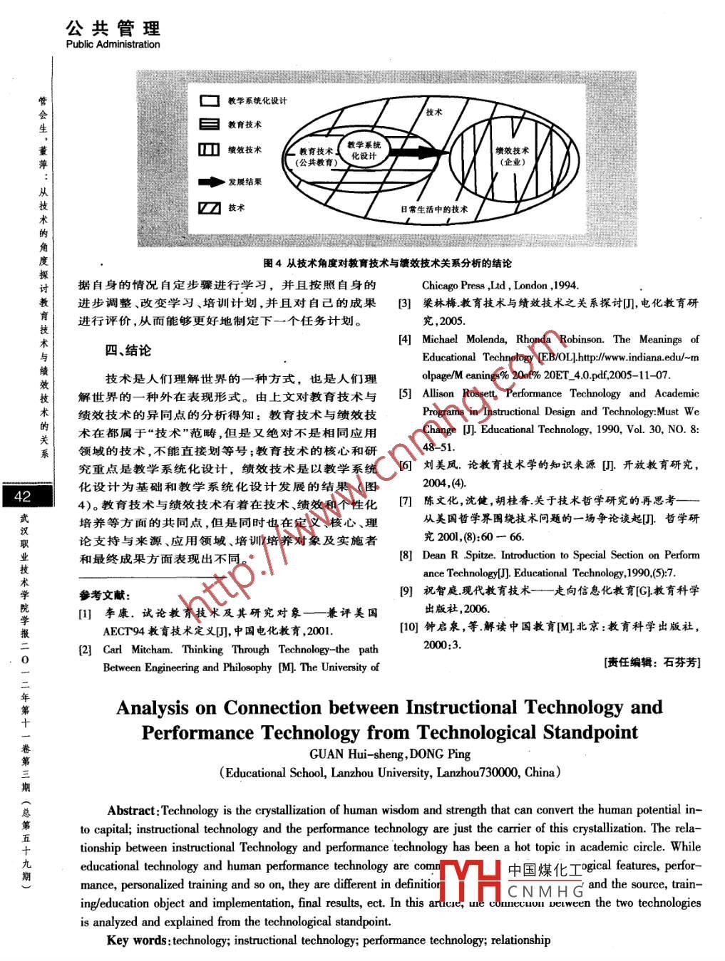 Journal of Wuhan Polytechnic .●公共管理●從技術(shù)的角度探討教育技術(shù)與績效技術(shù)的關(guān)系管會生,董萍(蘭州大學(xué)教育學(xué)院,甘肅蘭州730000)摘要:技術(shù)是可以將人類的潛 能轉(zhuǎn)化為資本的人類智慧與力量的結(jié)晶,教育技術(shù)與績效技術(shù)就是這種結(jié)晶的承載體。教育技術(shù)與績救技術(shù)的關(guān)系是學(xué)術(shù)界討論的熱點(diǎn),教育技術(shù)與績效技術(shù)有著在技術(shù)、績效和個性化培養(yǎng)等方面的共同點(diǎn),但是同時也在定義、核心、理論支持與來源、應(yīng)用領(lǐng)城、培訓(xùn)/培養(yǎng)對象及實(shí)施者和最終成果方面表現(xiàn)出不同特點(diǎn)。關(guān)鍵詞:技術(shù);教育技術(shù);績效技術(shù)中圖分類號: C4文獻(xiàn)標(biāo)識碼: A文章編號: 1671-931X (2012) 03- 0038-058武漢一、 學(xué)術(shù)界關(guān)于教育技術(shù)與績效技術(shù)關(guān)系的討技術(shù)應(yīng)用于教育領(lǐng)城和企業(yè)單位便產(chǎn)生了教育論技術(shù)與績效技術(shù)?,F(xiàn)代社會正在不斷地向著經(jīng)濟(jì)化、信息化市場化的方向發(fā)展,對于技術(shù)的要求也在不(一)技術(shù)斷提升,教育技術(shù)和績效技術(shù)在歷史的演變中不斷完技術(shù)是一套有序化的、理智的程序,它可以將人更新著內(nèi)容 ,拓寬著各自的領(lǐng)域,同時也在向著專業(yè)類的潛能轉(zhuǎn)化為資本(Gilbert, 1996)。馬克思主義哲化的方向不斷完善。學(xué)從辯證唯物主義和歷史唯物主義的高度揭示了技美國技術(shù)哲學(xué)家卡爾.米切姆(Carl Micham)從0術(shù)的起源及本質(zhì),指出技術(shù)起源于人類對工具的使結(jié)構(gòu)組成的角度 ,將技術(shù)分成作為物品的技術(shù)、作為用和對工具制造的勞動?!皠趧邮紫仁侨撕妥匀恢g活動的技術(shù)、作為知識的技術(shù)和作為意志的技術(shù)四類年的過程,是人以自身的活動來引起、調(diào)整和控制人和日。本文所提及的技術(shù)指的是作為知識的技術(shù),并從這自然之間的物質(zhì)變換的過程。人自身作為一種自然一角度出發(fā)來探討教育技術(shù)與績效技術(shù)的關(guān)系。力與自然物質(zhì)相對立。為了在對自身生活有用的形(二)相關(guān)討論式上占有自然物質(zhì),人就使他身上的自然力一-臂有學(xué)者認(rèn)為,績效技術(shù)是以教育技術(shù)的基礎(chǔ)上和腿頭和手運(yùn)動起來。當(dāng)他通過這種運(yùn)動作用于他發(fā)展而來,并且大部分的績效技術(shù)培訓(xùn)師都是教育期身外的自然并改變自然時,也就同時改變他自身的技術(shù)專業(yè)畢業(yè),績效技術(shù)目前在學(xué)校只是作為教育自然啊。也就是說,技術(shù)是人類智慧與力量的結(jié)晶,技術(shù)專業(yè)的下設(shè)課程來設(shè)置,如印第安那大學(xué)教學(xué)是人類為了改造世界的產(chǎn)物,同時也是人類生存和系統(tǒng)技術(shù)系的“教育技術(shù)學(xué)基礎(chǔ)”課程中,有大量關(guān)發(fā)展的基礎(chǔ),它是所有知識經(jīng)驗(yàn)、方法技能、物質(zhì)工于績效技術(shù)的內(nèi)容(績效技術(shù)的定義、過程模型、專具、方式手段等的結(jié)合體。業(yè)組織,績效分析、教育技術(shù)與績效技術(shù)的區(qū)別等中國煤化工收稿日期:2012-03-11YHCNMH G作者簡介:曾會(196-),男,漢族,甘肅蘭州人,蘭州大學(xué)教育學(xué)院教授,博士,質(zhì)士生導(dǎo)師,教育部高等學(xué)校計(jì)算機(jī)基礎(chǔ)課程教學(xué)指導(dǎo)委員會理工分委會物書長,研究方向:計(jì)算機(jī)、信息技術(shù):董年(1986-),女,漢族,河南省焦作人,蘭州大學(xué)教育學(xué)院碩土研究生,研究方向:信息與網(wǎng)絡(luò)教育方向。公共管理Public Administration管|評價(jià)需求設(shè)計(jì)并安施教學(xué)董|堂日的日標(biāo)分析學(xué)習(xí)著和環(huán)境從技設(shè)計(jì)井實(shí)術(shù)總結(jié)性評價(jià)的角度|團(tuán)1迪克與凱里教學(xué)設(shè)計(jì)的系統(tǒng)化方法模型探|當(dāng)前狀態(tài)有] 當(dāng)前如何績效分析成果:續(xù)效差距原因分析成果:產(chǎn)生績效差距的根本原因績干預(yù)設(shè)計(jì)成果:設(shè)計(jì)縮小績效差距的步驟,按近期望狀態(tài)實(shí)施變革期望狀態(tài)關(guān)成果:組織、個人等各個層次績效的提高應(yīng)該如何系丁成果:針對投入回報(bào)和結(jié)果的評估40武圄2績效技術(shù)應(yīng)用的工作流程圖職我們面對的挑戰(zhàn)是前所未有的,誰都無法保證自已技術(shù)的應(yīng)用流程(圖2)很直接得展示了績效技術(shù)的業(yè)永遠(yuǎn)是國際經(jīng)濟(jì)市場上的成功者,為了成功,必須發(fā)應(yīng)用領(lǐng)域-有著組織結(jié)構(gòu)嚴(yán)密、管理規(guī)范、結(jié)果驅(qū)揮創(chuàng)造力及利用一切可利用的資源。在這個新經(jīng)濟(jì)動和生產(chǎn)率導(dǎo)向等特點(diǎn)的商業(yè)、企業(yè)部門。學(xué)時代,經(jīng)濟(jì)競爭力的增強(qiáng)不再取決于工業(yè)革命的機(jī)(四)理論來源及支持院器或計(jì)算機(jī),不再取決于成本的降低或是政策法律任何技術(shù)的傳承與發(fā)展都不是簡單的口耳相.報(bào)的制定,而是取決于人'這個至關(guān)重要的資源。傳,要將其升級成為知識層面還要借助于理論的支二(三)