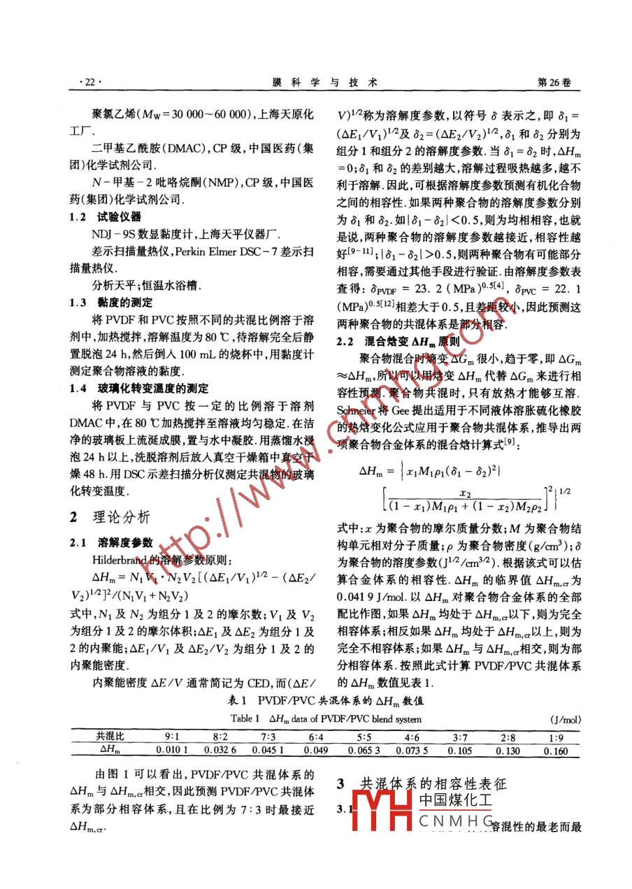第26卷第5期膜科學(xué)與技術(shù)Vol.26 No. 52006年10月MEMBRANE SCIENCE AND TECHINOLOGYOct.2006文章編號(hào): 1007 - 8924(2006)05 - 0021 - 05聚偏氟乙烯/聚氯乙烯相容性研究高春梅',奚旦立',楊曉波',孟彥賓2(1.東華大學(xué)環(huán)境科學(xué)與工程學(xué)院,上海200051; 2.上海樂美文具有限公司研發(fā)部,上海200071)摘要:采用溶解度參數(shù)法和混合焓變理論預(yù)測(cè)聚偏氟乙烯(PVDF)/聚氯乙烯(PVC)共混體系為部分相容體系,并用共溶劑法、黏度法、微分掃描量熱法判斷聚偏氟乙烯/聚氯乙烯的相容性.結(jié)果表明:兩者屬于部分相容體系,與理論預(yù)測(cè)相符,為后續(xù)制備聚偏氟乙烯/聚氯乙烯纖維膜奠定理論基礎(chǔ).關(guān)鍵詞:聚偏氟乙烯;聚氯乙烯;相容性;共混物中圖分類號(hào): X703文獻(xiàn)標(biāo)識(shí)碼: A當(dāng)今合成聚合物已經(jīng)成為工、農(nóng)業(yè)生產(chǎn)和人們已經(jīng)有上百種重要的聚合共混物相繼問世.生活不可缺少的一類重要材料.但是,隨著現(xiàn)代科學(xué)聚合物之間的相容性是選擇合適共混方法的重技術(shù)的日新月異的發(fā)展,對(duì)聚合物材料提出了日益要依據(jù) ,也是決定共混物形態(tài)結(jié)構(gòu)和性能的關(guān)鍵因廣泛和苛刻的要求.例如,期望聚合物材料既耐高溫素.因此了解聚合物之間的相容性是研究聚合物共又易于加工成型;既有卓越的韌性又有較高的硬度;混物的基礎(chǔ).聚合物共混物(polymerblend)是指兩不僅性能良好,而且價(jià)格低廉.對(duì)于多種多樣的要種或兩種以上均聚物或共聚物的混合物,又稱聚合求,單一的聚合物往往難以滿足[1].物合金或高分子合金.研究這種共混物相容性的方為了獲得綜合性能理想的聚合物材料,人們做法有微分掃描量熱法(DSC)、動(dòng)力學(xué)分析法了大量的研究工作.除了繼續(xù)研制合成新的聚合物(DMA)、逆流氣相色譜( IGC)和電子顯微鏡等[3].外,還對(duì)已能制備的聚合物進(jìn)行各種各樣的改性.將有關(guān)聚偏氟乙烯與其他聚合物相容性的報(bào)道很不同種類聚合物加以混合,形成聚合物共混物是一多.孫漓青等[4]研究了聚偏氟乙烯磺化聚砜的相種卓有成效的改性途徑.近年來這種改性方法在高容性;程供斌等[5]研究了聚偏氟乙烯/聚丙烯腈的分子工業(yè)中日益引起興趣和重視[21.相容性;王湛等[6]研究了聚偏氟乙烯/醋酸纖維素聚合物共混改性是高分子材料科學(xué)和工程領(lǐng)域的相容性;張兆斌等[7]研究了聚偏氟乙烯/聚苯乙中的一個(gè)重要分支.將不同種類的聚合物采用物理烯的相容性;齊文玉[8]研究了聚偏氟乙烯/聚醚砜或化學(xué)的方法共混,不僅可以顯著改善原聚合物的的相容性等.但對(duì)聚偏氟乙烯與聚氯乙烯的報(bào)道卻性能,形成具有優(yōu)異綜合性能的聚合物體系,而且可很少.本文通過理論分析及實(shí)驗(yàn)測(cè)試探討了聚偏氟以極大地降低聚合物材料開發(fā)和研制過程中的費(fèi)乙烯/聚氯乙烯的相容性,結(jié)果說明兩者屬于部分相用,降低成本[1].因此聚合物的共混改性對(duì)于獲得容體系.綜合性能較為理想的高分子材料,提高材料的使用1試驗(yàn)試劑及儀器性能、改善加工性能、降低生產(chǎn)成本都具有非常重要的意義.自從本世紀(jì)40年代丁氰橡膠改性聚氯乙烯1.1 試驗(yàn)試劑和橡膠增韌聚苯乙烯的開發(fā)成功并且工業(yè)化生產(chǎn),聚偏氟乙烯(型號(hào)FR904),上海三愛富公司.收稿日期: 2005 -01- 17;修改稿收到日期: 2005 -06-02.基金項(xiàng)目:上海市科委重點(diǎn)科技攻關(guān)項(xiàng)目(012312032)中國(guó)煤化工作者簡(jiǎn)介:高春梅,女, (1976-),河北石家莊人,在讀博士研究MHCNMHG.漠科學(xué)與技術(shù)第26卷聚氯乙烯(Mw = 30 000~60 000),上海天原化V)14稱為溶解度參數(shù),以符號(hào)δ表示之,即δ=工廠.(OE[/V])142及82=(OE2/V2)4,δ和δ2分別為二甲基乙酰胺(DMAC),CP級(jí),中國(guó)醫(yī)藥(集組分1和組分2的溶解度參數(shù).當(dāng)δ1=82時(shí),△Hm團(tuán))化學(xué)試劑公司.=0;δ1和δ2的差別越大,溶解過程吸熱越多,越不N-甲基- 2吡咯烷酮(NMP),CP級(jí),中國(guó)醫(yī)利于溶解.因此,可根據(jù)溶解度參數(shù)預(yù)測(cè)有機(jī)化合物藥(集團(tuán))化學(xué)試劑公司.之間的相容性.如果兩種聚合物的溶解度參數(shù)分別1.2試驗(yàn)儀器為δ和δ2.如|δ1- 82|<0.5,則為均相相容,也就NDJ - 9S數(shù)顯黏度計(jì),上海天平儀器廠.是說,兩種聚合物的溶解度參數(shù)越接近,相容性越差示掃描量熱儀,Perkin Elmer DSC- 7差示掃好9-11;181- 82|>0.5,則兩種聚合物有可能部分描量熱儀.相容,需要通過其他手段進(jìn)行驗(yàn)證.由溶解度參數(shù)表分析天平;恒溫水浴槽.查得: 8pvDF = 23. 2 (MPa)0.5[4], δpvc= 22.11.3黏度的測(cè)定(MPa)0.s[12]相差大于0. 5,且差距較小,因此預(yù)測(cè)這將PVDF和PVC按照不同的共混比例溶于溶兩種聚合物的共混體系是部分相容.劑中,加熱攪拌,溶解溫度為80 C ,待溶解完全后靜2.2混合焓變 AHm原則.置脫泡24 h,然后倒人100 mL的燒杯中,用黏度計(jì)聚合物混合時(shí)熵變SGm很小,趨于零,即OGm測(cè)定聚合物溶液的黏度.≈OHm,所以可以用焓變OHm代替OGm來進(jìn)行相1.4玻璃化轉(zhuǎn)變溫度的測(cè)定容性預(yù)測(cè).聚合物共混時(shí),只有放熱才能夠互溶. .將PVDF與PVC按一定的比例溶于溶劑Schneier將Gee提出適用于不同液體溶脹硫化橡膠D