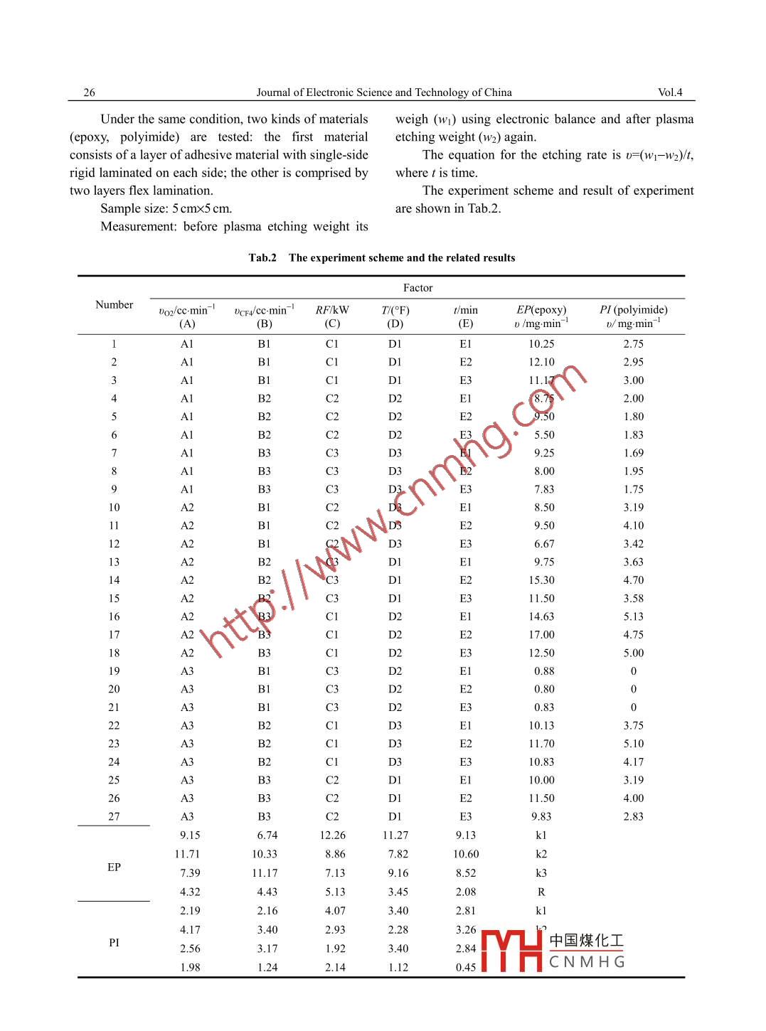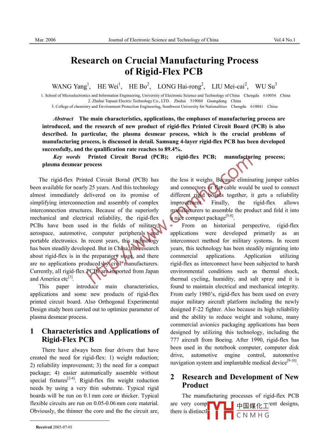 Mar. 2006Jourmal of Electronic Science and Technology of ChinaVol.4 No.1Research on Crucial Manufacturing Processof Rigid-Flex PCBWANG Yang',HE Wei',HE Bo',LONG Hai-rong2,LIU Mei-cai,WU Su31. School of Microelectronics and Information Engineering, University of Electronic Science and Technology of China Chengdu 610054 China2. Zhuhai Topsun Electric Technology Co, LTD. Zhuhai 519060 Guangdong China3. College of chemistry and Environment Protection Engineering, Southwest University for NationalitiesChengdu 610041 ChinaAbstract The main characteristics, applications, the emphases of manufacturing process areintroduced, and the research of new product of rigid-flex Printed Circuit Board (PCB) is alsodescribed. In particular, the plasma desmear process, which is the crucial problems ofmanufacturing process, is discussed in detail. Samsung 4-layer rigid-flex PCB has been developedsuccessfully, and the qualification rate reaches to 89.4%.Key words Printed Circuit Borad (PCB); rigid-flex PCB; manufacturing process;plasma desmear processThe rigid-flex Printed Circuit Borad (PCB) hasthe less it weighs. Because eliminating jumper cablesbeen available for nearly 25 years. And this technologyand connectors or flat cable would be used to connectalmost immediately delivered on its promise of different rigid boards together, it gets a reliabilitysimplifying interconnection and assembly of compleximprovement.rigid-flexinterconnection structures. Because of the superiorlymanufacturers to assemble the product and fold it intomechanical and electrical reliability, the rigid-flexa nice compact package'5 8.PCBs have been used in the fields of military,From an historical perspective, rigid-flexaerospace, .automotive,computer peripherals andapplications were developed primarily as anportable electronics. In recent years, this technologyinterconnect method for military systems. In recenthas been steadily developed. But in China, the researchyears, this technology has been steadily migrating intoabout rigid-flex is in the preparatory stage, and thereApplicationutilizingare no applications produced by civil manufacturers.rigid-flex as interconnect have been subjected to harshCurrently, all rigid-flex PCBs are imported from Japanenvironmental conditions suchthermal shock,and America etctthermal cycling, humidity, and salt spray and it isThis paper introduce main characteristics,found to maintain electrical and mechanical integrity.applications and some new products of rigid-flexFrom early 1980's, rigid flex has been used on everyprinted circuit board. Also Orthogonal Experimentalmajor military aircraft platform including the newlyDesign study been carried out to optimize parameter ofdesigned F-22 fighter. Also because its high reliabilityplasma desmear process.and the ability to reduce weight and volume, manycommercial avionics packaging applications has been1 Characteristics and Applications ofdesigned by utilizing this technology, including theRigid-Flex PCB777 aircraft from Boeing. After 1990, rigid-flex hasThere have always been four drivers that havebeen used in the notebook computer, computer diskcreated the need for rigid-flex: 1) weight reduction;drive, automotive engine control, automotive2) reliability improvement; 3) the need for a compactnavigation system and implantable medical device" .package; 4) easier automatically assemble without2 Research and Development of Newspecial fixturesRigid-flex fits weight reductionProductneeds by using a very thin substrate. Typical rigidboards will be run on 0.1 mm core or thicker. TypicalThe manufacturing processesof rigid-flex PCBflexible circuits are run on 0.05-0.06 mm core material.are very com中國煤化工'ent designs,Obviously, the thinner the core and the the circuit are,there is distinctl:YHCNMH GReceived 2005-07-01_No.1WANG Yang, ct al: Rescarch on Crucial Manufacturing Process of Rigid-Flex PCB25Topsun Electronic Technology Co., LTD had2) The formation of microvia. In this stage, rigiddeveloped several research on Rigid-Flex PCBs.manufacturers have made tremendous strides in theFirst product is shown in Fig.1. It's is a size and quality of driled holes that they can generatedouble-sides rigid-flex PCB. The construction consistswith today's equipment. Flex, however, offers a varietyof a single-side flex and a layer of single-side rigidof methods (mechanical drilling, punching, plasmatogether with a modified epoxy prepreg.etching, laser drilling) for via generation. Thisoperation is very critical, since the rigid-flex is built-upRigid Areawith materials at very different hardness. Whereas therigid material is relatively hard, the polyimide and inCoppeTparticular the adhesive are very soft.Rigid clad3) It uses acrylic adhesive materials that haveFlexAreaPrepreghigh Thermal Coefficient of Expansion (TCE).Flexible base materialBecause of the difference of TCE, the flexible portioncan form groove. A new family of low- and no-flowCopperprepreg epoxies can decrease the tensility, which isinduced by adhesive.Fig.1 Double-sides rigid-flex construction4) After drilling, the polyimide and in particularThe second product is Samsung 4 layer flex-rigidthe adhesive generate some smear which can't beremoved by conventional chemical disposal and canPCB. This construction, which is shown in Fig.2, isinduce low-reliability of rigid-flex PCBs. Ordinarycomprised of a double-side Flexible Printed Circuitdesmearing with potassium permanganate, as used(FPC) with a single-side rigid laminated on each side.in conventional rigid board production, is not feasible,The adhesive is also modified epoxy prepreg.since the adhesive is not compatible with strongRigid areaalkaline chemicals. The plasma surface treatmentsystems are now being used to deal with the problem.Not only removes desmear, but also improves platingadhesion and reduces the likelihood of circuit failure.However, Plasma etching system presents somechallenges to the engineer to decide which attributes ofPI Coverlayervia sho