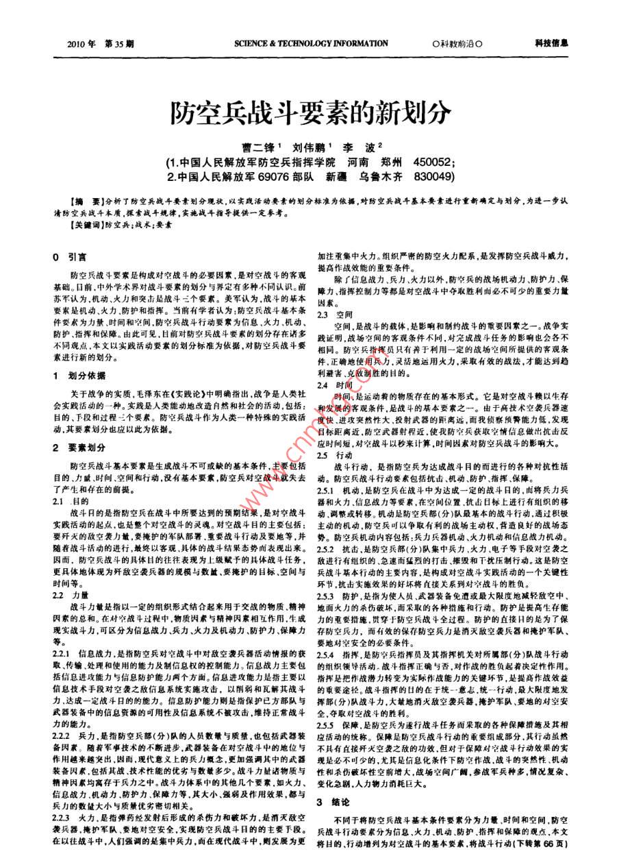 2010年第35期SCIENCE TECHNOLOGY INFORMATIoNO科教前沿O科技信息防空兵戰(zhàn)斗要素的新劃分曹二鋒1劉偉鵬'李波2(1.中國人民解放軍防空兵指揮學院河南鄭州450052;2中國人民解放軍69076部隊新疆烏魯木齊830049)【摘要】分析了防空兵戰(zhàn)斗要素劃分現狀,以實踐活動要素的劃分標準為依據,對防空兵戰(zhàn)斗基本要素進行重新確定與劃分,為進一步認清防空兵戰(zhàn)斗本質,棵索戰(zhàn)斗規(guī)律,實施戰(zhàn)斗指導提供一定參考。【關鍵詞】防空兵;戰(zhàn)術;要素0引言加注重集中火力。組織嚴密的防空火力配系,是發(fā)揮防空兵戰(zhàn)斗威力,防空兵戰(zhàn)斗要素是構成對空戰(zhàn)斗的必要因素,是對空戰(zhàn)斗的客觀提高作戰(zhàn)效能的重要條件除∫信息戰(zhàn)力兵力、火力以外,防空兵的戰(zhàn)場機動力、防護力、?;A。目前中外學術界對戰(zhàn)斗要素的劃分與界定有多種不同認識。前力、指揮控制力等都是對空戰(zhàn)斗中奪取勝利而必不可少的重要力量蘇不認為機動、火力和突擊是戰(zhàn)斗三個要素。美軍認為戰(zhàn)斗的基本因素要稱是機動火力防護和指揮。當前有學者認為:防空兵戰(zhàn)斗基本條23空間件要素為力量時間和空間,防空兵戰(zhàn)斗行動要寒為信息、火力機動空間,是戰(zhàn)斗的載體,是影響和制約戰(zhàn)斗的重要因家之一。戰(zhàn)爭實防護指揮和保障由此可見,日前對防空兵戰(zhàn)斗要素的劃分存在諸多踐證明,戰(zhàn)場空間的客觀條件不同,對完成戰(zhàn)斗任務的影響也會各不不同觀點本文以實踐活動要素的劃分標準為依據,對防空兵戰(zhàn)斗要相同。防空兵指揮員只有于利用一定的戰(zhàn)場空間所提供的客觀條素進行新的劃分件,正確地使用兵力,靈活地運用火力,采取有效的戰(zhàn)法,才能達到趨1劃分依據利避害、克敵制勝的目的24時間關于戰(zhàn)爭的實質毛澤東在《實踐論》中明確指出戰(zhàn)爭是人類社時間,是運動著的物質存在的基本形式。它是對空戰(zhàn)斗賴以生有會實賤活動的一種。實踐是人類能動地改造自然和社會的活動包括:和發(fā)展的客觀條件,是戰(zhàn)斗的基本要素之一。由于高技術空襲兵器速目的、F段和過程三個要素。防空兵戰(zhàn)斗作為人類一種特殊的實踐活度快、進攻突然性大、投射武器的距離遠,而我偵察預警能力低發(fā)現動,其要素劃分也應以此為依據。目標距離近,防空武器射程近,使我防空兵獲取空情信息做出抗擊反2要素劃分應時間短,對空戰(zhàn)斗以秒來計算,時閫因素對防空兵戰(zhàn)斗的影響25行動防空兵戰(zhàn)斗基本要家是生成戰(zhàn)斗不可或缺的基本條件,主要包括戰(zhàn)斗行動,是指防空兵為達成戰(zhàn)斗目的而進行的各種對抗性活目的、力瞰、時間、空間和行動,沒有基本要絮,防空兵對空戰(zhàn)斗就失去動。防空兵戰(zhàn)斗行動要素包括抗擊、機動、防護指揮、保障。了產生和仔在的前提251機動,是防空兵在戰(zhàn)斗中為達成一定的戰(zhàn)斗日的,而將兵力兵2.1目的器和火力信息戰(zhàn)力等要素,在空間位置抗擊日標上進行有組織的移戰(zhàn)斗日的是指防空兵在戰(zhàn)斗中所要達到的預期結果,是對空戰(zhàn)斗動調或轉移。機動是防空兵部(分)隊最基本的戰(zhàn)斗行動通過積極實踐活動的起點,也是整個對空戰(zhàn)斗的靈魂。對空戰(zhàn)斗目的主要包括:主動的機動,防空兵可以爭取有利的戰(zhàn)場主動權,營造良好的戰(zhàn)場態(tài)要殲火的敵空襲力量要掩護的軍隊部署、重要戰(zhàn)斗行動及要地等井勢。防空兵機動內容包括:兵力兵器機動、火力機動和信息戰(zhàn)力機動。隨著戰(zhàn)斗活動的進行,最終以客觀、具體的戰(zhàn)斗結果態(tài)勢而表現出來。252抗擊是防空兵部(分)隊集中兵力火力電子等手段對空襲之因而,防空兵戰(zhàn)斗的具體目的往往表現為上級賦予的具體戰(zhàn)斗任務,敵進行有組織的、急速而猛烈的打擊摧毀和干擾壓制行動。這是防空更具體地體現為殲敵空襲兵器的規(guī)模與數鱸、要掩護的目標、空間與兵戰(zhàn)斗基本行動的主要內容,是構成對空戰(zhàn)斗實踐活動的一個關鍵性時間等環(huán)節(jié),抗擊實施效果的好壞將直接關系到對空戰(zhàn)斗的勝負。2.2力量253防護,是指為使人員、武器裝備免遭或最大限度地減輕敵空中戰(zhàn)斗力是指以一定的組織形式結合起來用于交戰(zhàn)的物質精神地面火力的殺傷破壞,而采取的各種措施和行動。防護是提高生存能因素的總和。在對窄戰(zhàn)斗過程中物質因素與精神因素相互作用,生成力的重要措施貫穿于防空兵戰(zhàn)斗全過程。防護的直接H的是為了?,F實戰(zhàn)斗力,可區(qū)分為信息戰(zhàn)力、兵力、火力及機動力、防護力保障力存防空兵力,而有效的保存防空兵力是消滅敵空襲兵器和掩護軍隊、等要地對空安全的必要條件。221信息戰(zhàn)力是指防空兵對空戰(zhàn)斗中對敵空襲兵器活動情報的獲254指揮,是防空兵指揮員及其指揮機關對所屬部(分)隊戰(zhàn)斗行動取、傳輸處理和使用的能力及制信息權的控制能力。信息戰(zhàn)力主要包的組織領導活動。戰(zhàn)斗指揮正確與否,對作戰(zhàn)的勝負起著決定性作用括信息進攻能力與信息防護能力兩個方面。信懸進攻能力是指主要以指揮是把作戰(zhàn)潛力轉變?yōu)閷嶋H作戰(zhàn)能力的關
