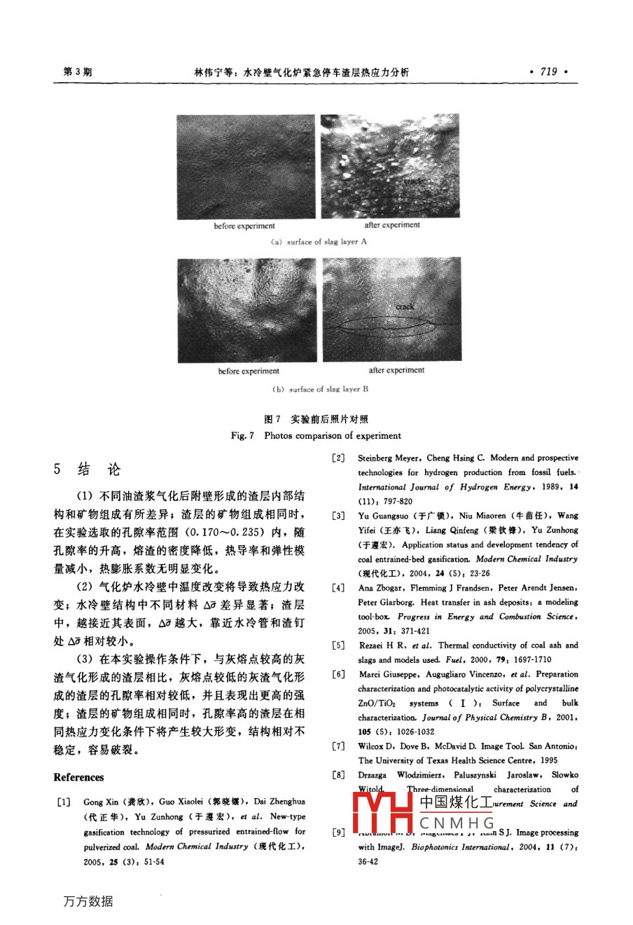 第59卷第3期I學(xué)報(bào)Vol. 59 No.32008年3月Journal of Chemical Industry and Engineering (China)March 2008研究論文資水冷壁氣化爐緊急停車(chē)渣層熱應(yīng)力分析林偉寧,梁欽鋒,徐.贏,劉海峰,于廣鎖,于遵宏(華東理工大學(xué)煤氣化教育部重點(diǎn)實(shí)驗(yàn)室,上海200237)摘要:基于實(shí)驗(yàn)室小型水冷壁氣流床氣化爐,研究了兩種油渣漿氣化后在爐內(nèi)壁形成渣層的內(nèi)部結(jié)構(gòu)及組成。建立了氣化爐水冷壁的三維傳熱和應(yīng)力模型,對(duì)氣化妒緊急停車(chē)時(shí)爐壁的熱應(yīng)力變化及其分布進(jìn)行了模擬計(jì)算。計(jì)算結(jié)果表明:渣層中越靠近渣層表面,熱應(yīng)力的變化越大;靠近水冷管和渣釘處的渣層熱應(yīng)力變化相對(duì)較小;渣層表面溫度變化相同時(shí),孔隙率大的渣層產(chǎn)生的形變較大. .關(guān)鍵詞:氣流床氣化爐;水冷壁;渣層;熱應(yīng)力中圈分類(lèi)號(hào): TQ 054 .文獻(xiàn)標(biāo)識(shí)碼: A文章編號(hào): 0438-1157 (2008) 03-0713-08Analysis of thermal stress of slag layer for emergencyshutdown in water wall gasifierLIN Weining, LIANG Qinfeng, XU Ying, LIU Haifeng, YU Guangsuo, YU Zunhong(Key Laboratory of Coal Gasification, Ministry of Education, East China Universityof Science and Technology, Shanghai 200237 , China)Abstract: Inner structures and components of slag layers formed by gasification of two kinds of oil-slagslurry on the furnace wall were studied in a lab-scale water wall entrained-flow gasifier. A mathematicmodel of three dimensional heat transfer and stress was built. Based on the model the change and thedistribution of thermal stress for emergency shutdown were calculated. The results indicated that the closerthe position to the slag's surface, the larger the change of thermal stress in the slag layer. The thermalstress of the slag layer close to the water tube and the slag nail was comparatively small. At the samechange of temperature, the strain in the slag layer with higher porosity was larger.Key words: entrained-low gasifier; water wall; slag layer; thermal stress容量、高效潔凈的燃?xì)馀c合成氣制備的首選技術(shù)。引言目前,氣流床氣化爐中耐火襯里有耐火磚和水冷壁氣流床煤氣化技術(shù)具有煤種適應(yīng)性廣、操作壓兩種。耐火磚襯里價(jià)格昂貴,壽命短[0],需要定期力和溫度高、碳轉(zhuǎn)化率高、生產(chǎn)強(qiáng)度和規(guī)模大等特檢修更換;而水冷璧技術(shù)的核心是“以渣抗渣”,點(diǎn)[2],顯示了良好的經(jīng)濟(jì)和社會(huì)效益,是煤炭大利用氣化過(guò)程中產(chǎn)生的大量熔渣,附著在水冷管2007-07- 30收到初稿,2007- 10- 18收到修改稿。Reeived date: 2007- -07 - 30.聯(lián)系人:廣鎖.第一作者:林偉寧(1981-), 男,碩士研Corresponding aothor; Prof, YU Guangsuo. E- mail: gsyu@究生.ecust. edu cn基金項(xiàng)目:國(guó)家重點(diǎn)基礎(chǔ)研究發(fā)展計(jì)劃項(xiàng)目Foundation item:. supported by the National Basic Research(2004CB217703);教育部“長(zhǎng)江學(xué)者與創(chuàng)新團(tuán)隊(duì)發(fā)展計(jì)劃"創(chuàng)新Prograr中國(guó)煤化工。ogram for Changjiang團(tuán)隊(duì)項(xiàng)目(IRT0620); 上海屠光計(jì)劃項(xiàng)目(06SG34); 新世紀(jì)優(yōu)Scholar:YHCN M H Giverity (RTO062),0秀人才支持計(jì)劃項(xiàng)目(NCET-06-0416).the“Iu ugiaun aunguas cuuuauun Commission, China(06SG34) and the Program for New Century Exellent Talents inUniversity (NCET-06-0416).●714●I學(xué)報(bào)第59卷上,形成非常大的熱阻,保護(hù)了水冷管,使得氣化待爐內(nèi)燃燒穩(wěn)定后,切斷柴油進(jìn)料,改為油渣漿進(jìn)裝置可以長(zhǎng)周期運(yùn)轉(zhuǎn)。從長(zhǎng)遠(yuǎn)來(lái)看,水冷壁技術(shù)是.料。為模擬工業(yè)氣化爐實(shí)際運(yùn)行情況,調(diào)節(jié)氧油比今后發(fā)展的主要方向。[即氧氣進(jìn)料量(m' ●h-1) /柴油進(jìn)料量(kg.實(shí)際操作中的-一個(gè)重要現(xiàn)象是,氣化爐緊急停h-1)]為2.2~2.3, 保持爐內(nèi)還原性氣氛。油渣車(chē)后,水冷壁熔渣層會(huì)出現(xiàn)不同程度的裂縫。此類(lèi)漿氣化生成的熔渣附著在耐火材料表面,形成一定裂縫的存在,將導(dǎo)致氣化爐再開(kāi)車(chē)時(shí)產(chǎn)生局部高溫厚度的渣層;水冷壁冷卻水經(jīng)泵(5)強(qiáng)制循環(huán),點(diǎn),容易饒壞水冷壁。這是由于氣化爐運(yùn)行穩(wěn)定且采用熱電偶(4)測(cè)量氣化爐爐壁溫度,信號(hào)經(jīng)模渣層平衡時(shí),水冷壁中熱應(yīng)力處于穩(wěn)定狀態(tài),但緊塊處理后存人計(jì)算機(jī)。為模擬工業(yè)中氣化爐緊急停急停車(chē)操作將引起水冷壁溫度分布變化,從而導(dǎo)致車(chē)情況,在爐壁溫度升至1200C,并趨于穩(wěn)定時(shí),熱應(yīng)力變化,當(dāng)熱應(yīng)力超出渣層的強(qiáng)度時(shí),渣層就快速切斷進(jìn)料,并用氮?dú)獯祾?,保持冷卻水強(qiáng)制循會(huì)出現(xiàn)裂縫。環(huán),使氣化爐內(nèi)壁快速降溫至1000C,再緩慢降不同煤種燃燒后在爐內(nèi)形成的渣層在內(nèi)部結(jié)構(gòu)至常溫。上存在明顯的差異。Ana 等[+4) 研究發(fā)現(xiàn),灰渣的vapour結(jié)構(gòu)形式是決定熱傳導(dǎo)率的重要因素,在給定的溫度下,熱傳導(dǎo)率隨孔隙率的升高而下降。同時(shí),熔DSS-。|咱r渣的內(nèi)部結(jié)構(gòu)和化學(xué)組成對(duì)渣層的強(qiáng)度有很大的影diesel oil西響。因此分別對(duì)兩種灰渣進(jìn)行了氣化實(shí)驗(yàn),測(cè)