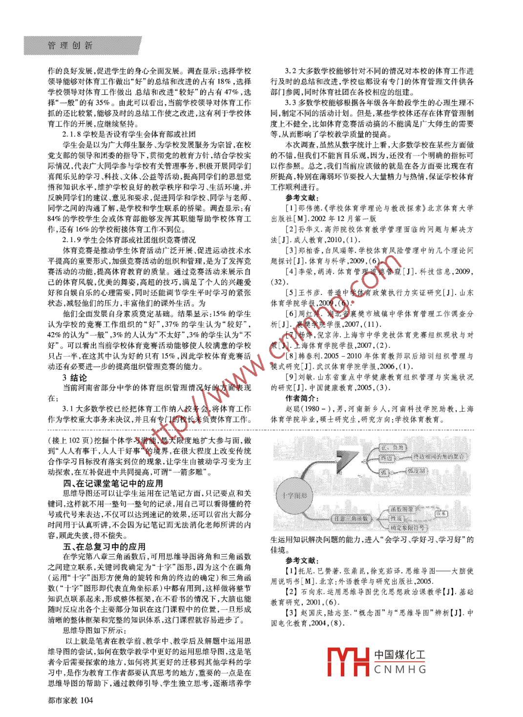 管理創(chuàng)新河南省部分中學(xué)體育組織與管理的調(diào)查與研究453003河南科技學(xué)院體育系 新鄉(xiāng)醫(yī)學(xué)院河南新鄉(xiāng)趙聰郝一寧齊琦[摘要]本文通過對河南 省部分中學(xué)的體育組織與管理情況進(jìn)行調(diào)查與客觀分析,找出影響中學(xué)體育組織與管理的因素,并提出相應(yīng)的對策。以期促使學(xué)校體育工作成績進(jìn)一步提高,并推動學(xué)??傮w教育水平的提高,進(jìn)而促進(jìn)學(xué)生成績進(jìn)步。[關(guān)鍵詞]中學(xué)體育組織與管理1前言學(xué)校體育管理制度是體育管理的機(jī)構(gòu)設(shè)置、權(quán)限劃分、運(yùn)行學(xué)校體育組織管理是為了有效的實(shí)現(xiàn)學(xué)校體育任務(wù),通過機(jī)制等方面的體系和制度的總稱,是實(shí)現(xiàn)學(xué)校體育總目標(biāo)的組建立合理的組織機(jī)構(gòu),發(fā)揮各機(jī)構(gòu)的職能,有步驟,有次序地完織保障。包括學(xué)校體育人才管理、體育財物管理、體育信息管成學(xué)校的體育工作。加強(qiáng)學(xué)校體育工作的管理,是全面貫徹黨理體育教育管理、運(yùn)動訓(xùn)練管理運(yùn)動競賽管理等。調(diào)查顯示:的教育方針的需要;是“應(yīng)試教育”向“素質(zhì)教育”轉(zhuǎn)變的需要;有32%的學(xué)校在管理制度上為“好”,有47%的學(xué)校為“較好”,是貫徹“終身體育”、“健康第- -” 等教育新理念的需要;是培養(yǎng)有21%的學(xué)校為“一-般”。從數(shù)據(jù)上分析可以看出,當(dāng)前學(xué)校基21世紀(jì)復(fù)合型人才的需要。學(xué)校通過對體育組織機(jī)構(gòu)設(shè)立的本上能按照規(guī)章制度行事,但工作質(zhì)量不高,究其原因可能存在逐步完善,可以使學(xué)校體育工作成績進(jìn)-步提高,并可促進(jìn)學(xué)校以下情況:①對體育各項管理制度的重視程度不夠;②忽視了各總體教育水平的提高,從而促進(jìn)學(xué)生成績進(jìn)步。項管理制度的功能,特別是法制功能和思想教育功能;③各項體目前,雖然社會上各中學(xué)有自已相應(yīng)的體育組織機(jī)構(gòu),但因育管理部門]的業(yè)務(wù)水平不高;④各項體育管理部門]的協(xié)調(diào)不好。其中分工不明確,權(quán)限不清楚,監(jiān)督不到位等- - 系列問題的存2.1.4學(xué)校是否有一名校長或副校長分管體育工作在,嚴(yán)重制約著中學(xué)體育工作任務(wù)的順利進(jìn)行,不但使人從思想學(xué)校校長或副校長對本校體育教育的各項工作進(jìn)行全面決上不重視體育,而且在行動中也出現(xiàn)問題。因此面對紛繁復(fù)雜策指揮、布置和檢查。他們按照上級教育和體育行政部門的指的體育工作,用什么樣的管理方法能收到最佳的效果,很大程度示與要求,結(jié)合學(xué)校各階段的工作實(shí)際,對體育教育工作提出總上取決于學(xué)校的體育管理方法和水平.在推崇“以人為本”、“健的目標(biāo)要求,領(lǐng)導(dǎo)指定學(xué)校體育教育工作的計劃。調(diào)查顯示:有康第一”為核心素質(zhì)教育大環(huán)境下,提高中學(xué)體育工作的管理71%的學(xué)校有校長或副校長負(fù)責(zé)體育工作,有29%的學(xué)校還存水平,是貫徹新時期黨的教育方針的重要方面。本調(diào)查通過對在不足。從數(shù)宇上分析,雖然有七層的學(xué)校有專門的校長負(fù)責(zé)河南省部分中學(xué)體育組織管理的分析與研究,了解當(dāng)前河南省體育工作,但是我們要防止兩種不良現(xiàn)象一即 在其位不謀其中學(xué)體育組織管理的基本情況,發(fā)現(xiàn)問題,從而提出可行性建政和空掛頭銜沒有相應(yīng)的權(quán)力。總之,只有實(shí)實(shí)在在的專人負(fù)議責(zé)體育工作,學(xué)校體育才能走向良性發(fā)展。2河南省部分中學(xué)體育組織管理的現(xiàn)狀與分析2. 1.5學(xué)校是否有專項體育活動的計劃2.1體育工作是否納入校務(wù)會工作中學(xué)校通過- -系列計劃進(jìn)行體育教育管理,是與體育教育的校務(wù)會是學(xué)校領(lǐng)導(dǎo)共同研究商討決定學(xué)校重大事務(wù)的會計劃性特點(diǎn)和制定嚴(yán)密的計劃的基本要求相適應(yīng)的。學(xué)校體育。它的主要任務(wù)是布置階段性和日常性的工作,研究完成任教育管理,不僅要有整體的體育教育發(fā)展規(guī)劃,而且要有年度計務(wù)的方法與要求,檢查和總結(jié)任務(wù)的完成情況,審議學(xué)校各項規(guī)劃;不僅要制定體育教學(xué)的系列計劃,而且要制定課外專項體育章制度和報董事會的規(guī)劃、計劃預(yù)算、總結(jié)等報告,使學(xué)校各項活動計劃,運(yùn)動隊課余訓(xùn)練計劃和課余運(yùn)動競賽計劃;此外還應(yīng)工作有序的按既定目標(biāo)前進(jìn)。有各基層單位的相應(yīng)計劃。只有依靠這- - 套完整的計劃系列,學(xué)校體育工作是否納人校務(wù)會,直接影響著學(xué)校體育工作才能保證體育教育管理目標(biāo)的實(shí)現(xiàn),保證體育教育各階段、各環(huán)的開展以及該校是否真正對體育教育加以足夠的重視,調(diào)查結(jié)節(jié)教育任務(wù)的銜接與遞進(jìn),也才能保證各有關(guān)方面和有關(guān)人員果顯示:選擇“是”的有94% ,選擇“否”的有6%。因而從整體按照計劃規(guī)定的職責(zé)、權(quán)限和要求,完成各自的管