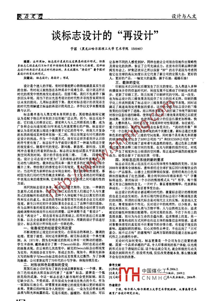 醫(yī)眾文王設(shè)計與人文談標(biāo)志設(shè)計的“再設(shè)計”于謳(黑龍江哈爾濱理工大學(xué) 藝術(shù)學(xué)院150040)摘要:眾所周知,標(biāo)志設(shè)計是我們太過熱悉的設(shè)計形式,但很讓 各種不同的人感受到BP,同樣也能讓公司很自信地作出策略性多標(biāo)志已經(jīng)在我們不知不覺中悄悄的易裝重新面對人們面前,這種標(biāo)及商業(yè)化的抉擇。 象征了公司充滿活力。在宣布啟用新品牌的新志設(shè)計的再設(shè)計是造應(yīng)時代特征的,本文試圖從“再設(shè)計”著手探討聞發(fā)布會上, BP集團(tuán)表示之所以保留“BP"的名字是因為考慮到其設(shè)計的變化的形式。他它在全球的高認(rèn)知度以及它代表了新公司的宏圖大志:更好的關(guān)鍵詞:標(biāo)志設(shè)計; 再設(shè)計;形式人,更好的產(chǎn)品,一幅宏大的藍(lán)圖,源于石油,超越石油!設(shè)計是個迷人的字眼,有時好像能野心勃勃地涵蓋真實生活三.載體的變化印刷技術(shù)在20世紀(jì)后期發(fā)生了巨大的變化。當(dāng)人類進(jìn)入多種的全部,有時卻又被抱怨在各種需求中艱難生存。設(shè)計就這樣在傳播媒體 并存的信息時代時,科技發(fā)展不僅推動了印刷技術(shù)的進(jìn)時代的質(zhì)變中悄然地變化者面孔,應(yīng)接不暇。我們不免要停下腳步, 更新了印刷工藝,而且拓展了印刷研究的空間。這一改變,步回頭審視,用當(dāng)下的目光思考設(shè)計的時代性并尋找答案期待用也為標(biāo)志設(shè)計的三維效果 表現(xiàn)提供了有力的技術(shù)支持。印刷的數(shù)以未來的提問。幾周標(biāo)志課程下來,我對對標(biāo)志設(shè)計的表現(xiàn)語言字化 工作流程提高了標(biāo)志設(shè)計三維效果的色彩細(xì)節(jié)表現(xiàn),同時還的時代性理解建立標(biāo)志的再設(shè)計的關(guān)注上,并作以文字來整理思滿足了高速高效處理數(shù)據(jù)的要求。這些改變都為標(biāo)志設(shè)計的三維路與認(rèn)識。效果的應(yīng)用鋪平了道路。而以網(wǎng)絡(luò)為載體,則打破了傳統(tǒng)平面印刷標(biāo)志最早是與人類文明本身同樣古老。其給物品做標(biāo)記被對部分信 息傳遞的障礙,使得標(biāo)志設(shè)計的三維效果表現(xiàn)較之以前更認(rèn)為是賦予物品所有權(quán)的方法而被廣泛認(rèn)同。而今,標(biāo)志無處不加成熟、 完善和主動。也使得標(biāo)志設(shè)計的信息傳播更加準(zhǔn)確、快在,它們強(qiáng)大的釋放記憶、感覺和人與人之間聯(lián)系的力量,成為速、 大量和誘人,同時還包含了美觀和針對性等因素。如在索尼、廣告和企業(yè)溝通領(lǐng)域150年來成幾何速度增長的產(chǎn)物。標(biāo)志設(shè)計愛 文信聯(lián)姻后,新的公司的標(biāo)志也備受關(guān)注。“流動的形象”和.被認(rèn)為是把寓意壓縮進(jìn)少量的便于記憶的符號中,將龐大井復(fù)雜、“另 一個白我”是新標(biāo)志要體現(xiàn)的兩個關(guān)鍵元素。新標(biāo)志通過光影的東西濃縮成某種簡單而獨(dú):無二的,用以呈現(xiàn)富有時代感的特和色彩的變化達(dá)到了 三維的空間效果,同時那個具有高光和陰影定設(shè)計的挑戰(zhàn)。作為-一個溝通方式, 沒有比讓世界看到并認(rèn)識你的球 體的線條里包含了SONY公司的“S"和ERICSSON公司的“的符號更有效了,標(biāo)志似乎為平面設(shè)計提供了一種最為簡潔方便兩個字母, 又用充滿了意味著生機(jī)盎然的綠色,通過色彩上的漸的視覺索引。隨著時代的變遷,新風(fēng)格、 新態(tài)度、新科技、互聯(lián)變過渡完美詮釋 三維空間的效果。在光與陰影的強(qiáng)烈對比、襯托網(wǎng)沖擊著我們所看到的標(biāo)志。標(biāo)志的認(rèn)知也試圖從平面逐漸轉(zhuǎn)下, 產(chǎn)生了視覺沖擊力極強(qiáng)的空間感。而正是這種強(qiáng)烈的視覺沖到空間再到時間:設(shè)計的手法也呈現(xiàn)二維、三維、 四維的更 擊力, 給受眾留下了很深的第印象。迭;設(shè)計公司在設(shè)計時更為廣義的將標(biāo)志的實時性逐漸擴(kuò)大到四、對標(biāo)志應(yīng)用系統(tǒng)的新的要求互動性與陪伴性:載體的運(yùn)用從單- -媒介 更多的擴(kuò)展到多元綜合標(biāo)志必須在展示范圍里對其應(yīng)用體統(tǒng)作為輔助的支持。比如媒介上來:帶給我們的感受也非只有視覺,更多的是全感官的設(shè)2006年 肯德基全球換標(biāo),意味若經(jīng)過全球擴(kuò)張后回H到餐飲業(yè)的計:當(dāng)這些更為新鮮的標(biāo)志 呈現(xiàn)出來時,我們能夠欣然接受。那核心- 產(chǎn)品服務(wù)。山德士上校招牌領(lǐng)結(jié)保留,但將經(jīng)典的白色雙時因為我們用時代性的概念來解讀,在一個文化系統(tǒng)在時間演進(jìn)排扣西裝換成了紅 色圍裙。聯(lián)合利華2004年將原來的“U"字徽中表現(xiàn)出來的維度轉(zhuǎn)換,它體現(xiàn)著不同文化系統(tǒng)之間可通約性的標(biāo)將退役,新的標(biāo)識一個小25的剪接模式從“U"形字,每個圖案又有自己獨(dú)特的含義,-片葉子,象征著植物精華,代表耕耘再同到標(biāo)志設(shè)計本身,標(biāo)志可以建立期待,比如,一-種新的 和成長: 一只小鳥,象征著享受自由。生意形式或者服務(wù),但是它們自己無法改變?nèi)藗兺ㄟ^個人與生意標(biāo)志設(shè)計的再設(shè)計都是順應(yīn