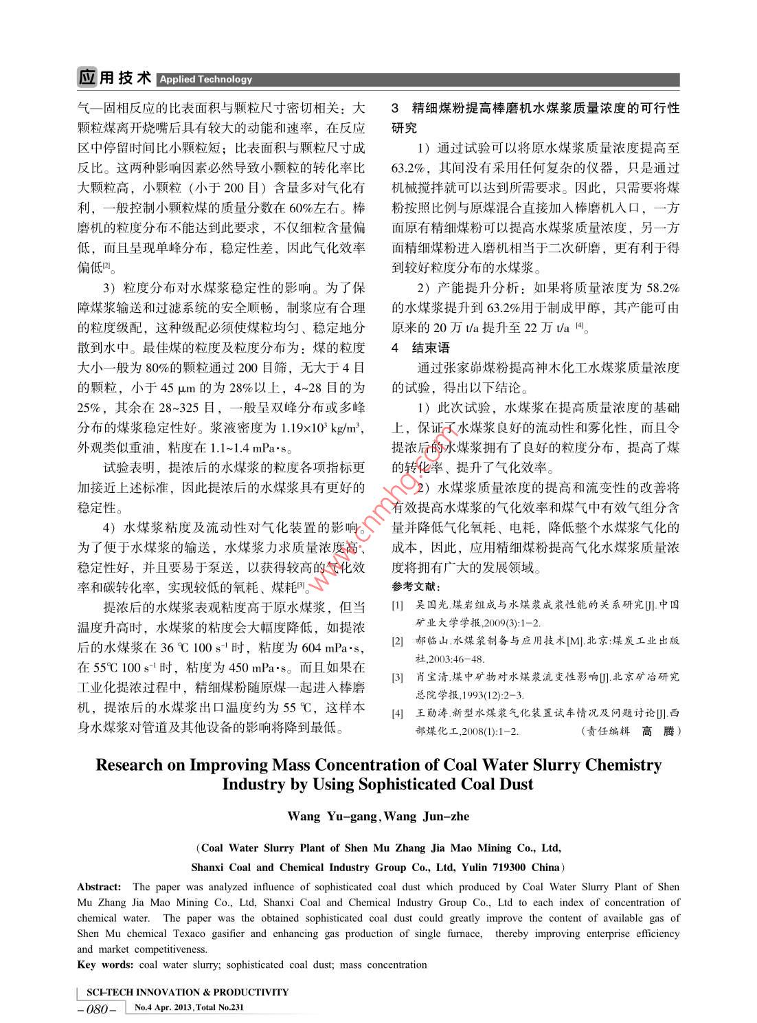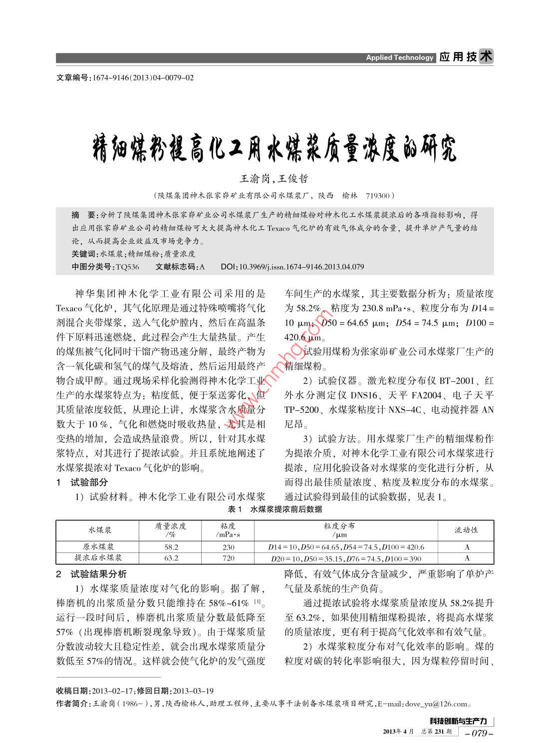 Applied Technology應(yīng)用技術(shù)文章編號(hào):1674-9146(2013)04-0079-02精煤粉提高化z用水湛漿質(zhì)量度酚研究王渝崗,王俊哲陜煤集團(tuán)神木張家峁礦業(yè)有限公司水煤漿廠,陜西榆林71930)摘要:分析了陜煤集團(tuán)神木張家峁礦業(yè)公司水煤漿廠生產(chǎn)的精細(xì)煤粉對(duì)神木化工水煤漿提濃后的各項(xiàng)指標(biāo)影響,得出應(yīng)用張家峁礦業(yè)公司的精細(xì)煤粉可大大提高神木化工 Texaco氣化爐的有效氣體成分的含量,提升單爐產(chǎn)氣量的結(jié)論,從而提高企業(yè)效益及市場(chǎng)競(jìng)爭(zhēng)力關(guān)鍵詞:水煤漿;精細(xì)煤粉;質(zhì)量濃度中圖分類號(hào):TQ536文獻(xiàn)標(biāo)志碼:ADol:10.3969/is.1674-9146.2013.04079神華集團(tuán)神木化學(xué)工業(yè)有限公司采用的是車間生產(chǎn)的水煤漿,其主要數(shù)據(jù)分析為:質(zhì)量濃度Texaco氣化爐,其氣化原理是通過特殊噴嘴將氣化為58.2%、粘度為230.8mPa·s、粒度分布為D14=劑混合夾帶煤漿,送人氣化爐膛內(nèi),然后在高溫條10μm;D50=64.65μm;D54=74.5μm;D100件下原料迅速燃燒,此過程會(huì)產(chǎn)生大量熱量。產(chǎn)生420.6m。的煤焦被氣化同時(shí)干餾產(chǎn)物迅速分解,最終產(chǎn)物為試驗(yàn)用煤粉為張家峁礦業(yè)公司水煤漿廠生產(chǎn)的含一氧化碳和氫氣的煤氣及熔渣,然后運(yùn)用最終產(chǎn)精細(xì)煤粉。物合成甲醇。通過現(xiàn)場(chǎng)采樣化驗(yàn)測(cè)得神木化學(xué)工業(yè)2)試驗(yàn)儀器。激光粒度分布儀BT-2001、紅生產(chǎn)的水煤漿特點(diǎn)為:粘度低,便于泵送霧化,但外水分測(cè)定儀DNS16、天平FA2004、電子天平其質(zhì)量濃度較低,從理論上講,水煤漿含水質(zhì)量分TP-5200、水煤漿粘度計(jì)NXS-4C、電動(dòng)攪拌器AN數(shù)大于10%,氣化和燃燒時(shí)吸收熱量,尤其是相尼昂變熱的增加,會(huì)造成熱量浪費(fèi)。所以,針對(duì)其水煤3)試驗(yàn)方法。用水煤漿廠生產(chǎn)的精細(xì)煤粉作漿特點(diǎn),對(duì)其進(jìn)行了提濃試驗(yàn)。并且系統(tǒng)地闡述了為提濃介質(zhì),對(duì)神木化學(xué)工業(yè)有限公司水煤漿進(jìn)行水煤漿提濃對(duì) Texaco氣化爐的影響提濃,應(yīng)用化驗(yàn)設(shè)備對(duì)水煤漿的變化進(jìn)行分析,從1試驗(yàn)部分而得出最佳質(zhì)量濃度、粘度及粒度分布的水煤漿。1)試驗(yàn)材料。神木化學(xué)工業(yè)有限公司水煤漿通過試驗(yàn)得到最佳的試驗(yàn)數(shù)據(jù),見表1。表1水煤漿提濃前后數(shù)據(jù)水煤漿質(zhì)量濃度粘度粒度分布流動(dòng)性原水煤漿D14=10,D50=6465,D54=74.5,D100=420.6提濃后水煤漿720D20=10,D50=35.15,D76=74.5,D100=3902試驗(yàn)結(jié)果分析降低,有效氣體成分含量減少,嚴(yán)重影響了單爐1)水煤漿質(zhì)量濃度對(duì)氣化的影響。據(jù)了解,氣量及系統(tǒng)的生產(chǎn)負(fù)荷棒磨機(jī)的出漿質(zhì)量分?jǐn)?shù)只能維持在58%-61%。通過提濃試驗(yàn)將水煤漿質(zhì)量濃度從58.2%提升運(yùn)行一段時(shí)間后,棒磨機(jī)岀漿質(zhì)量分?jǐn)?shù)最低降至至63.2%,如果使用精細(xì)煤粉提濃,將提髙水煤漿57%(出現(xiàn)棒磨機(jī)斷裂現(xiàn)象導(dǎo)致)。由于煤漿質(zhì)量的質(zhì)量濃度,更有利于提高氣化效率和有效氣量分?jǐn)?shù)波動(dòng)較大且穩(wěn)定性差,就會(huì)出現(xiàn)水煤漿質(zhì)量分2)水煤漿粒度分布對(duì)氣化效率的影響。煤的數(shù)低至57%的情況。這樣就會(huì)使氣化爐的發(fā)氣強(qiáng)度粒度對(duì)碳的轉(zhuǎn)化率影響很大,因?yàn)槊毫MA魰r(shí)間、收稿日期:2013-02-17;修回日期:2013-03-19作者簡(jiǎn)介:王渝崗(1986-),男,陜西榆林人,助理工程師,主要從事干法制備水煤漿項(xiàng)目研究,E-mail:dove四u@126.comd科技創(chuàng)新與生產(chǎn)力13年4月總第231期」-079應(yīng)用技術(shù) Applied Technology氣—固相反應(yīng)的比表面積與顆粒尺寸密切相關(guān):大3精細(xì)煤粉提高棒磨機(jī)水煤漿質(zhì)量濃度的可行性顆粒煤離開燒嘴后具有較大的動(dòng)能和速率,在反應(yīng)研究區(qū)中停留時(shí)間比小顆粒短;比表面積與顆粒尺寸成1)通過試驗(yàn)可以將原水煤漿質(zhì)量濃度提高至反比。這兩種影響因素必然導(dǎo)致小顆粒的轉(zhuǎn)化率比63.2%,其間沒有采用任何復(fù)雜的儀器,只是通過大顆粒高,小顆粒(小于200日)含量多對(duì)氣化有機(jī)械攪拌就可以達(dá)到所需要求。因此,只需要將煤利,一般控制小顆粒煤的質(zhì)量分?jǐn)?shù)在60%左右。棒粉按照比例與原煤混合直接加入棒磨機(jī)入口,一方磨機(jī)的粒度分布不能達(dá)到此要求,不僅細(xì)粒含量偏面原有精細(xì)煤粉可以提高水煤漿質(zhì)量濃度,另一方低,而且呈現(xiàn)單峰分布,穩(wěn)定性差,因此氣化效率面精細(xì)煤粉進(jìn)入磨機(jī)相當(dāng)于二次硏磨,更有利于得偏低2。到較好粒度分布的水煤漿。3)粒度分布對(duì)水煤漿穩(wěn)定性的影響。為了保2)產(chǎn)能提升分析:如果將質(zhì)量濃度為582%障煤漿輸送和過濾系統(tǒng)的安全順暢,制漿應(yīng)有合理的水煤漿提升到63.2%用于制成甲醇,其產(chǎn)能可由的粒度級(jí)配,這種級(jí)配必須使煤粒均勻、穩(wěn)定地分原來的20萬ta提升至22萬taH散到水中。最佳煤的粒度及粒度分布為:煤的粒度4結(jié)束語(yǔ)大小一般為80%的顆粒通過