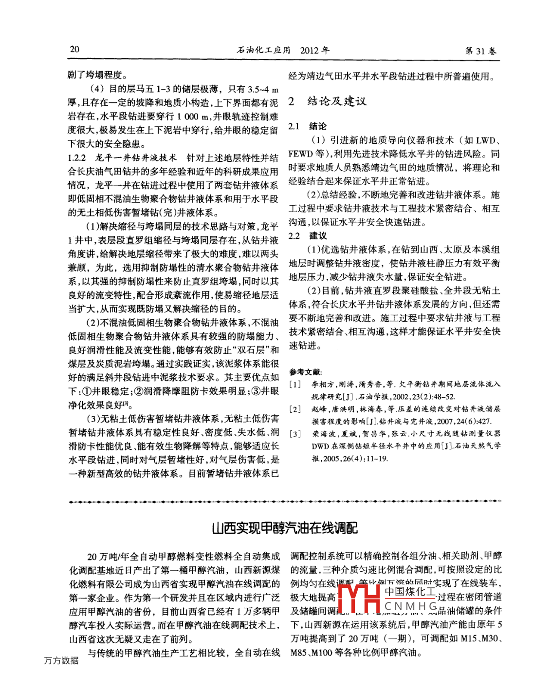 石油化工應(yīng)用2012年第31卷劇了垮塌程度。經(jīng)為靖邊氣田水平井水平段鉆進(jìn)過程中所普遍使用(4)目的層馬五1-3的儲層極薄,只有35~4m厚,且存在一定的坡降和地質(zhì)小構(gòu)造,上下界面都有泥2結(jié)論及建議巖存在,水平段鉆進(jìn)要穿行1000m,井眼軌跡控制難度很大,極易發(fā)生在上下泥巖中穿行給井眼的穩(wěn)定留21結(jié)論下很大的安全隱患。(1)引進(jìn)新的地質(zhì)導(dǎo)向儀器和技術(shù)(如LWD122龍平一井鉆井液技術(shù)針對上述地層特性并結(jié)FEWD等),利用先進(jìn)技術(shù)降低水平井的鉆進(jìn)風(fēng)險(xiǎn)。同合長慶油氣田鉆井的多年經(jīng)驗(yàn)和近年的科研成果應(yīng)用時要求地質(zhì)人員熟悉靖邊氣田的地質(zhì)情況,將理論和情況,龍平一井在鉆進(jìn)過程中使用了兩套鉆井液體系經(jīng)驗(yàn)結(jié)合起來保證水平井正常鉆進(jìn)。即低固相不混油生物聚合物鉆井液體系和用于水平段(2)總結(jié)經(jīng)驗(yàn),不斷地完善和改進(jìn)鉆井液體系。施的無土相低傷害暫堵鉆(完)井液體系工過程中要求鉆井液技術(shù)與工程技術(shù)緊密結(jié)合、相互(1)解決縮徑與垮塌同層的技術(shù)思路與對策,龍平溝通,以保證水平井安全快速鉆進(jìn)。1井中,表層段直羅組縮徑與垮塌同層存在,從鉆井液2.2建議角度講,給解決地層縮徑帶來了極大的難度,難以兩頭(1)優(yōu)選鉆井液體系,在鉆到山西、太原及本溪組兼顧,為此,選用抑制防塌性的清水聚合物鉆井液體地層時調(diào)整鉆井液密度,使鉆井液柱靜壓力有效平衡系,以其強(qiáng)的抑制防塌性來防止直羅組垮塌,同時以其地層壓力減少鉆井液失水量保證安全鉆進(jìn)。良好的流變特性配合形成紊流作用,使易縮徑地層適(2)目前,鉆井液直羅段聚硅酸鹽、全井段無粘土當(dāng)擴(kuò)大,從而實(shí)現(xiàn)既防塌又解決縮徑的目的。體系,符合長慶水平井鉆井液體系發(fā)展的方向,但還需(2)不混油低固相生物聚合物鉆井液體系,不混油要不斷地完善和改進(jìn)。施工過程中要求鉆井液與工程低固相生物聚合物鉆井液體系具有較強(qiáng)的防塌能力、技術(shù)緊密結(jié)合相互溝通這樣才能保證水平井安全快良好潤滑性能及流變性能能夠有效防止“雙石層”和速鉆進(jìn)。煤層及炭質(zhì)泥巖垮塌。通過實(shí)踐證實(shí),該泥漿體系能很好的滿足斜井段鉆進(jìn)中泥漿技術(shù)要求。其主要優(yōu)點(diǎn)如參考文獻(xiàn)[1]李相方,剛濤,隋秀香,等.欠平衡鉆井期間地層流體流入下:①井眼穩(wěn)定;②潤滑降摩阻防卡效果明顯;③井眼規(guī)律研究[J].石油學(xué)報(bào),2002,23(2)48-52凈化效果良好圍。[2]趙峰,唐洪明,林海春,等壓差的連續(xù)改變對鉆井液儲層(3)無粘土低傷害暫堵鉆井液體系,無粘土低傷害損害程度的影響[J]鉆井液與完井液,2007,24(6):427暫堵鉆井液體系具有穩(wěn)定性良好、密度低、失水低、潤[3]榮海波,夏斌,賀昌華,張?jiān)菩〕叽鐭o線隨鉆測量儀器滑防卡性能優(yōu)良、能有效生物降解等特點(diǎn),能夠適應(yīng)長DwD在深側(cè)鉆短半徑水平井中的應(yīng)用[J]石油天然氣學(xué)水平段鉆進(jìn),同時對氣層暫堵性好,對氣層傷害低,是報(bào),2005,26(4):11-19種新型高效的鉆井液體系。目前暫堵鉆井液體系已山西實(shí)現(xiàn)甲醇汽油在線調(diào)配20萬噸/年全自動甲醇燃料變性燃料全自動集成調(diào)配控制系統(tǒng)可以精確控制各組分油、相關(guān)助劑、甲醇化調(diào)配基地近日產(chǎn)出了第一桶甲醇汽油,山西新源煤的流量,三種介質(zhì)勻速比例混合調(diào)配,可按照設(shè)定的比化燃料有限公司成為山西省實(shí)現(xiàn)甲醇汽油在線調(diào)配的例均勻在線等中淀的同時實(shí)現(xiàn)了在線裝車,第一家企業(yè)。作為第一個研發(fā)并且在區(qū)域內(nèi)進(jìn)行廣泛極大地提高中國煤化工過程在密閉管道應(yīng)用甲醇汽油的省份,目前山西省已經(jīng)有1萬多輛甲及儲罐間調(diào)CNMHG品油儲罐的條件醇汽車投入實(shí)際運(yùn)營。而在甲醇汽油在線調(diào)配技術(shù)上,下,山西新源在運(yùn)用該系統(tǒng)后,甲醇汽油產(chǎn)能由原年5山西省這次無疑又走在了前列。萬噸提高到了20萬噸(一期),可調(diào)配如M15、M30、與傳統(tǒng)的甲醇汽油生產(chǎn)工藝相比較,全自動在線20等各種比例甲醇汽油。