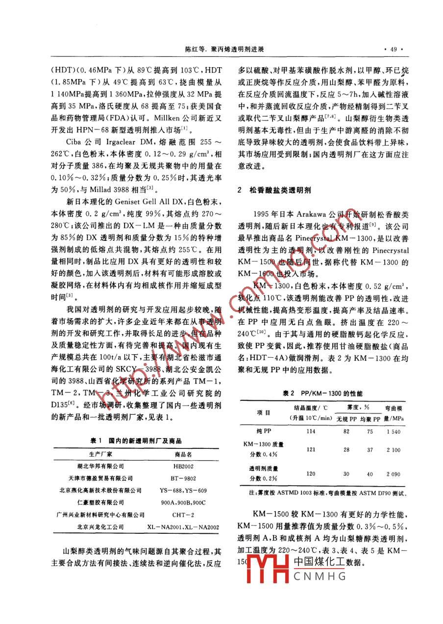 48·Modern Plastics Processing and Applications第16卷第4期聚丙烯透明劑進展陳紅尚小杰姜志榮(揚子石油化工股份有限公司研究院,南京,210048)摘要:闡述了山梨醇衍生物類、有機磷酸鹽類、松香酸等透明劑在聚丙烯(PP)中的應用特別介紹了松香酸及其鹽類透明劑在PP中應用的配方和性能數據,以及透明劑的物性數據關鍵調:聚丙烯透明劑配方性能松香酸述評20世紀70年代中期,日本人 Hamad發(fā)現在聚司推出的 Gel ALL D, Gel ALL MD, Gel ALL dh丙烯(PP)中添加山梨糖醇縮二苯甲醛(DBS),可提 Gel ALL DX等,三井東亞公司的NC-4,EC化高PP的透明性和光澤度,經增透的PP熱變形溫學公司的EC-4,德國 Clariant公司成核劑4030度、剛性、屈服強度提高,結晶速度加快,加工周期縮( Sandostab4030)等。山梨糖醇衍生物類透明劑基短。從此,這一增透技術在世界范圍內得到普遍本無毒性,可用于食品、飲料、醫(yī)藥包裝及醫(yī)療器械采用等產品,但某些公司的產品氣味較大,在應用上受到目前高透明PP主要通過3種途徑獲得:(1)添定的限制加透明改性劑;(2)合成本身具有出色透明性PP產山梨糖醇類第一代產品為DBS,它無取代基品如無規(guī)共聚物;(3)采用茂金屬催化劑聚合的茂金商品牌號有:Mlld3905, Gell ALL D,EC-1屬PP。第一種方法由于技術難度較低、靈活性好、等。結構類似的產品目前還有應用,它的優(yōu)點是簡單易行而成為目前最活躍、最常用的PP透明化可改善制品透明度,對感官沒有刺激;缺點是會析出的有效方法。污垢在加工設備的表面,該類透明劑的應用局限于國內外PP透明劑的開發(fā)和透明PP的研究與增透PP效果要求不高的制品,由于在加工時有析應用十分活躍,在美國透明劑的生產量每年以8%出物因此要注意加工溫度的設定。的速度增長,高于一般塑料添加劑5%的增長率針對第一代透明劑的不足,20世紀80年代中目前國內的透明劑大多以山梨醇類為主,預計到后期開發(fā)出第二代透明改性劑,主要產品有 Millad2005年國內透明劑的需求量將達500t以上。目前3940, Gel All Mp, Genisot MD,NC-4 Gel All已商品化的品種主要是山梨糖醇衍生物類、有機磷DA,EC-4等。這些產品可使制品的透明性進一酸鹽類、松香酸及其鹽類。本文總結了近年來在PP步改善加工工藝條件適用范圍較寬,但某些產品對中應用的透明劑新品種,特別是鮮見報道的松香酸們的感官有刺激,使用中略有異味,不受加工者和及其鹽類透明劑,并介紹了其在PP中應用的配方制品的使用者歡迎。這些異味,主要是由微量的游和性能數據、透明劑的物性數據及其相關技術的國離醛引起,游離醛主要來源于山梨醇縮醛生產過程內外現狀與進展。中的殘留醛和樹脂加工過程中所產生的醛。以 Milken公司為代表的第三代透明劑Mlad1山梨糖醇類透明劑3988,它們在性能、氣味和其他一些功能方面,均比第二代產品有較大的改善。Mlld3988,熔點1982年美國 Milliken Chemical公司商品化了275℃,白色粉末,純度大于96%,本體密度第一代山梨糖醇類專利產品Mlld3905,1986年0.37g/cm3,需高溫加工。加入量200g/g時,濁生產了第二代Mlad3940,自1995年起至今廣泛度14.4%;加入質量分數0.25%時,熱變型溫度使用的是第三代專利產品Mlad39881,該公司已有近二十多年的開發(fā)與研究歷史。世界各大助劑制中國煤化工造商相繼開發(fā)了與此類似的同類產品,如瑞土CibaCNMHG于南京化工學院,現公司的 Irgaclear D, Irgaclear DM2,新日本化學公從事于塑料加工應用的研制與開發(fā)工作陳紅等.聚丙烯透明劑進展49(HDT)(0.46MPa下)從89℃提高到103℃,HDT多以硫酸、對甲基苯磺酸作脫水劑,以甲醇、環(huán)已烷(1.85MPa下)從49℃提高到63℃,撓曲模量從或正庚烷等作反應介質,用山梨醇、苯甲醛為原料,1140MPa提高到1360MPa,拉伸強度從32MPa提在反應介質回流溫度下,反應5~7h,加入堿性溶液高到35MPa,洛氏硬度從68提高至75;獲美國食中,和并蒸流回收反應介質,產物經精制得到二芐叉品和藥物管理局(FDA)認可。 Milken公司新近又或取代二芐叉山梨醇產品,。山梨醇衍生物類透開發(fā)出HPN-68新型透明劑推入市場明劑基本無毒性,但由于生產中游離醛的消除不徹Ciba公司 Irgaclear DM,熔融范圍255~底導致異味較大的透明劑,會使食品飲料帶上異味262℃,白色粉末,本體密度0.12~0.29g/cm3,相其市場應用受到限制;國內透明劑廠在這方面應注對分子質量386,在均聚及無規(guī)共聚物中的用量在意改進0.10%~0.32%;質量分數為0.25%時,其透光率為50%,與Mld3988相當32松香酸鹽類透明劑新日本理化的 Genset Gell A!DX,白色粉末,本體密度0.2g/cm3,純度99%,其熔點約270~1995年日本 Arakawa公司開始研制松香酸類280℃;該公司推出的DX一LM是一種由質量分數透明劑,隨后新日本理化也有專利報道。該公司為85%的DX透明劑和質量分數為15%的特種增最早推出商品名 Pinecrystal KM-1300,是以改善強劑制成的低熔點共混物,其熔點約255℃。在用透明性為主的透明劑,以改善剛性的 Pinecrystal量相同時,制品比應用DX具有更好的透明性和較KM-1500也隨后問世,據稱代替KM-1300的好的顏色,加入該透明劑后,材料有可能形成溶膠或KM-1600也投入市場。凝膠網絡,在材料體內有均相成核作用并縮短成型KM-1300,白色粉末,本體密度0.52g/cm3時間。軟化點110℃,該透明劑能改善PP的透明性,改進我國對透明劑的研究與開發(fā)應用起步較晚,隨機械性能,提高熱變形溫度,提高產率及結晶速率著市場需求的擴大,許多企業(yè)近年來都在從事透