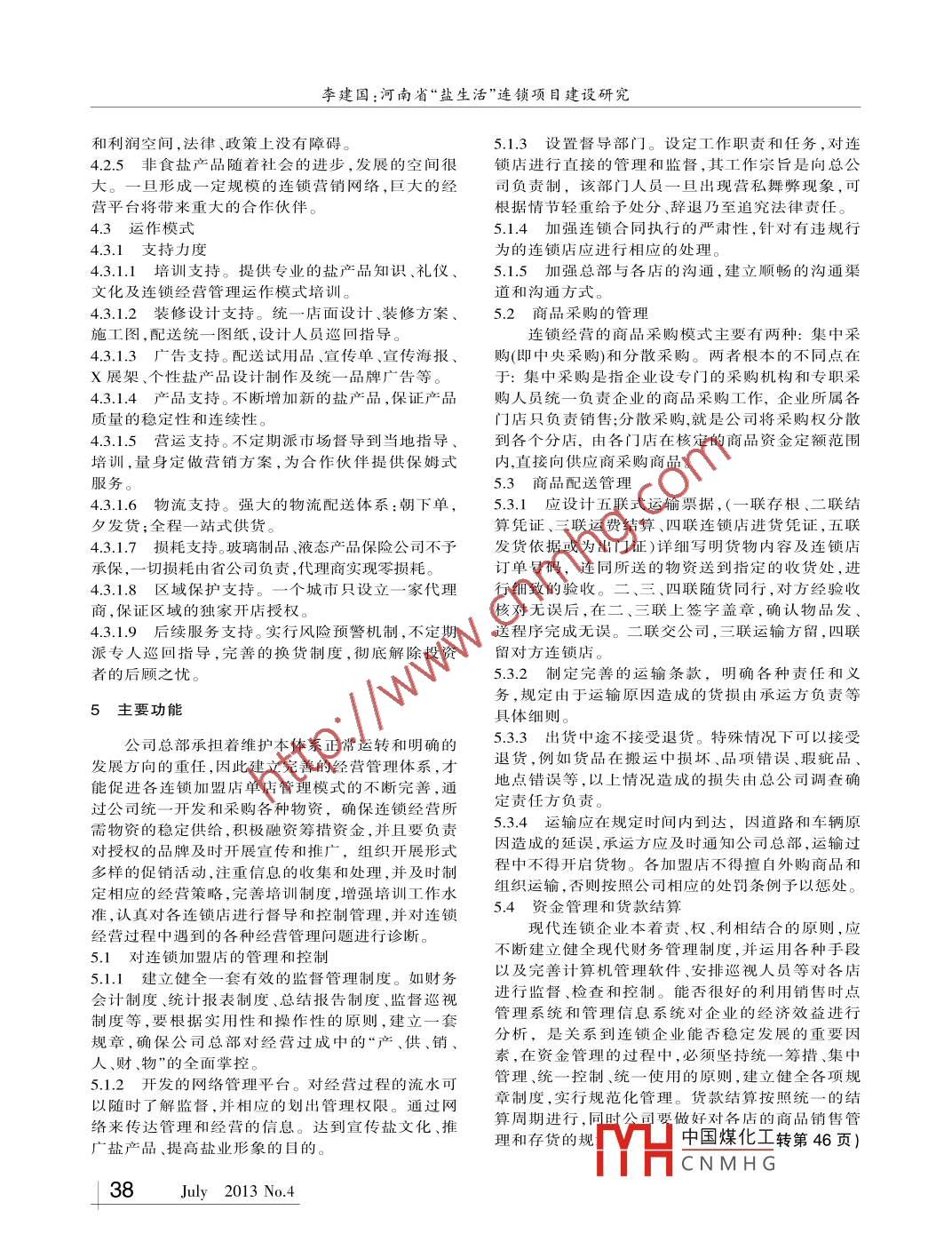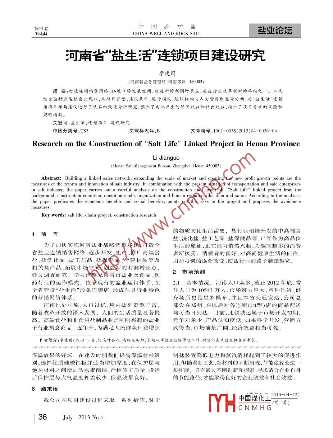 第44卷中國井礦鹽鹽業(yè)論壇Vol.44CHINA WELL AND ROCK SALT河南省"鹽生活"連鎖項目建設(shè)研究李建國(河南省鹽務(wù)管理局,河南鄭州450003)摘要:打造連鎖銷售網(wǎng)絡(luò),拓展市場發(fā)展空間,創(chuàng)造新的利潤增長點,是鹽行業(yè)改革創(chuàng)新的舉措之一。本文結(jié)合鹽行業(yè)運銷企業(yè)現(xiàn)狀,從項目背景、建設(shè)條件、運行模式、組織機(jī)構(gòu)與人力資源配置等方面,對“鹽生活”連鎖店項目布局建設(shè)進(jìn)行了認(rèn)真細(xì)致地分析研究,預(yù)測了由此產(chǎn)生的經(jīng)濟(jì)效益和社會效益,指出了項目存在的風(fēng)險和.規(guī)避措施。關(guān)鍵詞:鹽生活;連鎖項目;建設(shè)研究中圖分類號:TS3文獻(xiàn)標(biāo)識碼:B文章編號:1001-0335(2013)04- -0036-04Research on the Construction of“Salt Life" Linked Project in Henan ProvinceLi Jianguo( Henan Salt Management Bureau, Zhengzhou Henan 450003 )Abstract: Building a linked sales network, expanding the scale of market and creating the new profit growth points are the .measures of the reform and innovation of salt industry. In combination with the present situation of transportation and sale enterprisesin salt industry, the paper carries out a careful analysis on the construction and layout of“Salt Life” linked project from thebackground, construction condition, operation mode, organization and human resource allocation and so on. According to the analysis,the paper predicates the economic benefits and social benefits, points out the risks in the project and proposes the avoidancemeasures.Key words: salt life, chain project, construction research的物質(zhì)文化生活需要,鹽行業(yè)相繼開發(fā)的中高端食1前言鹽、洗化鹽、鹽工藝品、鹽保健品等,已經(jīng)作為高品位為了加快實施河南鹽業(yè)戰(zhàn)略調(diào)整步伐,打造全生活的象征,正在國內(nèi)俏然興起,為越來越多的消費省鹽業(yè)連鎖銷售網(wǎng)絡(luò),逐步開發(fā)、生產(chǎn)、推廣高端食者所接受。消費者的喜好、對高尚健康生活的向往,鹽、鹽洗化品、鹽工藝品、鹽保健品、鹽建材品等及用鹽習(xí)慣的逐漸改變,使鹽行業(yè)的路子越走越寬。相關(guān)鹽產(chǎn)品,拓展市場空間,創(chuàng)造新的利潤增長點,2市場預(yù)測經(jīng)過調(diào)查研究,學(xué)習(xí)借鑒兄弟省市鹽業(yè)及食品、醫(yī)藥行業(yè)的運作模式,依靠現(xiàn)行的鹽業(yè)運銷體系,在2.1 基本情況。河南人口眾多, 截止2012年底,常全省建設(shè)“鹽生活”形象連鎖店,形成獨具行業(yè)特色住人口為10543 萬人,市場潛力巨大,各種洗浴、健的營銷網(wǎng)絡(luò)體系。身場所更是星羅棋布,并且本省交通發(fā)達(dá),公司總河南地處中原,人口過億,境內(nèi)鹽礦資源豐富。部設(shè)在鄭州,在以后對各連鎖(加盟)店的商品配送隨著改革開放的深人發(fā)展,人們的生活質(zhì)量顯著提均可當(dāng)日到達(dá)。目前,此領(lǐng)域還屬于市場開發(fā)初期,高。高端食鹽和非食用鹽制品業(yè)是剛剛興起的鹽業(yè)競爭對象少,產(chǎn)品認(rèn)知度低,如果科學(xué)開發(fā)、營銷方子行業(yè)概念商品。近年來,為滿足人民群眾日益增長式得當(dāng),市場前景廣闊,經(jīng)濟(jì)效益相當(dāng)可觀。作者簡介:李建國(1958-),男,河南葉縣人,高級經(jīng)濟(jì)師,長期從事鹽業(yè)經(jīng)濟(jì)管理工作,現(xiàn)任河南省鹽業(yè)協(xié)會秘書長。保溫效果的好壞,在建設(shè)時期我們提高保溫材料級制鹽裝置降低電力和蒸汽消耗起到了較大的促進(jìn)作別,選擇優(yōu)質(zhì)硅酸鋁板并適當(dāng)增加厚度,在保護(hù)層與用,但隨著新工藝新材料的不斷出現(xiàn),節(jié)能途徑會進(jìn)一絕熱材料之間增加防水聚酯層,嚴(yán)控施工質(zhì)量,投運步拓展。只有通過不斷創(chuàng)新和探索,尋求適合企業(yè)自身后保護(hù)層與大氣溫度相差較少,保溫效果良好。的節(jié)能路徑,才能取得良好的企業(yè)效益和社會效益。6結(jié)束語中國煤化工2013-04-12)我公司在項目建設(shè)過程采取一-系列措施,對于周蕾)MHCNM HG36July 2013 No.4李建國:河南省“鹽生活”連鎖項目建設(shè)研究2.2市場前景。由于“鹽生活”連鎖店經(jīng)銷的產(chǎn)品進(jìn)省公司今年以市為單位,著力建設(shè)推廣25-~30個人人們生活的時間較短,市場開發(fā)還屬初始階段,“鹽生活”連鎖專賣店。待總結(jié)比較成熟的運作模式后,人們對此類產(chǎn)品的了解和使用還有一定的局限性。用一年左右的時間,實現(xiàn)全省各縣均有- -家,全省建因此,對我們開發(fā)市場既是機(jī)遇又是挑戰(zhàn)。當(dāng)前,在成150家左右“鹽生活”形象專賣店。然后,逐步滲透我省眾多城鎮(zhèn)中經(jīng)營各種鹽產(chǎn)品的公司、商戶可以至農(nóng)村的鄉(xiāng)鎮(zhèn)市場,增加連鎖門店內(nèi)非鹽商品的份說是鳳毛麟角,市場的供應(yīng)和需求存在著巨大的偏額,形成具有較大營銷能力的綜合性商業(yè)零售網(wǎng)絡(luò)。差,供應(yīng)渠道極不通暢。有市場有需求就意味著商通過零售經(jīng)營網(wǎng)絡(luò)的形成,帶動相關(guān)產(chǎn)品的開機(jī)的存在。及時捕捉到商機(jī),開發(fā)市場進(jìn)而占領(lǐng)市發(fā)、生產(chǎn)和經(jīng)營工作,并在經(jīng)營中發(fā)現(xiàn)新產(chǎn)品的開場、建立和完善營銷體系,豐富商品種類和層次是發(fā)和消費需求重點。