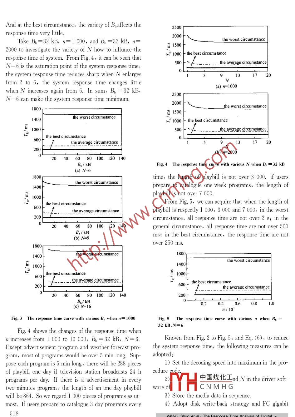 Vol.10 No.3 2005 515-519WUJNSWuhan University Journal of Natural SciencesArticle ID: 1007- 1202(2005)03-0515-05The Response Time Analysis of DigitalBroadcasting System0 Introduction口WANG Shuo, ZHANG Jiang- ling,FENG Danroadcasting system is a core of television station’s digit-School of Computer Science and Technology,HuazhongB! al developments, having become a highlight of researchUniversity of Science and Technology, Wuhan 430074,Hubei, Chinaon computer application[.2]. It should meet the real-time keyperformance demand. The accidentally change of playbill existsAbstract: Digital broadcasting system has become a high-in the process of program broadcasting. The maximum r(light of research on computer application. To respond to thesponse time of the system when the playbill is changed mustchanges of the playbill in the broadcasting system in real .be gotten, so that users can modify playbills before the time.time, the response time of the system must be studied. ThereIn addition, having a certain response time, users can easilyis scarcely the research on this area currently. The influencefactors in the response time are analyzed; the model on thecheck whether the operations are proper. At the same time,response time of the system service is built; how the influencethe analyses on the response time benefits designer to optimizefactors affect the response time of the system service is valida-ted; and four improvement measures are proposed to minimizethe system functions and find out the strategy that can respondthe response time of system service.to changes of the playbill in real time. So it is very necessaryKey words: digital broadcasting system; response time; .to study the response time of the digital broadcasting systemservice.CLC number: TP 333However, there is scarcely the research on this area cur-rently [3-10]. The response time of the digital broadcasting sys-tem service will be studied from four aspects: its influence fac-tors, its model, how the influence factors affect the responsetime of the system service and the improvement measures.1 The Factors Influencing the ResponseTime of System ServiceKnown from the IO route in Fig. 1, the response time ofbroadcasting system service includes three parts. The first,Received date: 2004- 03-06the time to中國煤化Igue workstation to net-Foundation item: Supported by the National Natural Science Foun-dation of China( 60273074)work managYCNMHGS T. The second, theBiography: WANG Shuo(1971-), female, Ph. D candidate, researchtime to transter playbill trom network management worksta-direction: massive storage technology and digital broadcasting technol-ogies. E mail: ws_ beronws@ hotmail. comtion to the gigabit net card of storage and broadcasting server,515Wuhan University, Joumal of Natural Sciences Vol.10 No.3 2005Users|od on which disk is written.If adopting write back strategy, Vw in this system is .|Cataloguing workstation160 MB/s. If adopting writethrough strategy, Vw is215-315 Mb/s. Tw and T; will be various with the differ-↓playbillent writing strategy.Network manage workstationDue that CPU processes modifying and creating pro-plsyillgram chain. When there are n pieces of playbill, T。willStorage and broadcasting serverbe O(n).Reading the playbill and setting up the program| Broadcasting|chain, the server will send out read request according tothe playbill. Ta is related with disk transerring rate U,F(xiàn)ig. 1 The IO route in broadeasing systemsize of data block Bs and the position of disk head. It in-believe this time as T2. The third, the time that storagecludes T。 (the seek time), T,(the rotalodelay time), andand broadcasting server accepts and responds the play-the delivering data time T. Among of them, U can bebill,assume this time as Ts、gotten by disk parameters. Bg is the size of a frame mediaTl and T2 relate to Vq and B. Vq is the deliveringstream equaling with 0.924 42 MB. Assume the numberspeed of gigabit nets and B is the size of playbill. Ts con-of disk in RAIDO as N, the size of data block in RAIDOsistsof T,To,Tg,T。and Tp. T; is the receive timeas B. T, and Tr are random and have something to dothat the server receives the playbill from its net cardswith the position of disk head, so when reading a framememory to its disk, Te is the time modification and crea-of media stream, Ts isting program chain, T is the response time of RAID, Teis the decoder time for program data, and Tp is the pla-Ts =B.N(T.+ T, + B:/u)(1)ying time for a frame of media stream data.The media data is sent to decoder buffer to decode1.1 The Influence Factors in T and T2In a real environment, Vq of gigabit net cards is lessafter it is fetched the host memory from RAID, here thehan 1 000 Mb/s. The reason is that the network speed istransmission time that transferring data from memory torelative with the number of processes, TCP window size,memory could be neglected. T。 is related with the size offrame B。and the decoding speed Ve. The size of decodingand I0 bus and hard disk of the measured server [3-8] .This broadcasting system uses 10 pieces of 3C985B-frame is a frame of media data, and the decoding speedSX net cards, which are high performance server netscan be acquired from the decoding card parameter. This .card just for gigabit Ethernet environment. In this sys-system uses Targa 3000 as the decoding card; its decodingtem, the 3C985B-SX-performance is that the throughputspeed is 10-50 Mb/s.Program in this system is in the type of PAL( phasefrom client to server comes to 942. 204 Mb/s; the CPUutilization is 52. 917%. And the throughput from serverAlteration Line), so broadcasting velocity should be 25frame/s, then Tp is 40 ms.to client comes to 940. 655 Mb/s; CPU utilization is46. 333%.The playbill's size also influences the respond time2 Mathematics Model of Responseof system. The longer the playbill is, the longer the de-Time of Broadcasting System Servicelivers time of network is, and the longer the responsetime is too. In