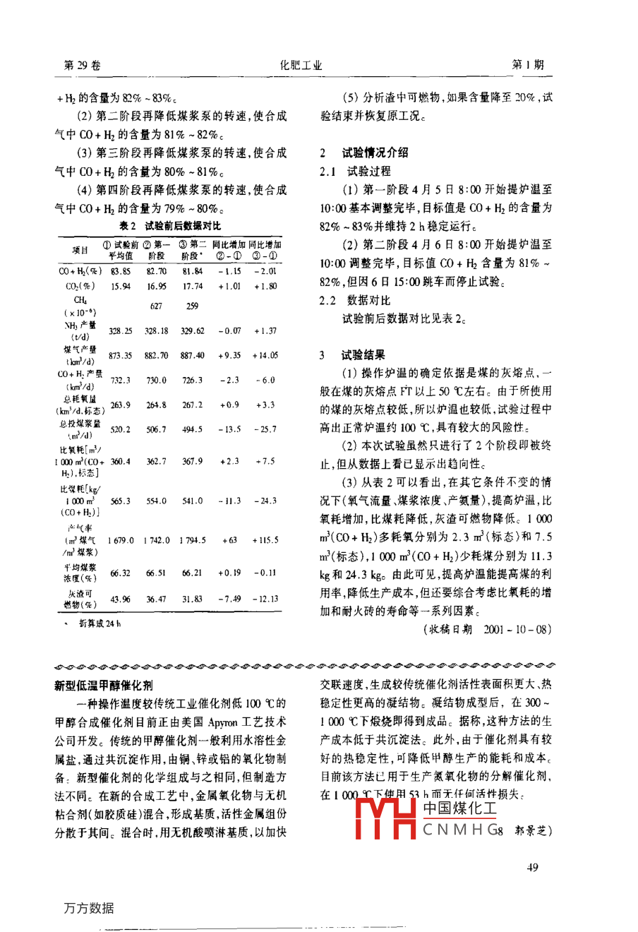 第29卷化肥工業(yè)第1期德士古氣化爐的提溫操作金剛張濤(山東省兗礦魯南化肥廠滕州277527)摘要通過更換煤種使生產(chǎn)消耗得到了大幅度降低,生產(chǎn)能力得到了較大的捉高,但渣中可燃物較設(shè)計標提高了2-3倍。為此進行了提高爐溫的試驗,考察渣中可燃物隨爐溫的變化關(guān)系,同時考核不同渣中可然物含量下的氧耗和煤耗。關(guān)鍵詞德士古氣化爐灰渣可燃物操作溫度兗礦魯南化肥廠的德士古氣化裝置自1993本次試驗的主要日的是考察渣屮可燃物隨爐年4月試車以來進行了較多的技術(shù)改造,生產(chǎn)能溫的變化關(guān)系,同時考核不同渣中可燃物含量下力由年產(chǎn)8萬t合成氨提高到年產(chǎn)10.7t,生產(chǎn)用的氧耗煤耗ε煤由原來的單一“七五"煤發(fā)展成多礦點混煤。隨1.2試驗原則及注意事項著生產(chǎn)產(chǎn)量的提高、使用煤種的增多,灰渣中可燃(1)本次試驗氧氣流量不變、壓力保持穩(wěn)定物含量也有所升高(表1)。分析其原因,認為操在(3.8±0.05)MPa,氧氣純度在9.6%以上,通作爐溫過低是主要因素,因此在200年4月進行過逐漸降低煤漿泵轉(zhuǎn)速以提高O/C伯,最終達到了提高爐溫的試驗工作提溫之目的。表1不同煤種灰渣可燃物含量(2)以合成氣中C+H2的百分含量每降低項1993年194年1995年1996年1998年%為一個階段,每個階段穩(wěn)定運行24h,每個階北i段從8:00開始,氣體分析又增加了9:00和1:00北宿北宿楊落陵≯落2次(原是每個雙點分析1次)(3)爐溫提升應緩慢,煤漿泵轉(zhuǎn)速應緩慢降燃物)10-1515-202530操作溫1450I400140013501350(4)試驗時應嚴格監(jiān)視合成氣溫度(≤℃)、合成氣成份、支撐板溫度(≤25℃)、爐壁溫度(≤260℃)、甲烷含量、排渣情況等,在上述參1試驗方案的制定數(shù)不出現(xiàn)異常時才能進行下一步的試驗,否則試本次系統(tǒng)運行從200年3月11日開始,試驗終止。驗時系統(tǒng)運行穩(wěn)定,各項指標已得到優(yōu)化,試驗結(jié)(5)儀表車間應保持在線甲烷表的準確性,果應是具有代表性的并每天校驗1次德士古氣化爐高溫熱電偶的使用壽命一般不(6)試驗期間灰渣取樣每班2次(原每班1超過1周。本次試驗選在非初始開車階段熱電次),分別在接班后的第三第六小時取樣:煤質(zhì)分偶已不能指示,只能以氣體成份為參考來標定爐析室分白班、中班隨時分析,分析結(jié)果及時上報至溫。盡管甲烷含量能較快地反映爐溫,但變化較相關(guān)部門決,受系統(tǒng)其它因素影響較大。CO+H2的百分含(7)試驗期間操作人員應真實地記錄工藝參量隨爐溫的升高而降低,雖變化慢一些,但受其它數(shù),認真巡回檢查,氣化爐壁溫每2小時用紅外測因素干擾小,爐溫與CO+H2含量的對應關(guān)系較溫儀實測1次為確定,再現(xiàn)性較好,所以選定以CO+H的含量1L凵中國煤化工標定爐溫CNMHG+H2=83.85%),1.1試驗目的逐步降低煤漿泵轉(zhuǎn)速,提高OC值,使合成氣中第29卷化肥工業(yè)第期+H2的含量為8%-83%c(5)分析渣中可燃物,如果含量降至20%,試(2)第二階段再降低煤漿泵的轉(zhuǎn)速,使合成驗結(jié)束并恢復原工況氣中CO0+H2的含量為81%~82%c(3)第三階段再降低煤漿泵的轉(zhuǎn)速,使合成2試驗情況介紹氣中CO+H2的含量為80%~81%c2.1試驗過程(4)第四階段再降低煤漿泵的轉(zhuǎn)速,使合成(1)第一階段4月5日8:00開始提爐溫至氣中CO+H2的含量為79%~80%。10:00基本調(diào)整完畢,目標值是CO+H2的含量為2試驗前后數(shù)據(jù)對比82%~83%并維持2h穩(wěn)定運行項日①試驗前②第一③第二同比增加同比增加(2)第二階段4月6日8:00開始提爐溫至段C0+H(%)83.8582.708184-1.15-2.0110:00調(diào)整完畢,目標值CO+H含量為81%O2(%)159416.9517.74+1.01+1.8082%,但因6日15:00跳車而停止試驗2.2數(shù)據(jù)對比H2產(chǎn)量試驗前后數(shù)據(jù)對比見表2t/d)3825328.18329.62-007+1.37煤氣產(chǎn)量km/d873.35882,70887,40+935+14.053試驗結(jié)果CO+H產(chǎn)量0726.3(1)操作爐溫的確定依據(jù)是煤的灰熔點,般在煤的灰熔點FT以上50℃左右。由于所使用263.9264.8267.2+0.9+3.3的煤的灰熔點較低,所以爐溫也較低,試驗過程中總投煤漿量520.2506,7494.5高出正常爐溫約100℃,具有較大的風險性比氧耗[m3(2)本次試驗雖然只進行了2個階段即被終0m3(CO+360.436273679+23+75止,但從數(shù)據(jù)上看已顯示出趨向性H2)標態(tài)]3)從表2可以看出,在其它條件不變的情565.3554.0541.0.3-24.3況下(氧氣流量、煤漿濃度、產(chǎn)氨量),提高爐溫,比(CO+H: )氧耗增加,比煤耗降低,灰渣可燃物降低ε100m3煤氣1679.01742.0179.5+63+115.5m3(CO+H2)多耗氧分別為23m3(標態(tài))和75m煤漿)標態(tài)),1000m3(C0+H2)少耗煤分別為1l3平均煤漿濃度(66,326.5166.21+0.19-0.1lkg和24-.3kg。由此可見,提高爐溫能提高煤的利灰渣可燃物(袋)439364731.83-749-12.13用率,降低生產(chǎn)成本,但還要綜合考慮比氧耗的增加和耐火磚的壽命等一系列因素折算成24h收稿日期001-10-08)心必必必必必分心辦必必辦?、诒乇丌谵k價命必必必必分必必必必②分分必分新型低溫甲醇催化劑交聯(lián)速度,生成較傳統(tǒng)催化劑活性表面積更大、熱種操作溫度較鉸傳統(tǒng)工業(yè)催化劑低100℃的穩(wěn)定性更高的凝結(jié)物。凝結(jié)物成型后,在300甲醇合成催化劑目前正由美國 Apron工藝技術(shù)100℃下煅燒即得到成品。據(jù)稱,這種方法的生公司開發(fā)。傳統(tǒng)的甲醇催化劑一般利用水溶性金產(chǎn)成本低于共沉淀法。此外,由于催化