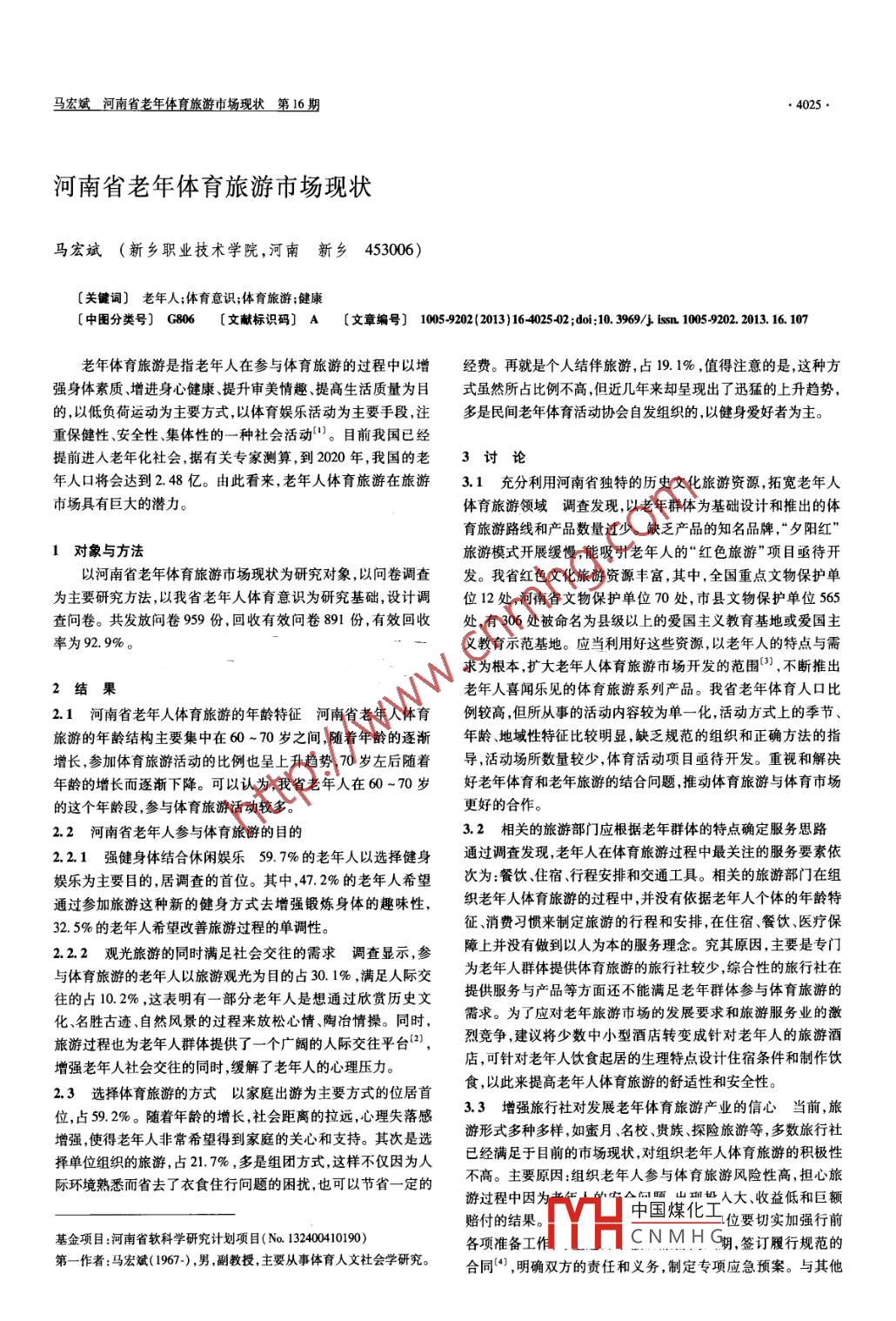 馬宏斌河南省老年體育 旅游市場現(xiàn)狀第16期河南省老年體育旅游市場現(xiàn)狀馬宏斌(新鄉(xiāng)職業(yè)技術(shù)學(xué)院,河南 新鄉(xiāng)453006)[關(guān)鍵詞]老年人;體育 意識;體育旅游;健康[中圖分類號] G806 [ 文獻(xiàn)標(biāo)識碼] A [ 文章編號] 105-9202 (2013) 16 4025 02 ;doi:10.3969/j isn. 1005-9202. 2013. 16. 107老年體育旅游是指老年人在參與體育旅游的過程中以增經(jīng)費(fèi)。再就是個人結(jié)伴旅游,占19. 1% ,值得注意的是,這種方強(qiáng)身體素質(zhì)、增進(jìn)身心健康、提升審美情趣、提高生活質(zhì)量為目式雖然所占比例不高,但近幾年來卻呈現(xiàn)出了迅猛的上升趨勢,的,以低負(fù)荷運(yùn)動為主要方式,以體育娛樂活動為主要手段,注多是民間老年體育活動協(xié)會自發(fā)組織的,以健身愛好者為主。重保健性、安全性、集體性的一種社會活動"。 目前我國已經(jīng)提前進(jìn)入老年化社會,據(jù)有關(guān)專家測算,到2020年,我國的老3討論年人口將會達(dá)到2. 48億。由此看來,老年人體育旅游在旅游3.1充分利用河南省 獨特的歷史文化旅游資源,拓寬老年人市場具有巨大的潛力。體育旅游領(lǐng)域調(diào)查發(fā)現(xiàn), 以老年群體為基礎(chǔ)設(shè)計和推出的體育旅游路線和產(chǎn)品數(shù)量過少。缺乏產(chǎn)品的知名品牌,“夕陽紅”1對象與方法旅游模式開展緩慢,能吸引老年人的“紅色旅游”項目亟待開以河南省老年體育旅游市場現(xiàn)狀為研究對象,以問卷調(diào)查發(fā)。我省紅色文化旅游資源豐富,其中,全國重點文物保護(hù)單為主要研究方法,以我省老年人體育意識為研究基礎(chǔ),設(shè)計調(diào)位12處,河南省文物保護(hù)單位70處,市縣文物保護(hù)單位565查問卷。共發(fā)放問卷959份,回收有效問卷891份,有效回收處,有306處被命名為縣級以上的愛國主義教育基地或愛國主率為92.9%。義教育示范基地。應(yīng)當(dāng)利用好這些資源,以老年人的特點與需求為根本,擴(kuò)大老年人體育旅游市場開發(fā)的范圍(3),不斷推出2結(jié)果老年人喜聞樂見的體育旅游系列產(chǎn)品。我省老年體育人口比2.1河南省 老年人體育旅游的年齡特征河南省老年人體 育例較高,但所從事的活動內(nèi)容較為單一化, 活動方式上的季節(jié)、旅游的年齡結(jié)構(gòu)主要集中在60 ~70歲之間,隨著年齡的逐漸年齡、地域性特征比較明顯,缺乏規(guī)范的組織和正確方法的指增長,參加體育旅游活動的比例也呈上升趨勢,70歲左后隨著導(dǎo),活動場所數(shù)量較少,體育活動項目亟待開發(fā)。重視和解決年齡的增長而逐漸下降??梢哉J(rèn)為,我省老年人在60~70歲好老年體育和老年旅游的結(jié)合問題推動體育旅游與體育市場的這個年齡段,參與體育旅游活動較多。更好的合作。2.2河南省老年人參 與體育旅游的目的3.2相關(guān)的旅游部門應(yīng)根據(jù) 老年群體的特點確定服務(wù)思路2.2.1強(qiáng)健身體結(jié)合休閑娛樂 59. 7%的老年人以選擇健身通過調(diào)查發(fā)現(xiàn),老年人在體育旅游過程中最關(guān)注的服務(wù)要素依娛樂為主要目的,居調(diào)查的首位。其中,47.2%的老年人希望次為:餐飲、住宿、行程安排和交通工具。相關(guān)的旅游部門在組通過參加旅游這種新的健身方式去增強(qiáng)鍛煉身體的趣味性,織老年人體育旅游的過程中,并沒有依據(jù)老年人個體的年齡特32.5%的老年人希望改善旅游過程的單調(diào)性。征、消費(fèi)習(xí)慣來制定旅游的行程和安排,在住宿、餐飲、醫(yī)療保2.2.2觀光旅游的同時滿足社 會交往的需求調(diào)查顯示,參障上并沒有做到以人為本的服務(wù)理念。究其原因,主要是專門與體育旅游的老年人以旅游觀光為目的占30. 1% ,滿足人際交為老年人群體提供體育旅游的旅行社較少,綜合性的旅行社在往的占10.2% ,這表明有一部分老年人是想通過欣賞歷史文提供服務(wù)與產(chǎn)品等方面還不能滿足老年群體參與體育旅游的化、名勝古跡.自然風(fēng)景的過程來放松心情、陶冶情操。同時,需求。為了應(yīng)對老年旅游市場的發(fā)展要求和旅游服務(wù)業(yè)的激旅游過程也為老年人群體提供了一個廣闊的人際交往平臺(2) ,烈競爭,建議將少數(shù)中小型酒店轉(zhuǎn)變成針對老年人的旅游酒增強(qiáng)老年人社會交往的同時,緩解了老年人的心理壓力。店,可針對老年人飲食起居的生理特點設(shè)計住宿條件和制作飲2.3選擇體育 旅游的方式以家庭出游 為主要方式的位居首食,以此來提高老年人體育旅游的舒適性和安全性。位,占59.2%。隨著年齡的增長,社會距離的拉遠(yuǎn),心理失落感3.3增強(qiáng)旅行社對發(fā)展 老年體育旅游產(chǎn)業(yè)的信心當(dāng)前,旅增強(qiáng),使得老年人非常希望得到家庭的關(guān)心和支持。其次是選游形式多種多樣,如蜜月、名校、貴族探險旅游等,多數(shù)旅行社擇單位組織的旅游,占21. 7% ,多是組團(tuán)方式,這樣不僅因為人已經(jīng)滿足于目前的市場現(xiàn)狀,對組織老年人體育旅游的積極性際環(huán)境熟悉而省去了衣食住行問題的困擾,也可以節(jié)省- -定的不高。主要原因:組織老年人參與體育旅游風(fēng)險性高,擔(dān)心旅游過程中因為當(dāng)年上的中A要出兜奶人大、收益低和巨額賠付的結(jié)果。中國煤化工.位要切實加強(