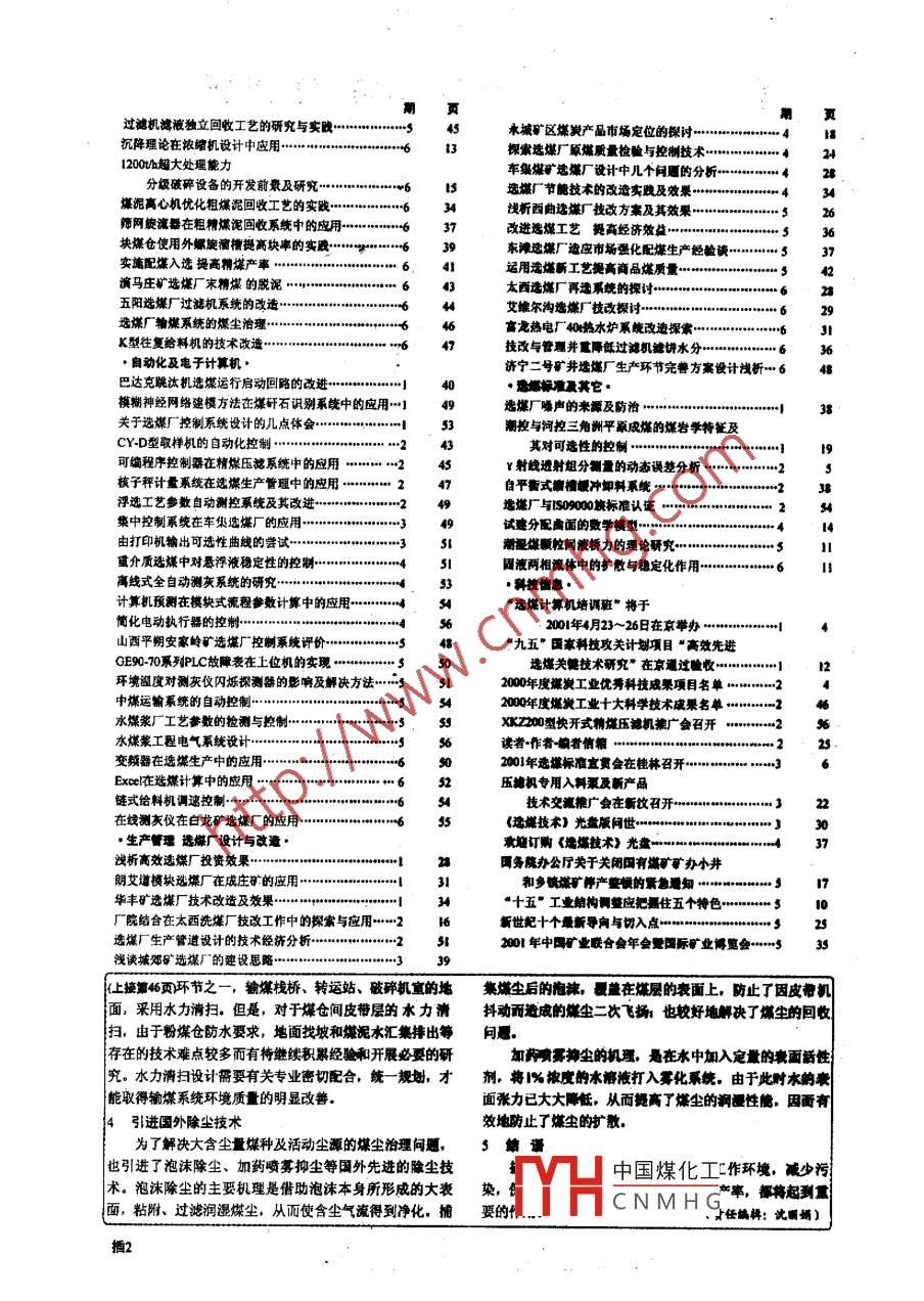 第6啊選媒技術(shù)2001年12月COAL PREPARATION TECHNOLOGY這煤廠輸煤系繞的煤塵冶理絲練張文焦∫江蘇害算一「步設(shè)計江抗剽市,221095)萋根逸煤廠媒塵的特點,提出了劻塵、除塵的具體辦法關(guān)髓調(diào)選煤廠·煤系筑媒塵防塵除塵中圖分類號:TD94624文獻識碼:A裝緩沖鎖氣器。該裝置不僅能起到保護受料皮帶免遭直接選煤廠的生產(chǎn)過程要經(jīng)過裝卸、輸送、轉(zhuǎn)運、篩分破沖擊的作用,而且還能明顯減小誘導(dǎo)風(fēng)量碎等一系列運輸和工藝加工過程,其結(jié)果是產(chǎn)生大量煤采用上述密閉措施后,可大大減小除塵風(fēng)量。據(jù)實塵,嚴重污染環(huán)境經(jīng)過我們多年大量現(xiàn)場實測,在上述測,在轉(zhuǎn)運點處風(fēng)量較未采取密封措施時減少1~1,效塵源點附近,室內(nèi)空氣平均含塵濃度由幾十mpm3到幾百果非常明顯13防止撒煤mgmx,個別塵源點附近(如破碎機下部受料點}甚至達到幾激煤的原因有:煤流橫向或偏心進入受料皮帶:皮帶千mgm,大大超過了國家規(guī)定的衛(wèi)生標準值,致使運行人員難以監(jiān)控設(shè)備,設(shè)備磨損嚴重,電氣絕緣水平下降,給機跑偏;導(dǎo)煤槽過短:導(dǎo)煤槽長度范圍內(nèi)皮帶機脫輻間距過大等。在運行中,相應(yīng)地還過在落煤管端部安裝導(dǎo)流安全生產(chǎn)和工人的身心健康及環(huán)境帶來極大的危害《煤炭工業(yè)選煤廠設(shè)計規(guī)范》要求:當(dāng)煤的外在水分板,增加導(dǎo)爆措長度并使之與帶速相適應(yīng),加密托輥,采小于7%時,應(yīng)設(shè)置機械裝置,亦可采用噴霧、灑水除塵用帶人字形溝槽的膠面滾筒及前傾槽形托輥等措施,較好筆者認為:如何統(tǒng)籌規(guī)劃防塵、除塵、清掃三個環(huán)節(jié),各地解決了皮帶機撒煤問題,為減輕煤塵飛揚創(chuàng)造了條件專業(yè)齊抓共管、綜合治理,是煤塵治理的關(guān)鍵2除塵煤塵治理,實際上是一個系統(tǒng)工程,每一個環(huán)節(jié)都不1防塵可忽視。盡管許多選煤廠在輸煤系統(tǒng)采取了一系列有效的選煤廠在原煤生產(chǎn)輸送、篩分碎破過程中,如果對工防塵措施,但在實際運行中,由于運行管理不善,加之有藝流程和加工輸送設(shè)備不加選擇,忽略環(huán)保因素,將會產(chǎn)些塵源點又難以有效密閉,仍然會有揚塵發(fā)生,因此,除生大量煤塵,因而,要求我們在這個環(huán)節(jié)上采取有效的防塵環(huán)節(jié)必不可少。除塵既要講究方式,還要考慮設(shè)備,塵措廳,主要方法是:對原煤進行加濕:設(shè)備實施密閉防21除塵方式的邊擇塵:輸送過程中防撒就選煤廠輸煤除塵而言,曾經(jīng)采用過噴燕汽除塵、噴水霧除塵以及機械除塵等多種方式,經(jīng)驗告訴我們,噴蒸表面水分過低是原煤在輸送、轉(zhuǎn)運、分破碎過程中汽除塵、噴水霧除塵,均由于水的表面張力過大而不能有造成揚塵并污染環(huán)境的最根本原因,運行經(jīng)驗告訴我們,效地潤漫媒塵,致使除塵效率低下,若管理不獸,還會造當(dāng)原煤表面水分控制在8%~0%時,基本上無揚塵現(xiàn)象發(fā)成二次污染,但這兩種除塵系統(tǒng)比較簡單,機械除塵對生。因此,對原煤進行加漫,是抑制揚塵的最為有效的途般煤種而言,只要工藝系統(tǒng)密封效果好,除塵風(fēng)量選取合徑。在實際運行中,可根據(jù)尿煤性質(zhì)、制粉系統(tǒng)形式、軸近,便能取得意的除塵效果煤系統(tǒng)的防堵能力、當(dāng)?shù)貧夂蛱丶币杂哑诎∥⒙实奈覀兌嗍赣嫷倪x煤廠運行實牌素看對轉(zhuǎn)堝點影響帶因素確定具體加濕量.目前,對原煤進行加漫的主破碎機室及各類煤倉等固定塵源點,采用機械除塵方式較要方法是,用車輛專用注水機向煤車實施攪拌注射加水,為有效:對卸煤溝的地上及地下部分,翻車機的地上部分向皮帶機上的原煤噴水或在轉(zhuǎn)運點、翻車機處加水等不易密封戚移動的塵源點,宜采用水內(nèi)加表面活性劑的12密閉防塵噴霧抑塵輸煤系統(tǒng)及其工藝設(shè)備未采取有效的密閉措施,也是22除塵設(shè)備的選舞造成煤塵外逸的重要原因,根據(jù)設(shè)計及現(xiàn)場運行經(jīng)驗采取目前,在選煤廠應(yīng)用較廣泛的是水浴除塵器。只要本的主要密閉措施是:在計算地下繼式煤槽容積時,留有不體結(jié)構(gòu)設(shè)計合理,水位控制好,就能長期穩(wěn)定運行,該設(shè)少于20%的封底爆,以兔因空斗卸煤造成媒塵外逸。為防止備對煤種的適用范廣,結(jié)構(gòu)簡單,便于制造,造價和運斗內(nèi)原煤通過煤槽縫隙出,在其繼隙處加裝鏈條或橡膠行費用低,維護管理工作量不大,頗受歡迎擋簾;煤流落差大于4m的轉(zhuǎn)運點,在溶煤管的短當(dāng)位女離歷除塵價低。設(shè)名單,上馬快,只尊t200l40508維護得作奢簡介:徐藏女,1%3年生,工學(xué)學(xué)士,江蘇省一工業(yè)3中國煤化工設(shè)計院,工程師。聯(lián)系電活:(0516)3867406CNMHG主要(下看頁)E-mail: buzhong 263. net過濾機濾液獨立回收工藝的研究與實踐永城礦區(qū)煤炭產(chǎn)品市場定位的探討一沉降理論在濃緒機設(shè)計中應(yīng)用……探索選煤廠原煤質(zhì)量檢驗與控制技術(shù)200超大處理能力車集煤礦選煤廠設(shè)計中幾個問題的分析2分級破碎設(shè)備的開發(fā)前景及研究6M選煤廠節(jié)能技術(shù)的改造實踐及效果煤泥高心機優(yōu)化粗煤泥回收工藝的實踐…析西曲選