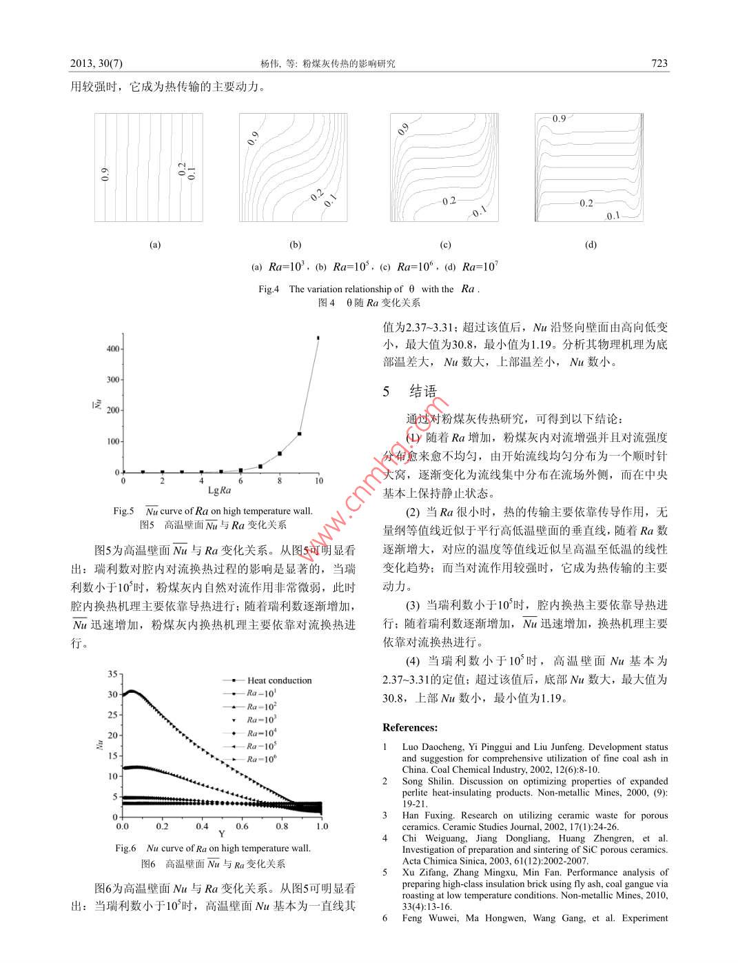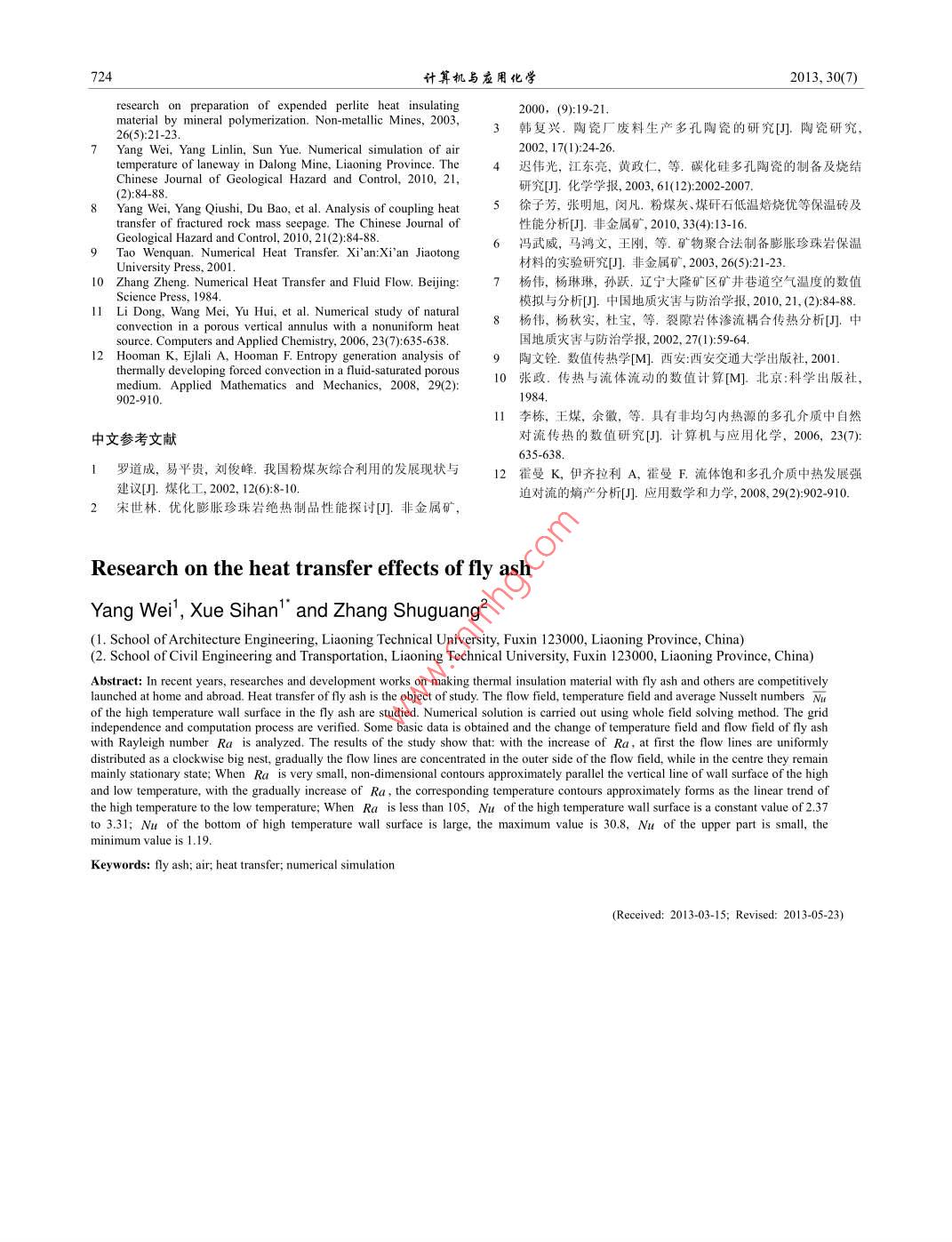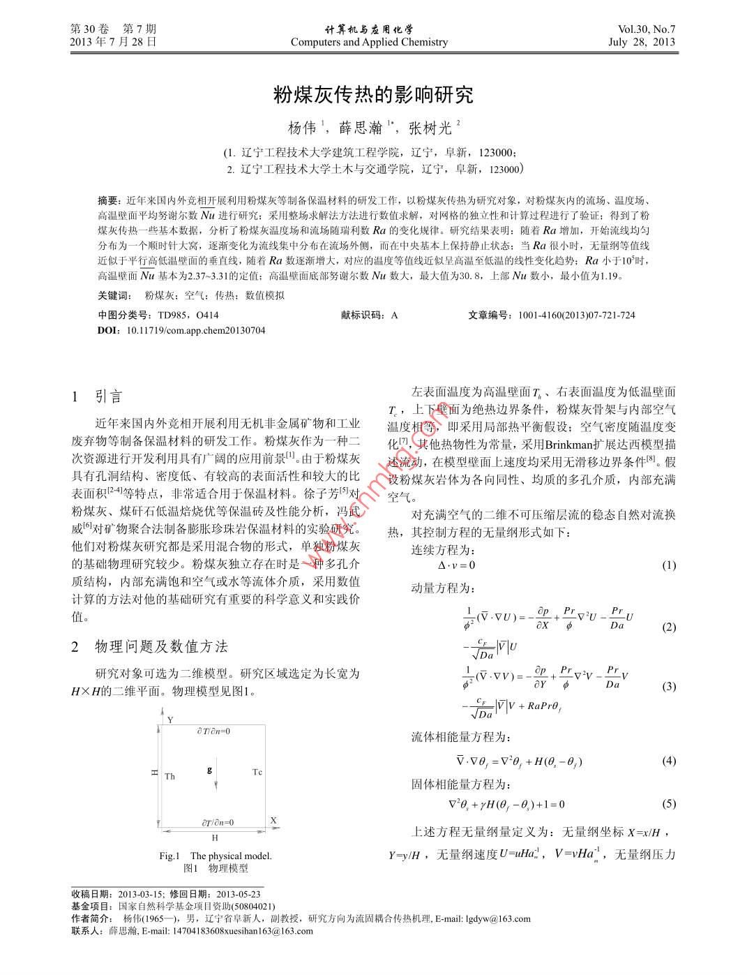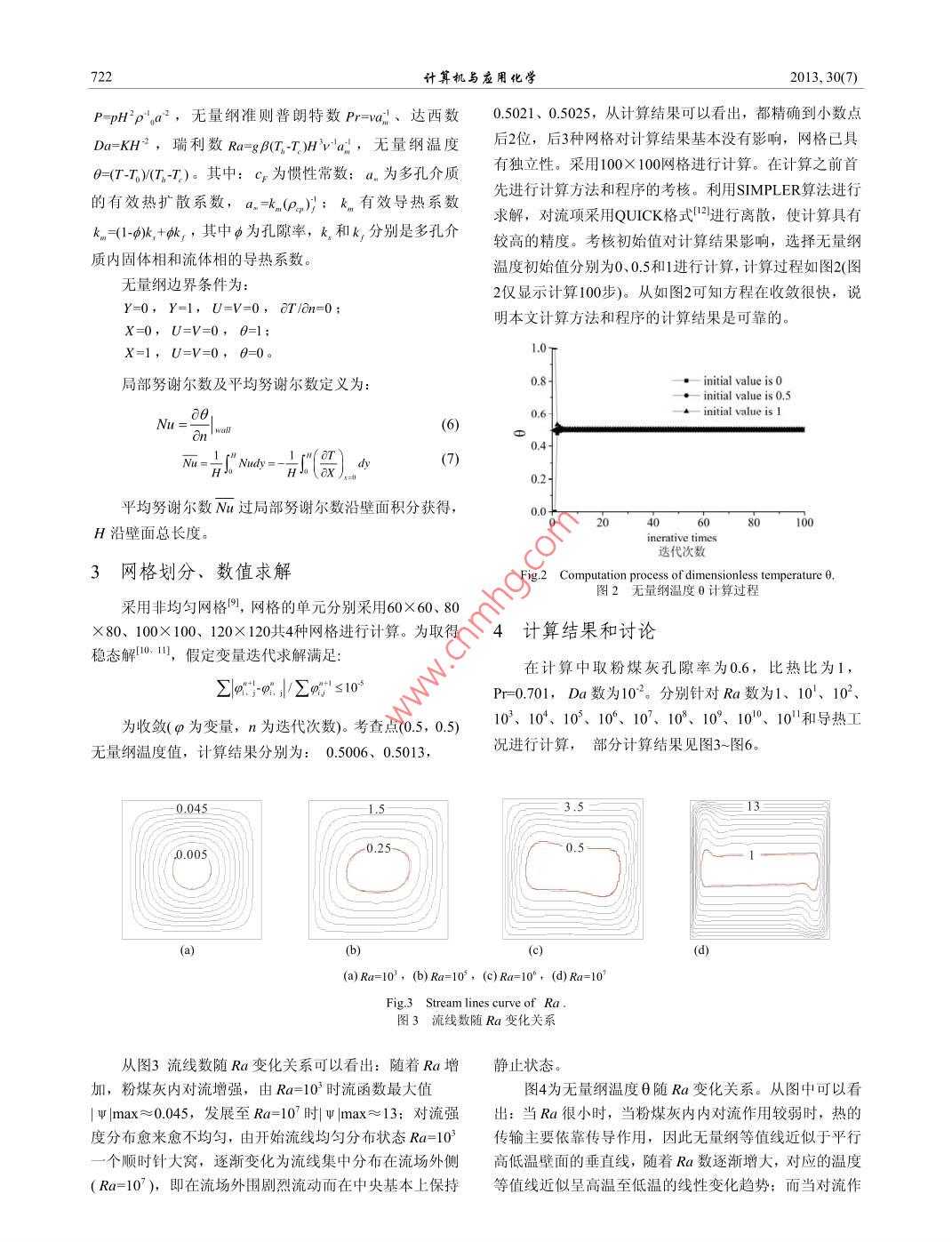 第30卷第7期計算機(jī)與應(yīng)用化學(xué)2013年7月28日Computers and applied ChemistryJuly28,2013粉煤灰傳熱的影響研究楊偉',薛思瀚",張樹光1.遼寧工程技術(shù)大學(xué)建筑工程學(xué)院,遼寧,阜新,1230002.遼寧工程技術(shù)大學(xué)土木與交通學(xué)院,遼寧,阜新,123000摘要:近年來國內(nèi)外競相開展利用粉煤灰等制備保溫材料的硏發(fā)工作,以粉煤灰傳熱為硏究對象,對粉煤灰內(nèi)的流場、溫度玚高溫壁面平均努謝爾數(shù)M進(jìn)行硏究:采用整場求解法方法進(jìn)行數(shù)值求解,對網(wǎng)格的獨立性和計算過程進(jìn)行了驗證:得到了粉煤灰傳熱一些基本數(shù)據(jù),分析了粉煤灰溫度場和流場隨瑞利數(shù)Rα的變化規(guī)律。硏究結(jié)果表明:隨著Rα增加,開始流線均勻分布為一個順時針大窩,逐漸變化為流線集中分布在流場外側(cè),而在中央基本上保持靜止?fàn)顟B(tài):當(dāng)Ra很小時,無量綱等值線近似于平行高低溫壁面的垂直線,隨著Ra數(shù)逐漸增大,對應(yīng)的溫度等值線近似呈高溫至低溫的線性變化趨勢;Ra小于105時,高溫壁面Mat基本為2.37~3.31的定值;高溫壁面底部努謝爾數(shù)№!數(shù)大,最大值為30.8,上部Na數(shù)小,最小值為1.19。關(guān)鍵詞:粉煤灰:空氣;傳熱:數(shù)值模擬中圖分類號:TD985,O414獻(xiàn)標(biāo)識碼:A文章編號:1001-4160(2013)07-721-724DOl: 10. 11719/com. app. chem201307041引言左表面溫度為高溫壁面T、右表面溫度為低溫壁面T’上下壁面為絕熱邊界條件,粉煤灰骨架與內(nèi)部空氣近年來國內(nèi)外競相開展利用無機(jī)非金屬礦物和工業(yè)溫度相等,即采用局部熱平衡假設(shè):空氣密度隨溫度變廢棄物等制備保溫材料的研發(fā)工作。粉煤灰作為一種二化,其他熱物性為常量,采用 Brinkman擴(kuò)展達(dá)西模型描次資源進(jìn)行開發(fā)利用具有廣闊的應(yīng)用前景。由于粉煤灰述流動,在模型壁面上速度均采用無滑移邊界條件。假具有孔洞結(jié)構(gòu)、密度低、有較高的表面活性和較大的比設(shè)粉煤灰?guī)r體為各向同性、均質(zhì)的多孔介質(zhì),內(nèi)部充滿表面積等特點,非常適合用于保溫材料。徐子芳對空氣。粉煤灰、煤矸石低溫焙燒優(yōu)等保溫磚及性能分析,馮武對充滿空氣的二維不可壓縮層流的穩(wěn)態(tài)自然對流換威對礦物聚合法制備膨脹珍珠巖保溫材料的實驗研究。熱,其控制方程的無量綱形式如下他們對粉煤灰研究都是采用混合物的形式,單獨粉煤灰連續(xù)方程為的基礎(chǔ)物理研究較少。粉煤灰獨立存在時是一種多孔介△·v=0質(zhì)結(jié)構(gòu),內(nèi)部充滿飽和空氣或水等流體介質(zhì),采用數(shù)值動量方程為:計算的方法對他的基礎(chǔ)研究有重要的科學(xué)意義和實踐價P物理問題及數(shù)值方法研究對象可選為二維模型。研究區(qū)域選定為長寬為(VVv可p,PrVPrHXH的二維平面。物理模型見圖1。traPreoTan=0流體相能量方程為:Vv=V2+H(O2-0)T固體相能量方程為ar/an=0上述方程無量綱量定義為:無量綱坐標(biāo)X=xHFig. I The physical modelYyH,無量綱速度U=uh,V=wHa,無量綱壓力圖1物理模型收稿日期:2013-03-15;修回日期:2013-05-23基金項目:國家自然科學(xué)基金項目資助(50804021)作者簡介:楊偉(1965-),男,遼寧省阜新人,副教授,研究方向為流固耦合傳熱機(jī)理,E-mai:Igdyw@163.com聯(lián)系人:薛思瀚,E-mail:14704183608xueshanI63a163.com計算機(jī)與應(yīng)用化學(xué)2013,30(7)P-pH'p'oa2,無量綱準(zhǔn)則普朗特數(shù)Pr=w、達(dá)西數(shù)05021.0.505,從計算結(jié)果可以看出,都精確到小數(shù)點Da=KH2,瑞利數(shù)Ra=gB( T-THV a,無量綱溫度后2位,后3種網(wǎng)格對計算結(jié)果基本沒有影響,網(wǎng)格已具0=(7-T)(T-T)。其中:C為慣性常數(shù);an為多孔介質(zhì)有獨立性。采用100×100網(wǎng)格進(jìn)行計算。在計算之前首的有效熱擴(kuò)散系數(shù),a.k()}:k,有效導(dǎo)熱系數(shù)先進(jìn)行計算方法和程序的考核。利用 SIMPLER算法進(jìn)行求解,對流項采用QUCK格式12進(jìn)行離散,使計算具有kn(-9+,其中φ為孔隙率,k和k,分別是多孔介較高的精度??己顺跏贾祵τ嬎憬Y(jié)果影響,選擇無量綱質(zhì)內(nèi)固體相和流體相的導(dǎo)熱系數(shù)。溫度初始值分別為0、0.5和1進(jìn)行計算,計算過程如圖2(圖無量綱邊界條件為2僅顯示計算100步)。從如圖2可知方程在收斂很快,說Y=0,Y=1,U=V=0,OT/an=0;明本文計算方法和程序的計算結(jié)果是可靠的。X=1,U=V=0,=01.0局部努謝爾數(shù)及平均努謝爾數(shù)定義為initial value is 0.5initial value is Iwarl!0.2平均努謝爾數(shù)Mu過局部努謝爾數(shù)沿壁面積分獲得,H沿壁面總長度。選代次數(shù)3網(wǎng)格劃分、數(shù)值求解Fig 2 Computation process of dimensionless temperature 0,圖2無量綱溫度θ計算過程采用非均勻網(wǎng)格明,網(wǎng)格的單元分別采用60×60、80×80、100×100、120×120共4種網(wǎng)格進(jìn)行計算。為取得4計算結(jié)果和討論穩(wěn)態(tài)解1,假定變量迭代求解滿足在計算中取粉煤灰孔隙率為0.6,比熱比為1,∑叫:g.∑q≤10Pr=0.701,Da數(shù)為102。分別針對Ra數(shù)為1、10、102、為收斂(為變量,n為迭代次數(shù))??疾辄c(0.5,0.5)103、104、105、105、107、103、10、101°、10和導(dǎo)熱工無量綱溫度值,計算結(jié)果分別為:0.5006、0.5013,況進(jìn)行計算,部分計算結(jié)果見圖3~圖6。0.045-130.005(d)()a=10,(b)Ra10,()R10,(d)Ra=10Fig 3 Stream li