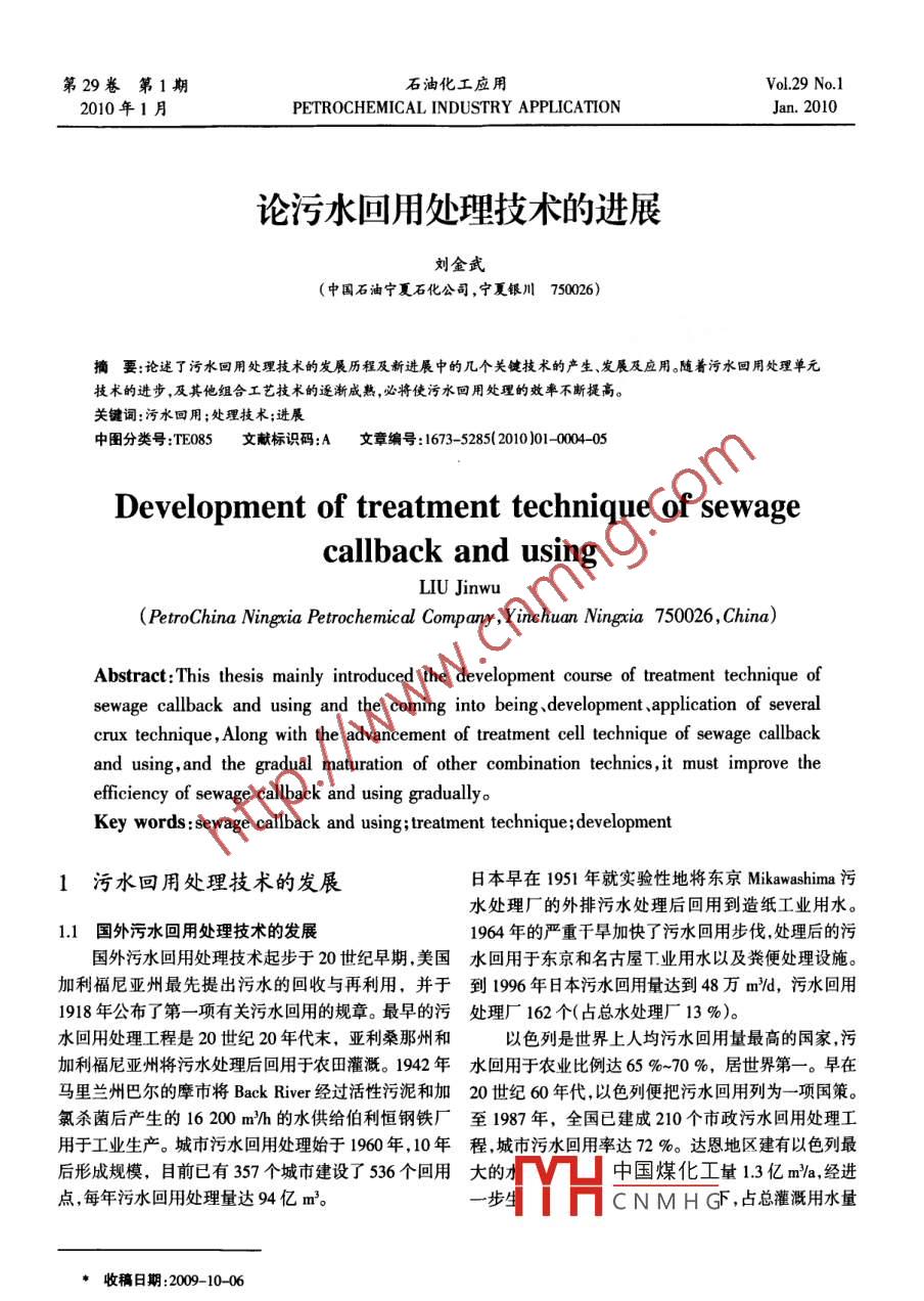 第29卷第1期石油化工應(yīng)用Vol.29 No.12010年1月PETROCHEMICAL INDUSTRY APPLICATIONJan. 2010論污水回用處理技術(shù)的進(jìn)展劉金武(中國(guó)石油寧夏石化公司,寧夏銀川750026)摘要:論述了 污水回用處理技術(shù)的發(fā)展歷程及新進(jìn)展中的幾個(gè)關(guān)鍵技術(shù)的產(chǎn)生、發(fā)展及應(yīng)用。隨著污水回用處理單元技術(shù)的進(jìn)步,及其他組合工藝技術(shù)的逐漸成熟,必將使污水回用處理的效率不斷提高。關(guān)鍵詞:污水回用;處理技術(shù);進(jìn)展中圖分類(lèi)號(hào):TE085文獻(xiàn)標(biāo)識(shí)碼:A文章編號(hào):1673- -5285( 2010 )01-0004-05Development of treatment technique of sewagecallback and usingLIU Jinwu(PetroChina Ningria Petrochemical Company , Yinchuan Ningxia 750026 , China)Abstract: This thesis mainly introduced the development course of treatment technique ofsewage callback and using and the coming into being 、development .application of severalcrux technique , Along with the advancement of treatment cell technique of sewage callbackand using, and the gradual maturation of other combination technics, it must improve theefficiency of sewage callback and using gradually。Key words:sewage callback and using; treatment technique;development1污水回用處理技術(shù)的發(fā)展日本早在1951年就實(shí)驗(yàn)性地將東京Mikawashima污水處理廠(chǎng)的外排污水處理后回用到造紙工業(yè)用水。1.1 國(guó)外污水回用處理技術(shù)的發(fā)展1964年的嚴(yán)重千旱加快了污水回用步伐,處理后的污國(guó)外污水回用處理技術(shù)起步于20世紀(jì)早期,美國(guó)水回用 于東京和名古屋T業(yè)用水以及糞便處理設(shè)施。加利福尼亞州最先提出污水的回收與再利用,并于到1996年日本污水回用量達(dá)到48萬(wàn)m'/d,污水回用1918年公布了第-項(xiàng)有關(guān)污水回用的規(guī)章。最早的污處理廠(chǎng) 162 個(gè)(占總水處理廠(chǎng)13 %)。水回用處理工程是20世紀(jì)20年代末,亞利桑那州和以色列是世界上人均污水回用量最高的國(guó)家,污加利福尼亞州將污水處理后回用于農(nóng)田灌溉。1942 年水回用于農(nóng) 業(yè)比例達(dá)65 %~70 %,居世界第- -。 早在馬里蘭州巴爾的摩市將Back River經(jīng)過(guò)活性污泥和加20 世紀(jì)60年代,以色列便把污水回用列為一項(xiàng)國(guó)策。氯殺菌后產(chǎn)生的16 200 m'h的水供給伯利恒鋼鐵廠(chǎng)至 1987 年,全國(guó)已建成210個(gè)市政污水回用處理工用于工業(yè)生產(chǎn)。城市污水回用處理始于1960年, 10年程,城市污水回用率達(dá)72 %。達(dá)恩地區(qū)建有以色列最后形成規(guī)模,目前已有357個(gè)城市建設(shè)了536個(gè)回用大的中國(guó)煤化工量1.3億m2/a,經(jīng)進(jìn)點(diǎn),每年污水回用處理量達(dá)94億m2。一步生YCNMHGF,占總灌溉用水量*收稿日期:2009-10-06第1期劉金武論污水回用處理技 術(shù)的進(jìn)展5的50 %。濾加反滲透工藝,將38萬(wàn)m2/d 的二級(jí)處理污水轉(zhuǎn)化納米比亞首都溫得和克于1969年建成了世界第為 32萬(wàn)m2/d 的回用水,在用于農(nóng)業(yè)生產(chǎn)之余為居民-個(gè)市政污水回用于直接飲用水項(xiàng)目,將處理后的城 提供了一個(gè)可選擇的飲用水源。市污水經(jīng)過(guò)混凝、溶解氧浮選、快速砂濾、粒狀活性炭歐洲等一些水資源相對(duì)充足的發(fā)達(dá)國(guó)家,工業(yè)吸附和加氯殺菌,每天向居民提供4 800 m'的飲用水,污水 回用處理實(shí)例很少,是因?yàn)檫@些國(guó)家的節(jié)水工1995年又將規(guī)模擴(kuò)大到21 000 m'/d,以滿(mǎn)足不斷增長(zhǎng)作從源 頭做起,產(chǎn)生的污水量達(dá)不到回用規(guī)模;城市的人口對(duì)飲用水的需求。污水處理后主要回用于廁所沖洗和公園、綠地、高爾南非Sasol是世界上規(guī)模最大的以煤為原料生產(chǎn)夫 球場(chǎng)的灌溉。比利時(shí)佛蘭德斯建有歐洲唯- -的一合成油及化工產(chǎn)品的化工廠(chǎng),Sasol二廠(chǎng)和Sasol三廠(chǎng)個(gè)用來(lái)生產(chǎn)飲用水的污水回用處理 工程,兩個(gè)大規(guī)自1982年建成之日起,就力爭(zhēng)減少新鮮水使用量和排模的污水回灌地 下工程,分別位于巴塞羅那和倫敦污量。用蒸發(fā)器和貯存壩取代雙濾料過(guò)濾、炭吸附和離北部。子交換,蒸發(fā)器的蒸餾液回用于鍋爐,濃縮廢水被送到1.2 國(guó)內(nèi)污水回用處理 技術(shù)的發(fā)展?jié)饪s池,經(jīng)活性污泥法處理后回用于冷卻水系統(tǒng)。隨后我國(guó)污水回用處理起步相對(duì)較晚,開(kāi)始時(shí)只將污又致力于縮減大型灰沉淀池中的蓄水量,經(jīng)過(guò)12年實(shí)水用于灌 溉農(nóng)田,真正實(shí)現(xiàn)污水回用是1992年大連建踐,貯存壩水位以3 640~5 915 m/d的速度增長(zhǎng)。1995成的污水 回用處理示范工程。近年來(lái)隨著人們環(huán)保意年開(kāi)始規(guī)模化應(yīng)用反滲透技術(shù),將產(chǎn)生的13650m)/d識(shí)的不斷增強(qiáng),大批城市污水處理設(shè)施相繼建成,到水作為原水。2001年底,全國(guó)共建成城市污水處理廠(chǎng)452 座,其中通用電氣公司于2001年5月在科威特Sulaibiya二、三級(jí)污水處理廠(chǎng) 307 座,每天提供可供回用的污水建成世界上最大的污水回用處理裝置。該工程采用超1 475萬(wàn)m',2006 年達(dá)到4 000萬(wàn)m/d。表1我國(guó)部分城市污水處理廠(chǎng) 的回用處理項(xiàng)目處理規(gu
