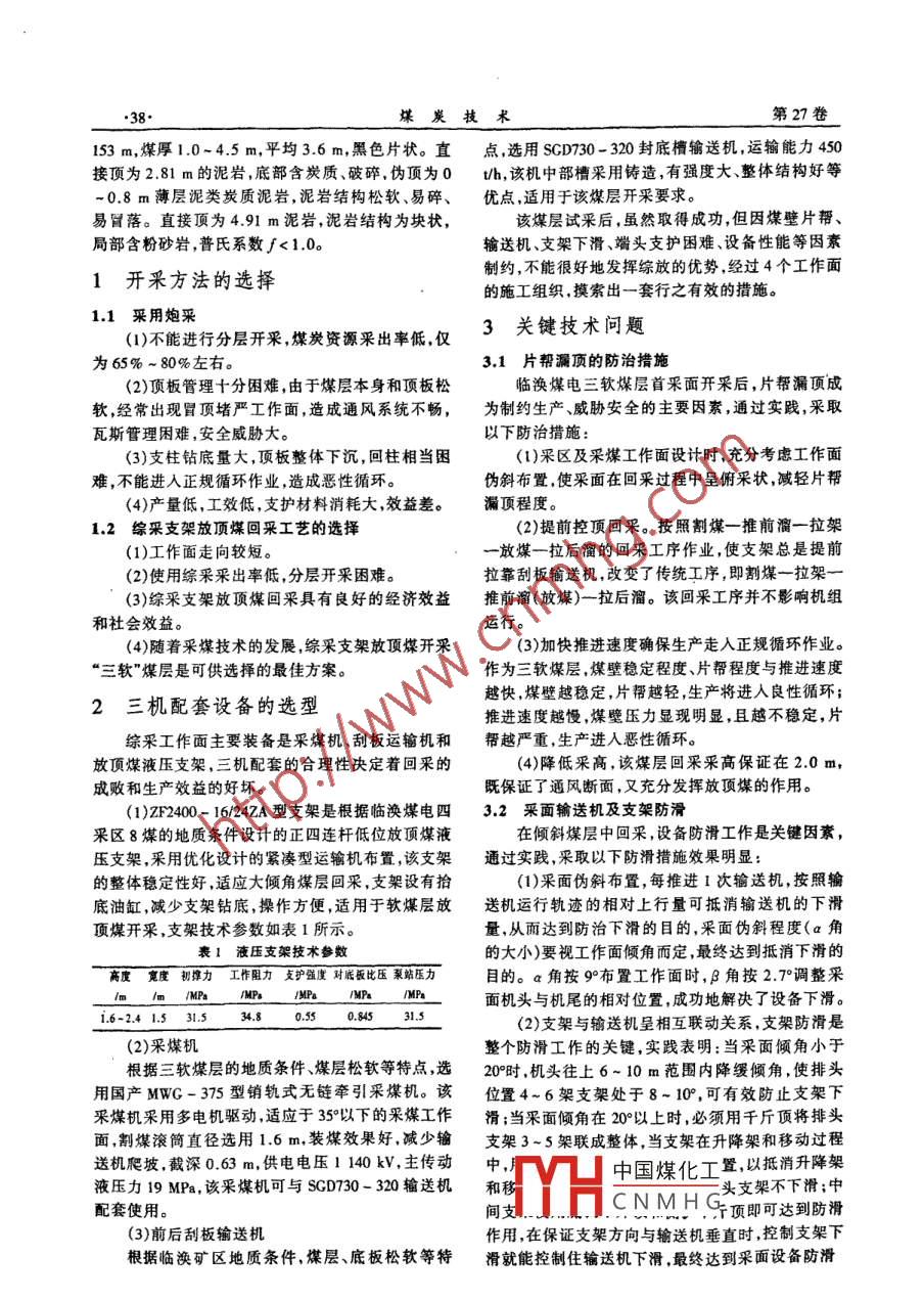 第27卷第11期煤炭技術(shù)Vol 27. No 11Now,2008臨渙煤電“三軟”煤層綜采放頂煤技木陳剛(淮北礦業(yè)集團臨渙煤電公司,安徽淮北235136)籀要:臨渙煤電公司在三軟煤層中進行了綜采放頂煤實踐,合理地進行了設(shè)備選型,通過摸索在預(yù)防片幫漏頂采面設(shè)備防滑和端頭支護等方面摸索出適合于三軟煤層開采的技術(shù)措施,取得了回采成功。關(guān)鍵詞:三軟煤層;放頂煤;技術(shù)中圖分類號:TD823文獻標識碼:B文章編號:1008-8725(2008)』1-0037-02Fully Mechanized Caving Mining Technology in"Three Soft" CoalLayer of Linhuan Coal - eletricityCHEN Gan(Linhuan Coal- eletricity Company, Huaibei Mining Industy Group, Huaibei 235136, China)0概述設(shè)的防水煤柱,下為824工作面采空區(qū)。上為-265m防水煤柱,左為JFl斷層,右為841外段工作面。841工作面位于臨渙煤電二采區(qū)兩翼上部原留作面標高-265-3126m,走向長850m,傾斜長落法的頂板管理。掩護支架法采煤的支架整體性宜的。并在進入煤層前確保了瓦斯抽放時間和抽放好,頂板好管理,安全可靠,并能提高工效,降低材料效果,確認達到抽采標準時再進入煤層掘進巷道。成本(3)在煤層厚度小于8m的煤層中開采,采用柔32放頂煤開采方法性掩護支架開采,應(yīng)用此種開采方式,其生產(chǎn)系統(tǒng)在煤層厚度為8m左右及以上煤層傾角較大通風(fēng)系統(tǒng)及其它系統(tǒng)簡單、完善,更利于頂板管理和時,采用放頂煤開采,即在煤層頂?shù)装宀贾秒p順槽進人身安全。行煤皮假頂?shù)姆彭斆洪_采。支護型式采用CZ25型(4)煤層厚度在8m及以上時,采用放頂煤分層單體液壓支柱和HDTA-100型鉸鏈頂梁,一梁一柱開采法,該方法更有利于煤炭資源的回收,可延長采的走向型支護方式,煤皮頂板采用自制竹笆支護°區(qū)的服務(wù)年限,更好地做到了集中生產(chǎn)。放頂法采煤的分層采高為5-7m。工作面排距為1m,柱距為0.6m?;夭晒に嚍楸撇删?全部陷落(5)通過采用煤層底板巖石上山組的巷道布置式的頂板管理。采區(qū)工作面為負壓通風(fēng),工作面為方式及不同煤層厚度采用不同的采煤方法,大大提底板進風(fēng)頂板回風(fēng),通風(fēng)系統(tǒng)正常。在大槽煤層采高了勞動生產(chǎn)率,據(jù)統(tǒng)計,與其它采煤方法相比,全用放頂煤開采后還及時進行灑注漿防滅火。員效率提高了14倍,礦井回采率由設(shè)計的75%提高至85.5%,噸煤成本降低了60%以上,其經(jīng)濟效4結(jié)論益是非常可觀的。青山煤礦經(jīng)過多年的研究和實踐,得出一種經(jīng)(6)選擇合理的采煤方法,在急傾斜高瓦斯雙突濟效益高、安全可靠的急傾斜復(fù)雜型煤層的開采方煤層礦井中開采,可以確保通風(fēng)系統(tǒng)完善便于瓦斯法。通過對急傾斜復(fù)雜型煤層開采方法的簡介,得管理,為礦井安全生產(chǎn)提供有利條件,更能夠確保人出以下幾個結(jié)論身安全,其效益是非??捎^的。(1)對于復(fù)雜型煤層,不宜將采區(qū)巷道直接布置參考文獻:在煤層中,從技術(shù)上煤層穩(wěn)定性差,同時施工出的巷[1]謝東海,馮濤趙伏軍我國急傾斜煤層開采的現(xiàn)狀及發(fā)展趨勢道也不夠穩(wěn)定,不利于頂板管理,從安全管理上,作[J].煤礦天地,200,(14):211-213業(yè)人員在未進行瓦斯抽放的煤層中施工,極容易發(fā)【2)嬰學(xué)功,張偉,等,大傾角急傾斜厚媒層采方法選擇(膚酉生瓦斯事故,給人身安全帶來嚴重威脅。[3]曾慶軍急傾斜較薄煤層綜放開采技術(shù)研究與應(yīng)用[門]煤炭技(2)為延長采區(qū)走向長度和傾斜長度,加大采區(qū)服務(wù)年限,做到了集中生產(chǎn),并更好地確保生產(chǎn)安[4中國煤化工]江寧工程技術(shù)大學(xué)全,釆區(qū)巷道選擇布置在煤層底板巖石中,是更加適CNMHG收稿日期:2008-07-03;修訂日期:2008-09-01作者簡介:陳剛(1973-),男,安徽淮北人,助理工程師,193年畢業(yè)于安徽煤炭工業(yè)學(xué)校釆礦專業(yè),現(xiàn)在淮北礦業(yè)集團臨渙煤電公司從事采礦技術(shù)管理工作。煤炭術(shù)第27卷153m,煤厚1.0-4.5m,平均36m,黑色片狀。直點選用SCD730-320封底槽輸送機,運輸能力450接頂為281m的泥巖,底部含炭質(zhì)、破碎,偽頂為0t/h,該機中部槽采用鑄造,有強度大、整體結(jié)構(gòu)好等0.8m薄層泥類炭質(zhì)泥巖,泥巖結(jié)構(gòu)松軟、易碎、優(yōu)點,適用于該煤層開采要求易冒落。直接頂為4.91m泥巖,泥巖結(jié)構(gòu)為塊狀,該煤層試采后,雖然取得成功,但因煤壁片幫、局部含粉砂巖,普氏系數(shù)∫<1.0輸送機、支架下滑、端頭支護困難、設(shè)備性能等因素1開釆方法的選擇制約,不能很好地發(fā)揮綜放的優(yōu)勢,經(jīng)過4個工作面的施工組織摸索出一套行之有效的措施11采用炮采(1)不能進行分層開采煤炭資源采出率低僅3關(guān)鍵技術(shù)問題為65%~80%左右。3.1片幫漏頂?shù)姆乐未胧?2)頂板管理十分困難,由于煤層本身和頂板松臨渙煤電三軟煤層首采面開采后,片幫漏頂成軟,經(jīng)常出現(xiàn)冒頂堵嚴工作面造成通風(fēng)系統(tǒng)不暢,為制約生產(chǎn)、威脅安全的主要因素,通過實踐,采取瓦斯管理困難,安全威脅大以下防治措施(3)支柱鉆底量大,頂板整體下沉,回柱相當(dāng)困(1)采區(qū)及采煤工作面設(shè)計時,充分考慮工作面難,不能進入正規(guī)循環(huán)作業(yè),造成惡性循環(huán)。偽斜布置使采面在回采過程中呈俯采狀,減輕片幫(4)產(chǎn)量低,工效低