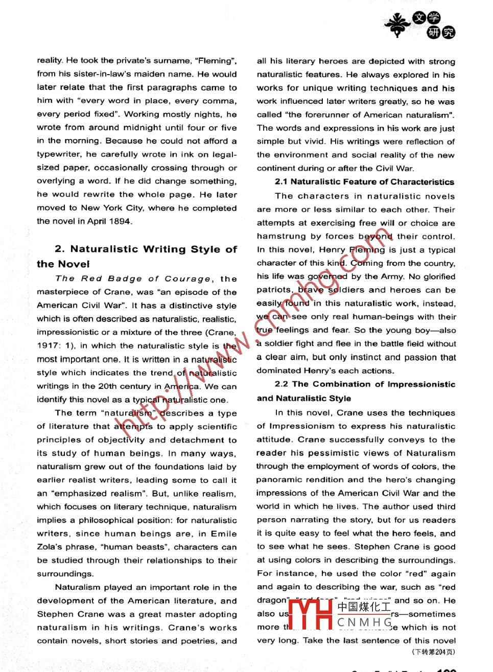 瘋狂&語教師放2012年第3期(8月號)An Analysis of Stephen Crane'sThe Red Badge of Courage李楠(黃淮學(xué)院,河南駐馬店463000)Abstract: The Red Badge of Courage. the masterpiece of Stephen Crane, was“an episode of theAmerican Civil War". It is written in a naturalistic style which indicates the trend of natu-ralistic writings in the 20th century in America. As a naturalist novel, it takes survival,determinism, violence, and taboo as key themes, and shows indifference of the naturalworld.Key words: Stephen Crane, The Red Badge of Courage, naturalism, indiference of the nature[中圖分類號] 106[文獻(xiàn)標(biāo)識碼] A[文章編號] 1006-2831(2012)08-0198-3 doi:10.3969/j.issn.1006-2831 .2012.03.054The Red Badge of Courage is a warfascinated with issues of Century Magazinenovel by American author Stephen Cranethat were largely devoted to famous battles and(1871~1900). Taking place during the Americanmilitary leaders from the Civil War (Davis, 1998:Civil War, the story is about a young private of63). Frustrated with the dryly written stories,the Union Army, Henry Fleming, who flees fromCrane stated, "I wonder that some of thosethe field of battle. Overcome with shame, hefellows don't tell how they felt in those scraps.longs for a wound--a“red badge of courage"-They spout enough of what they did, but they'reto counteract his cowardice. When his regimentas emotionless as rocks." Returning to theseonce again faces the enemy, Henry acts as amagazines during subsequent visits to thestandard-bearer. It is a great work which is bothstudio, he decided to write a war novel. He laterreadable and worthy studying, and it has beenstated that he "had been unconsciously workingcalled "the first modern war novel".the detail of the story out through most of hisboyhood" and had imagined "war stories ever1. Introduction of the Authorsince he was out of knickerbockers" (Davis,Stephen Crane published his first novel-1998: 64).Maggie: A Girl of the Streets in March 1893At the time, Crane was intermittentlyat the age of 21. Maggie was not a success,employed as a free-lance writer, contributingeither financially or critically. Most criticsarticles to various New York City newspapers.thought the unsentimental Bowery tale crudeHe began writing what would become Theor vulgar, and Crane chose to publish the workRed Badge of Courage in June 1893, whileprivately after it was repeatedly rejected foliving with his older brother Edmund in Lakepublication (Stallman, 1968: 70-71). CraneView, New Jersey. Crane conceived the storyfound inspiration for his next novel whilefrom the中國煤化工19 private whospending hours lounging in a friend's studio inis at firsi:YHCN MH Gns of the glorythe early summer of 1893. There, he becameof war, only to become disillusioned by war's收稿日期: 2012-4-12;修改稿: 2012-5-8 5198 Crazy English Teachers研究reality. He took the private's surname,“Fleming",all his literary heroes are depicted with strongfrom his sister-in-law's maiden name. He wouldnaturalistic features. He always explored in hislater relate that the first paragraphs came toworks for unique writing techniques and hishim with“every word in place, every comma,work influenced later writers greatly, so he wasevery period fixed". Working mostly nights, hecalled“the forerunner of American naturalism".wrote from around midnight until four or fiveThe words and expressions in his work are justin the morning. Because he could not afford asimple but vivid. His writings were reflection oftypewriter, he carefully wrote in ink on legal-the environment and social reality of the newsized paper, occasionally crossing through orcontinent during or after the Civil War.overlying a word. If he did change something,2.1 Naturalistic Feature of Characteristicshe would rewrite the whole page. He laterThe characters in naturalistic novelsmoved to New York City, where he completedare more or less similar to each other. Theirthe novel in April 1894.attempts at exercising free will or choice arehamstrung by forces beyond their control.2. Naturalistic Writing Style ofIn this novel, Henry Fleming is just a typicalthe Novelcharacter of this kind. Coming from the country,The Red Badge of Courage, thehis life was governed by the Army. No glorifiedmasterpiece of Crane, was“an episode of thepatriots, brave soldiers and heroes can beAmerican Civil War". It has a distinctive styleeasily found in this naturalistic work, instead,which is often described as naturalistic, realistic,we can see only real human-beings with theirimpressionistic or a mixture of the three (Crane,true feelings and fear. So the young boy- -also1917: 1). in which the naturalistic style is thea soldier fight and flee in the battle fieid withoutmost important one. It is written in a naturalistica clear aim, but only instinct and passion thatstyle which indicates the trend of naturalisticdominated Henry's each actions.writings in the 20th century in America. We can2.2 The Combination of Impressionisticidentify this novel as a typical naturalistic one .and Naturalistic StyleThe term "naturalism” describes a typeIn this novel, Crane uses the techniquesof literature that attempts to apply scientificof Impressionism to express his naturalisticprinciples of objectivity and detachment toattitude. Crane successfully conveys to theits study of human beings. In many ways,reader his pessimistic views of Naturalismnaturalism grew out of the foundations laid bythrough the employment of words of colors, theearlier realist writers, leading some to call itpanoramic rendition and the hero's changingan“emphasized realism". But, unlike realism,impressions of the American Civil War and thewhich focuses on literary technique, naturalismworld in which he lives. The author used thirdimplies a philosophical position: for naturalisticperson narrating the story, but for us readerswriters,since human beings are, in Emileit is quite easy to feel what the hero feels, andZo
