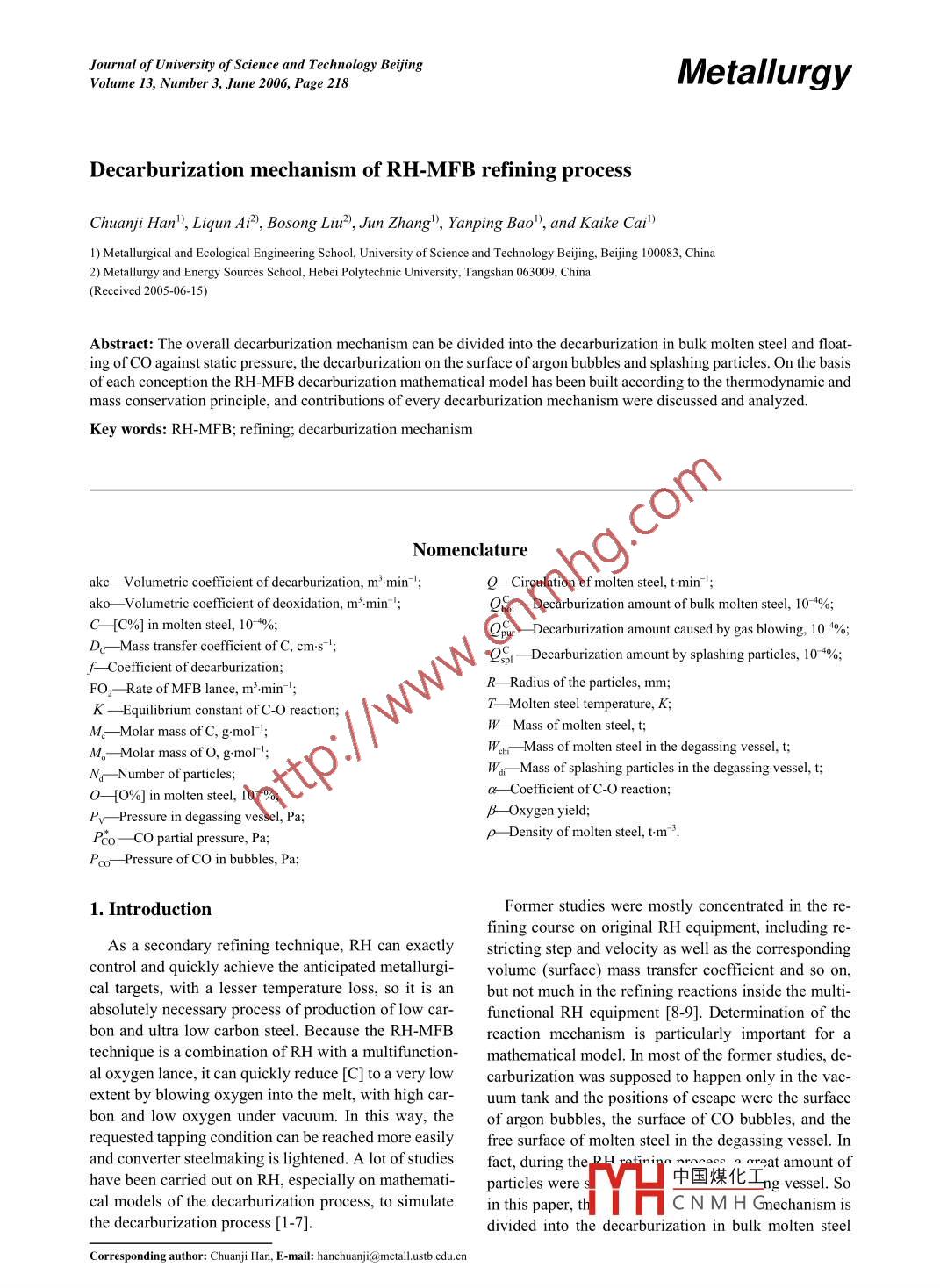 Journal of University of Science and Technology BejingVolume I3, Number 3, June 2006, Page 218MetallurgyDecarburization mechanism of RH-MFB refining processChuanji Han), Liqun AiP), Bosong Liu2), Jun Zhang"), Yanping Bao", and Kaike Cail)1) Metallurgical and Ecological Engineering School, University of Science and Technology Beijing, Bejjing 100083, China2) Mtallurgy and Energy Sources School, Hebei Polytechnic University, Tangshan 063009, China(Received 2005-06-15)Abstract: The overall decarburization mechanism can be divided into the decarburization in bulk molten steel and float-of each conception the RH-MFB decarburization mathematical model has been built according to the thermodynamic andmass conservation principle, and contributions of every decarburization mechanism were discussed and analyzed.Key words: RH-MFB; refining; decarburization mechanismNomenclatureakc- _Volumetric coefficient of decarburization, m'.min- ;Q- -Circulation of molten steel, t:min-'ako -Volumetric coefficient of deoxidation, m'.min^ |;Qfo - Decarburization amount of bulk molten steel, 10 4%;C-[C%] in molten steel, 10 4%;Qpur- Decarburization amount caused by gas blowing, 10 4%;Dc- -Mass transfer cofficient ofC, cm-st;QS - _Decarburization amount by splashing particles, 10 49%;f- Cofficient of decarburization;R- - -Radius of the particles, mm;FO2- Rate of MFB lance, m' min-!K - -Equilibrium constant of C-O reaction;T- Molten steel temperature, K;W- -Mass of molten steel, t;M- -Molar mass of C, gmol ;M.- Molar mass of O, g:mol );Wan- - Mass of molten steel in the degassing vessel, t;War- -Mass of splashing particles in the degassing vessel, t;N- -Number of particles;a- Coefficient of C-O reaction;0-[0%] in molten seel, 10 4%;Pr- Pressure in degassing vessel, Pa;βOxygen yield;Po - CO partial pressure, Pa;ρ Density of molten steel, tm 3Poo- Pressure of CO in bbles, Pa;1. IntroductionFormer studies were mostly concentrated in the re-fining course on original RH equipment, including re-As a secondary refining technique, RH can exactlystricting step and velocity as well as the correspondingcontrol and quickly achieve the anticipated metallurgi-volume (surface) mass transfer coefficient and so on,cal targets, with a lesser temperature loss, so it is anbut not much in the refining reactions inside the multi-absolutely necessary process of production of low car-functional RH equipment [8-9]. Determination of thebon and ultra low carbon steel. Because the RH-MFBreaction mechanism is particularly important for atechnique is a combination of RH with a multifunction-mathematical model. In most of the former studies, de-al oxygen lance, it can quickly reduce [C] to a very lowcarburization was supposed to happen only in the vac-extent by blowing oxygen into the melt, with high car-uum tank and the positions of escape were the surfacebon and low oxygen under vacuum. In this way, theof argon bubbles, the surface of CO bubbles, and therequested tapping condition can be reached more easilyfree surface of molten steel in the degassing vessel. Inand converter steelmaking is lightened. A lot of studiesfact, during the H refinigreat amount ofhave been carried out on RH, especially on mathemati-particles were s中國(guó)煤化工ng vessel. Socal models of the decarburization process, to simulatein this paper, thHC N M H Gmechanism isthe decarburization process [1-7].divided into the decarburization in bulk molten steelCorresponding author: Chuanji Han, E-mail: hanchuanji@metall.ustb.edu.cn.C.J. Han et al, Decarburization mechanism of RH-MFB refining process219and floating of CO against static pressure, the decar-3.3. Decarburization of splashing particlesburization on the surface of argon bubbles and splash-Suppose that all particles are round and [C%] at theing particles. In this way the RH-MFB decarburizationsurface is Cs after the decarburization, equilibriummathematical model has been built to simulate the de-[C%] is C, so the decarburization of splashing parti-carburization process.cles can be expressed as follows:2. Assumption of the model8C_(02C . 20C(0≤t≤0,0≤r≤R) (6;To simplify the model, the following assumptionsOtAt2" r Otwere made:Dc = 5.2x10-3 exp(-11700x4.184.RT 5) [10](7)(1) Molten steel both in the degassing vessel and la-dle were perfectly mixed;Dl600°C = 2.24x10-4.(2) The degassing vessel was the unique decarburi-Corresponding to the initial conditions andzation reaction site;boundary conditions, C(r , 0)=Cv, C(0, t)=Cv, C(R,t)=(3) The contents of C and 0 at the gas-liquid inter-Cs, the resolution of this problem is:face were in equilibrium with CO partial pressure in thegas phase;C(r,t)=CvR(Cs-Cv)x(4) The decarburization rate was controlled by the| (2n+1)R-r「 (2n+1)R+rmass transfer of C and O in molten steel.2erfc- erfc(8)2JDct2√Dct3. Decarburization mechanismSo C。can be obtained:3.1. Decarburization in bulk molten steel and1R 4rur2C(r,t)drfloating of CO against static pressureCe(t)=[。4rπr2drThe CO decarburization rate inside bulk molten steelcan be expressed as follows:n2π2Dct)C,(1)+6(Cv =C()5- lexp((9)_d[%C])π=n^R2dt )= a(CvOvK- Pco)(1)Ignore the variation of Cs with time:Pco=Pv + pgh +(2σ1r)2)Ce(0)=Cs -6(Cv-Cs)5_ 1_n2πDcθThe decarburization quantity in the degassing vesselπ2 22 exp|R2}(1)isThe decarburization amount of every particle in thed[%C])Qoi = Wchi(3)time of 0:3.2. Decarburization on the surface of argon bub-q=Cv-Ce=bles號(hào)之-exp_n2π2Dcθ(Cv-Cs) (11)π2臺(tái)n2RThis mechanism is a kind of compound controllingmodel, which includes three stages: difusion of C andThe total decarburization amount:O onto the surface of argon bubbles, chemical reactionon the surface of argon bubbles, and mass transfer inQ& =Na(Cv-C,)(12)gas. Generally speaking, the equation of decarburiza-tion velocity on the surface of argon bubbles can be4. Establishment and verification of theexpressed as follows:mathematical model of RH-MFB decarburi-Gs; CvOvKfzation processd[%C]\0.0224 .(4)4.1. Esta