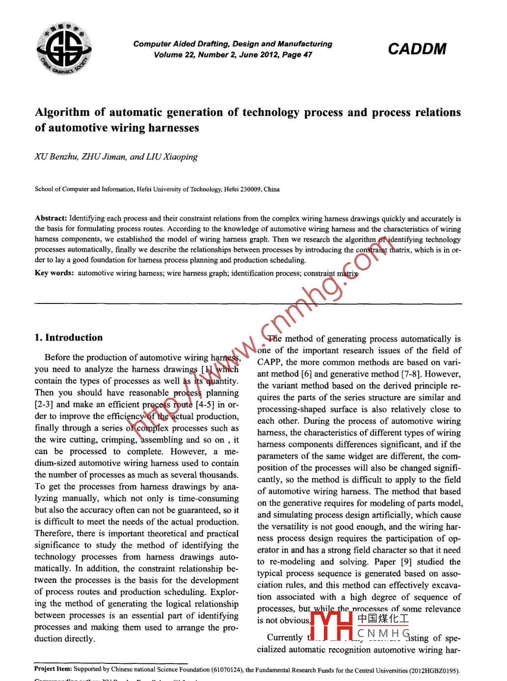 Computer Aided Drafting, Design and ManufacturingCADDMVolume 22, Number 2, June 2012, Page 47Algorithm of automatic generation of technology process and process relationsof automotive wiring harnessesXU Benzhu, ZHU Jiman, and LIU XiaopingSchool of Computer and Information, Hefei University of Technology, Hefei 230009, ChinaAbstract: Identifying each process and their constraint relations from the complex wiring harness drawings quickly and accurately isthe basis for formulating process routes. According to the knowledge of automotive wiring harness and the characteristics of wiringharness components, we established the model of wiring harness graph. Then we research the algorithm of identifying technologyprocesses automatically, finally we describe the relationships between processes by introducing the constraint matrix, which is in or-der to lay a good foundation for harness process planning and production scheduling.Key words: automotive wiring harness; wire harness graph; identification process; constraint matrix1. IntroductionThe method of generating process automatically isone of the important research issues of the field ofBefore the production of automotive wiring harness,CAPP, the more common methods are based on vari-you need to analyze the harness drawings [1] whichant method [6] and generative method [7-8]. However,contain the types of processes as well as its quantity.the variant method based on the derived principle re-Then you should have reasonable process planningquires the parts of the series structure are similar and[2-3] and make an efficient process route [4-5] in or-processing-shaped surface is also relatively close toder to improve the efficiency of the actual production,each other. During the process of automotive wiringfinally through a series of complex processes such asharness, the characteristics of different types of wiringthe wire cutting, crimping, assembling and so on , itharness components differences significant, and if thecan be processed to complete. However, a me-parameters of the same widget are different, the com-dium-sized automotive wiring harness used to containposition of the processes will also be changed signifi-the number of processes as much as several thousands.cantly, so the method is diffcult to apply to the fieldTo get the processes from harness drawings by ana-of automotive wiring harness. The method that basedlyzing manually, which not only is time consumingon the generative requires for modeling of parts model,but also the accuracy often can not be guaranteed, so itand simulating process design artificially, which causeis difficult to meet the needs of the actual production.the versatility is not good enough, and the wiring har-Therefore, there is important theoretical and practicalness process design requires the participation of op-significance to study the method of identifying thetechnology processes from harness drawings auto-erator in and has a strong field character so that it needto re-modeling and solving. Paper [9] studied thmatically. In addition, the constraint relationship be-typical process sequence is generated based on asso-tween the processes is the basis for the developmentciation rules, and this method can effectively excava-of process routes and production scheduling. Explor-tion associated with a high degree of sequence ofing the method of generating the logical relationshipprocesses, but while the. nrocesses of some relevancebetween processes is an essential part of identifyingis not obvious,中國煤化工processes and making them used to arrange the pro-duction directly.CurrentlyfYHC NM H Gsting of spe-cialized automatic recognition automotive wiring har-Project Iten: Supported by Chinese national Science Foundation (61070124), the Fundamental Research Funds for the Central Unverities (2012HGBZ0195).Correspongirg author: XU Benzhu, E mail: bzxu@hfut.edu.cn萬萬數(shù)據(jù)Computer Aided Drafting, Design and Manufacturing CADDM), Vol.22, No.2. Jun. 2012ness processes and their relationships, although thereC,C={r2,"",Ck} stand for there are k connectorsare some large-scale software abroad such as Harn-c(1≤i≤k) is connected to one of the node of V, and itWare, VeSys and so on , which have process identifi-has n ports, which can be inserted m(m≥0) wires. If C;cation module, but the technology has not relevant lit-is a sheath, then n≥1; Ifc; isa ground, then n=1.erature. To study the method of identifying process ofautomotive wiring harmess automatically recognizesthe important practical value. Automotive wiring har-ness process has a strong field characteristics, and the6。1魯一1.25composition of the technology process and their rela-tions are closely related to characteristics of harness欲貿(mào)components and process of production rules and.8.25process knowledge [10] and other. In this paper, firstly,1212 QH 221the wiring harness graph model is established throughDTHNS :H6188 0209the analysis of the wiring harness drawings, then weFig. 1. Example of connectors.combine harness domain knowledge, and the auto-matic generation algorithm of the process is given.Finally, the article made the definition of the logicalIt is shown in Fig.1 are example of connectors,relationship between the processes and gives the algo-which not only contains some wire information suchrithm for solving the constraint matrix of the relation-as wire number, color, diameter and its name and itsship between the processes.type, but also implicitly contains a lot of wiring har-ness process design feature constraints, including the2. Model of wiring harness graphmodel can crimp terminals, the wires need to wear2.1. The definition of wiring harness graphwaterproof bolt, whether the port plug waterproofWiring hamness graph is the source of most of theblock and line-side need to spray the color. These im-data which was required in the actual production [11].plicit information in addition to the properties of theOn the wiring harne