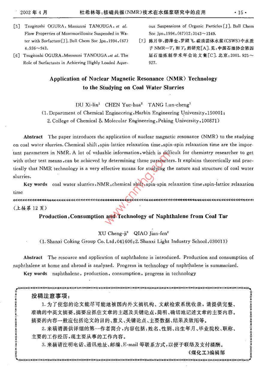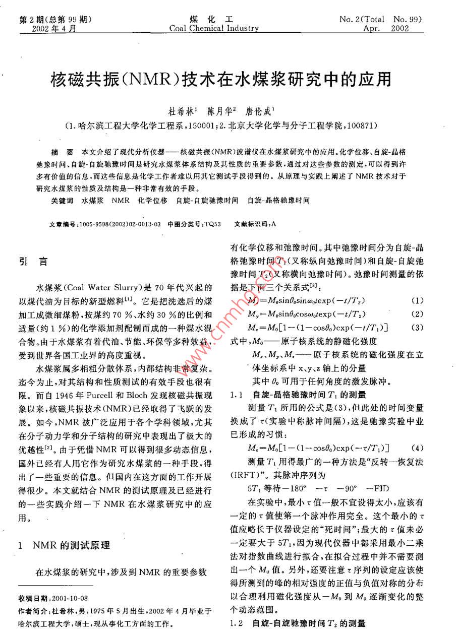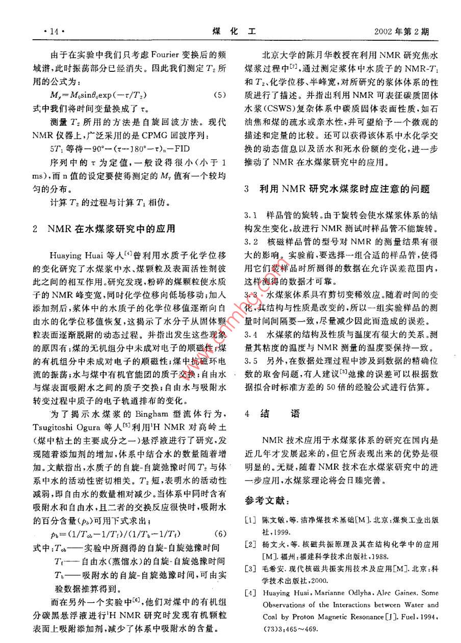 第2期(總第99期)煤化工No. 2(Total No 99)2002年4月oal Chemical IndustrApr.2002核磁共振(NMR)技術(shù)在水煤漿研究中的應(yīng)用杜希林!陳月華2唐倫成(1.哈爾濱工程大學(xué)化學(xué)工程系,150001;2.北京大學(xué)化學(xué)與分子工程學(xué)院,100871)摘要本文介紹了現(xiàn)代分析儀器——一核磁共振(NMR)波譜儀在水煤漿研究中的應(yīng)用。化學(xué)位移、自旋晶格馳豫時間、自旋-自旋馳豫時間是研究水煤漿體系結(jié)構(gòu)及其性質(zhì)的重要參數(shù),通過對這些參數(shù)的測定,可以得到許多有價值的信息,而這些信息是化學(xué)工作者難以用其它測試手段得到的。從原理與實踐上闡述了NMR技術(shù)對于研究水煤漿的性質(zhì)及結(jié)構(gòu)是一種非常有效的手段。關(guān)鍵詞水煤漿NMR化學(xué)位移自旋-自旋馳豫時間自旋-晶格孢豫時間文章編號;10059598(2002)02-001303中圖分類號:TQ53文獻標(biāo)識碼:A有化學(xué)位移和弛豫時間。其中弛豫時間分為自旋晶引言格弛豫時間T1(又稱縱向弛豫時間)和自旋-自旋弛豫時間T2(又稱橫向弛豫時間)。弛豫時間測量的依水煤漿( Coal Water Slurry)是70年代興起的據(jù)是下面三個關(guān)系式3以煤代油為目標(biāo)的新型燃料u。它是把洗選后的煤M,-MasinDosinadfexp(-1/T2)(1)加工成微細煤粉,按煤約70%、水約30%的比例和M,=Mosintocoswotexp(-t/T2)適量(約1%)的化學(xué)添加劑配制而成的一種煤水混M,=M6[1-(1-cos0)cxp(-t/T1)合物。由于水煤漿有著代油、節(jié)能、環(huán)保等多種效益,式中,M——原子核系統(tǒng)的靜磁化強度受到世界各國工業(yè)界的高度重視M、My、M—一原子核系統(tǒng)的磁化強度在立水煤漿屬多相粗分散體系,內(nèi)部結(jié)構(gòu)非常復(fù)雜。體坐標(biāo)系中x、y、z軸上的分量迄今為止,對其結(jié)構(gòu)和性質(zhì)測試的有效手段也很有其中可用于任何角度的激發(fā)脈沖。限。而自1946年 Purcell和 Bloch發(fā)現(xiàn)核磁共振現(xiàn)1.1自旋-晶格馳豫時間T1的測量象以來,核磁共振技術(shù)(NMR)已經(jīng)取得了飛躍的發(fā)測量T1所用的公式是(3),但此處的時間變量展。如今,NMR被廣泛應(yīng)用于各個學(xué)科領(lǐng)域,尤其換成了r實驗中稱脈沖間隔),這是馳豫實驗中業(yè)在分子動力學(xué)和分子結(jié)構(gòu)的研究中表現(xiàn)出了極大的已形成的習(xí)慣優(yōu)越性(2]。由于憑借NMR可以得到很多動態(tài)信息,M=M6[1-(1-cos0)cxp(-τ/T1)](4)國外已經(jīng)有人用它作為研究水煤漿的一種手段,得測量T1用得最廣的一種方法是“反轉(zhuǎn)一恢復(fù)法出了一些重要的信息。但國內(nèi)在這方面的工作開展(RFT)”。其脈沖序列為得很少。本文就結(jié)合NMR的測試原理及已經(jīng)進行5T1等待-180°-r-90°-FID的一些實踐介紹一下NMR在水煤漿研究中的應(yīng)在實驗中,最小τ值一般不宜設(shè)得太小,應(yīng)該有用。定的τ值使第一個脈沖作用完全。這個最小的τ值應(yīng)略長于儀器設(shè)定的“死時間”;最大的τ值未必1NMR的測試原理定要大于571,因為現(xiàn)代儀器中都采用最小二乘法對指數(shù)曲線進行擬合,在擬合過程中并不需要測在水煤漿的研究中涉及到NMR的重要參數(shù)出一個M值。另外,還要注意序列的設(shè)定應(yīng)該使得所測到的峰的相對強度的正值與負值對稱的分布收稿日期:2001-10以合理利用磁化強度從一M到M。逐漸變化的整作者簡介杜希林,男,1975年5月出生,2002年4月畢業(yè)于個動態(tài)范圍。哈爾濱工程大學(xué),碩士,現(xiàn)從事化工方面的工作1.2自旋-自旋馳豫時間T2的測量14煤化工2002年第2期由于在實驗中我們只考慮 Fourier變換后的頻北京大學(xué)的陳月華教授在利用NMR研究焦水域譜,此時振蕩部分已經(jīng)消失。因此我們測定T2所煤漿過程中,通過測定漿體中水質(zhì)子的NMRT用的公式為和T2、化學(xué)位移、半峰寬,對所研究的漿體體系的性M,-MosinBoexp(-T/T2)(5)質(zhì)進行了描述。并指出利用NMR可表征碳質(zhì)固體式中我們將時間變量換成了τ水漿(CSwS)復(fù)雜體系中碳質(zhì)固體表面性質(zhì),如石測量T:所用的方法是自旋回波方法。現(xiàn)代油焦和煤的疏水或親水性,并可望給予一個微觀的NMR儀器上,廣泛釆用的是CPMG回波序列描述和定量的比較。還可以獲得該體系中水化學(xué)交5T1等待-90°-(z-180°-τ)n-FID換的動態(tài)信息以及活水和死水份額的變化,進一步序列中的為定值,一般設(shè)得很小(小于1推動了NMR在水煤漿研究中的應(yīng)用ms),而n值的設(shè)定要使得測定的M值有一個較均勻的分布。3利用NMR研究水煤漿時應(yīng)注意的問題計算T2的過程與計算T1相仿。3.1樣品管的旋轉(zhuǎn)。由于旋轉(zhuǎn)會使水煤漿體系的結(jié)2NMR在水煤漿研究中的應(yīng)用構(gòu)發(fā)生變化,故進行NMR測試時樣品管不能旋轉(zhuǎn)3.2核磁樣品管的型號對NMR的測量結(jié)果有很Huaying Huai等人曾利用水質(zhì)子化學(xué)位移大的影響。實驗前,要選擇一組合適的樣品管,使得的變化研究了水煤漿中水、煤顆粒及表面活性劑彼用它們裝樣品時所測得的數(shù)據(jù)在允許誤差范圍內(nèi),此之間的相互作用。研究發(fā)現(xiàn),粉碎的煤顆粒使水質(zhì)這樣測得的數(shù)據(jù)才可靠。子的NMR峰變寬,同吋化學(xué)位移向低場移動;加人3.3水煤漿體系具有剪切變稀效應(yīng)。隨著時間的變添加劑后,漿體中的水質(zh
