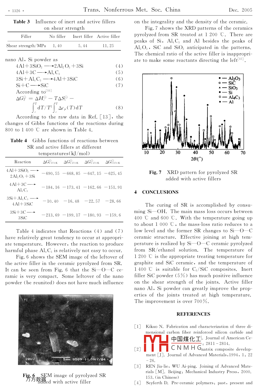 Vol. 15 No. 6Trans. Nonferrous Met. Soc. ChinaDec.2005Article ID: 1003 - 6326(2005)06- 1322 - 06.Effects of pyrolysis temperature and fillers onjoining of ceramics via silicone resinSUO Jun(所俊),CHEN Zhao- hui(陳朝輝),ZHENG Wen-wei( 鄭文偉),HAN Wei-min(韓衛(wèi)敏)(Key Laboratory of Advanced Ceramic Fibers and Composites,College of Aerospace and Materials Engineering,National University of Defense Technology, .Changsha 410073, China)Abstract: The joining of graphite,ceramic SiC and C:/ SiC composites via preceramic silicone resin(SR) at high .temperature (800- 1400 "C) was studied. The curing and pyrolysis process of SR, pyrolysis temperature, inert andactive fllers were especially discussed. The results show that the curing process of SR was accomplished by consu-ming Si- OH. The temperatureof 1 200 C is the appropriate treating temperature for graphite and SiC ceramic, andthe temperature of 1 400 C is suitable for C/ SiC composites. Inert fller SiC powder(5%,mass fraction) has muchpositive influence on the shear strength of the joints. Active fller nano Ai, Si powder can greatly improve the prop-erties of the joints treated at high temperature. The improvement is over 700%.Key words: preceramic; silicone resin; pyrolysis temperature; inert fller; active fller; joiningCLC number: TB323Document code: A1 INTRODUCTION(Si powder and Al/Si nano-powder respectively)were researched. In the mean while, the joining ofCeramic matrix composites(CMC) have manygraphite and SiC ceramic as the components of the .advantages, such as high strength at high tempera-3D-C/ SiC composites was discussed.ture,high rigidity, high wearability, high endur-ance of chemical erode, and low coefficient of ther-2 EXPERIMENTALmal expansion-1.2l. But it is difficult to manufac-ture complex ceramic or CMC components. So2.1 Main raw materialsjoining simple components into complex ones isPreceramic SR (chemical pure) is produced bynecessary under such a situation. Joining tech-Dow Corning, USA. SiC powder ( industrial pure) .niques of ceramics and CMC have been researchedwith average grain diameter of 0. 4 μ is made byin the areas of solid phase diffusion, high tempera-Zhengzhou No. 2 Grinding Wheel Works, China.ture welding and the methods by the similar mech-Al nano-powder (average diameter is 30 - 70 nm)anisms. The disadvantages of these methods lie inwith purity of 98%- 99. 9% is produced by Zhong-huge energy waste at high temperature, high facili-kangda Nanotech Institute. Si nano- powder ( aver-ty cost of the process, and severe damage to theage diameter ≤30 nm) with purity over 99% issubstratesi3.4. Pyro-joining ceramics and CMCproduced by Institute of Metal Research, Chinesewith preceramic at high temperature is a relativelyAcademy of Sciences. Graphite is produced bynew joining processC5-8 which relies on the joiningXiangbei Graphite Works. SiC ceramic ( relativeby the ceramic pyrolyzed from the preceramic withdensity 99%) is fabricated by hot press method inenhancing the joining properties of the materials atthe laboratory. 3D C/ SiC composites are preparedhigh temperature. Compared with other methods,by precursor infiltration process with carbon fiberit needs low joining temperature, short heat pres-(Jilin Carbon Corp.,China) as reinforcement andervation,no pressure and vacuum, which can be8 :1 : 1 as the fiber volume fraction in X, Y, Z di-widely applied with relatively simple process. Therections. The fiber volume fraction is 45%.method can also maintain the similar joining phasecompared to the substrates. In this paper,joining2.2. Experimental process and testing characteriza-between 3D-C/ SiC composites by ceramics pyro-中國(guó)煤化工lyzed from SR was realized. The influences oMHCNMHGOr Al/Si nano- powderpyrolysis temperature, inert and active fillerpartrally) and etnanol were mixed in solution and①Foundation item: Project(04JJ Y3002) supported by the Natural Science Foundation of Hunan Province, ChinaReceived date: 2005 - 03 - 03; Acepted date: 2005 - 08 - 24CorrespondenetUO Jun, PhD candidate; Tel: + 86-731-4576441; E mail: mrsuo@ 163. comVol. 15 No. 6Effects of pyrolysis temperature and fillers on joining of ceramics●1323 .daubed on the substrates whose surfaces had beenthe breaks of the side chains of SR and the emittedpolished and ultrasonically cleaned. Then themolecular fragments. With the temperature goingjoints were cured at 250 "C for 2 h and pyrolyzed inup to about 1 000 C,the mass-loss ratio reduces toAr atmosphere with heating speed of 2 "C/min to aa low level and the former SR changes toSi- O- Ccertain temperature. They were cooled down at theceramic structure.same speed. Shear strengths were tested, and in-frared ray (IR,Hitachi270- 30) spectrum, thermo-100 [gravimetry analysis(TGA,TAS10-0),X-ray dif-fraction( XRD,Siemens-D500) and scanning elec-tron microscope ( SEM,JSM- 5600LV) information .95were got from the joints.)0 t3 RESULTS AND DISCUSSION3.1 Curing and pyrolysis of SR853.1.1 Curing of SRTheIRspectraofSRcuredat250Cfor2hare shown in Fig. 1.80L200400600800 1 000t/CFig.2 TGA curves of SRIn Fig.3,the XRD curves of Si- 0- C ceram-以cs pyrolyzed at 800 and 1 000 C are smooth with aprotuberant shape at about 20=21°,correspondingto the amorphous C. No SiO2 and SiC crystals ex-ist under thus conditions. Small peaks appearing inthe XRD curve at 1 200 C means SiO2 and SiCcrystals begin to appear, but most of these mattersare amorphous. Under this condition, the crystalsare generally small, which is beneficial to the prop-4 00030002 0001 000erty of the joints-9l.Wavenumber/cm-1Fig. 1 IR spectrums of SR before(a) and。一B-SiCafter(b) curing at 250 °C for 2 h●一Si02As illustrated in Fig. 1,Si- O- Si bonds arejiVinm i出the main chain in general, and - - CHs,一OH,- Ph are in the side chains. Evident Si一 OH peakexists in 3 600 - 3 000 cm^“1. Comparing curves (a)with (b) in Fig. l, it can be seen that the curing ofSR is accomplished by the method of consuming(bSi