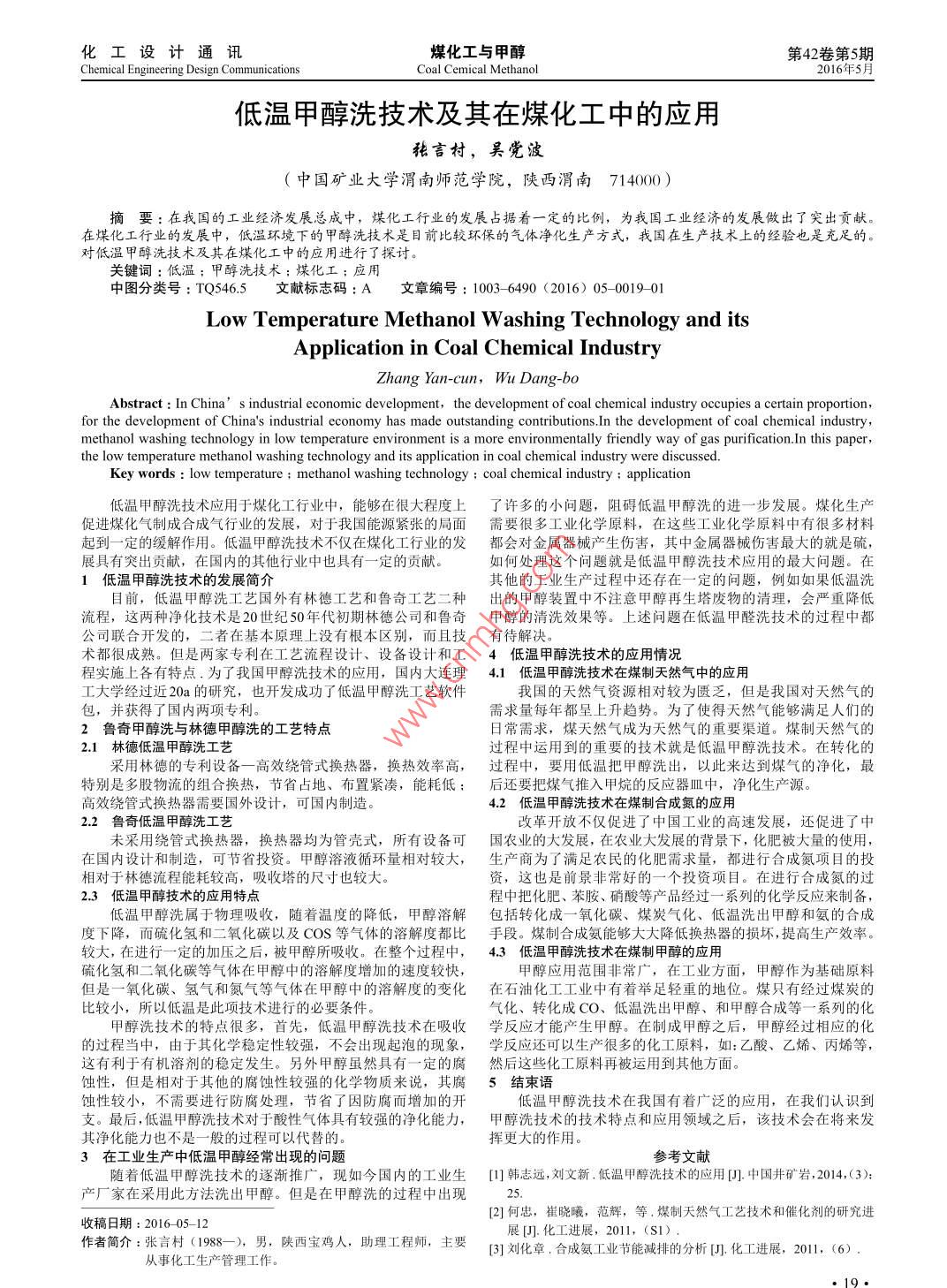 化工設(shè)計(jì)通訊煤化工與甲醇第42卷第5期Chemical Engineering Design CommunCoal Cemical methanol2016年5月低溫甲醇洗技術(shù)及其在煤化工中的應(yīng)用張言村,吳黨波(中國(guó)礦業(yè)大學(xué)渭南師范學(xué)院,陜西渭南7140000摘要:在我國(guó)的工業(yè)經(jīng)濟(jì)發(fā)展總成中,煤化工行業(yè)的發(fā)展占據(jù)著一定的比例,為我國(guó)工業(yè)經(jīng)濟(jì)的發(fā)展做出了突出貢獻(xiàn)。在煤化工行業(yè)的發(fā)展中,低溫環(huán)境下的甲醇洗技術(shù)是目前比較環(huán)保的氣體凈化生產(chǎn)方式,我國(guó)在生產(chǎn)技術(shù)上的經(jīng)驗(yàn)也是充足的對(duì)低溫甲醇洗技術(shù)及其在煤化工中的應(yīng)用進(jìn)行了探討,關(guān)鍵詞:低溫;甲醇洗技術(shù):煤化工:應(yīng)用中圖分類號(hào):TQ546.5文獻(xiàn)標(biāo)志碼:A文章編號(hào):1003-6490(2016)05-001901Low Temperature methanol Washing Technology and itspplication in Coal Chemical IndustryAbstract: In China' s industrial economic development, the development of coal chemical industry occupies a certain proportionfor the development of China's industrial economy has made outstanding contributions In the development of coal chemical industrymethanol washing technology in low temperature environment is a more environmentally friendly way of gas purification In this paperthe low temperature methanol washing technology and its application in coal chemical industry were discussedKey words: low temperature methanol washing technology: coal chemical industry application低溫甲醇洗技術(shù)應(yīng)用于煤化工行業(yè)中,能夠在很大程度上了許多的小問題,阻礙低溫甲醇洗的進(jìn)一步發(fā)展。煤化生產(chǎn)促進(jìn)煤化氣制成合成氣行業(yè)的發(fā)展,對(duì)于我國(guó)能源緊張的局面需要很多工業(yè)化學(xué)原料,在這些工業(yè)化學(xué)原料中有很多材料起到一定的緩解作用。低溫甲醇洗技術(shù)不僅在煤化工行業(yè)的發(fā)都會(huì)對(duì)金屬器械產(chǎn)生傷害,其中金屬器械傷害最大的就是硫展具有突出貢獻(xiàn),在國(guó)內(nèi)的其他行業(yè)中也具有一定的貢獻(xiàn)如何處理這個(gè)問題就是低溫甲醇洗技術(shù)應(yīng)用的最大問題。在1低溫甲醇洗技術(shù)的發(fā)展簡(jiǎn)介其他的工業(yè)生產(chǎn)過程中還存在一定的問題,例如如果低溫洗目前,低溫甲醇洗工藝國(guó)外有林德工藝和魯奇工藝二種出的甲醇裝置中不注意甲醇再生塔廢物的淸理,會(huì)嚴(yán)重降低流程,這兩種浄化技術(shù)是20世紀(jì)50年代初期林德公司和魯奇甲醇的淸洗效果等。上述問題在低溫甲醛洗技術(shù)的過程中都公司聯(lián)合開發(fā)的,二者在基本原理上沒有根本區(qū)別,而且技有待解決術(shù)都很成熟。但是兩家專利在工藝流程設(shè)計(jì)、設(shè)備設(shè)計(jì)和工4低溫甲醇洗技術(shù)的應(yīng)用情況程實(shí)施上各有特點(diǎn)為了我國(guó)甲醇洗技術(shù)的應(yīng)用,國(guó)內(nèi)大連理41低溫甲醇洗技術(shù)在煤制天然氣中的應(yīng)用工大學(xué)經(jīng)過近20a的研究,也開發(fā)成功了低溫甲醇洗工藝軟件我國(guó)的天然氣資源相對(duì)較為匱乏,但是我國(guó)對(duì)天然氣的包,并獲得了國(guó)內(nèi)兩項(xiàng)專利。需求量每年都呈上升趨勢(shì)。為了使得天然氣能夠滿足人們的2魯奇甲醇洗與林德甲醇洗的工藝特點(diǎn)日常需求,煤天然氣成為天然氣的重要渠道。煤制天然氣的2.1林德低溫甲醇洗工藝過程中運(yùn)用到的重要的技術(shù)就是低溫甲醇洗技術(shù)。在轉(zhuǎn)化的采用林德的專利設(shè)備一高效繞管式換熱器,換熱效率高,過程中,要用低溫把甲醇洗出,以此來達(dá)到煤氣的凈化,最特別是多股物流的組合換熱,節(jié)省占地、布置緊湊,能耗低:后還要把煤氣推入甲烷的反應(yīng)器皿中,凈化生產(chǎn)源高效繞管式換熱器需要國(guó)外設(shè)計(jì),可國(guó)內(nèi)制造42低溫甲醇洗技術(shù)在煤制合成氮的應(yīng)用22魯奇低溫甲醇洗工藝革開放不僅促進(jìn)了中國(guó)工業(yè)的高速發(fā)展,還促進(jìn)了中未采用繞管式換熱器,換熱器均為管殼式,所有設(shè)備可國(guó)農(nóng)業(yè)的大發(fā)展,在農(nóng)業(yè)大發(fā)展的背景下,化肥被大量的使用,在國(guó)內(nèi)設(shè)計(jì)和制造,可節(jié)省投資。甲醇溶液循環(huán)量相對(duì)較大,生產(chǎn)商為了滿足農(nóng)民的化肥需求量,都進(jìn)行合成氮項(xiàng)目的投相對(duì)于林德流程能耗較高,吸收塔的尺寸也較大資,這也是前景非常好的一個(gè)投資項(xiàng)目。在進(jìn)行合成氮的過23低溫甲醇技術(shù)的應(yīng)用特點(diǎn)程中把化肥、苯胺、硝酸等產(chǎn)品經(jīng)過一系列的化學(xué)反應(yīng)來制備低溫甲醇洗屬于物理吸收,隨著溫度的降低,甲醇溶解包括轉(zhuǎn)化成一氧化碳、煤炭氣化、低溫洗出甲醇和氨的合成度下降,而硫化氫和二氧化碳以及COS等氣體的溶解度都比手段。煤制合成氨能夠大大降低換熱器的損壞,提高生產(chǎn)效率較大,在進(jìn)行一定的加壓之后,被甲醇所吸收。在整個(gè)過程中,4.3低溫甲醇洗技術(shù)在煤制甲醇的應(yīng)用硫化氫和二氧化碳等氣體在甲醇中的溶解度增加的速度較快,甲醇應(yīng)用范圍非常廣,在工業(yè)方面,甲醇作為基礎(chǔ)原料但是一氧化碳、氫氣和氮?dú)獾葰怏w在甲