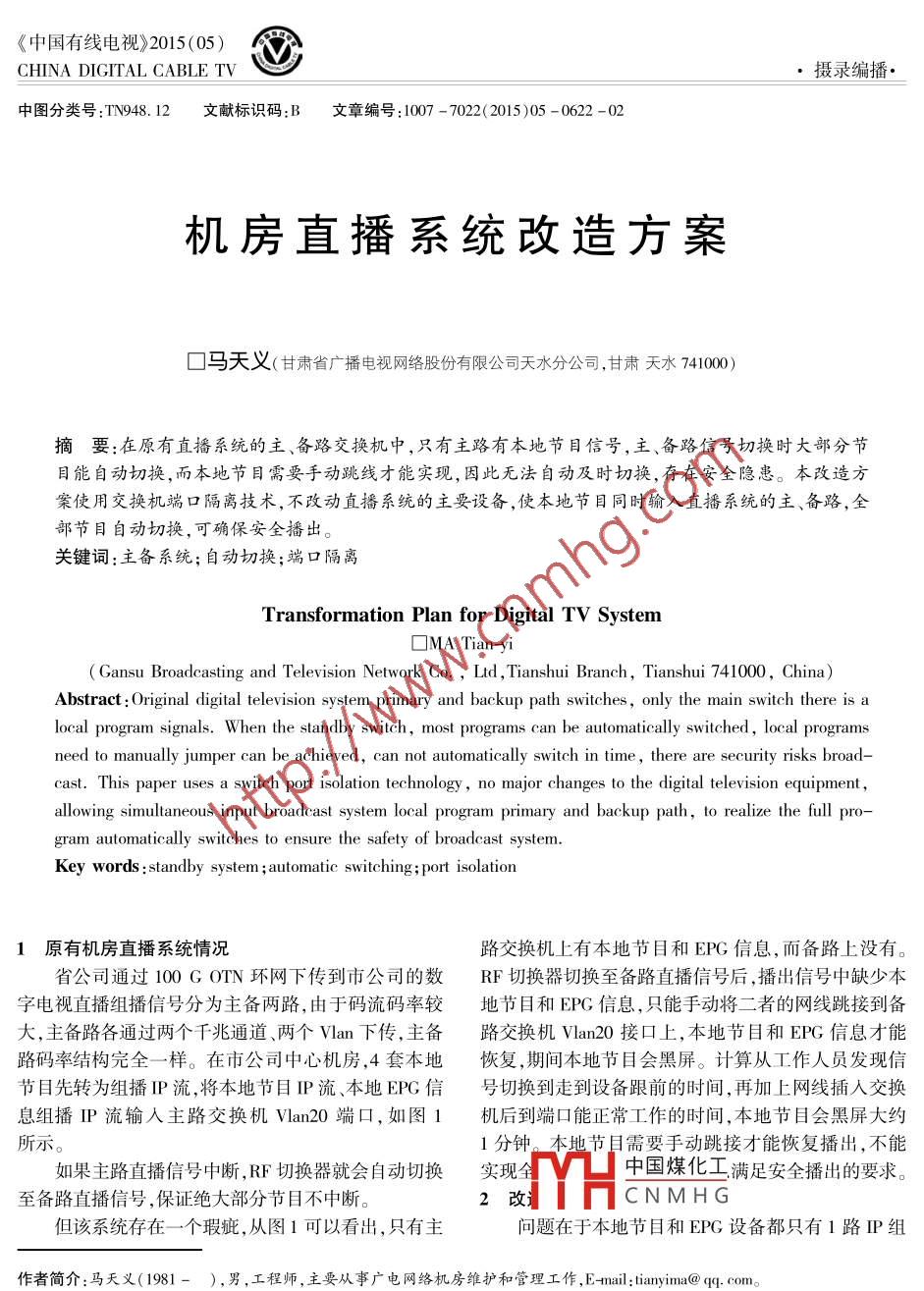 《中國(guó)有線(xiàn)電視》2015(05)CHINA DIGITAL CABLE TV·攝錄編播中圖分類(lèi)號(hào):TN948.12文獻(xiàn)標(biāo)識(shí)碼:B文章編號(hào):1007-7022(2015)05-0622-02機(jī)房直播系統(tǒng)改造方案口馬天義(甘肅省廣播電視網(wǎng)絡(luò)股份有限公司天水分公司,甘肅天水741000摘要:在原有直播系統(tǒng)的主、備路交換機(jī)中,只有主路有本地節(jié)目信號(hào),主、備路信號(hào)切換時(shí)大部分節(jié)目能自動(dòng)切換,而本地節(jié)目需要手動(dòng)跳線(xiàn)才能實(shí)現(xiàn),因此無(wú)法自動(dòng)及時(shí)切換,存在安全隱患。本改造方案使用交換機(jī)端口隔離技術(shù),不改動(dòng)?xùn)瞬ハ到y(tǒng)的主要設(shè)備,使本地節(jié)目?jī)諘r(shí)輸入λ直播系統(tǒng)的主、備路,全部節(jié)目自動(dòng)切換,可確保安全播出。關(guān)鍵詞:主備系統(tǒng);自動(dòng)切換;端口隔離Transformation Plan for Digital TV System□ MA Tian-Gansu Broadcasting and Television Network Co., Ltd, Tianshui Branch, Tianshui 741000, China)Abstract: Original digital television system primary and backup path switches, only the main switch there is alocal program signals. When the standby switch, most programs can be automatically switched, local programsneed to manually jumper can be achieved, can not automatically switch in time, there are security risks broad-cast. This paper uses a switch port isolation technology, no major changes to the digital television equipmentallowing simultaneous input broadcast system local program primary and backup path, to realize the full pro-gram automatically switches to ensure the safety of broadcast systemKey words: standby system automatic switching; port isolation1原有機(jī)房直播系統(tǒng)情況路交換機(jī)上有本地節(jié)目和EPG信息,而備路上沒(méi)有。省公司通過(guò)100GOⅠN環(huán)網(wǎng)下傳到市公司的數(shù)RF切換器切換至備路直播信號(hào)后,播出信號(hào)中缺少本宇電視直播組播信號(hào)分為主備兩路,由于碼流碼率較地節(jié)目和EPG信息,只能手動(dòng)將二者的網(wǎng)線(xiàn)跳接到備大,主備路各通過(guò)兩個(gè)千兆通道、兩個(gè)Ⅵan下傳,主備路交換機(jī)Ⅵan20接口上,本地節(jié)目和EPG信息才能路碼率結(jié)構(gòu)完全一樣。在市公司中心機(jī)房,4套本地恢復(fù),期間本地節(jié)目會(huì)黑屏。計(jì)算從工作人員發(fā)現(xiàn)信節(jié)目先轉(zhuǎn)為組播P流,將本地節(jié)目P流、本地FPG信號(hào)切換到走到設(shè)備跟前的時(shí)間,再加上網(wǎng)線(xiàn)插入交換息組播P流輸人主路交換機(jī)Ⅵan20端口,如圖1機(jī)后到端口能正常工作的時(shí)間,本地節(jié)目會(huì)黑屏大約所示。1分鐘。本地節(jié)目需要手動(dòng)跳接才能恢復(fù)播出,不能如果主路直播信號(hào)中斷,RF切換器就會(huì)自動(dòng)切換實(shí)現(xiàn)全中國(guó)煤化工滿(mǎn)足安全播出的要求。至備路直播信號(hào),保證絕大部分節(jié)目不中斷。2改CNMHG但該系統(tǒng)存在一個(gè)瑕疵,從圖1可以看出,只有主問(wèn)題在于本地節(jié)目和EPG設(shè)備都只有1路IP組作者簡(jiǎn)介:馬天義(1981-),男,工程師,主要從事廣電網(wǎng)絡(luò)機(jī)房維護(hù)和管理工作,E-mi: tianma@q,com。622www.ccatv.com《中國(guó)有線(xiàn)申視》2015年第05期馬天義·機(jī)房直播系統(tǒng)改造方案的是可以在A端口上配置對(duì)B端口的單向隔離,使A主路信號(hào)OTN備路信號(hào)端口發(fā)出的數(shù)據(jù)無(wú)法到達(dá)B端口,B端口卻可以訪問(wèn)EPG設(shè)備VIah 20 VIah 30Vlan20 VIan30A端口3.2方案拓?fù)鋱D主路思科交換機(jī)備路思科交換機(jī)本地節(jié)目設(shè)備連接華為交換機(jī)1口,EPG設(shè)備連本地節(jié)目設(shè)備接3口,主路思科交換機(jī)7口連接華為交換機(jī)5口,備EMR、主路PQAM備路 IPQAM路思科交換機(jī)7口連接華為交換機(jī)7口。主、備路思科交換機(jī)7口的接口類(lèi)型為 access,默認(rèn)Ⅵan為Van20(已配置),如圖2所示。RF切換器OTN圖1機(jī)房原有直播系統(tǒng)拓?fù)鋱DVa中20van30Va20an30播輸出,目前只能先保證輸入主路信號(hào),主備路思科交EPG設(shè)備主路思科交換機(jī)備路思科交換機(jī)換機(jī)傳輸?shù)墓?jié)目組播流完全一樣,不能互聯(lián),會(huì)導(dǎo)致沖華為交換突。因此要找到一種解決方法,既能解決主備路信號(hào)本地節(jié)目機(jī)EMR、主路 IPQAM備路 IPQAM切換后需要手動(dòng)更改本地組播網(wǎng)線(xiàn)的問(wèn)題,又能最大RE程度確保直播組播系統(tǒng)的安全,防止大流量直播組播外泄RF切換器查閱相關(guān)資料,找到了一個(gè)解決方法,可以將本地圖2改造后直播系統(tǒng)拓?fù)鋱D節(jié)目和EPG信號(hào)同時(shí)輸入主、備路思科交換機(jī),主備路切換時(shí)全部節(jié)目信號(hào)都可自動(dòng)切換,再不用手動(dòng)更3.3華為交換機(jī)配置改本地節(jié)目的網(wǎng)線(xiàn)。這種方案就是再增加一臺(tái)華為交按圖2拓?fù)鋱D所示架設(shè)華為交換機(jī),配置華為交換機(jī)作為中轉(zhuǎn)站,同時(shí)連接主、備路思科交換機(jī)、本地?fù)Q機(jī)1、3、5、接口類(lèi)型為aces口,默認(rèn)vlan為lan節(jié)目設(shè)備和EPG設(shè)備等4個(gè)設(shè)備,然后在華為交換機(jī)20,1口接本地節(jié)目設(shè)備,3口接本地EPG設(shè)備,5口接上配置數(shù)據(jù)實(shí)現(xiàn)以下功能主路思科交換機(jī)vlan20端