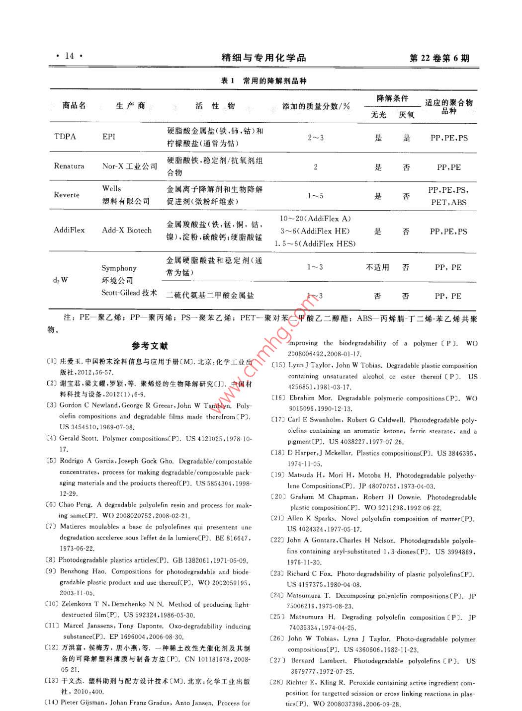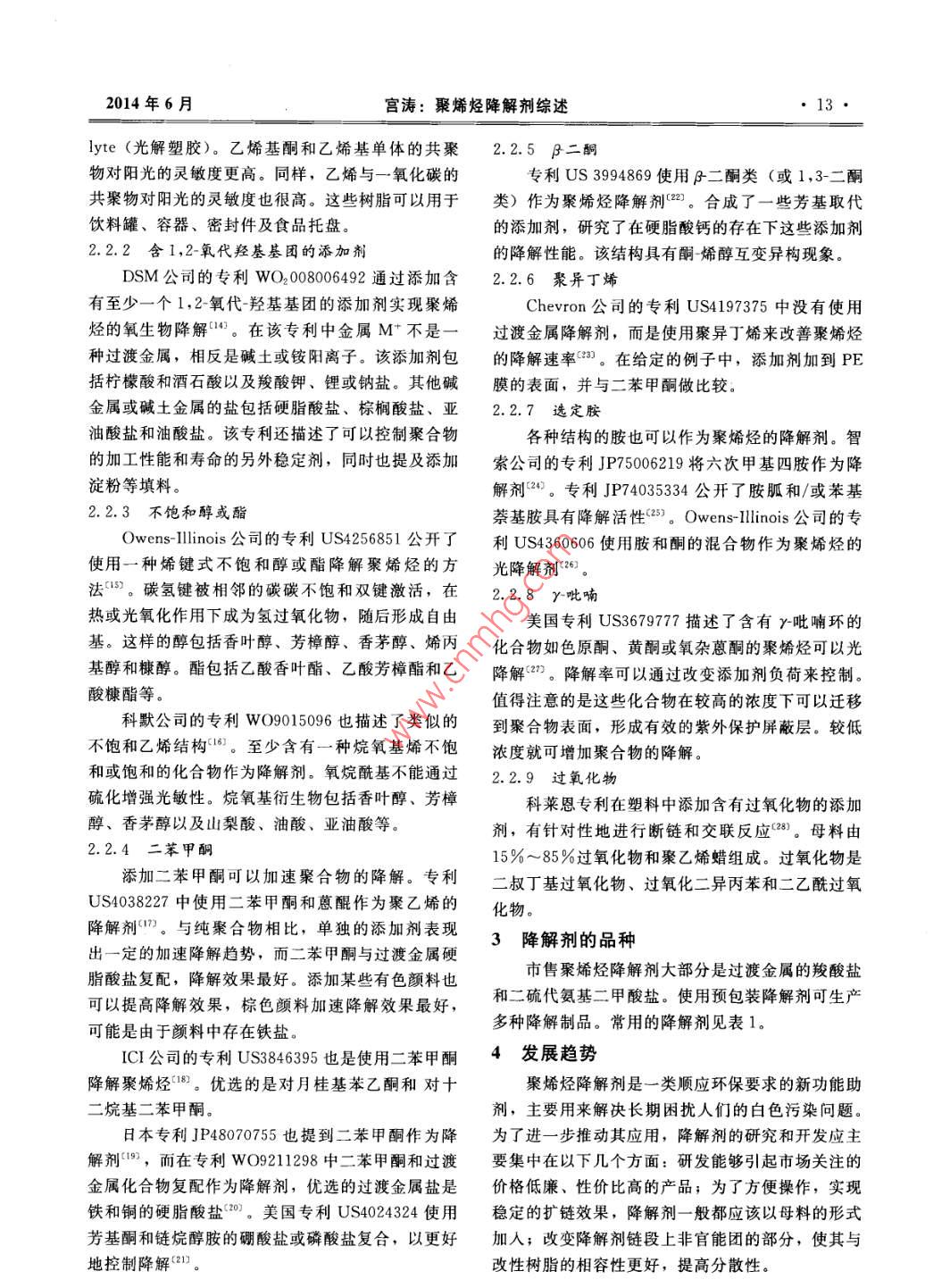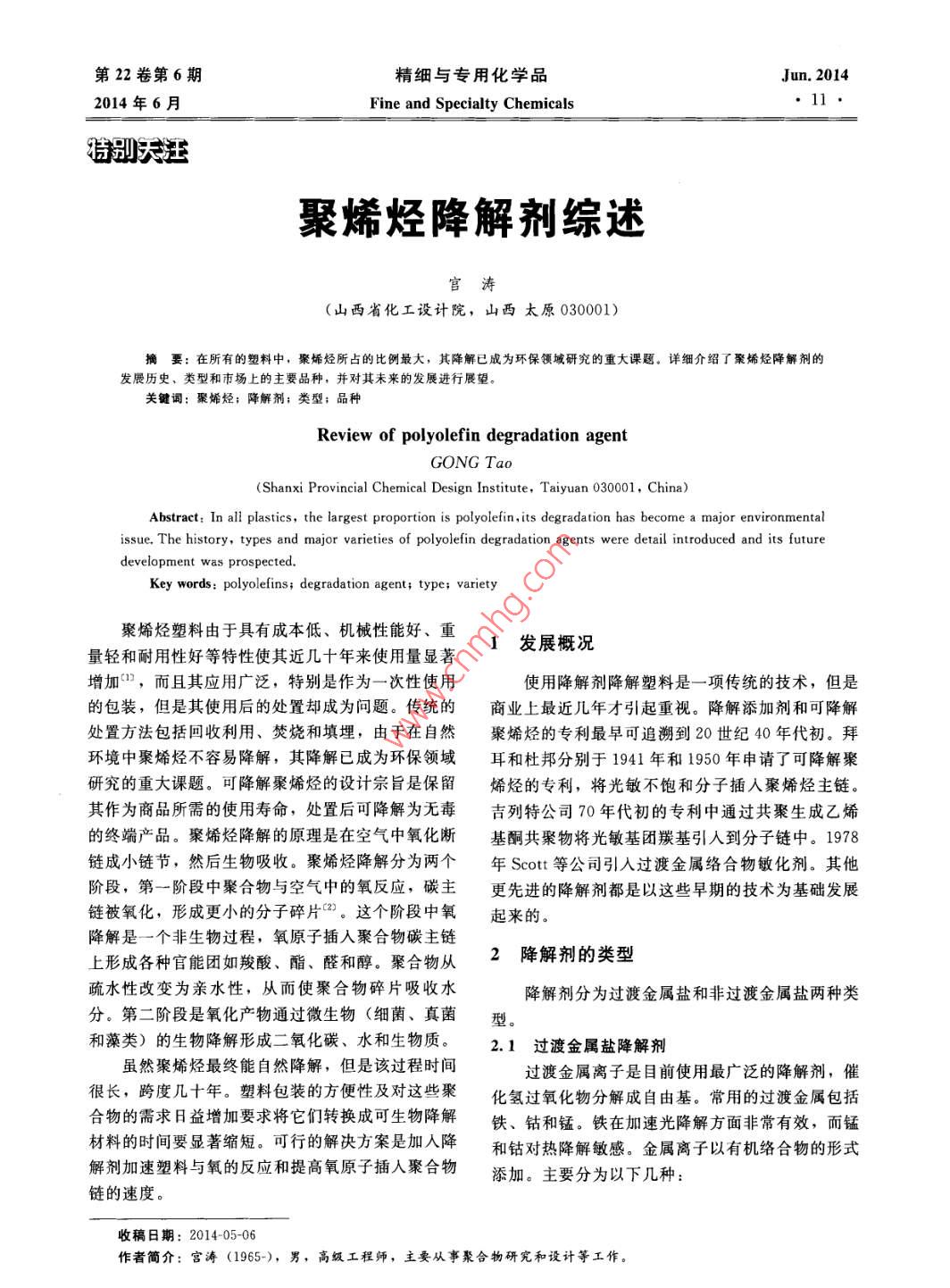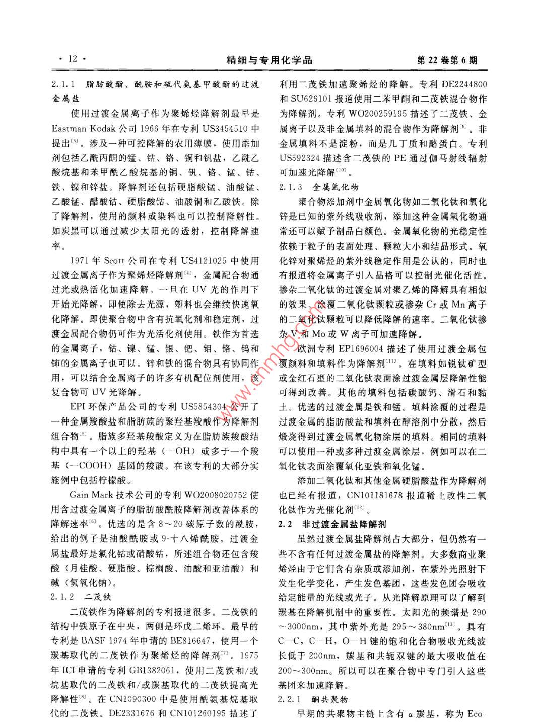 第22卷第6期精細與專用化學品Jun.20142014年6月Fine and Specialty Chemicals●11特別天汪聚烯烴降解劑綜述宮濤(山西省化工設計院,山西太原030001)摘要:在所有的塑料中,聚烯烴所占的比例最大,其降解巳成為環(huán)保領域研究的重大課題。詳細介紹了聚烯烴降解劑的發(fā)展歷史、類型和市場上的主要品種,并對其未來的發(fā)展進行展望。關鍵詞:聚烯烴;降解劑;類型;品種Review of polyolefin degradation agentGONG Tao(Shanxi Provincial Chemical Design Institute, Taiyuan 030001, China)AbstraIn all plastics, the largest proportion is polyolefin, its degradation has become a major environmentalissue. The history, types and major varieties of polyolefin degradation agents were detail introduced and its futuredevelopment was prospected.Key words: polyolefins; degradation agent; type; variety聚烯烴塑料由于具有成本低、機械性能好、重1 發(fā)展概況量輕和耐用性好等特性使其近幾十年來使用量顯著增加”,而且其應用廣泛,特別是作為一次性使用使用降解劑降解塑料是一項傳統(tǒng)的技術, 但是的包裝,但是其使用后的處置卻成為問題。傳統(tǒng)的商業(yè).上最近幾年才引起重視。降解添加劑和可降解處置方法包括回收利用、焚燒和填埋,由于在自然聚烯烴的專利最早可追溯到20世紀40年代初。拜.環(huán)境中聚烯烴不容易降解,其降解已成為環(huán)保領域耳和杜邦分別于1941年和1950年申請了可降解聚研究的重大課題。可降解聚烯烴的設計宗旨是保留烯烴的專利,將光敏不飽和分子插人聚烯烴主鏈。其作為商品所需的使用壽命,處置后可降解為無毒吉列特公司70年代初的專利中通過共聚生成乙烯的終端產品。聚烯烴降解的原理是在空氣中氧化斷基酮共聚物將光敏基團羰基引人到分子鏈中。1978鏈成小鏈節(jié),然后生物吸收。聚烯烴降解分為兩個年Scott等公司引入過渡金屬絡合物敏化劑。其他階段,第-階段中聚合物與空氣中的氧反應,碳主更先進的降解劑都是以這些早期的技術為基礎發(fā)展鏈被氧化,形成更小的分子碎片“”。這個階段中氧起來的。降解是一個非生物過程,氧原子插人聚合物碳主鏈2降解劑的類型上形成各種官能團如羧酸、酯、醛和醇。聚合物從疏水性改變?yōu)橛H水性,從而使聚合物碎片吸收水降解劑分為過渡金屬鹽和非過渡金屬鹽兩種類分。第二階段是氧化產物通過微生物(細菌、真菌型。和藻類)的生物降解形成二氧化碳、水和生物質。2.1過渡金屬鹽降解劑雖然聚烯烴最終能自然降解,但是該過程時間過渡金屬離子是目前使用最廣泛的降解劑,催很長,跨度幾十年。塑料包裝的方便性及對這些聚化氫過氧化物分解成自由基。常用的過渡金屬包括合物的需求日益增加要求將它們轉換成可生物降解鐵、鈷和錳。鐵在加速光降解方面非常有效,而錳材料的時間要顯著縮短??尚械慕鉀Q方案是加入降和鈷對熱降解敏感。金屬離子以有機絡合物的形式解劑加速塑料與氧的反應和提高氧原子插人聚合物添加。主要分為以下幾種:鏈的速度。收稿日期: 2014-05-06作者簡介:宮濤(1965-), 男,高級工程師,主要從事聚合物研究和設計等工作。12精細與專用化學品第22卷第6期2.1.1脂肪酸酯、 酰胺和硫代氨基甲酸酯的過渡利用二茂鐵加速聚烯烴的降解。專利DE2244800金屬鹽和SU626101報道使用二苯甲酮和二茂鐵混合物作使用過渡金屬離子作為聚烯烴降解劑最早是為降解劑。專利WO200259195描述了二茂鐵、金Eastman Kodak公司1966 年在專利US3454510中屬離子以及非金屬填料的混合物作為降解劑印。非提出”。涉及一種可控降解的農用薄膜,使用添加金屬填料不是淀粉,而是幾丁質和酪蛋白。專利劑包括乙酰丙酮的錳、鈷、鉻、銅和釩鹽,乙酰乙US592324描述含二茂鐵的PE通過伽馬射線輻射酸烷基和苯甲酰乙酸烷基的銅、釩、鉻、錳、鈷、可加速光降解“鐵、鎳和鋅鹽。降解劑還包括硬脂酸錳、油酸錳、2.1.3金屬氧化物乙酸錳、醋酸鈷、硬脂酸鈷、油酸銅和乙酸鐵。除聚合物添加劑中金屬氧化物如二氧化鈦和氧化了降解劑,使用的顏料或染料也可以控制降解性。鋅是已知的紫外線吸收劑,添加這種金屬氧化物通如炭黑可以通過減少太陽光的透射,控制降解速常還可以賦予制品白顏色。金屬氧化物的光穩(wěn)定性率。依賴于粒子的表面處理、顆粒大小和結晶形式。氧1971年Scott公司在專利US4121025中使用化鋅對聚烯烴的紫外線穩(wěn)定作用是公認的,同時也過渡金屬離子作為聚烯烴降解劑4),金屬配合物通有報道將金屬離子引入晶格可以控制光催化活性。過光或熱活化加速降解。一旦在UV光的作用下?lián)诫s二氧化鈦的過渡金屬對聚乙烯的降解具有相似開始光降解,即使除去光源,塑料也會繼續(xù)快速氧的效果。涂覆二氧化鈦顆?;驌诫sCr或Mn離子化降解。即使聚合物中含有抗氧化劑和穩(wěn)定劑,過的二氧化鈦顆??梢越档徒到獾乃俾?。二氧化鈦摻渡金屬配合物仍可作為光活化劑使用。鐵作為首選雜V和Mo或W離子可加速降解。的金屬離子,鈷、鎳、錳、銀、鈀、鉬、鉻、鎢和歐洲專利EP1696004描述了使用過渡金屬包鈰的金屬離子也可以。鋅和鐵的混合物具有協(xié)同作覆顏料和填料作為降解劑11。在填料如銳鈦礦型用,可以結合金屬離子的許多有機配位劑使用,該或金紅石型的二氧化鈦表面涂過渡金屬層降解性能復合物可UV光降解。可得到改善。其他的填料包括碳酸鈣、滑
