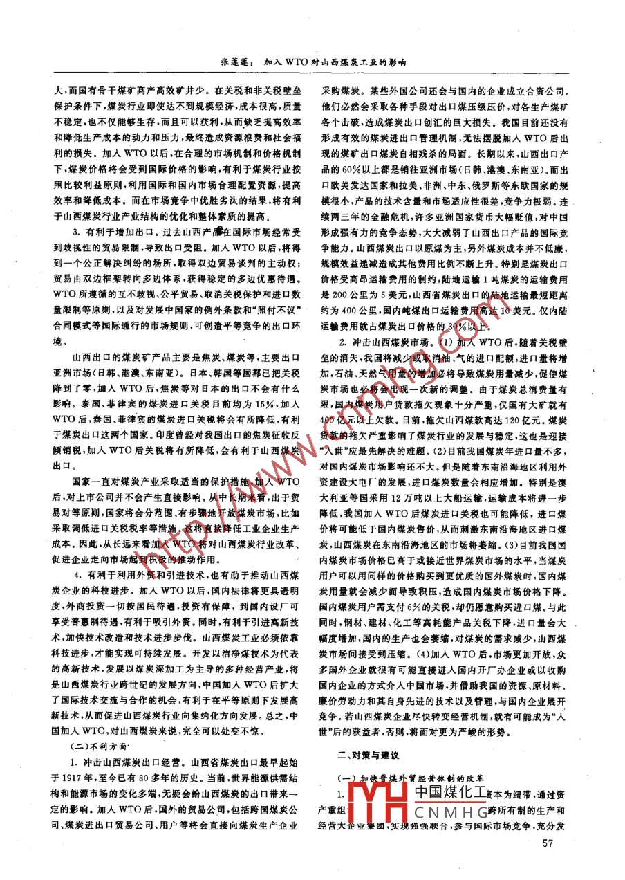 《經(jīng)濟問題)2001年第8期Aug.,2001No.8加入WTO對山西煤炭] C業(yè)的影響張蓮蓮(山西省社會科學(xué)院,山西太原030006)摘要:從山西經(jīng)濟 發(fā)展的實際來考察,煤炭工業(yè)在今后相當(dāng)長的一個時期內(nèi),在山西經(jīng)濟中仍占有舉足輕重的地位。煤炭工業(yè)是山西省的傳統(tǒng)產(chǎn)業(yè),加入WTO意昧著貿(mào)易自由化進(jìn)程將向前推進(jìn),對山西煤炭工業(yè)的影響是利害并存。山西煤炭工業(yè)應(yīng)當(dāng)盡快適應(yīng)這-新的形勢,明確應(yīng)對措施,在強烈的國際國內(nèi)市場沖擊中把握自已,在國內(nèi)外競爭中發(fā)揮優(yōu)勢,重振山西煤炭雄風(fēng),進(jìn)一步促進(jìn)山西經(jīng)濟的發(fā)展。關(guān)鍵詞: WTO;煤炭工業(yè);對策中圖分類號:F407.21文獻(xiàn)標(biāo)識碼:A文章編號:1004-972X(2001 )08- 0056- 03近幾年來,由于受國內(nèi)外經(jīng)濟環(huán)境的影響,產(chǎn)煤大省山化以及能源、原材料工業(yè)為主體的畸重型結(jié)構(gòu),導(dǎo)致了出口西的煤炭工業(yè)陷入了前所未有的困境。雖然面對近3年來煤商品結(jié)構(gòu)的低級化。全省出口產(chǎn)品- .直以焦炭、煤炭、生鐵、炭市場供大于求的局面,煤炭行業(yè)-直在貫徹中央的限產(chǎn)政礬土、鋼材、金屬鏷等“傻、大、黑、粗"初級產(chǎn)品為主,占到總策,不斷加大出口量,但今日已非國家重點扶植的煤炭行業(yè)額的60%以上.加入WTO后,我國經(jīng)濟結(jié)構(gòu)調(diào)整將加速,產(chǎn)仍困難重重,特別是在亞洲金融風(fēng)暴席卷而來時,煤炭行業(yè)業(yè)升級和技術(shù)進(jìn)步加快,必然促進(jìn)高品質(zhì)能源需求量的增加滑向低谷的速度更快。如昔日聞名遐邇的大同煤礦,已無往和能源的節(jié)約,這將進(jìn)-一步減少煤炭的消費。伴隨全球經(jīng)濟日輝煌。山西煤炭行業(yè)長期存在的部門分割,條塊分割的管結(jié)構(gòu)調(diào)整,國際貿(mào)易結(jié)構(gòu)調(diào)整如火如茶.深加工、高附加值、理體制所造成的結(jié)構(gòu)型矛盾集中爆發(fā)。因此,一旦遭遇世界高科技、信息產(chǎn)品等新興國際需求與日俱增,初級產(chǎn)品和低煤炭工業(yè)大集團(tuán)的沖擊,山西的煤炭企業(yè)生存環(huán)境必將面臨附加值產(chǎn)品的國際市場空間日趨減少,競爭加劇,價格下跌。著機遇與挑戰(zhàn)并存的局面。目前國際市場上初級產(chǎn)品特別是部分原材料價格下降了約從影響程度而言,在我國所有工業(yè)領(lǐng)域中,煤炭行業(yè)屬18%,山西首當(dāng)其沖成為受害者。加入WTO,就要既承擔(dān)它于影響較小的行業(yè)。而且,在入世初期所受的影響相對會小所規(guī)定的義務(wù),又享有加入WTO所賦予的各種權(quán)利,在公一些.但在中長期所受的影響將會大一些。由于目前煤炭行平的條件下開展國際競爭.這對山西的礦產(chǎn)資源尤其是煤炭業(yè)不具備國際競爭力,從短期來看,加入世界貿(mào)易組織資源的開發(fā)和礦產(chǎn)品供給無疑會造成一定的影響,將會更充(WTO)降低關(guān)稅和非關(guān)稅壁壘以后,利有可能大于弊。從長分地利用國際資源,進(jìn)行煤炎經(jīng)濟結(jié)構(gòu)調(diào)整.促進(jìn)山西礦業(yè)遠(yuǎn)來看,加人WTO以后,利大于弊是無疑的。開發(fā)和產(chǎn)業(yè)升級,以便更合理、節(jié)約地開發(fā)利用本省資源,加-、加入WT0對山西煤炭工業(yè)發(fā)展的影響分析強資源保護(hù)。2.有利于合理配置資源。(1)WTO是一種世界范圍內(nèi)(一)有利方面開放的市場體系,從締約方的貿(mào)易關(guān)系角度分析,給外國商1.加入WTO有助于山西煤炭經(jīng)濟結(jié)構(gòu)調(diào)整.煤炭在我品國民待遇直接觸及到計劃管理體制本身。市場對資源分配國一次商品1能源總量和總消費量中始終占70%以上,煤炭對的調(diào)節(jié)作用越來越明顯.煤炭資源分配方式全面走向市場調(diào)環(huán)境的影響在能源環(huán)境所占的比重遠(yuǎn)遠(yuǎn)超過其他生產(chǎn)和消節(jié)將不可逆轉(zhuǎn)。全國煤炭采取的是訂貨會交易的形式,在加費中所占的比重。長期以來,山西煤炭工業(yè)除生產(chǎn)-部分煉人WTO之后.煤炭訂貨將逐步走向全面市場交易,有利于焦煤外,基本.上產(chǎn)原煤、賣原煤、燒原煤,熱能利用率長期在合理配置資源。(2)山西煤炭企業(yè)規(guī)模差異較大,企業(yè)較為分30%以下,直銷原煤比重在80%以上,煤炭深加工比例偏小,傲,競爭性較差。無論從何種角度(資產(chǎn)、人數(shù)、產(chǎn)量、銷售量)深加工后下游產(chǎn)品的轉(zhuǎn)化利用尚未得到大的發(fā)展。煤炭是山計算,產(chǎn)業(yè)集中度都很低。目前.全省共有煤礦5594座,其西優(yōu)勢資源,但是由于鐵路和港口的瓶頸作用,加上出口煤中:國有重點煤礦17座,地方煤礦547座,鄉(xiāng)鎮(zhèn)煤礦達(dá)5030炭有雜質(zhì)、灰分高,不能滿足客戶要求。山西產(chǎn)業(yè)結(jié)構(gòu)的初級座。無穩(wěn)定生產(chǎn)能力的小煤礦產(chǎn)量在總產(chǎn)量中所占比重較中國煤化工收稿日期:2001 -03- -18作者簡介:張蓮蓬(1945-),女,湖北武漢人,山西省社會科學(xué)院副YHCNMHG張蓮蓮:加入WTO對山西煤炭工業(yè)的影響大.而國有骨干煤礦高產(chǎn)高效礦井少。在關(guān)稅和非關(guān)稅壁壘采購煤炭。某些外國公司還會與國內(nèi)的企業(yè)成