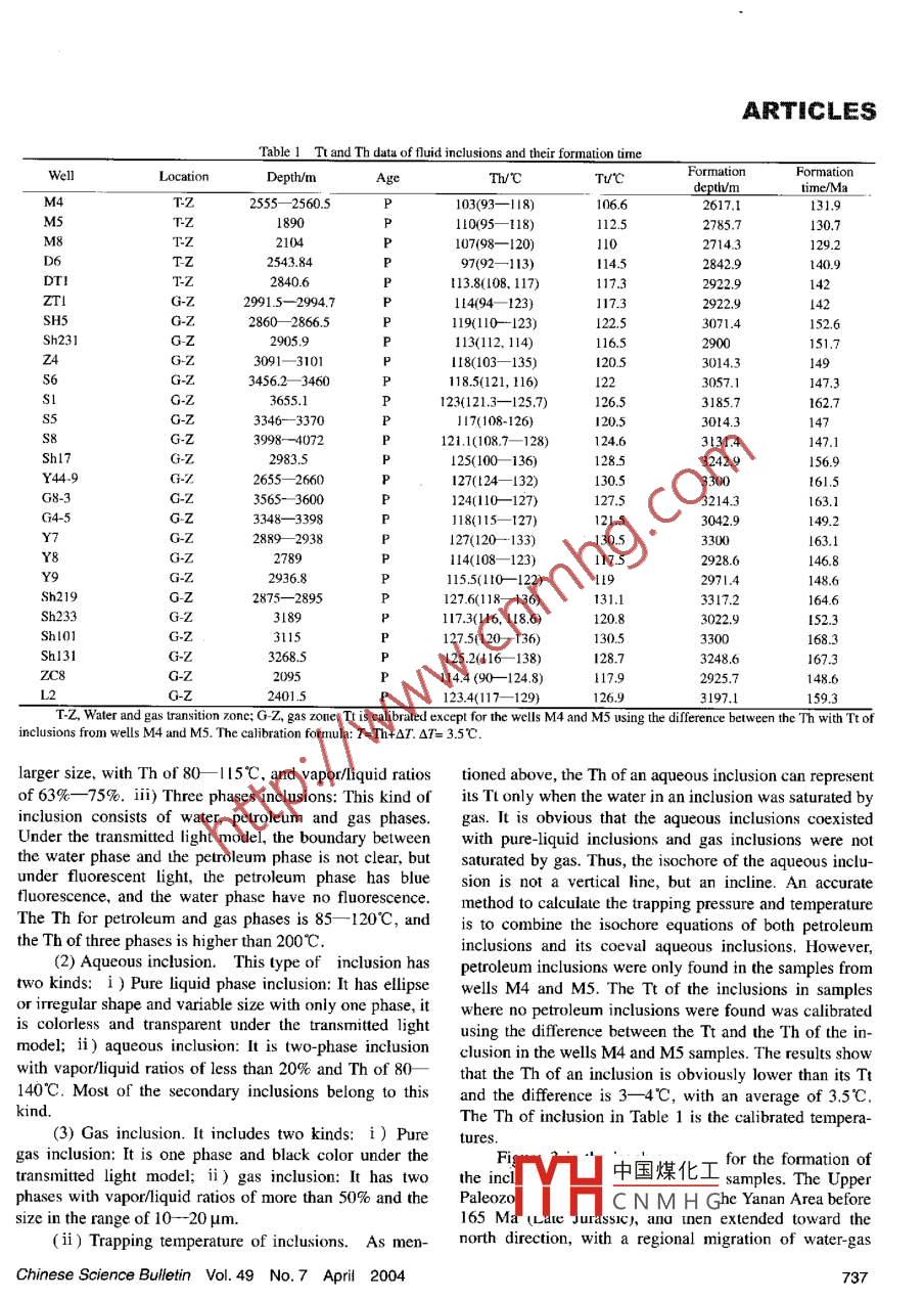 ARTICLESChinese Science Bulletin 2004 Vol 49 No. 7 735-739On the basis of these characteristics some scholarshave believed that the Upper Paleozoic gas pool of theAn investigation of water-gas Ordos Basin is a huge deep basin gas trap after comparinginterface migration of the up- ada i-s). Although there is til a question of whether theper paleozoic gas pool of thegas pool is a deep basin gas trap, the characteristics for theformation of the gas pool are quite clear. For exampleOrdos basin using reservoircontrolled by hand shaped reservoir sandstone bodies influid inclusion informationthe south-north direction, this gas pool consists ofmulti-small isolated gas pools, and these small gas poolsall began to develop from the south area with a regional山x:XIAO Xianming, LIU Dehanmigration of their water-gas interface from the south to theshen jiaguinorth areaOn the basis of previous work, the authors would trof Geochemistry. Chinese Academy of Sciences. Guangzhou 510640, to reconstruct the migration history of the water-gas interChina2. School of Civil Engineering, Hunan University of Science Tech- only provide important information to address the for-nology Xiangtan 411201, ChinaCorrespondence should be addressed to Mi Jingkui (e-mail: mijkmation and evolvement of the gas pool, but also documengig. ac. cn)approach for migration processAbstract There is a particular characteristic in the for-I Principle and methodmation of the Upper Paleozoic gas pool in the Ordos BasinThere are lots of important information in fluid in-that is its water-gas interface migrated regional during geo- clusions about the formation of oil and gas reservoir. Aslogical history. However, there has been lack of detailed re- well known, a necessary condition for the formation ofsearch on this problem and also no similar report on other fluid inclusions is that there should be some water in rocksbasins. In this paper, the formation time of the nuid inclu- Three different zones have existed during the formation ofsions formed in the water-gas transition zone of the gas poolwas deduced using their trapping temperatures and combinthe Upper Paleozoic gas pool of the Ordos Basin"2, theying of the burial with geothermal history of the basin On the are gas zone, water-gas transition zone and water zone.basis of this, the isochrone of water-gas interface migration sInce natural gases have a very low solubility in water andfor the gas pool was mapped. The result shows that the gas the gas migrate by diffusion", only aqueous inclusionspool began to form around the Yanan area at about 165Ma, and gas-bearing inclusions can form in the water zoneand then developed and enlarged toward the north direction. However, the situation in the water-gas transition zone isThe gas pool finally formed at about 129 Ma. Since the basin different from that in the water zone, all kinds of unmixeduplifted from the late Cretaceous and gas supply decreased, water and gas fluids occur widely, and different types ofthe water-gas interface of the gas pool migrated back to thefluid inclusions with a variable vapor/liquid ratio can grow,tionincluding a type of boiling fluid inclusions. After a reserKeywords: Ordos Basin, nuid inclusion, trapping temperature, wa. voir rock was fully filled with gases, there was no water inthe rock pores and not any types of inclusions can formDUI:10.1360/03wdU13lThus the formation time of the fluid inclusions from thewater-gas transition zone would record the time whenLots of geological and geochemical data obtained gases injected into the reservoir rock and the isochronerecently from the Ordos Basin have shown the following the inclusion formation would represent the evolution ofcharacteristics of the Upper Paleozoic gas pool 9:(1) the water-gas interface of the gas pool during geologicalThe source rock of the gas pool is the Carbonifer- history. Therefore, the migration of the water-gas interfaceous-Permian coal-bearing stratum and the reservoiis in a gas pool could be deduced using fluid inclusionthe Carboniferous-Permian Light sandstone with low po-information in reservoir rocksosity and low permeability; (2)the tectonic framework ofa key problem to reconstruct the migration of thethe basin is a large asymmetric syncline, dipping steeply water-gas interface of a gas pool is to identify the fluidnorth:(3)the gas-bearing zone is distributed in the tec- distinct characteristic of inclusions formed in water-gastonic slope area of the basin Toward up-dipping direction traninclusions coexisted within the North and East areas, there is a water-gas transition gas-b中國煤化工 queous inclusion,thezone, and then a water zone; and ( 4) the regional trap of aqueolCNMHG homogenization tem-the gas pool is a hydrodynamic regime, with water on the peratutop of gas, showing a reverse water and gas relationshipwith gas inclusions were selected to measure Th(Fig. 1).Chinese Science Bulletin Vol 49 No. 7 April 2004735ARTICLESaverage Th of 1125C and 93"C, respectively. The paleogeothermal temperature evolution curve of this samplecan be drawn based on its burial history and paleogeothermal gradient(Ren, Z. L, 1994). The cross point be8Aqueous inclusiontween the horizontal line passing the Tt and the paleogeo-thermal temperature curve represents the trapped point ofGas-bearingthe inclusions, and the correspondent time in the X-axis isnclusionthe formation time of the inclusionsThe real line and dashed linthe two象 Gas inclusiongroups of inclusions formed before and after the basinuplifting, respectivelyFig. 1. Different types of fluid inclusions formed in the water and gas( Permian sandstone from well ZT-1, I depth of 2994 m)The procedures to investigate the migration of the wa-ter-gas interface transition zone in a gas pool are in thefollowingl125℃(1) Measurement of fluid inclusion homogenizationtemperature. The THMSG-600 micro-stage made by93℃Linkcam Company was used. The increasing rate of temsions should be distinguished from hyd