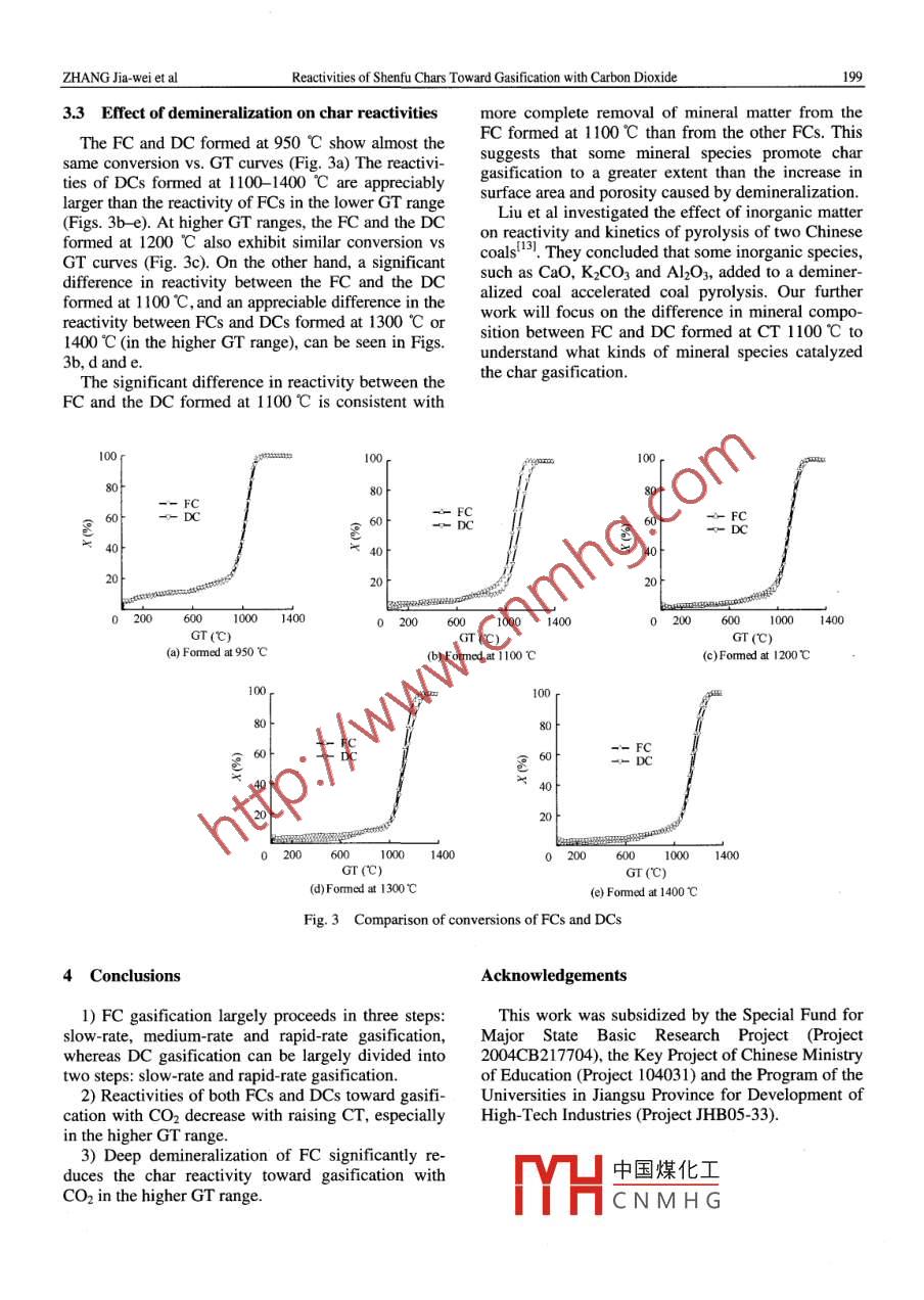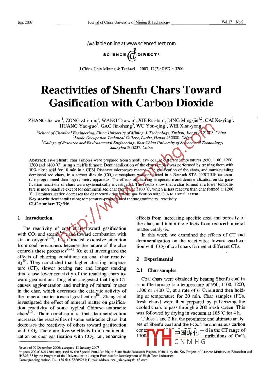 Jun. 2007Journal of China University of Mining & TechnologyVol.17 No.2Available online at www.sciencedirect.comSCIENCE (e doIREcT.J China Univ Mining & Technol 2007, 17(2): 0197 - 0200Reactivities of Shenfu Chars TowardGasification with Carbon DioxideZHANG Jia-wei', ZONG Zhi-min', W ANG Tao-xia', XIE Rui-lun', DING Ming-jie'2, CAI Ke-ying',HUANG Yao-guo', GAO Jin-sheng', WU You-qing , WEI Xian-yong'! School of Chemical Engineering, China University of Mining & Technology, Xuzhou, Jiangsu 221008, ChinaZLuohe Occupation Techrical College, Luohe, Henan 462000, China'College of Resource and Environmental Engineering, East China University of Science and Technology,Shanghai 200237, ChinaAbstract: Five Shenfu char samples were prepared from Shenfu raw coal at different temperatures (950, 1100, 1200,1300 and 1400 C) using a muffle furmace. Demineralization of the char samples was performed by treating them with10% nitric acid for 10 min in a CEM Discover microwave reactor. The gasification of the chars, and correspondingdemineralized chars, in a carbon dioxide (CO2) atmosphere was conducted in a Netzsch STA 409C131F tempera-ture-programmed thermogravimetry apparatus. The effects of charring temperature and demineralization on the gasi-fication reactivity of chars were systematically investigated. The results show that a char formed at a lower tempera-ture is more reactive except for demineralized char formed at 1100 C, which is less reactive than char formed at 1200C. Demineralization decreases the char reactivities toward gasification with CO2 to a small extent.Key words: demineralization; temperature-programmed thermogravimetry; reactivityCLC number: TQ 5461 Introductioneffects from increasing specific area and porosity ofthe char, and inhibiting effects from reduced mineralThe reactivity of coal chars toward gasificationmatter catalysis.with CO2 and steamt- , and toward combustion withIn this work, we examined the effects of CT andair or oxygen', has attracted extensive attentiondemineralization on the reactivities toward gasifica-from coal researchers because the nature of the chartion with CO2 of coal chars formed at different CTs.controls these processes'58. Xu et al investigated theeffects of charring conditions on coal char reactiv-2 Experimentality!. They concluded that higher charring tempera-ture (CT), slower heating rate and longer soaking2.1 Char samplestime cause lower reactivity of the resulting chars to-ward gasification. Tang et al suggested that high CTCoal chars were obtained by heating Shenfu coal incauses agglomeration and melting of mineral mattera muffle fumace to a temperature of 950, 1100, 1200 .in the char, which decreases the catalytic activity of1300 or 1400 C, at a rate of 6 C/min and then hold-the mineral matter toward gasification'o. Zhang et aling at temperature for 20 min. Char samples (FCs,investigated the effect of mineral matter on gasifica-fresh chars) were then prepared by pulverizing thetion reactivity of some typical Chinese anthracitecooled chars to pass through a 200 mesh screen. Thischars. Their conclusion is that demineralizationwas followed by drying in vacuum at 105 C for4 h.increases the reactivities of some anthracite chars, butTables 1 and 2 list the proximate and utimate analy-decreases the reactivity of others toward gasificationses of Shenfu coal and the FCs. The anomalous carbonwith CO2. There are diverse effects from deminerali-conte中國煤化τdintheCTrangeofzation on char gasification with CO2, i.e., enhancing1100:ntributions of CaC2TYHCNMHGReceived 09 December 2006; accepted 11 January 2007Projects 2004CB217704 supported by the Special Fund for Major State Basic Research Project, 104031 by the Key Project of Chinese Ministry of Education andJHB05-33 by the Program of the Universities in Jiangsu Province for Development of High-Tech IndustriesCorresponding author. Tel: +86-516-83885951; E-mail address: wei xianyong@ 163.com198Journal of China University of Mining & TechnologyVoL.17 No.2and SiC.rapid-rate (higher GT range) gasification. The reac-tivity of FC toward gasification decreases with in-Table 1 Proximate and ultimate analyses of Shenfu coalcreased CT, but there is no significant reactivity dif-Proximate analysisUlimate analysis (daf)S, (d)ference between FCs formed at 1200 C and 1300 CAsVMarCH_Nespecially at higher GTs of the third step. Wu, et al10.196.5037.6680.534.800.89 0.37_obtained similar results from isothermal thermogra-vimetric analysis. Raising the CT decreases porosityTable 2 Proximate and ultimate analyses ofFCs (%)and specific surface area of a FC and thereby de-Ultimate analysis (daf)creases FC reactivity toward gasification'CT(C)-As VMarC____ H Ns,(d)100 n950 10.3096.99 0.30.33 .0.42 .-0- 950C1.93100.310.170.4480- -。- 1100C1200 9.951.90 100.54 0 0.14 0.42--- 1200C300 10.08 1.13100.580.07、60 t-v- 1300C140 10.561.12100.100.03-+- 1400C2.2 Demineralized chars (DCs)40Demineralization was performed by treating FCs20with 10% nitric acid at ca. 50 C for 10 min in a CEMDiscover microwave reactor followed by repeatedwashing with deionized water, until no NO; could be60010001400detected in the wash water, and drying in vacuum atGT(C)105 C for 4 h. Mass recovery of DCs is higher thanFig. 1 Conversions of different FCs at different GTs95%. The ash contents of the DCs with CTs of 950,1100, 1200, 1300 and 1400 C are 4.78%, 2.49%,3.2 Effect of CT on DC reactivities3.98%, 4.98% and 4.06%, respectively.Unlike the FC situation, DC gasification can be di-2.3 Char gasificationvided into two steps, slow-rate (GT range: room tem-The gasification runs were performed in a Netzschperature to 900 C for DC formed at 950 c and to ca.STA 409C131F thermogravimetric analyzer. Each1000 C for DC formed at higher CTS) and rapid-ratechar (ca.15 mg) was heated from room temperature to(higher GT range) gasification, as shown in Fig. 2.1400 C at rate of 20 C/min under a 90 mL/min CO2The reactivity of DC toward gasification generallyflow. The reacti