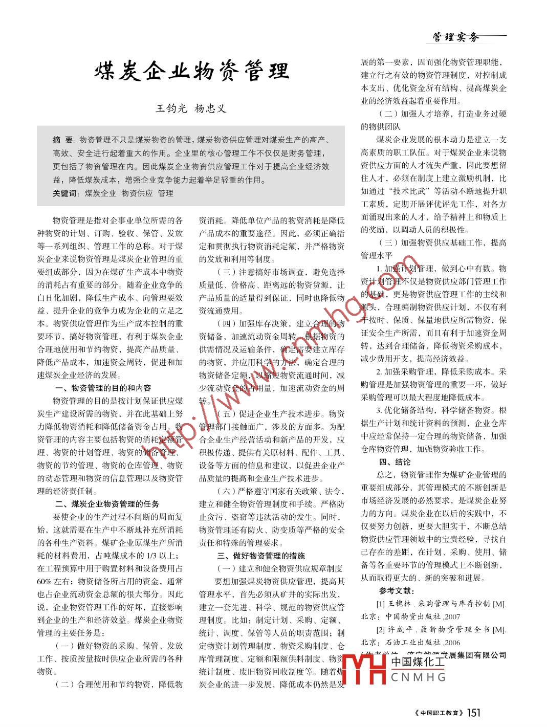管理實(shí)務(wù)展的第一要素,因而強(qiáng)化物資管理職能,煤炭企業(yè)物資管理建立行之有效的物資管理制度,對(duì)控制成本支出、優(yōu)化資金所有結(jié)構(gòu)、提高煤炭企業(yè)的經(jīng)濟(jì)效益起著重要作用。王鈞光楊忠義(二) 加強(qiáng)人才培養(yǎng),打造業(yè)務(wù)過硬.的物供團(tuán)隊(duì)摘要:物資管理不只是煤炭物資的管理,煤炭物資供應(yīng)管理對(duì)煤炭生產(chǎn)的高產(chǎn)、煤炭企業(yè)發(fā)展的根本動(dòng)力是建立一-支高效、安全進(jìn)行起著重大的作用。企業(yè)里的核心管理工作不僅僅是財(cái)務(wù)管理,高素質(zhì)的職工隊(duì)伍。對(duì)于煤炭企業(yè)來說物更包括了物資管理在內(nèi)。因此煤炭企業(yè)物資供應(yīng)管理工作對(duì)于提高企業(yè)經(jīng)濟(jì)效資供應(yīng)方面的人才流失嚴(yán)重,因此要想留益,降低煤炭成本,增強(qiáng)企業(yè)競爭能力起著舉足輕重的作用。住人才,必須在制度上建立激勵(lì)機(jī)制,比關(guān)鍵詞:煤炭企業(yè)物資供應(yīng)管理如通過“技術(shù)比武”等活動(dòng)不斷地提升職工素質(zhì),定期開展評(píng)優(yōu)評(píng)先工作,對(duì)各方物資管理是指對(duì)企事業(yè)單位所需的各資消耗。降低單位產(chǎn)品的物資消耗是降低面涌現(xiàn)出來的人才,給予精神上和物質(zhì)上種物資的計(jì)劃、訂購、驗(yàn)收、保管、發(fā)放產(chǎn)品成本的重要途徑。因此,必須正確指的獎(jiǎng)勵(lì),以調(diào)動(dòng)人員的積極性。(三)加強(qiáng)物資供應(yīng)基礎(chǔ)工作,提高等一系列組織、管理工作的總稱。對(duì)于煤定和貫徹執(zhí)行物資消耗定額,并嚴(yán)格物資管理水平炭企業(yè)來說物資管理是煤炭企業(yè)管理的重的發(fā)放和利用等制度。1.加強(qiáng)計(jì)劃管理,做到心中有數(shù)。物要組成部分,因?yàn)樵诿旱V生產(chǎn)成本中物資(三)注意搞好市場調(diào)查,避免選擇的消耗占有重要的部分。隨著企業(yè)競爭的質(zhì)量低、價(jià)格高、距離遠(yuǎn)的物資貨源,讓資計(jì)劃管理不僅是物資供應(yīng)部門管理工作白日化加劇,降低生產(chǎn)成本、向管理要效產(chǎn)品質(zhì)量的適量得到保證,同時(shí)也降低物的基礎(chǔ),更是物資供應(yīng)管理工作的主線和益、提升企業(yè)的競爭力成為企業(yè)的立足之資流通費(fèi)用。源頭,合理編制物資供應(yīng)計(jì)劃,不僅有利本。物資供應(yīng)管理作為生產(chǎn)成本控制的重(四)加強(qiáng)庫存決策,建立合理的物于按時(shí)、保質(zhì)、保量地供應(yīng)所需物資,保要環(huán)節(jié),搞好物資管理,有利于煤炭企業(yè)資儲(chǔ)備,加速流動(dòng)資金周轉(zhuǎn)。根據(jù)物資的證安全生產(chǎn)所需,而且有利于加速資金周合理地使用和節(jié)約物資,提高產(chǎn)品質(zhì)量、供需情況及運(yùn)輸條件,確定需要建立庫存轉(zhuǎn),達(dá)到合理儲(chǔ)備,降低物資采購成本,降低產(chǎn)品成本,加速資金周轉(zhuǎn),促進(jìn)和加的物資,并應(yīng)用科學(xué)的方法,確定合理的減少費(fèi)用開支,提高經(jīng)濟(jì)效益。速煤炭企業(yè)經(jīng)濟(jì)的發(fā)展。物資儲(chǔ)備定額,以縮短物資流通時(shí)間,減2.加強(qiáng)采購管理,降低采購成本。采一、 物資管理的目的和內(nèi)容少流動(dòng)資金的占用量,加速流動(dòng)資金的周購管理是加強(qiáng)物資管理的重要一環(huán), 做好物資管理的目的是按計(jì)劃保證供應(yīng)煤轉(zhuǎn)。采購管理可以最大程度地降低成本。3.優(yōu)化儲(chǔ)備結(jié)構(gòu),科學(xué)儲(chǔ)備物資。根炭生產(chǎn)建設(shè)所需的物資,并在此基礎(chǔ)上努(五)促進(jìn)企業(yè)生產(chǎn)技術(shù)進(jìn)步。物資據(jù)生產(chǎn)計(jì)劃和統(tǒng)計(jì)資料的預(yù)測,企業(yè)倉庫力降低物資消耗和降低儲(chǔ)備資金占用。物管理部門接觸面廣,涉及的方面多。為配中應(yīng)經(jīng)常保持- -定 合理的物資儲(chǔ)備,加強(qiáng)資管理的內(nèi)容主要包括物資的消耗定額管合企業(yè)生產(chǎn)經(jīng)營活動(dòng)和新產(chǎn)品的開發(fā),應(yīng)理、物資的計(jì)劃管理、物資的儲(chǔ)備管理、積極傳遞、提供有關(guān)原材料、配件、工具、倉庫物資管理,加強(qiáng)物資驗(yàn)收工作。物資的節(jié)約管理、物資的倉庫管理、物資設(shè)備等方面的信息和建議,以促進(jìn)企業(yè)產(chǎn)四、結(jié)論的動(dòng)態(tài)管理和物資的信息管理以及物資管品質(zhì)量的提高和企業(yè)生產(chǎn)技術(shù)進(jìn)步??傊镔Y管理作為煤礦企業(yè)管理的理的經(jīng)濟(jì)責(zé)任制。(六)嚴(yán)格遵守國家有關(guān)政策、法令,重要組成部分, 其管理模式的不斷創(chuàng)新是市場經(jīng)濟(jì)發(fā)展的必然要求,是煤炭企業(yè)努二、煤炭企業(yè)物資管理的任務(wù)建立和健全物資管理制度和手續(xù)。嚴(yán)格防要使企業(yè)的生產(chǎn)過程不間斷的周而復(fù)止貪污、盜竊等違法活動(dòng)的發(fā)生。同時(shí),力的方向。煤炭企業(yè)在以后的實(shí)踐中,不始,這就需要在生產(chǎn)中不斷地補(bǔ)充所消耗物資管理還有防火、防變質(zhì)等嚴(yán)格的安全僅要努力創(chuàng)新,更要大膽實(shí)干,不斷總結(jié)的各種生產(chǎn)資料。煤