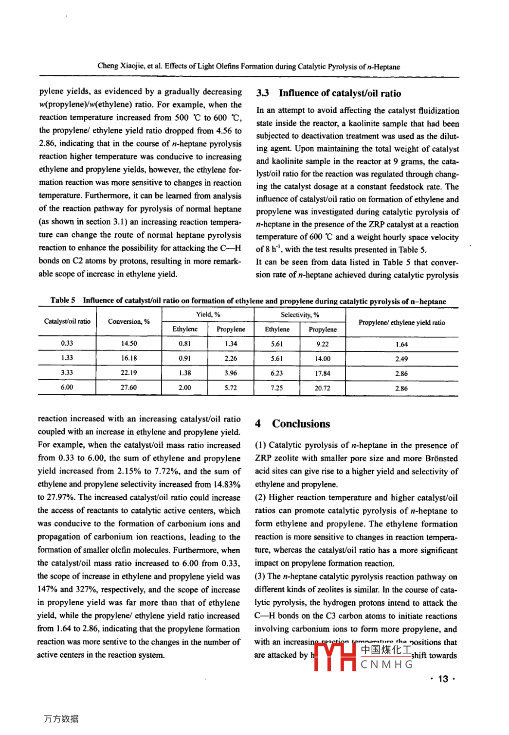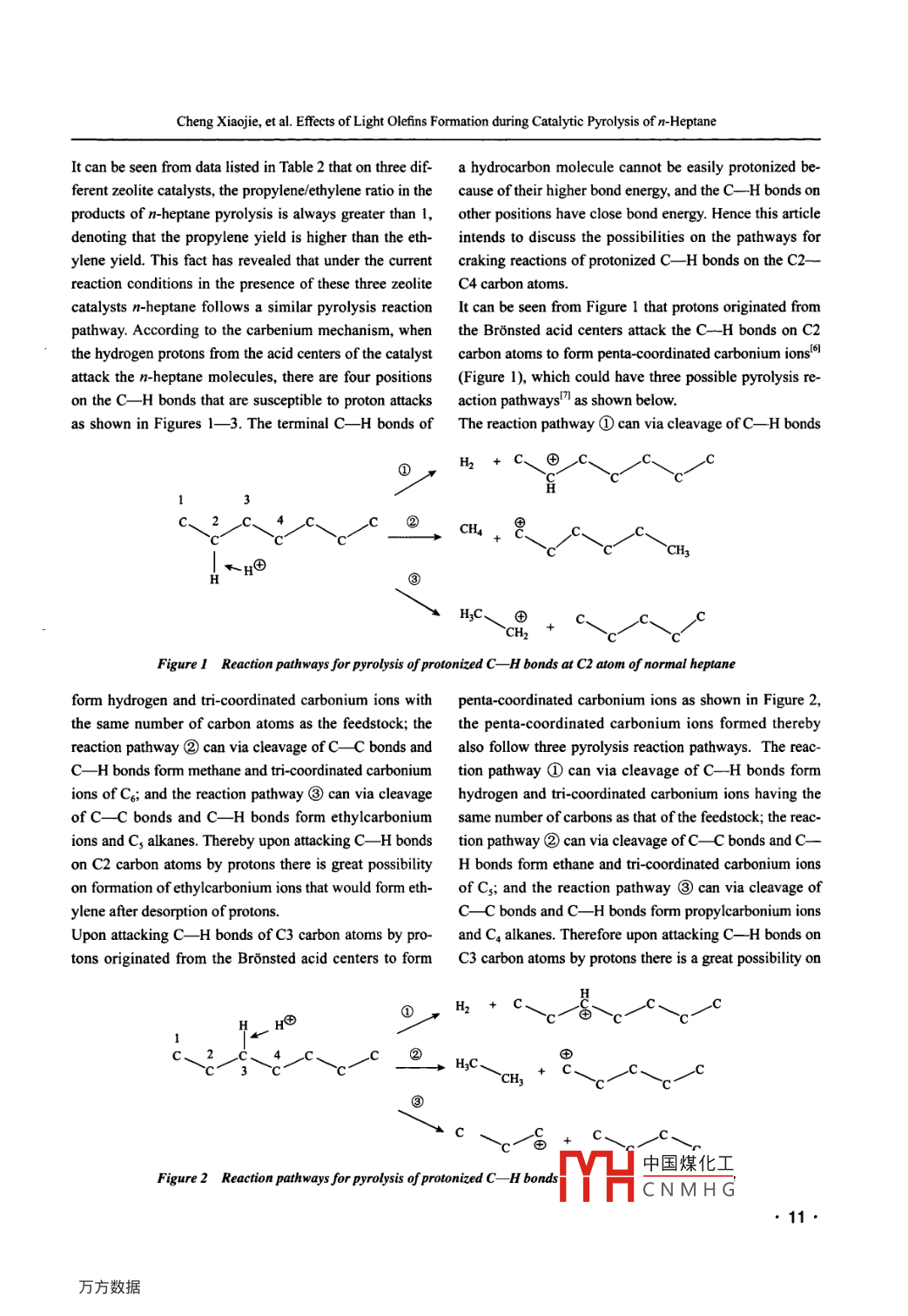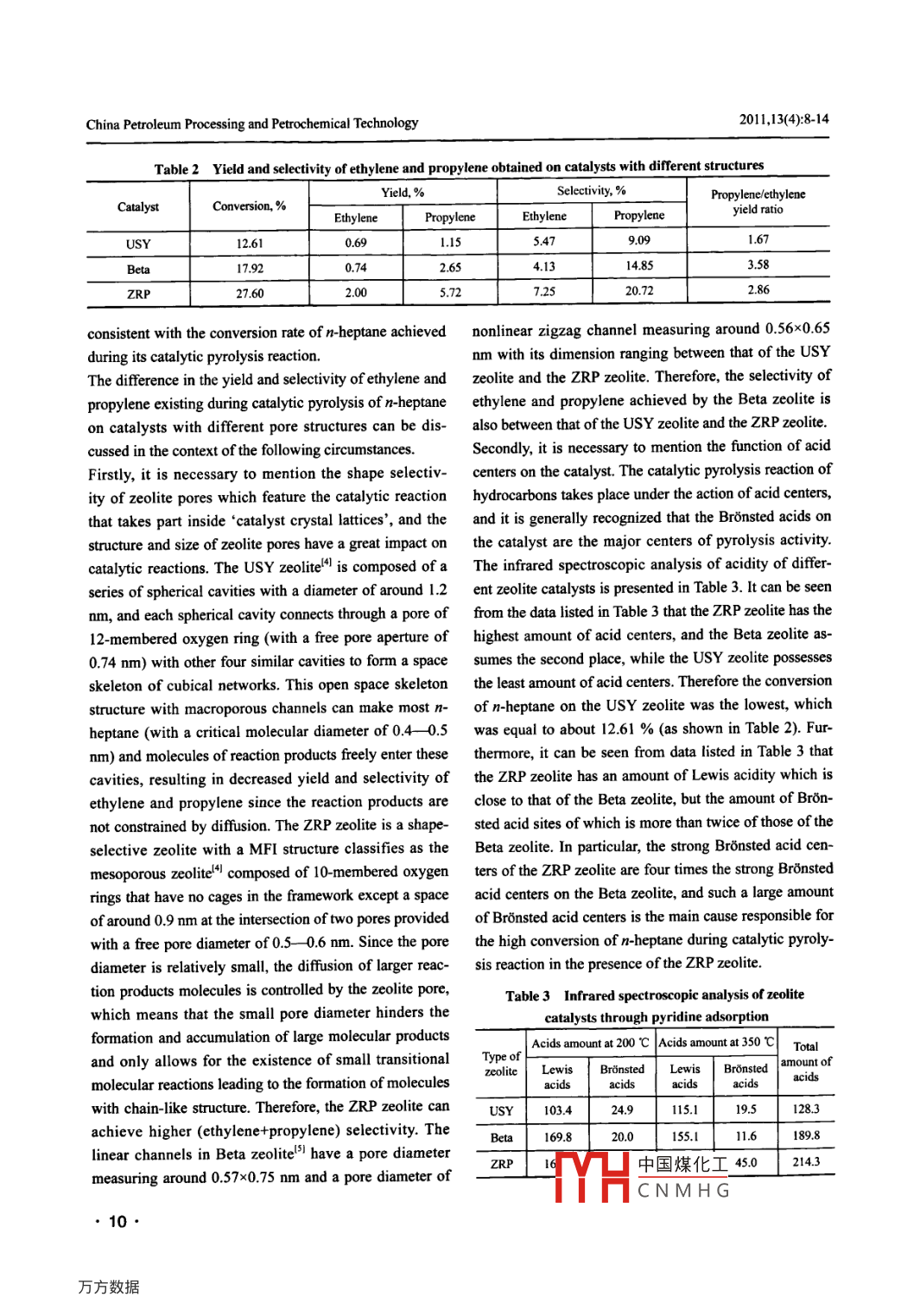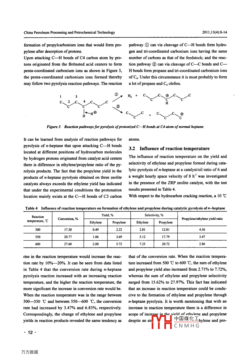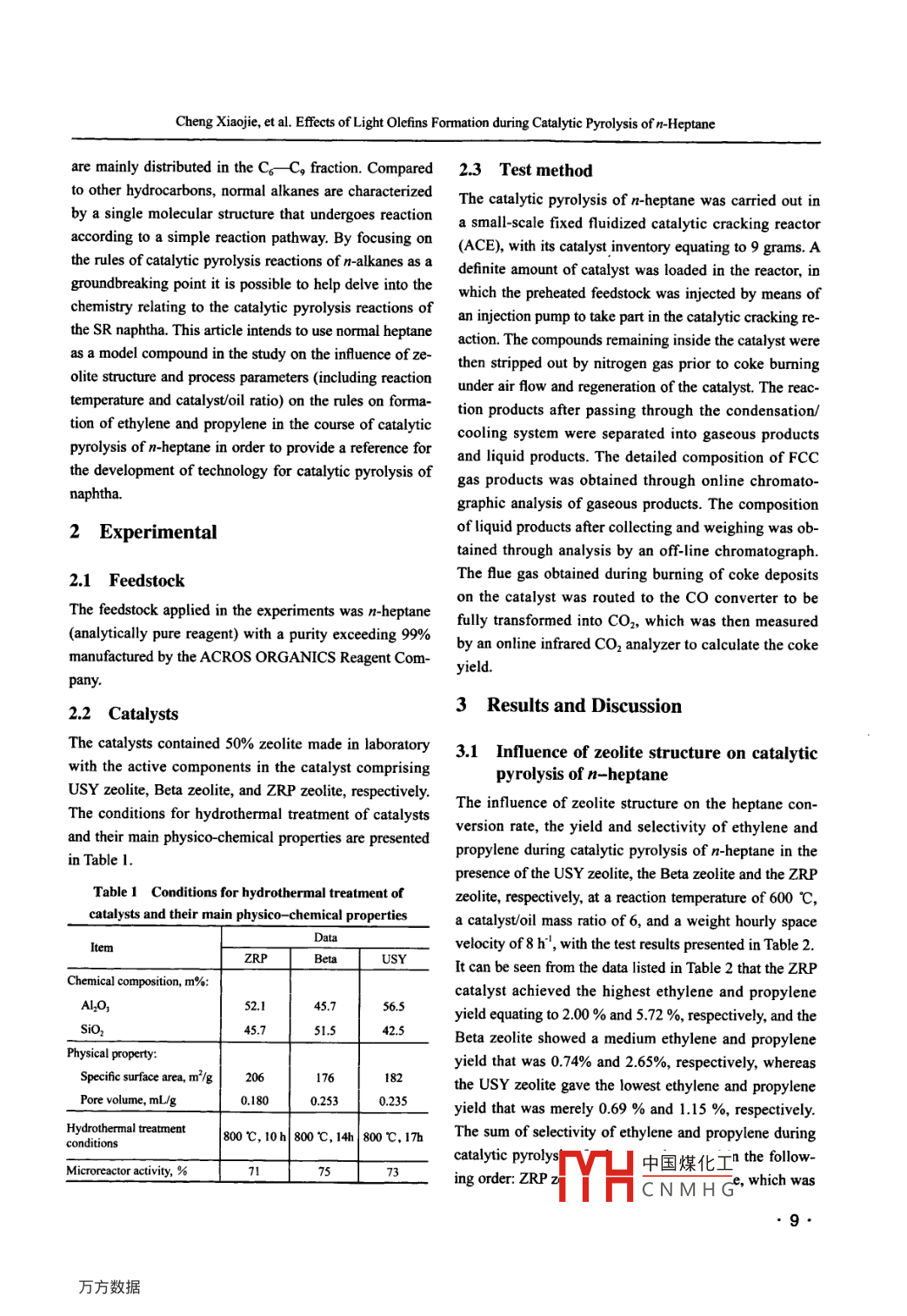 China Petroleum Processing and Petrochemical TechnologyScientifc Research2011,Vol. 13, No. 4, pp 8-14December 30 2011Effects of Light Olefins Formation during CatalyticPyrolysis of n-HeptaneCheng Xiaojie; Xie Chaogang; Wei Xiaoli(SINOPEC Research Institute of Petroleum Processing, Bejing 100083)Abstract: The infuence of zeolite structure and process parameters (including reaction temperature and catalyst/oil ratio)on rules for formation of ethylene and propylene in the course of catalytic pyrolysis of n-heptane was studied in a smal-scale fixed fuid catalytic cracking unit. Test results have revealed that compared to the USY zeolite and Beta zeolite, thecatalytic pyrolysis of n-heptane in the presence of the ZRP zeolite catalyst can result in higher yield and selectivity of ethyl-ene and propylene, while a higher reaction temperature and a higher catalystoil ratio can promote the formation of ethyleneand propylene during catalytic pyrolysis of n-heptane. The ethylene formation reaction is more sensitive to the changes inreaction temperature, whereas the changes in catalyst/oil ratio are more infuential to the propylene formation reaction. Thispaper has made a preliminary exploration into the different reaction pathways for formation of ethylene and propylene onzeolites with different structures.Key words: n-heptane catalytic pyrolysis light olefins reaction pathway1 Introductionoutput of ethylene and propylene than that provided bythe steam cracking process, despite its effective contribu-Ethylene and propylene are important organic chemicaltion to the increase in the propylene/ethylene ratio, for itfeedstocks. In 2010 the global demand for ethylene andstill delivers a sizable amount of gasoline component. Inpropylene was 115 million metric tons and 70 millionorder to tackle the above mentioned problems after tak-metric tons, respectively, while the propylene /ethyleneing into account the current situation of China's crudedemand ratio increased to 0.61, with the propylene /ethyl-oil production and petroleum refining industry as wellene production ratio decreased to 0.34. It is projected thatas the ethylene production cost, it is recognized that thein the future years to come the global propylene demandsteam cracking and catalytic pyrolysis units will still usewill be growing at a rate exceeding 5% a year, which willnaphtha as the feedstock for many years to come, and thebe higher than the demand increase for ethylel-2. Adevelopment of naphtha catalytic pyrolysis technologypresent more than 95 percent of ethylene and over 60 per-would be an important direction for the growth of lightcent of propylene are produced worldwide by the steamolefins industry in a bid to increase the product yield andcracking technology', but the propylene /ethylene outputimprove the product distribution.ratio delivered by steam cracking units is much lowerThe straight-run (SR) naphtha fraction contains hydro-than the propylene /ethylene demand ratio. Since the gapcarbons that are divided into aliphatic hydrocarbons,between the current production of ethylene and propyl-naphthenic hydrocarbons and aromatic hydrocarbons,ene through steam cracking technology and the marketand clear understanding of the possible chemical reac-demand will constantly widen, the development of newions and reaction pathways of these hydrocarbons hastechnology for manufacture of light olefins is extremelyimportant and practical significance for design of newurgent. The heavy oil catalytic pyrolysis technology (suchcatalysts, selection and optimization of process. The nor-as DCC and CPP techniques) as another important meansmal alkanes account for over 30 m% of SR naphtha andfor producing propylene has been producing propylenethat accounts for around 30% of total propylene produc-Corrresponding Anthor' Prnfessonr Xie Chaogang, Telephone:tion'l. However, catalytic pyrolysis still has a lower total+86-10-823687中國煤化工c.com.YHCNMHG8●Cheng Xiajie, et al. Efects of Light Olefns Formation during Catalytic Pyrolysis of n-Heptaneare mainly distributed in the C。C, fraction. Compared2.3 Test methodto other hydrocarbons, normal alkanes are characterized The catalytic pyrolysis of n-heptane was carried out inby a single molecular structure that undergoes reaction a small-scale fixed fluidized catalytic cracking reactoraccording to a simple reaction pathway. By focusing on (ACE), with its catalyst jinventory equating to 9 grams. Athe rules of catalytic pyrolysis reactions of n-alkanes as a definite amount of catalyst was loaded in the reactor, ingroundbreaking point it is possible to help delve into the which the preheated feedstock was injected by means ofchemistry relating to the catalytic pyrolysis reactions of an injection pump to take part in the catalytic cracking re-the SR naphtha. This article intends to use normal heptane action. The compounds remaining inside the catalyst wereas a model compound in the study on the infuence of ze- then stripped out by nitrogen gas prior to coke burningolite structure and process parameters (including reactionunder air fow and regeneration of the catalyst. The reac-temperature and catalyst/oil ratio) on the rules on forma-tion products after passing through the condensation/tion of ethylene and propylene in the course of catalyticcooling system were separated into gascous productspyrolysis of n-heptane in order to provide a reference forand liquid products. The detailed composition of FCCthe development of technology for catalytic pyrolysis ofgas products was obtained through online chromato-naphtha.graphic analysis of gaseous products. The compositionof liquid products after collecting and weighing was ob-2 Experimentaltained through analysis by an off-line chromatograph.The fue gas obtained during burning of coke deposits2.1 Feedstockon the catalyst was routed to the co converter to beThe feedstock applied in the experiments was n-heptanefully transformed into CO, which was then measured(analytic