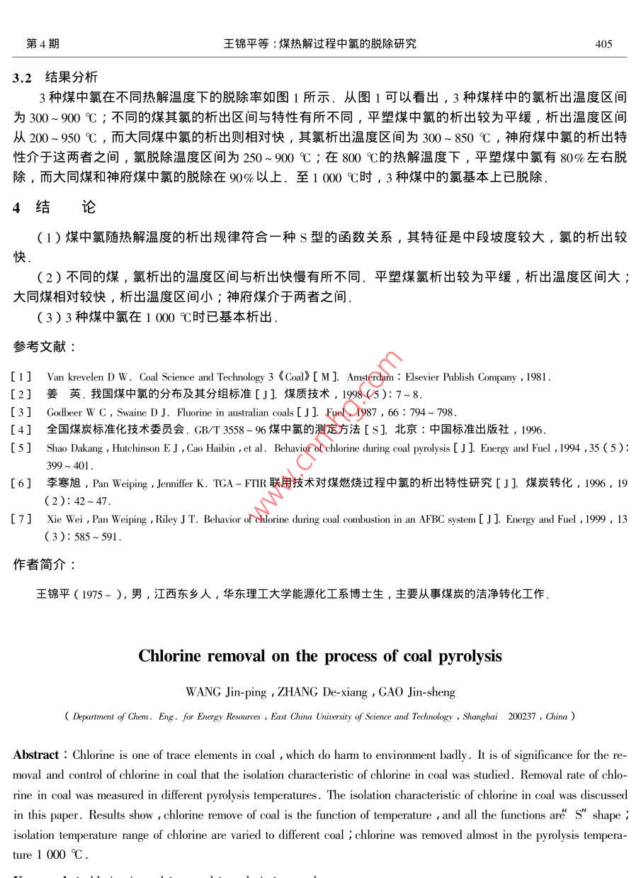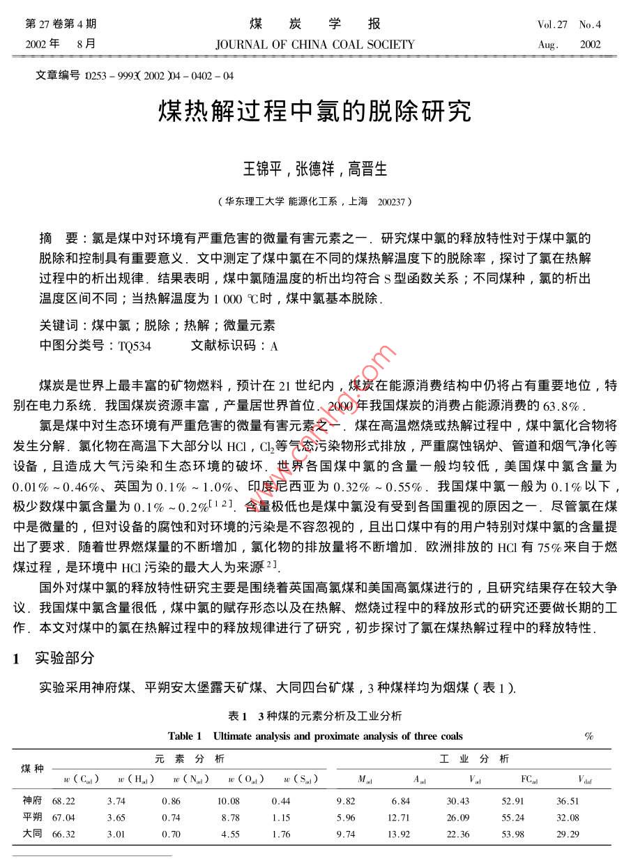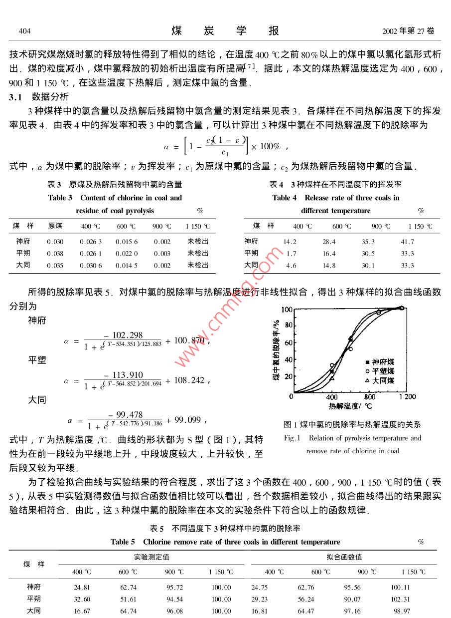 第27卷第4期煤炭學(xué)報Vol.27 No.42002年8月JOURNAL OF CHINA COAL SOCIETYAug.2002文章編號0253 - 9993 2002 )4- 0402 - 04煤熱解過程中氯的脫除研究王錦平,張德祥,高晉生(華東理工大學(xué)能源化工系,上海200237)摘要:氯是煤中對環(huán)境有嚴(yán)重危害的微量有害元素之- .研究煤中氯的釋放特性對于煤中氯的脫除和控制具有重要意義.文中測定了煤中氯在不同的煤熱解溫度下的脫除率,探討了氯在熱解過程中的析出規(guī)律.結(jié)果表明,煤中氯隨溫度的析出均符合S型函數(shù)關(guān)系;不同煤種,氯的析出溫度區(qū)間不同;當(dāng)熱解溫度為1 000 C時,煤中氯基本脫除.關(guān)鍵詞:煤中氯;脫除;熱解;微量元素中圖分類號: TQ534文獻(xiàn)標(biāo)識碼: A煤炭是世界上最豐富的礦物燃料,預(yù)計在21世紀(jì)內(nèi),煤炭在能源消費結(jié)構(gòu)中仍將占有重要地位,特別在電力系統(tǒng).我國煤炭資源豐富,產(chǎn)量居世界首位.2000 年我國煤炭的消費占能源消費的63.8% .氯是煤中對生態(tài)環(huán)境有嚴(yán)重危害的微量有害元素之一.煤在高溫燃燒或熱解過程中,煤中氯化合物將發(fā)生分解.氯化物在高溫下大部分以HCI , Cl)等氣態(tài)污染物形式排放,嚴(yán)重腐蝕鍋爐、管道和煙氣凈化等設(shè)備,且造成大氣污染和生態(tài)環(huán)境的破壞,世界各國煤中氯的含量一般均較低,美國煤中氯含量為0.01%~0.46%、英國為0.1% ~ 1.0%、印度尼西亞為0.32% ~0.55%.我國煤中氯一般為0.1%以下,極少數(shù)煤中氯含量為0.1% ~ 0.2%[12].含量極低也是煤中氯沒有受到各國重視的原因之一-.盡管氯在煤中是微量的,但對設(shè)備的腐蝕和對環(huán)境的污染是不容忽視的,且出口煤中有的用戶特別對煤中氯的含量提出了要求,隨著世界燃煤量的不斷增加,氯化物的排放量將不斷增加,歐洲排放的HCI有75%來自于燃煤過程,是環(huán)境中HCI污染的最大人為來源2].國外對煤中氯的釋放特性研究主要是圍繞著英國高氯煤和美國高氯煤進(jìn)行的,且研究結(jié)果存在較大爭議.我國煤中氯含量很低,煤中氯的賦存形態(tài)以及在熱解、燃燒過程中的釋放形式的研究還要做長期的工作.本文對煤中的氯在熱解過程中的釋放規(guī)律進(jìn)行了研究,初步探討了氯在煤熱解過程中的釋放特性.1實驗部分實驗采用神府煤、平朔安太堡露天礦煤、大同四臺礦煤, 3種煤樣均為煙煤(表1 ).表13 種煤的元素分析及工業(yè)分析Table 1 Ultimate analysis and proximate analysis of three coals%元素分析工業(yè)分析煤種w(Cm)1w0(H.) 10 (Nu)w(0)w(Su)M。A.FC.a神府68.223.740.8610.080.449.826.8452.9136.51平朔67.043.650.748.781.1512.7126.0955.2432.08大同66.323.010.704.551.769.7413.922.3653.9829.29第4期王錦平等:煤熱解過程中氯的脫除研究403煤熱解方法采用快速熱解.馬弗爐預(yù)先升到所需熱解溫度,將已磨至0.2 mm以下的煤樣置于坩堝中,蓋上坩堝蓋(無孔),放入馬弗爐中進(jìn)行熱解,時間為10 min ,熱解后的煤樣進(jìn)行氯含量的測定.煤中氯的測定采用高溫燃燒水解法.煤樣的處理在管式爐中進(jìn)行,燃燒溫度控制在(1100+ 10)C ,氧氣流量為500 mL/min ,水蒸氣流量為2 mL/min,用去離子水作接受液.所得樣品溶液采用PHSJ-4A型PH計(帶溫度補(bǔ)償電極測量精度為士0.1mV )測定,氯離子選擇電極為PCL- 1型,參比電極為217型.2煤中氯測定方法的選擇煤中氯的測定方法較多.我國國標(biāo)中規(guī)定的測定方法有高溫燃燒水解法-電位滴定法和艾式卡混合熔樣-硫氰酸鉀溶液滴定法2種,美國國標(biāo)有氧彈燃燒-電位滴定法.煤中氯測定的準(zhǔn)確性就在于煤樣處理過程中煤中氯是否完全定量地轉(zhuǎn)化到樣品溶液中,以及樣品溶液中氯測定方法的準(zhǔn)確性.然而,由于煤中氯賦存形態(tài)的復(fù)雜性,某些測定方法之間的測定結(jié)果會存在著較大的差異.Gollbeer等3對80余種澳大利亞煤及10余種標(biāo)準(zhǔn)物質(zhì)分別用氧彈法(美國國家標(biāo)準(zhǔn)ASTM )和高溫水解法進(jìn)行了測定,發(fā)現(xiàn)2種方法的測定結(jié)果相差較大,氧彈法測定值普遍低于高溫水解法測定值,且當(dāng)煤中灰分越高時,偏差越大.高溫燃燒水解法對煤中的氯化物礦物質(zhì)有很好的分解作用,煤中難分解的氯化物,如氯化鎂、氯化鈣等在此高溫下均會發(fā)生分解,煤中氯能夠較完全地轉(zhuǎn)入到溶液中.樣品溶液采用氯離子選擇電極電位滴定,樣品溶液中的雜離子少,滴定的干擾小,以電勢差的突變來判斷為滴定的終點.并用差值微商或作微分曲線法確定滴定的精確終點,所得的終點值精確可靠,人為誤差小.艾士卡混合熔樣法對煤中氯礦物質(zhì)的分解效果較差,煤中的氯未能完全定量地轉(zhuǎn)化入到溶液中,且煤樣的處理過程不如高溫水解法簡潔,操作過程中易造成人為誤差.樣品溶液的測定采用的是以硫酸鐵銨作指示劑,用硫氰酸鉀溶液進(jìn)行滴定的方法,以人眼觀察溶液的著色變化來判斷滴定終點,易給實驗帶來一定的人為誤差,在滴定的方法上不如電位滴定精確.根據(jù)上述情況,結(jié)合我國煤中氯測定的國家標(biāo)準(zhǔn)一高溫燃燒水解法和艾士卡熔樣法進(jìn)行了試驗[4].2種方法測定3種煤樣中氯所得結(jié)果見表2.為了考察2種測定方法測定高氯含量時的準(zhǔn)確性,向大同煤中加入基優(yōu)級的NaCl,再測定氯含量,測定值與加入值之差即為大同煤的氯含量(表2).表22種不同方法測得煤中氯的