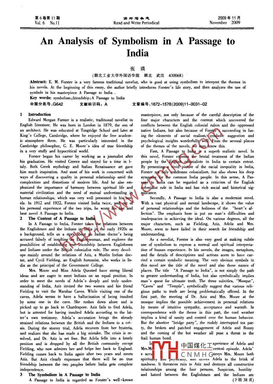 第6卷第11期讀與寫雜志2009年11月Vol.6 No.11Read and Write PeriodicalNovember 2009An Analysis of Symbolism in A Passage toIndia張瑛(湖北工業(yè)大學(xué)外國語學(xué)院湖北武漢430068)Abstract: E. M. Forster is a very famous traditional novelist, who is good at using symbolism to interpret the themes inhis novels. At the beginning of this essay, the author briely introduces Forster's life story, and then analyzes the use ofsymbols in his masterpiece A Pasage 10 India.Key words: symbolism;friendship;A Passage to India中圖分類號:G642文獻(xiàn)標(biāo)識碼: A文章編號:1672- -1578(2009)11 0031-02Introductionmasterpece, not only because of the careful description of theEdward Morgan Forster is a realistie, traditional novelist in four major characlers and the content which uncovered theEnglish literature. He was bom in London in 1879, the son of conflicts between the English colonial rulers and the oppressedan architect. He was educated at Tongridge School and lalter at native Indians, but also because of Forster's succeeding in fus-King's College, Cambridge, where he enjoyed the free academ-ing the elements of social realism, symbolic suggestion andic atmosphere there. He was paricularly interested in thepsychological insights wonderfully well. From the several placesCambridge pbilosopher, G. E. Moore's idea of true friendship of the themes of the novels, we may know this.in a very stuffy and hypocritical world.First, A Passage to India is a superb realistic novel. InForster began his career by working as a joumalist after this novel, Forster exposes the brutal treatment of the Indianhis graduation. He visited Greece and stayed for a time in 卜people by the English colonialists in India to certain extent.aly. Both Creek mythology and ltalian Renaissance art gaveBy presenting a vivid picture of the racial inequality in India,him much inspiration. And most of his work is concermed withForster not only condemns colonialism, but also shows his deepways of discovering a quality in personal relationship amid the sympathy for the common India people. In this sense, A Pas-complexities and distortions of modem life. And he also em- sage to India can be regarded as a eriticism of the Englishphasized the importance of harmony between spiritual life and colonialist rule in India and has rich social and historical sig-material civilization and the need of mutual understanding innificance.human relationships, which was very well presented in his nov-Secondly, A Passage to India is also a modernist novel.els. In 1912 and 1922, Forster visited India twice, and out ofWith a vast physical and mental landscape, it shows the valuehis personal experience of the two trips, he wrote his last and of personal relationships and the holiness of the "heart's af-best novel A Passage to India.feection". The emphasis here is put on man's difficulties and2 The Content of A Passage to Indiainadequacies in achieving the ideal. On various degrees, all theIn A Passage to India, Forster takes the relations between major characters, such as Fielding, Aziz, Adela and Mrs.he Englishmen and the Indians in India in the early 1920s as Moore, seemn to have failed in their search for friendship anda background,tells us a story about an Indian doctor's beingunderstanding.accused falsely of insulting an Englishwoman, and explores the. As a novelist, Forster is also very good at making subtlepossibilities of establishing true frendship between Englishmen use of symbolism to express a normal and spiritual interprela-and Indians under the Brish colonialist rule. The story devel- tion of human experience. In his novels, the images, metaphors,ps mainly around the relations of Aziz, a Muslin Indian doc-and the details of descripions and actions seem to have car-tor, and Cycil Fielding, an English humanisl, who works in In- ried a certain symbolic meaning. The very obvious symbols india as the principal of the Govemment College.this novel are the title of the novel and also those names ofMrs. Moore and Miss Adela Quested have strong liberal places. The titleideas and are eager to meet Indians on an equal position. In to greater understanding of India, but also symbolically impliesorder to meet the needs of Adela's deeply and truly under- man's quest for ulimate truth. The three subtitles, "Mosque",standing of India, Aziz invited the two women and his friend "Caves" and "Temple", symbolically suggest that various reli-Fielding to visit the Marabar Caves. While visiting one of thegious paths to truth are being problematically offered. In thecaves, Adela seems to have a hallucinalion of being insuiled firstpart, the meeting of Dr. Aziz and Mrs. Moore at theby some one in the cave. She rushes down alone and is mosque implies the possible achievement in personal relationspicked up to go back to Chardrapore. Aziz fails to find Adela, by means of intuitive sympathy, acceptance and warnth. Inbut is arrested for having insulted Adela according to the lat. correspondence with the theme in this part, the cool weatherter's own testimony. Adela's accusation brings the already implies a kind of sanity and control over the human behavior.strained relations between the British and the Indians to a cri-But the abortive "bridge party" the rudely interupled tea par-sis. During the stormy trial, Adela recovers from her hysteria, ty, the broken and patched engagement of Adela and Ronnyand realizes that she has made a big mistake. The crisis is re- and the coming of the hot weather all pose a threat to thesolved, and Dr. Aziz is set free. But Adela flls into a lonely frail human bond.position and is dropped by all the British community excepl中國煤化工. xperience of Adela andFielding, who now admires her and helps her back to England. Mrs.Mcentral episode. Adela'Fielding comesback to India again after two years and meets B accu:Y HC N M H Gliroys Mrs. Moore bothAziz. But Aziz clearly expresses that there will be no tr
