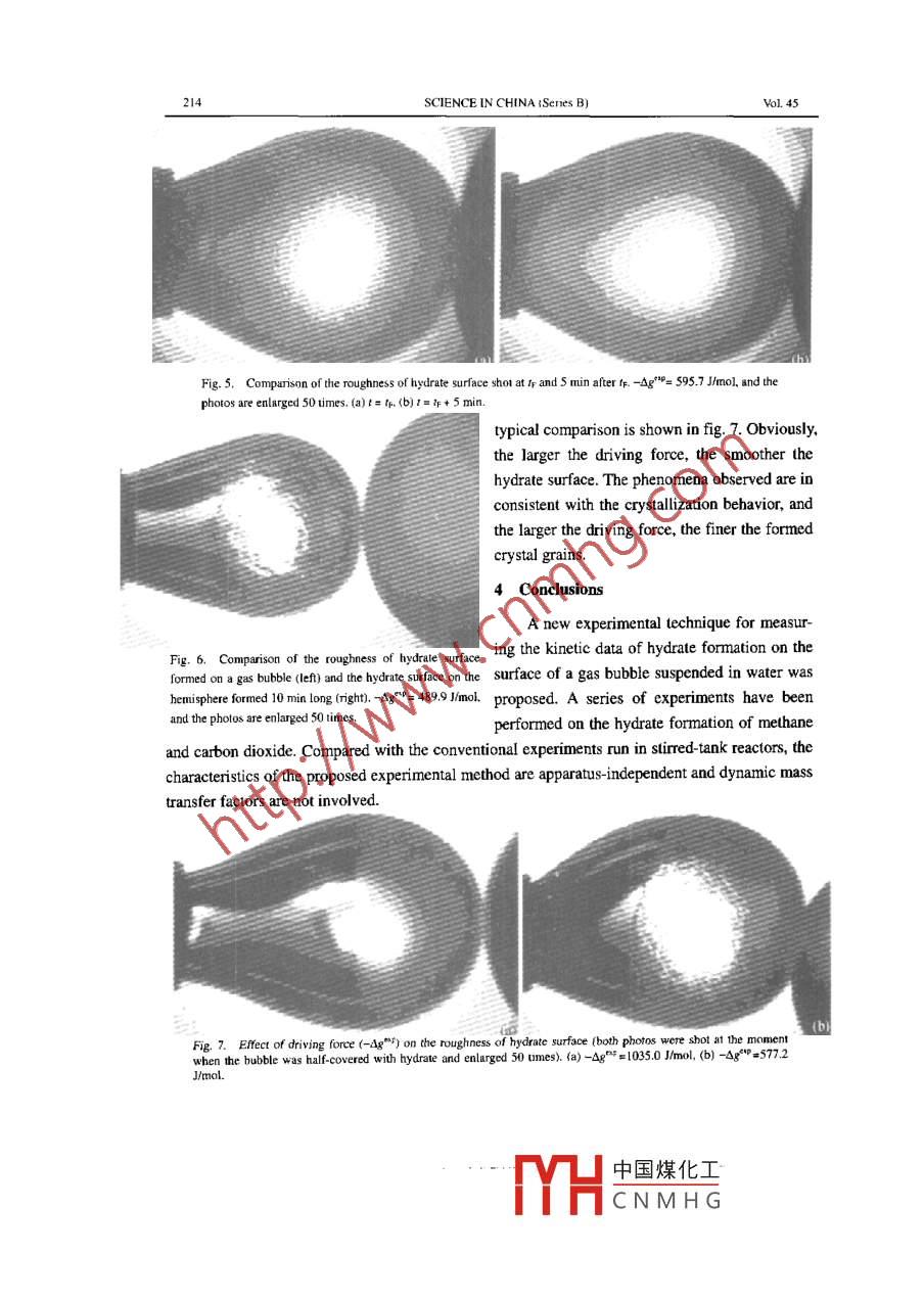 Vol 45 No. 2SCIENCE IN CHINA(Series B)April 2002Kinetics of hydrate formation using gas bubble suspended inwaterMA Changfeng(馬昌峰), CHEN Guangjin(陳光進(jìn))& GUO Tianmin(郭天民)High Pressure Fluid Phase Behavior& Property Research Laboratory. School of Chemical Engineering. University ofPetroleum, Beijing 102200, ChinaCorrespondence should be addressed to Ma Changfeng(email: machangfenge petrochina com.cn)Abstract An innovative experimental technique, which was devised to study the effects of tem-perature and pressure on the rate of hydrate formation at the surace of a gas bubble suspendedin a stagnant water phase, was adapted in this work. Under such conditions, the hydrate-growthprocess is free from dynamic mass transfer factors. the rate of hydrate formation of methane andcarbon dioxide has been systematically studied. The measured hydrate-growth data were corre-lated by using the molar Gibbs free energy as driving force. In the course of the experiments,Keywords: hydrate fornation, kineties, suspended gas bubble, methane, carbon dioxide.Hydrates are crystalline solid formed when water molecules link to form a clathrate structureunder suitable temperature and pressure conditions. The clathrate structure is thermodynamicallyunstable, but could be rendered stable by filling the cavities with small guest molecules( suchN2, CO2, CH, C2H and C3 Hg). At present, we have good knowledge about the thermodynamicsof hydrate formation, and abundant experimental data and extensively tested thermodynamic hydrate models are available!l-6l. Such models are, in general, capable of predicting the hydrate fornation texpressumwithOn the other hand, our knowledge of the kinetics of hydrate formation is still far from mature.The experimental data and kinetic models reported in the literature are often inconsistent. Hence,for obtaining a more comprehensive understanding of hydrate formation, the kinetics aspectshould be emphasized. Two consecutive phases are generally involved in the kinetics of hydrateformation. The first phase is the formation of the initial hydrate nuclei, and the second phase is thehydrate-growth process initiated from the formed nuclei. The first phase which is often called theinduction period, has been studied carefully only by few investigators 9. More attention wasgiven to the second phase-4. The experimental data and kinetic models presented by Englezoet al. 12. 13l and Skovborg 4l represent the most comprehensive studies on the kinetics of hydrate-growthMost of the reported experiments on hydrate-growth kinetics were performed under isother-mal and isobaric conditions in a semi-batch stied tank reactor with constant gas supply formaintaining the desired pressure. Since the geometric factors and agitation conditions of the reac-中國煤化工CNMHGNo. 2KINETICS OF HY DRATE FORMATION USING GAS BUBBLE SUSPENDED IN WATERtor affect the rate of hydrate formation, the data obtained are apparatus-dependent. We cannot expect consistent kinetic data to be obtained from different reactors used in various laboratoriesThis work was focused on the second phase. An innovative method was proposed to measurehe rate of hydrate-growth, which is independent of the factors aforementioned. The hydrate wasallowed to form at the gas-liquid interface of a gas bubble suspended in a stagnant water phase. Asthe surface area of a gas bubble can be calculated readily and the incipient point as well as the endpoint(when the bubble surface is fully covered by hydrates)of hydrate formation can be observedsharply, reliable hydrate-growth rate can thus be determined. The rate of methane and carbon dioxide hydrates formation has been systematically studied and the measured rate data were successfully correlated using the molar Gibbs free energy as driving force. Some interesting surfacephenomena were also observed in the course of our experiments1 Experimental1. 1 ApparatusThe JEFFRI pendant drop high-pressureinterfacial tension (IFT) apparatus manufactured by DBR Corporation (Canada)wasmodified and adapted for our purpose. Theschematic diagram of the experimental unit is12shown in fig. 1The revised optical system consists of azoom stereo microscope installed perpendicupressure cell, a high resolution Panasonicvideo camera and a PC computer. the recorded photographic data were processed us-This modification significantly improved the 13, Valves: 2, liquid sample cylinder: 3 and 8.presureS.9 anding the software developed by this laboratory. Fig. I. Schematic of the apparatus used in this study. Idata acquisition and processinI1, high-pressure cell: 12, video camera: 14, gas supply,The operating temperature was con- 15, computer and signal receiver.trolled by three Eurothermrature con-trollers with an average uncertainty of +O 1 K. All the pressure gauges were calibrated using astandard RUSKA dead-weight pressure gauge with an uncertainty of # 0. 25%The hydrate formation features observed in the high-pressure cell are schematically illustrated in fig. 2.1.2 ChemicalsChemical grade methane (99.99%)and carbon dioxide(99.9%)purchased from Beifen Gas中國煤化工CNMHGSCIENCE IN CHINA (Series BIndustry Corporation were used in the experiments1.3 Experimental procedure(i) Sweep the whole experimental system anddraw vacuumii)Charge water into the high-pressure win-dowed cell until- 3/4 volume of the cell is filled andmaintain the system at a desired temper(ii) Introduce a certain amount of gas into the celland raise the system pressure significantly higher thathe equilibrium hydrate formation pressure and allow aquantity of gas hydrate to be formed atop the waterFig. 2. Schematic of hydrate formation on thesurface of a gas bubble. 1, Water inlet: 2, hy(iv Discharge the gas and dissociate the hydratedrate-covered gas bubble atop the gas injection formed in step(iii), but keep the water with residualneedle:3. hydrate-covered hemisphere formed by astructure remaining in the cellwindowed cell; 6. gas phase: 7, hy