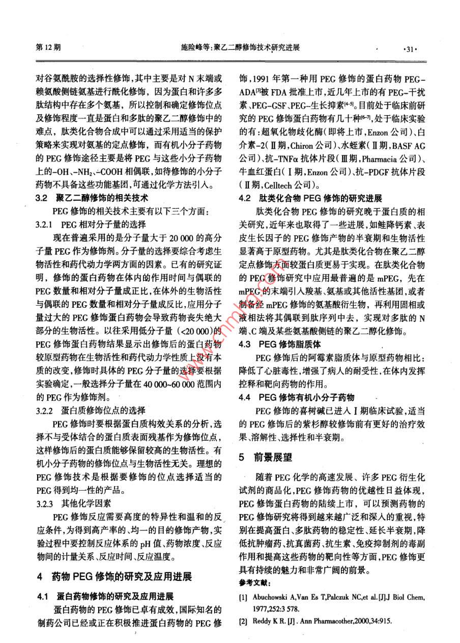 上海化工Vol32 No 12Shanghai Chemical Industry綜述聚乙二醇修飾技術(shù)研究進展施險峰詹家榮廖本仁上海華誼(集團)公司技術(shù)研究院(上海200333)摘要介紹了聚乙二醇修飾技術(shù)在蛋白質(zhì)和多肽類等藥物中的應用,論述了聚乙二醇修飾對蛋白質(zhì)和多肽類等藥物性質(zhì)的影響修飾技術(shù)在藥物研究中的應用。關(guān)鍵詞聚乙二醇修飾藥物蛋白質(zhì)多肽中圖分類號R9776;R9142化學藥物、蛋白質(zhì)藥物和多肽類藥物在產(chǎn)生作水動力學體積并且沒有免疫原性。當偶聯(lián)到藥物分用的同時,一般都存在自身無法克服的問題,如較短子或藥物表面時,可以將其優(yōu)良性質(zhì)賦予修飾后的的作用周期、較大的免疫原性及毒副作用。通過采用藥物分子,改變它們在水溶液中的生物分配行為和新型的聚乙二醇修飾及緩釋控釋技術(shù)( PEGylation,溶解性,在其修飾的藥物周圍產(chǎn)生空間屏障減少藥聚乙二醇化技術(shù)),可對現(xiàn)有的蛋白質(zhì)、多肽以及一物的酶解,避免在腎臟的代謝中很快消除,并使藥物些天然藥物成分做適合生理應用的改造,使其具有能被免疫系統(tǒng)的細胞識別。聚乙二醇類修飾劑的藥增長的生理半衰期降低的毒副作用,從而獲得更好物動力學性質(zhì)因它們的相對分子量和注射給藥方式的治療效果1977年, Abuchowski等首先應用聚乙而異,分子量越大,半衰期越長。經(jīng)過細胞色素P450二醇修飾藥物蛋白,結(jié)果修飾后的蛋白質(zhì)療效優(yōu)于系統(tǒng)的氧化作用,PEG分解成小分子PEG,經(jīng)膽汁未修飾的原型藥物。蛋白質(zhì)和多肽類藥物的聚乙二排泄。醇修飾技術(shù)已成為藥物化學修飾研究領(lǐng)域的熱點四。3聚乙二醇修飾及相關(guān)技術(shù)1聚乙二醇(PEG)的分子特性31藥物的聚乙二醇修飾聚乙二醇(PEG)是經(jīng)環(huán)氧乙烷聚合而成的,由重藥物的聚乙二醇修飾即PEG化,是將活化的聚復的氧乙烯基組成。PEG不僅具有良好的水溶性也乙二醇通過化學方法偶聯(lián)到蛋白、多肽、小分子有機能溶于二氯甲烷、NN-二甲基甲酰胺、苯、乙腈和乙藥物和脂質(zhì)體上。其中研究得最多的是蛋白質(zhì)的醇等有機溶劑,具有線性(相對分子量5000~30000)PEG修飾始于20世紀70年代。藥物經(jīng)PEG修飾或支化(相對分子量40000~60000)的鏈狀結(jié)構(gòu)線后,往往會具有以下優(yōu)點:(1)更長的半衰期;(2)較性PEG分子式為H-(0-CH2-CHl2-OH普通的聚乙低的最大血藥濃度;(3)血藥濃度波動較小;(4)較二醇兩端各有一個羥基,若一端以甲基封閉則可得少的酶降解作用;(5)較少的免疫原性及抗原性;(6)到甲氧基聚乙二醇(mPEG),線性mPEG的分子式較小的毒性;(7)更好的溶解性;(8)用藥頻率減少;為CH-(-CH2-CH2)-OH,在多肽和蛋白質(zhì)的聚乙(9)提高病人的依從性提高生活質(zhì)量降低治療費二醇化修飾研究中應用最多的是mPEG的衍生物。用;(10)脂質(zhì)體對腫瘤有更強的被動靶向作用。2聚乙二醇的生理特性修飾途徑對蛋白和多肽主要有氨基修飾(包括N端氨基的?;揎?、賴氨酸側(cè)鏈氨基的?;揎椌垡叶际侵行?、無毒且具有獨特理化性質(zhì)和N端氨基的烷基化修飾)羧基修飾、巰基修飾,還有良好生物相溶性的高分子聚合物也是經(jīng)FDA批準其他如控制pH實現(xiàn)SC-mPG選擇性修飾蛋白質(zhì)的極少數(shù)能作為體內(nèi)注射藥用的合成聚合物之一。中的組氨酸側(cè)鏈的咪唑基團和用谷氨酰胺轉(zhuǎn)氨酶將聚乙二醇具有高度的親水性,在水溶液中有較大的 mPEG-NH2轉(zhuǎn)移到蛋白質(zhì)的谷氨酰胺側(cè)鏈上,實現(xiàn)科委項目:上海市2005年度青年科技啟明星計劃(05QMB1418)第一作者簡介:施險峰男1976年生工程師工學碩士主要從事醫(yī)藥中間體的研發(fā)工作第12期施險峰等:聚乙二醇修飾技術(shù)研究進展31對谷氨酰胺的選擇性修飾,其中主要是對N末端或飾,1991年第一種用PEG修飾的蛋白藥物PEG賴氨酸側(cè)鏈氨基進行?;揎?因為蛋白和許多多ADA四被FDA批準上市近幾年上市的有PEG干擾肽結(jié)構(gòu)中存在多個氨基,所以控制和確定修飾位點素、PEG-GSF、PEG生長抑素5。目前處于臨床前研及修飾程度一直是蛋白和多肽的聚乙二醇修飾中的究的PEG修飾蛋白藥物有幾十種,處于臨床實驗難點,肽類化合物合成中可以通過采用適當?shù)谋Wo的有:超氧化物歧化酶(即將上市, Enzon公司)、白策略來實現(xiàn)對氨基的定點修飾,而有機小分子藥物介素-2(Ⅱ期, Chiron公司)、水蛭素(Ⅱ期, BASF AG的PEG修飾途徑主要是將PEG與這些小分子藥物公司)抗TNFa抗體片段(Ⅲ期, Pharmacia公司)、上的-OH、-NH2-COOH相偶聯(lián),如待修飾的小分子牛血紅蛋白(I期, Enzon公司)抗-PDGF抗體片段藥物不具備這些功能基團,可通過化學方法引入(Ⅱ期, Celltech公司)。32聚乙二醇修飾的相關(guān)技術(shù)4.2肽類化合物PEG修飾的研究進展PEG修飾的相關(guān)技術(shù)主要有以下三個方面肽類化合物PEG修飾的研究晚于蛋白質(zhì)的相321PEG相對分子量的選擇關(guān)研究,近年來也取得了一些進展,如鮭降鈣素、表現(xiàn)在普遍采用的是分子量大于20000的高分皮生長因子的PEG修飾產(chǎn)物的半衰期和生物活性子量PEG作為修飾劑。分子量的選擇要綜合考慮生顯著高于原型藥物。尤其是肽類化合物在聚乙二醇物活性和藥代動力學兩方面的因素。已有的研究證定點修飾方面較蛋白質(zhì)更易于實現(xiàn)。在