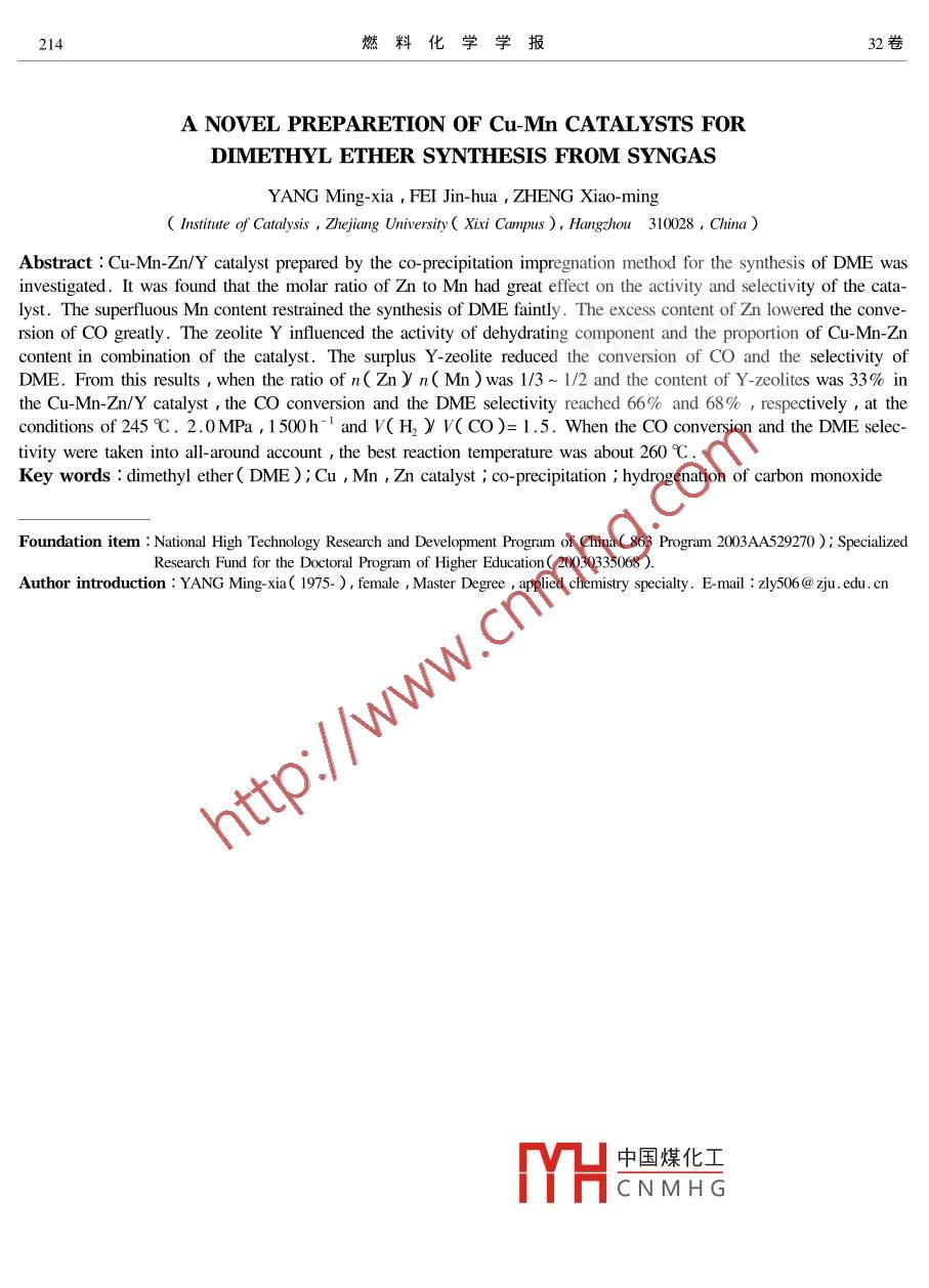 第32卷第2期燃料化學(xué)學(xué)報Vol 322004年4月JOURNAL OF FUEL CHEMISTRY AND TECHNOLOGYApr.2004文章編號:0253-240X2004)2021005共沉淀浸漬法制備由合成氣直接合成二甲醚的Cu-Mn催化劑楊明霞,費金華,鄭小明浙江大學(xué)催化研究所,浙江杭州310028)摘要:采用共沉淀浸漬法制備了直接合成二甲醚的Cuμ-MnZm催化劑通過對組成成分及其配比的研究發(fā)現(xiàn)Cu含量一定的條件下,n(Znyn(Mn)爾比對催化劑性能有較大的影響當(dāng)n(Znyn(Mn)=1/3~1/2時催化劑對CO的轉(zhuǎn)化率和對二甲醚的選擇性達(dá)到最佳分別為53.6%和63.5%洳如錳添加比例過大對催化劑催化合成二甲醚有微弱抑制添加鋅比例過大會大大降低CO的轉(zhuǎn)化率。載體Y分子篩的含量對催化劑性能也有影響用量過大將降低催化劑的活性和對二甲醚的選擇性當(dāng)其含量為33%時催化劑上C轉(zhuǎn)化率和選擇性可分別達(dá)到66%和68%且催化劑活性隨分子篩含量減少不再有明顯的變化。關(guān)鍵詞:二甲醚;Cu-Mn加m催化劑;共沉淀浸漬法;CO加氫中圖分類號:0643文獻(xiàn)標(biāo)識碼:A近年來二甲醚的應(yīng)用更加廣泛除了本身可用4h壓片成型破碎過篩取20目~40目備用。作冷凍劑、溶劑、萃取劑、氣霧劑和推進(jìn)劑等還可作1.2催化劑活性評價催化劑反應(yīng)性能評價在為有機(jī)化工的原料以及潛在的柴油潔浄替代燃料MRCs8O4高壓微反色譜系統(tǒng)上進(jìn)行。催化劑裝填和民用燃料。澘在的大市場吸引人們不斷研究探索量為2.0m(約2g)反應(yīng)前催化劑在常壓下用氫氣更好的合成二甲醚的方法和催化劑。目前,由CO在275℃還原3h然后降溫、切換成還原氣并充壓至加H直接合成二甲醚是國內(nèi)外研究的熱點之一其實驗所需壓力反應(yīng)穩(wěn)定后進(jìn)行活性評價反應(yīng)產(chǎn)物成功的關(guān)鍵在于催化劑。在已報道的文獻(xiàn)和專由HP5890-Ⅱ色譜儀在線分析熱導(dǎo)檢測器。典型利1-中大多是將合成甲醇的催化劑和具有酸性反應(yīng)條件溫度245℃壓力2.0MPa原料氣摩爾比的脫水劑通過一定的制備方法制得催化劑中起合n(H2yn(O)=3/2空速1500h。成甲醇作用的活性組分主要有Cuhn、Mn和等,2結(jié)果與討論脫水劑主要有y-A2O3和分子篩2.1催化劑組成和比例的影響結(jié)合已開發(fā)成功的負(fù)載型Cu-MnZm/y-Al2O3催2.1.1組成的影響首先考察Cu,Mn,Zn三種組化劑的特點采用活性組分與分子篩脫水劑共沉分的不同組合對二甲醚合成反應(yīng)的影響包括單組淀漫漬的制備方法對銅錳基催化劑進(jìn)行了改進(jìn)研分體系、雙組分體系和三組分體系三種情況實驗結(jié)制更高效的新型Cu-Mnn/Y催化劑體系。該催化果見表1。劑體系最突出的優(yōu)點就是比Cu-Mnn/y-Al2O3催化由表1可見在單組分的 Cu-Y,Mn-Y和ZnY催劑反應(yīng)溫度更低反應(yīng)條件更溫和?;瘎┲兄挥蠧u-Y具有一氧化碳加氫活性但活性實驗部分很低CO轉(zhuǎn)化率僅為7.66%產(chǎn)物主要為烴類。添11催化劑的制備按照一定比例配硝酸銅、硝酸加Mn后在雙組分Cm-MnY催化劑上,CO轉(zhuǎn)化率錳及硝酸鋅的混合溶液A以1.0mM碳酸氫銨溶從7.6%增加到25.6%二甲醚和甲醇的選擇性卻液為沉淀劑B準(zhǔn)備好盛有Y型分子篩懸浮液C的下降,總烴類選擇性大幅減少(從60.5%降至燒杯然后在攪拌的條件下用并流共沉淀法將混合39.21%)而二氧化碳選擇性大大升高:添加h溶液A與沉淀劑B滴入置于60℃恒溫水浴中的裝后在雙組分的Cuh-Y催化劑上,CO轉(zhuǎn)化率從有懸浮液C的燒杯中控制pH值為6.0~7.0。滴7定結(jié)束后靜置老化洗滌抽濾干燥在500℃焙燒大幅YHa中國煤化工醚的選擇性從5.83%CNMH《擇性降至32.22%烴收稿日期:2003-07-07;修回日期:2004-01-16基金項目:國家高技術(shù)研究發(fā)展計劃項目(863計劃項目ⅹ2003A529270)高等學(xué)校博士學(xué)科點專項科研基金20030335068作者簡介萬喃辣75-)女江西南昌人頑士應(yīng)用化學(xué)專業(yè)。Eml:50m,ch,m期楊明霞等:共沉淀浸漬法制備由合成氣直接合成二甲醚的Cu-Mn催化劑211類迅速減從60.55%減少至8.28%)同時添加能力抑制了CO的深度加H,Mn和Z共同添加Mn和zn后在三組分的Cu-Mn-Zm-Y催化劑上CO形成銅錳鋅三組分協(xié)同作用的新體系不但最大程轉(zhuǎn)化率提高到53.64%,二甲醚的選擇性迅速增加度提高了CO的轉(zhuǎn)化率而且也使二甲醚的選擇性到63.46%而CO2的選擇性則降至31.47%烴類獲得了最大程度的提高。因此由共沉淀浸漬法制降至5.07%。上述結(jié)果表明銅是合成甲醇的活性備的Cu-Mn-Zm-Y分子篩催化體系Mhn和Zhn的協(xié)同中心錳的添加主要增加了CO加H2生成C烴類作用能顯著提高催化劑對CO加H2一步合成二甲的能力同時也增強(qiáng)了ωO水氣變換的能力滓鋅的添醚催化性能加增強(qiáng)了CO加H,生成二甲醚及CO水氣變換的表1活性組分不同組合對反應(yīng)結(jié)果的影響Table 1 Effect of Cu, Mn, Zn combination on activity and selectivity of catalystConversion of COSelectivity s/%0CatalystDMEH, OH CO,5.8310.8922.713.613.8245,487.64Mn-y00Zu-Y0traceCu-Mn-Y1.501.8257.461.284.408.4325Cu-Zn-Y31.3156.153,3532.221.05,420Cu-Mn-Zn-Yreaction condition: pressure 2.0 MPa; temperature 245C GHSV 1 500h n(h y n(Co )=3/22.1.2鋅錳摩爾比的影響從表1數(shù)據(jù)可以看出,變的條件下本文考察了n(ZnYn(Mn)摩爾比對三組分的Cu-Mn--Y反應(yīng)活性遠(yuǎn)遠(yuǎn)優(yōu)于單組分和催化劑的活性和選擇性的影響結(jié)果見表2。雙組分的組合。在銅的負(fù)載量和鋅錳的