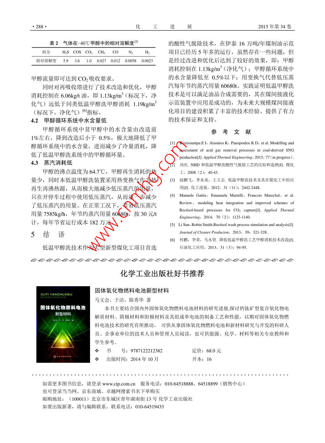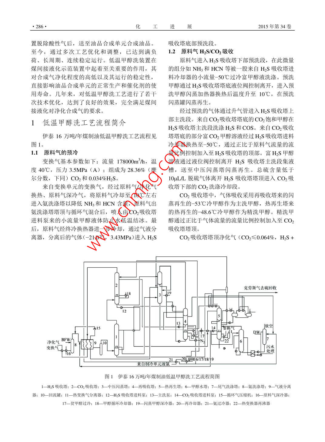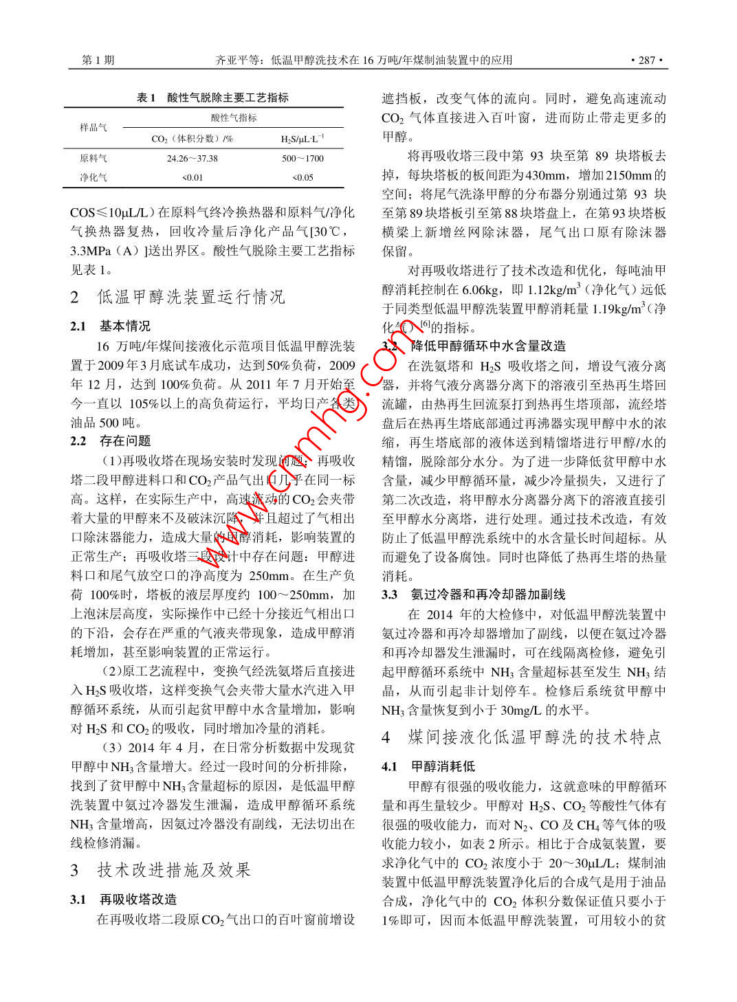 化工進(jìn)展2015年第34卷第1期CHEMICAL INDUSTRY AND ENGINEERING PROGRESS285·應(yīng)用技術(shù)低溫甲醇洗技術(shù)在16萬噸/年煤制油裝置中的應(yīng)用齊亞平,張培忠,于化龍(內(nèi)蒙古伊泰煤制油有限責(zé)任公司,內(nèi)蒙古鄂爾多斯0103000摘要:介紹了伊泰16萬噸/年煤制油示范項(xiàng)目中低溫甲醇洗工芑的應(yīng)用情況,闡述了該工藝在安裝和運(yùn)行中存在的問題以及改進(jìn)措施。運(yùn)行結(jié)果顯示,改造效果較好,甲醇消耗控制在1.13kg/m3,系統(tǒng)中的水含量降低至0.5%以下,用變換氣代替低壓蒸汽毎年節(jié)約蒸汽用量6680t。分析了該工芑流程的特點(diǎn)。實(shí)踐證眀該工藝先進(jìn)成熟,凈化度高且凈化氣質(zhì)量穩(wěn)定,能夠滿足生產(chǎn)需要,在煤炭間接液化示范裝置中的應(yīng)用是成功的關(guān)鍵詞:煤制油;低溫甲醇洗;合成氣凈化;酸性氣脫除中圖分類號(hào):F42672文獻(xiàn)標(biāo)志碼:A文章編號(hào):1000-6613(2015)01-0285-04DOI:10.16085/issn.1000-6613.2015.01.050Application of Rectisol wash process in 160000 t/a coal to liquids plantQl Yaping, ZHANG Peizhong, YU Hualong( Inner mongolia Yitai Coal to Liquids Co, Ltd, Erdos 010300, Inner Mongolia, ChinaAbstract: Application of Rectisol wash process in the Yitai 160000 t/a coal to liquids demonstrationproject is introduced. The problems of installation and operation, and the improvement measures arepresented. Operation results show that good improvement is achieved, methanol consumption iscontrolled at 1. 13kg/m, water content is reduced to less than 0.5%, shift gas instead of low pressuresteam saves steam consumption by 60680 t/a. The characteristics of the technological process isanalyzed. Application of the Rectisol wash process in indirect coal liquefaction demonstration plant issuccessful. It is an advanced process with high degree of purification and stable quality of purified gasKey words: coal to liquids; Rectisol; coal gas purification; sour gas removal低溫甲醇洗( Rectisol)工藝是20世紀(jì)50年代油等氣體凈化裝置中4。隨著我國現(xiàn)代煤化工的初由德國林德( Linde)公司和魯奇( Lurgi)公司發(fā)展,低溫甲醇洗工藝裝置逐漸向大型化、節(jié)約聯(lián)合開發(fā)的一種用于高濃度酸性氣體的凈化工藝?;?環(huán)境友好型發(fā)展,成為現(xiàn)代新型煤化工特別是與聚乙二醇二甲醚法( Selexol)、N甲基吡咯烷酮大型煤化工裝置的首選凈化工藝。法( Purisol)等酸性氣物理吸收工藝相比,采用低內(nèi)蒙古伊泰煤制油有限責(zé)任公司16萬噸/年煤溫甲醇洗工藝具有氣體凈化度高、選擇性好,并且間接液化示范項(xiàng)目于2006年5月開工建設(shè),2009可濃縮HS氣體做為克勞斯( Claus)硫回收原料氣年3月20日首次投料試車成功,打通了全部流程,同時(shí)副產(chǎn)高純度CO2氣體等特點(diǎn)2。1953年,在2009年3月27日順利產(chǎn)出我國煤間接液化工業(yè)化南非 Sasol建成第一個(gè)用于處理魯奇( Lurgi)加壓第一桶合格成品油。主要工藝過程為:以煤為原氣化制煤氣的工業(yè)規(guī)模示范裝置。20世紀(jì)70年代料,水煤漿加壓氣化產(chǎn)生的粗煤氣經(jīng)中溫耐硫變換末,我國引進(jìn)了三套由林德( Linde)設(shè)計(jì)的低溫甲單元部分變換,調(diào)節(jié)H2/CO比后,經(jīng)低溫甲醇洗裝醇洗裝置。隨著工藝的不斷優(yōu)化和改進(jìn),低溫甲醇收稿日期:2014-10-17:修改稿日期:2014-10-2洗工藝被廣泛應(yīng)用于國內(nèi)外合成氨、城市煤氣、工第一作者:齊亞平(196-),男,高級(jí)工程師,從事企業(yè)管理、煤化業(yè)制氫、甲醇合成、煤制天然氣、煤制烯烴、煤制工技術(shù)革新與突破、生產(chǎn)運(yùn)行管理工作286·化工進(jìn)展2015年第34卷置脫除酸性氣后,送至油品合成單元合成油品。吸收塔底部預(yù)洗段。至今,通過多次工藝優(yōu)化和調(diào)整,已達(dá)到滿負(fù)12原料氣H2SCO2吸收荷、長周期、連續(xù)穩(wěn)定運(yùn)行。低溫甲醇洗裝置在原料氣進(jìn)入H3S吸收塔下部預(yù)洗段,在此微量煤間接液化示范裝置中起著至關(guān)重要的作用,其的組分如NH3和HCN等被一股來自H2S吸收塔進(jìn)對(duì)合成氣凈化程度的高低以及其運(yùn)行的穩(wěn)定性料冷卻器的小流量-50℃過冷富甲醇液洗滌。預(yù)洗直接影響油品合成單元的正常生產(chǎn)和催化劑的使甲醇通過H2S吸收塔塔底液位閥控制離開,進(jìn)入預(yù)用壽命。幾年來,對(duì)低溫甲醇洗工藝進(jìn)行了若干洗甲醇閃蒸加熱器換熱后溫度升至10℃,在預(yù)洗次技術(shù)優(yōu)化,達(dá)到了良好的效果,完全滿足煤間閃蒸罐閃蒸再生接液化對(duì)凈化合成氣的要求經(jīng)過預(yù)洗的氣體通過升氣管進(jìn)入H2S吸收塔上低溫甲醇洗工藝流程簡(jiǎn)介部主洗段。來自CO2吸收塔塔底的CO2飽和甲醇在H2S吸收塔主洗段洗滌H2S和COS。來自CO2吸收伊泰16萬噸/年煤制油低溫甲醇洗工藝流程見塔塔底的部分富CO2甲醇溶液經(jīng)過HS吸收塔進(jìn)料圖1。冷卻器換熱至-50℃,通過正比于原料氣流量的流1.1原料氣的預(yù)冷量比例控制加入至H2S吸收塔的頂部。富H2S甲醇變換氣基本參數(shù)如下:流量178000m/h,溫溶液通過液位閥控制離開H2S吸收塔主洗段集液度40℃,壓力3.sMPa(A);組成為28.36‰(摩糟,送至中壓閃蒸塔閃蒸再生??偭蚝康陀跔柗?jǐn)?shù),下同)CO2和0.034%H2S10u幾脫硫氣體離開H2S吸收塔塔頂進(jìn)入CO2吸來自變換單元的變換氣,經(jīng)過原料氣凈化氣收塔下部的CO2洗滌冷卻