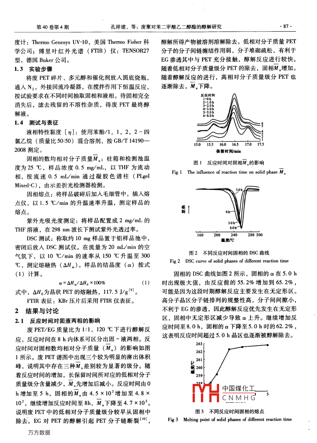 塑料工業(yè)第40卷第4期CHINA PLASTICS INDUSTRY2012年4月廢聚對(duì)苯二甲酸乙二醇酯的醇解研究孔祥建,張之鶴(1.成都理工大學(xué)材料與化學(xué)化工學(xué)院,四川成都610059;2.樂(lè)山師范學(xué)院數(shù)學(xué)與信息科學(xué)學(xué)院,四川樂(lè)山614004)摘要:研究了醇解條件對(duì)廢聚對(duì)苯二甲酸乙二醇酯(PET)醇解過(guò)程的影響,并通過(guò)凝膠滲透色譜、差示掃描量、紅外光譜、紫外分光光度儀、黏度計(jì)等多種測(cè)試手段對(duì)醇解產(chǎn)物進(jìn)行了表征。研究表明:隨著反應(yīng)時(shí)間的增加固相的數(shù)均相對(duì)分子質(zhì)量、結(jié)品度先增加后下降;醇解液的特性黏度[η]增加,紫外光透過(guò)率下降。固相完全消失后繼續(xù)延長(zhǎng)反應(yīng)時(shí)間,醇解液的[η]變化不大。在實(shí)驗(yàn)條件下,多元醇醇解廢PET的反應(yīng)活性大小順序?yàn)橐叶?丙二醇>甘油。關(guān)鍵詞:聚對(duì)苯二甲酸乙二醇酯;醇解;聚酯中圖分類號(hào):TQ320.2文獻(xiàn)標(biāo)識(shí)碼:A文章編號(hào):1005-5770(2012)04-0086-05Study on Alcoholysis of Waste PETKONG Xiang-jian, ZHANG Zhi-he2(1. College of Materials, Chemistry and Chemical Engineering, Chengdu University of TechnologyChengdu 610059, China;2. College of Mathematics and Information Science, Leshan Normal University, Leshan 614000, China)Abstract: The influences of alcoholysis conditions for waste poly(ethylene terephthalate )(PET)onthe intrinsic viscosity of the glycolysis products were studied, and the products were characterized by manymethods. The results showed that the number-average molecular weight and the crystallinity of the solid phaseof waste Pet increased firstly and then decreased, the intrinsic viscosity of liquid phase [n] increased andUV transmittance decreased with the increasing of reaction time. Under the experiment conditions, the reac-tivity order of different glycols was ethylene glycol >propylene glycol >glycerolKeywords: PET; Alcoholysis; Polyester隨著聚對(duì)苯二甲酸乙二醇酯(PET)產(chǎn)量和消費(fèi)產(chǎn)物特性的影響量的不斷增加,回收利用廢PET,實(shí)現(xiàn)環(huán)境保護(hù)和資1試驗(yàn)部分源循環(huán)利用的任務(wù)已日趨緊迫。PET的回收方法分為1.1主要原料物理回收法和化學(xué)降解法1-2?;瘜W(xué)降解法中醇解廢PET:透明PET飲料瓶,剪成0.5·cm×0.5法發(fā)展前景良好1“,PET的醇解產(chǎn)物可廣泛用作聚cm的薄片,用丙酮清洗后干燥備用;丙二醇(PG)、酯、聚氨酯、增塑劑的合成中間體。研究Pr乙二醇(EG)、丁二醇(BG)、甘油(Cy):分析的醇解反應(yīng)過(guò)程,探討工藝條件與產(chǎn)物結(jié)構(gòu)的關(guān)系對(duì)純,成都科龍化工試劑廠;乙酸鋅(ZnAc2):分析于研究Pr醇解反應(yīng)機(jī)理,調(diào)控醇解產(chǎn)物分子結(jié)構(gòu)純,天津市大茂化學(xué)試劑廠。都具有重要意義。以往的研究偏重于反應(yīng)條件對(duì)PET1.2主要儀器設(shè)備醇解產(chǎn)物的影響,但是對(duì)于PET分子結(jié)構(gòu)在醇解過(guò)烏氏黏度計(jì):毛細(xì)管徑0.8mm,成都玻璃儀器程如何變化少有探討。另外,先前的報(bào)道多以PET廠;凝膠滲透色譜(GPC):1200系列,美國(guó)安捷倫新料為研究對(duì)象,關(guān)于廢PET醇解研究的專題報(bào)道公司;數(shù)字熔點(diǎn)儀:WRS-IB型,上海精密科學(xué)儀器相對(duì)較少。本文以廢PET為對(duì)象,采用多種手段對(duì)有限公司;差示掃描量熱(DSC)儀: NETZSCH其醇解過(guò)程及醇解產(chǎn)物予以測(cè)試表征。探討PET分sTA409中國(guó)煤化工公司;紫外分光光子結(jié)構(gòu)隨醇解反應(yīng)過(guò)程的變化,以及反應(yīng)條件對(duì)醇解CNMHG聯(lián)系人xjkongt915@yahoo.cn作者簡(jiǎn)介:孔祥建,男,1977年出生,博士,講師,從事高分子化學(xué)與物理方面的研究。第40卷第4期孔祥建,等:廢聚對(duì)苯二甲酸乙二醇酯的醇解研究87度計(jì): Thermo Genesys UV-10,美國(guó) Thermo Fisher科醇解所得產(chǎn)物被溶劑溶解除去。低相對(duì)分子質(zhì)量PET學(xué)公司;傅里葉紅外光譜(rTIR)儀: TENSOR27分子的分子間鏈纏結(jié)作用弱,分子堆砌疏松,有利于型,德國(guó) Buker公司。EG滲透其中與PET充分接觸,醇解反應(yīng)進(jìn)行較快。1.3實(shí)驗(yàn)步驟隨著低相對(duì)分子質(zhì)量級(jí)分PET的除去,固相M增加將廢PET碎片、多元醇和催化劑放入圓底燒瓶,隨著醇解反應(yīng)的進(jìn)行,高相對(duì)分子質(zhì)量級(jí)分PET也通入N2,外接回流冷凝器,在攪拌作用下恒溫反應(yīng),逐漸除去,M下降。按試驗(yàn)要求在不同時(shí)間抽取固相和液相。待固相完全反應(yīng)時(shí)間消失后,濾去殘留的不溶性雜質(zhì),得廢PET最終醇3-2.0解液。1.4測(cè)試與表征液相特性黏度[η]:使用苯酚/1,1,2,2-四氯乙烷(質(zhì)量比50:50)混合溶劑,按GB/T1419015015516016.51701752008測(cè)定。保留時(shí)間/min固相的數(shù)均相對(duì)分子質(zhì)量Mn柱箱和檢測(cè)池溫圖1反應(yīng)時(shí)間對(duì)固相M的影響度為25℃,樣品濃度0.5mg/mL,以THF為流動(dòng)相,按流速0.5mL/min通過(guò)凝膠色譜柱(PIelMied-C),由示差折光檢測(cè)器檢測(cè)。固相熔點(diǎn):將樣品破碎后加入毛細(xì)管中,插人熔點(diǎn)儀,以1.5℃/min的升溫速率升溫,測(cè)定樣品的熔點(diǎn)。紫外光吸光度測(cè)定:將樣品配置成2mg/mL的3.0THF溶液,在298m波長(zhǎng)下測(cè)試紫外光透過(guò)率。DSC測(cè)試:稱取約10mg樣品置于鋁樣品池中2803