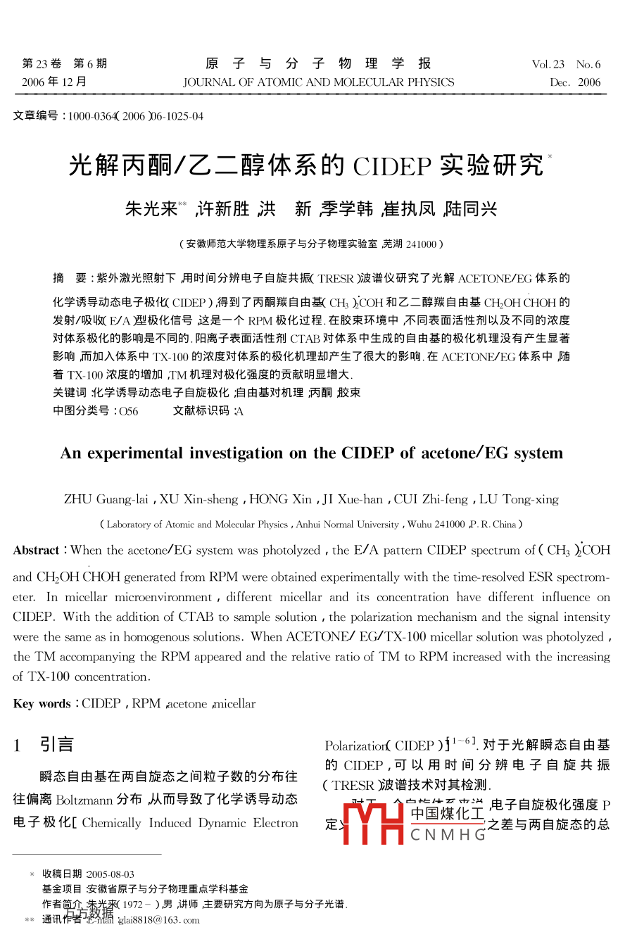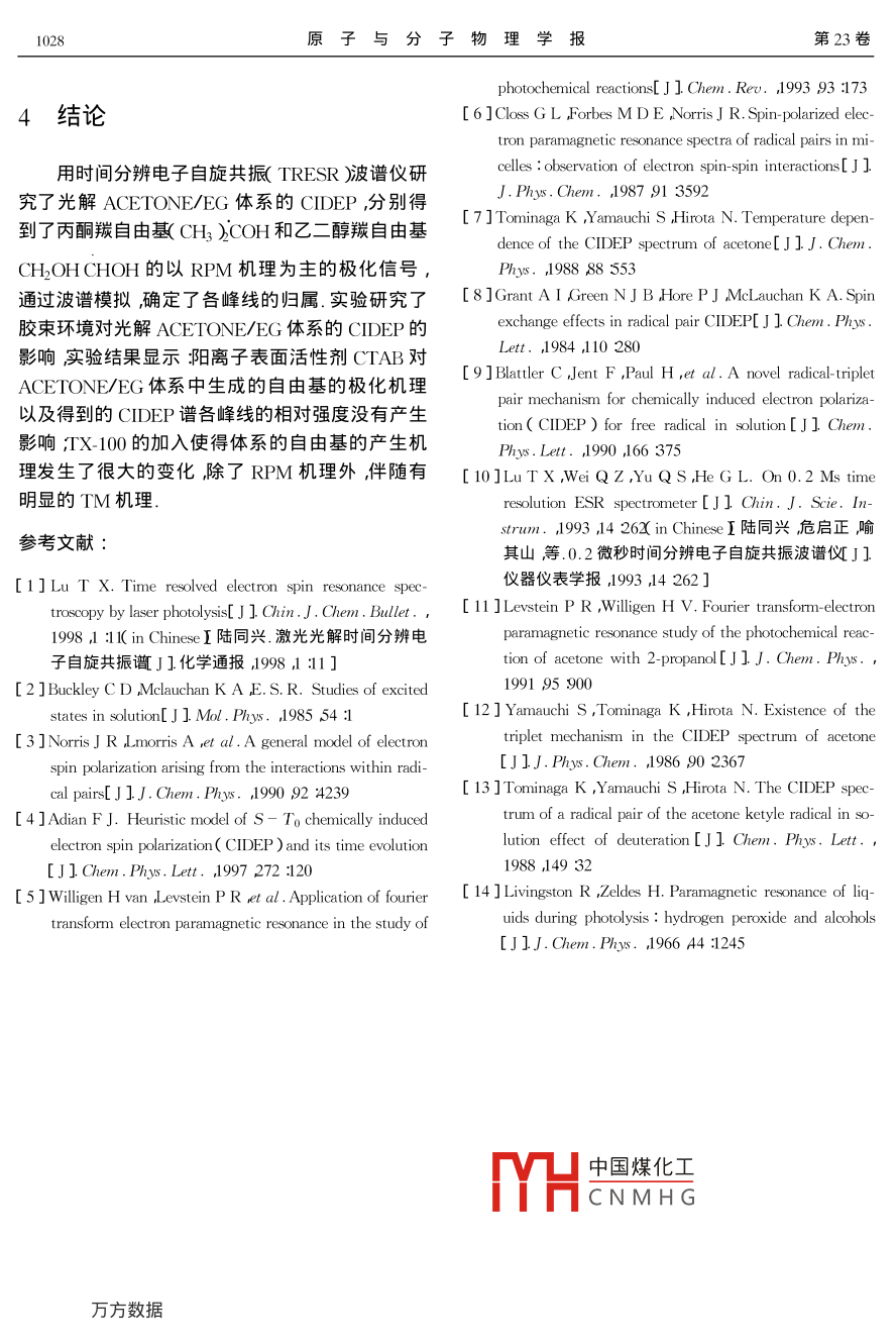 第23卷第6期原子與分子物理學(xué)報(bào)2006年12月JOURNAL OF ATOMIC AND MOLECULAR PHYSICSDeC.2006文章編號(hào):1000364200606-1025-04光解丙酮/乙二醇體系的 CIDEP實(shí)驗(yàn)研究朱光來(lái)”許新勝洪新季學(xué)韓崔執(zhí)鳳陸同興安徽師范大學(xué)物理系原子與分子物理實(shí)驗(yàn)室蕪湖241000摘要:紫外激光照射下用時(shí)間分辨電子自旋共振( TRESR)波譜儀研究了光解 ACETONE/EG體系的化學(xué)誘導(dǎo)動(dòng)態(tài)電子極做 CIDEP)得到了丙酮羰自由基CH3)COH和乙二醇羰自由基CH2 OH CHOH的發(fā)射/吸收E/A型極化信號(hào)這是一個(gè)RPM極化過(guò)程.在膠束環(huán)境中不同表面活性劑以及不同的濃度對(duì)體系極化的影響是不同的陽(yáng)離子表面活性劑CIAB對(duì)體系中生成的自由基的極化機(jī)理沒(méi)有產(chǎn)生顯著影響而加入體系中TX-100的濃度對(duì)體系的極化機(jī)理卻產(chǎn)生了很大的影響在 ACETONE/EG體系中隨著TX-100濃度的增加,TM機(jī)理對(duì)極化強(qiáng)度的貢獻(xiàn)明顯增大關(guān)鍵詞北化學(xué)誘導(dǎo)動(dòng)態(tài)電孑自旋極化自由基對(duì)機(jī)理丙酮膠束中圖分類(lèi)號(hào):O56文獻(xiàn)標(biāo)識(shí)碼An experimental investigation on the Cidep of acetone/EG systemZHU Guang-lai, XU Xin-sheng, HONG Xin JI Xue-han CUI Zhi-feng, LU Tong-xingLaboratory of Atomic and Molecular Physics Anhui Normal University Wuhu 241000PR ChinaAbstract: When the acetone/EG system was photolyzed, the E/A pattern CIDEP spectrum of( CH3 )COHand CH,OH CHOH generated from RPM were obtained experimentally with the time-resolved ESR spectrometer. In micellar microenvironment, different micellar and its concentration have different influence onCIDEP. With the addition of Ctab to sample solution the polarization mechanism and the signal intensitywere the same as in homogenous solutions. When ACeToNE/ EG/TX-100 micellar solution was photolyzedthe tm accompanying the rPm appeared and the relative ratio of tm to RPM increased with the increasingof tx-100 concentrationKey words: CIDEP, RPM acetone micellar1引言Polarization( CIDEP)j-61對(duì)于光解瞬態(tài)自由基的 CIDEP,可以用時(shí)間分辨電子自旋共振瞬態(tài)自由基在兩自旋態(tài)之間粒子數(shù)的分布往( TRESR)波譜技術(shù)對(duì)其檢測(cè)往偏離 Boltzman分布從而導(dǎo)致了化學(xué)誘導(dǎo)動(dòng)態(tài)電子極化[ Chemically Induced Dynamic Electron定YH中國(guó)煤化了電子自旋極化強(qiáng)度P之差與兩自旋態(tài)的總CNMHG收稿日期20050803基金項(xiàng)目安徽省原子與分子物理重點(diǎn)學(xué)科基金作者簡(jiǎn)1972-)男講師主要研究方向?yàn)樵优c分子光譜通訊作者ai8818@163.com1026原子與分子物理學(xué)報(bào)第23卷布居數(shù)的比115 mjP(NB-Na)實(shí)驗(yàn)中輸入到樣品諧振腔的微波功率≤」mW約為4mW.在記錄 CIDEP的磁場(chǎng)譜時(shí)Box-式中N和N分別為上、下 Zeeman能級(jí)上的粒子ar平均器取樣門(mén)的門(mén)寬一般取為0.3~0.4ps根數(shù).P為正時(shí) CIDEP譜為吸收譜,P為負(fù)時(shí),據(jù)所需測(cè)量時(shí)刻的要求 Boxcar的取樣門(mén)相對(duì)于激CIDEP譜為發(fā)射譜光激發(fā)時(shí)刻的延時(shí)在0.4~2s范圍內(nèi)變化對(duì)激光光解丙酮自由基的研究文獻(xiàn)主要報(bào)道實(shí)驗(yàn)中所用的丙酮、乙二醇試劑均為分析純了丙酮/醇類(lèi)體系,特別是丙酮/異丙醇體系的所用表面活性劑為xTAB(+六烷基三甲基溴化究證實(shí)了在丙酮/異丙醇體系中產(chǎn)生的極化信號(hào)醚onX100(7X100,辛基苯基聚氧乙烯CIDEP研究791-13 Seigo yamauchi12等人研銨),T以S-T。態(tài)混合的RPM機(jī)理為主但在適當(dāng)?shù)臐舛群蜏囟认掳殡S有一定比例的TM機(jī)理的貢3實(shí)驗(yàn)結(jié)果與討論獻(xiàn). Keisuke tominaga研究小組7詳細(xì)研究了丙酮羰自由基CH3COH的極化信號(hào)與溫度的關(guān)系.3.1 ACETONE/EG體系他們研究從室溫到-90℃范圍內(nèi),S-TM總是純乙二醇或丙酮經(jīng)激光照射沒(méi)有ESR共振占主導(dǎo)地位但是在-45℃以下,TM和S-T信號(hào)產(chǎn)生.丙酮/乙二醇溶液經(jīng)激光照射,在285M對(duì)整體譜圖貢獻(xiàn)比例相對(duì)增加mm激光激發(fā)1.0s延時(shí)下的 CIDEP信號(hào)如圖1我們的工作以乙二醇為溶劑還以12丙二所示與文獻(xiàn)712等對(duì)照,可以看到譜圖中除了醇為溶劑進(jìn)行了研究將另文報(bào)道)分別得到了丙丙酮羰自由基(CH3)COH的信號(hào)外,在酮羰自由基(CH3)(OH和乙二醇羰自由基(CH3)(OH的兩個(gè)最強(qiáng)峰之間還有四條弱峰如CH2 OH CHOH的以RPM機(jī)理為主的極化信號(hào)圖1中興所示)根據(jù)它們的位置可知道他們應(yīng)該通過(guò)波譜模擬,確定了各峰線的歸屬.還實(shí)驗(yàn)硏究屬于乙二醇羰自由基 CH,OH CHOH; CH,OH CH了幾種膠束微環(huán)境對(duì) ACETONE/EG體系的OH的位于最外側(cè)的兩條峰分別與CH3)COH的CIDEP譜的影響M=±1的兩峰重合.由于掃場(chǎng)范圍的限制,丙酮羰自由基CH3COH位于兩側(cè)的M=±3的兩條2實(shí)驗(yàn)超精細(xì)弱峰沒(méi)有記錄下來(lái)如圖1a)廝所示.另外整個(gè)譜圖呈現(xiàn)E/A極化模式,可見(jiàn)光解ACE實(shí)驗(yàn)中所用的 TR-ESR波譜儀是本研究小組ONE/EG體系是RPM極化過(guò)程自行研制的其詳細(xì)情況在文獻(xiàn)10]已作報(bào)道這里作簡(jiǎn)單介紹如下:微波源采用K-129反射速調(diào)管微波頻率約為9400MHLz微波系統(tǒng)采用平(a)衡反射橋式電路和零差