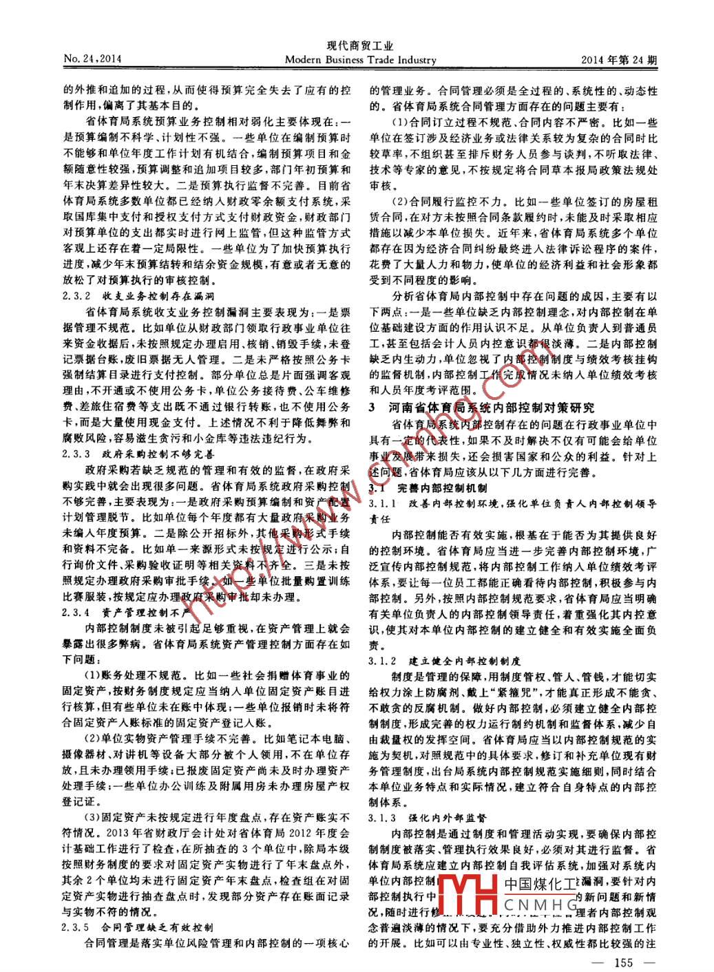 現(xiàn)代商貿(mào)工業(yè)No.24,2014Modern Business Trade Industry2014年第24期河南省體育局系統(tǒng)內(nèi)部控制研究陳波(河南省體育設(shè)施管理中心,河南鄭州450012)摘要:隨著國(guó)家財(cái)政對(duì)體育事業(yè)的投入逐年增加,為了保證財(cái)政預(yù)算資金的合理使用,進(jìn)一步加強(qiáng)內(nèi)部控制工作顯得尤為重要。從內(nèi)部控制機(jī)制,會(huì)計(jì)基礎(chǔ)控制,業(yè)務(wù)層面重點(diǎn)環(huán)節(jié)內(nèi)部控制三個(gè)方面具體分析了河南省體育局系統(tǒng)在內(nèi)部控制方面存在的問題在此基礎(chǔ)上提出有針對(duì)性的對(duì)策建議。關(guān)鍵詞:內(nèi)部控制;行政事業(yè);對(duì)策中圖分類號(hào):F23文獻(xiàn)標(biāo)識(shí)碼:A文章編號(hào):1672-3198<2014)24-0154-02《行政事業(yè)單位內(nèi)部控制規(guī)范(試行)》(以下簡(jiǎn)稱內(nèi)部所有部門和人員,特別是沒有 滲透到單位各個(gè)業(yè)務(wù)領(lǐng)域和控制規(guī)范)已于2014年1月1日起正式在全國(guó)范圍內(nèi)開始各 個(gè)操作環(huán)節(jié),很大程度上局限于會(huì)計(jì)業(yè)務(wù)方面,導(dǎo)致內(nèi)部實(shí)施,如何在實(shí)際工作中更好地貫徹內(nèi)部控制規(guī)范,已成為控制很難發(fā)揮其應(yīng)有的作用.行政事業(yè)單位亟待解決的課題。在市場(chǎng)經(jīng)濟(jì)條件下,體育(2)內(nèi)部控制制度不完善。內(nèi)部控制制度是現(xiàn)代管理活動(dòng)與社會(huì)經(jīng)濟(jì)活動(dòng)的聯(lián)系日趨緊密,伴隨著國(guó)家財(cái)政對(duì)的一個(gè)重要 組成部分,是單位內(nèi)部各種形式控制的總稱。體育事業(yè)的投入逐年增加,體育部門財(cái)務(wù)管理工作任務(wù)相省體育 局系統(tǒng)沒有單獨(dú)的內(nèi)部控制管理制度,現(xiàn)有財(cái)務(wù)管當(dāng)繁重。為了保證財(cái)政預(yù)算資金合理使用,體育部門需要理制度中雖然對(duì)內(nèi)部控制目標(biāo)、重點(diǎn)環(huán)節(jié)等方面提 出了一進(jìn)一步加強(qiáng)內(nèi)部管理,特別是基層單位要做好內(nèi)部控制工些要求,但是不夠系統(tǒng)全面,同時(shí)缺乏操作性強(qiáng)的內(nèi)部控制作。工作流程和實(shí)施細(xì)則。1河南省體育局系統(tǒng)內(nèi)部控制現(xiàn)狀(3)對(duì)內(nèi)部控制的執(zhí)行情況沒有建立完善的監(jiān)督機(jī)制。河南省體育局系統(tǒng)現(xiàn)有單位21個(gè),包括局本級(jí)在內(nèi)有監(jiān)督 考核機(jī)制不到位,監(jiān)督機(jī)構(gòu)大多與執(zhí)行機(jī)構(gòu)平行,甚至17個(gè)單位按照財(cái)政要求歸口省體育局預(yù)算管理,其中:行政還依附于執(zhí)行機(jī)構(gòu),權(quán)威性和獨(dú)立性不夠;單位紀(jì)檢和財(cái)務(wù)單位1個(gè)(局本級(jí)),全供事業(yè)單位13個(gè),差供事業(yè)單位2部門監(jiān)督本 單位內(nèi)部控制執(zhí)行情況時(shí),針對(duì)性不強(qiáng)檢查力個(gè),行政機(jī)關(guān)事業(yè)單位1個(gè);有1個(gè)自收自支事業(yè)單位未納度不夠。人財(cái)政預(yù)算管理。另有1個(gè)直屬單位是財(cái)政一級(jí)預(yù)算單2.2 會(huì)計(jì)基礎(chǔ)控制相對(duì)薄弱位,2個(gè)全供事業(yè)單位財(cái)政預(yù)算歸口其他廳局管理。(1)內(nèi)部控制崗位設(shè)置不規(guī)范。省體育局系統(tǒng)全部單內(nèi)部控制是河南省體育局系統(tǒng)內(nèi)部管理工作的重要組位中有 12個(gè)單位設(shè)置了會(huì)計(jì)機(jī)構(gòu),其余9個(gè)單位在有關(guān)機(jī)成部分,省體育局主要從內(nèi)部控制環(huán)境抓起,在財(cái)務(wù)管理、構(gòu)中設(shè)置了會(huì)計(jì)人員 ,除了局本級(jí)其他單位均未設(shè)立內(nèi)部會(huì)計(jì)管理.資產(chǎn)管理、政府采購.基建維修等方面建立了一審計(jì)崗位,主要由會(huì)計(jì)人員進(jìn)行內(nèi)部控制。一些單位在會(huì)系列規(guī)章制度,明確了相關(guān)部門和單位的內(nèi)部控制職責(zé)。計(jì)核算工作納人局會(huì)計(jì)結(jié)算中心后,本單位僅保留 1名出在具體業(yè)務(wù)方面,局經(jīng)濟(jì)管理處負(fù)責(zé)全局系統(tǒng)預(yù)算編制和納員或報(bào)賬 員,關(guān)鍵崗位沒有實(shí)施不相容職務(wù)分離措施。執(zhí)行、政府采購業(yè)務(wù)管理,以及內(nèi)部控制審計(jì)工作;局政策這樣會(huì)計(jì)人員既是本單位會(huì)計(jì)業(yè)務(wù)的參與者,又是會(huì)計(jì)內(nèi)法規(guī)處負(fù)責(zé)對(duì)全局系統(tǒng)重大經(jīng)濟(jì)合同的訂立進(jìn)行審核;局部控制的唯 - -監(jiān)督者,容易對(duì)資金業(yè)務(wù)的某個(gè)環(huán)節(jié)擁有絕體育設(shè)施管理中心負(fù)責(zé)省體育局基本設(shè)施建設(shè)工程和大型對(duì)的處置權(quán),不能形成有效制約和監(jiān)督.維修項(xiàng)目的預(yù)算審核,建設(shè)工程管理和工程驗(yàn)收決算等工(2)內(nèi)部控制關(guān)鍵崗位工作人員業(yè)務(wù)能力不足。省體作;局會(huì)計(jì)結(jié)算中心負(fù)責(zé)對(duì)納人財(cái)政預(yù)算管理的行政單位、育局系統(tǒng)在崗會(huì)計(jì)人員共計(jì) 60人,其中有2人至今無會(huì)計(jì)全供和差供事業(yè)單位統(tǒng)一進(jìn)行會(huì)計(jì)核算,實(shí)施會(huì)計(jì)監(jiān)督。從業(yè)資格證。有會(huì)
