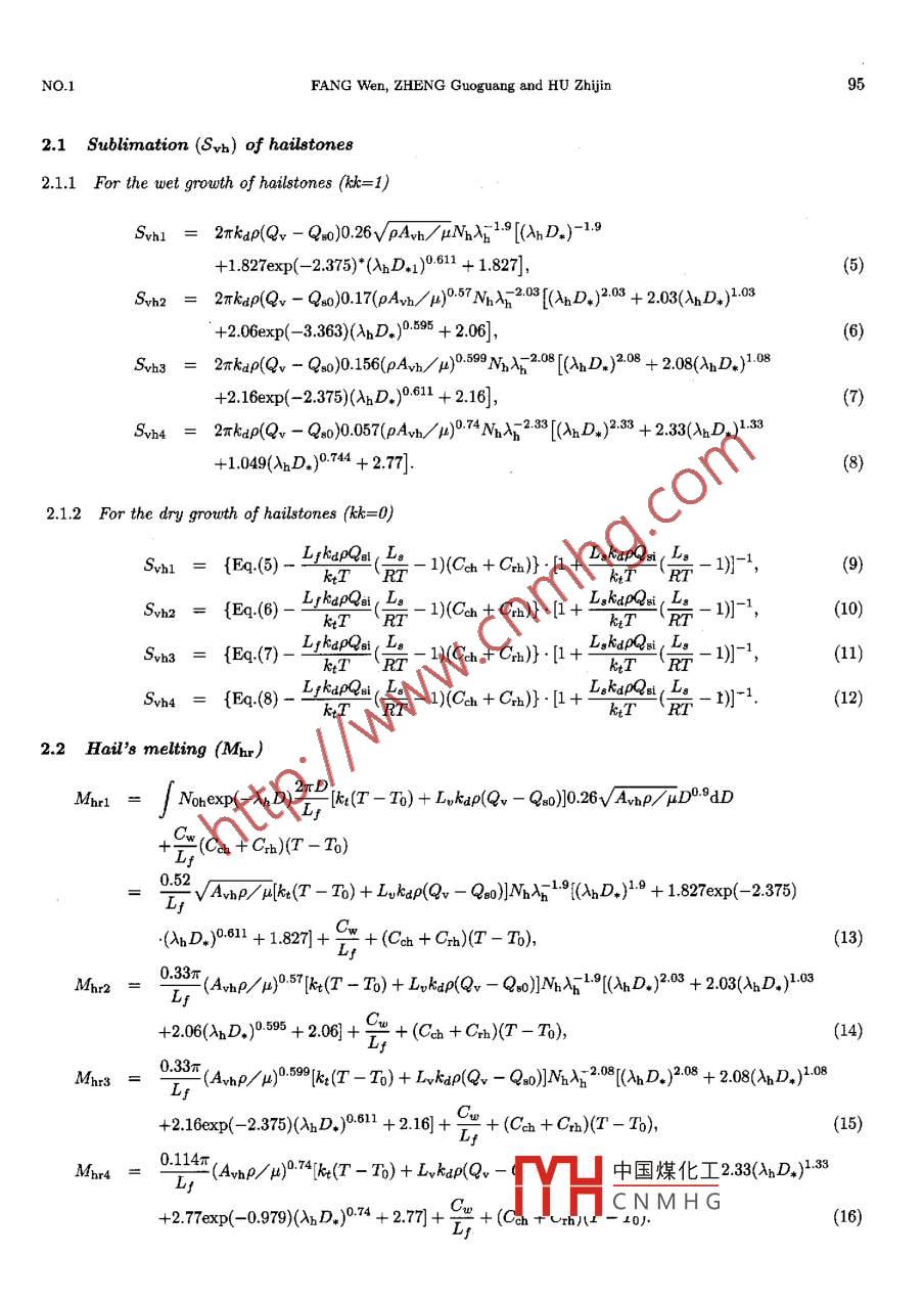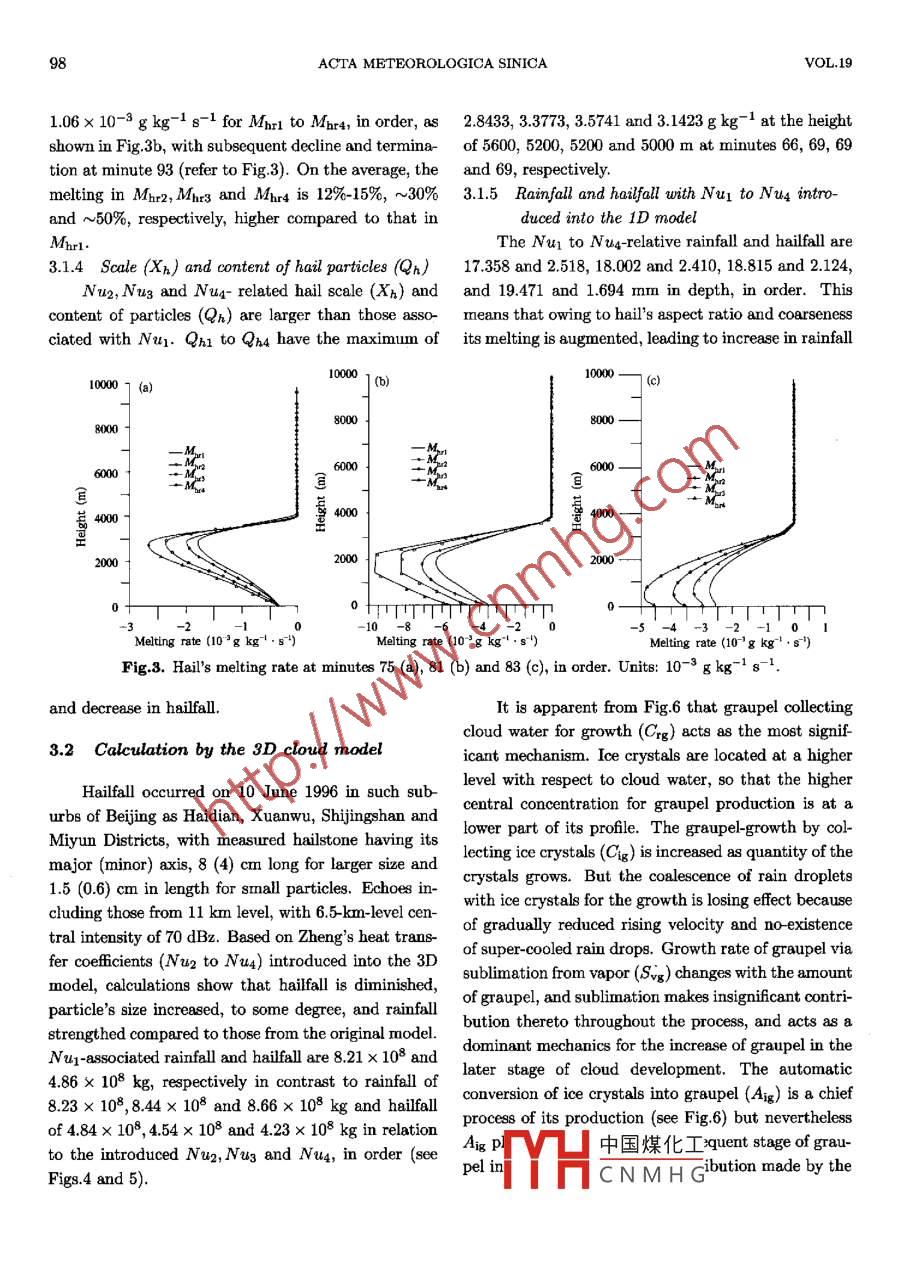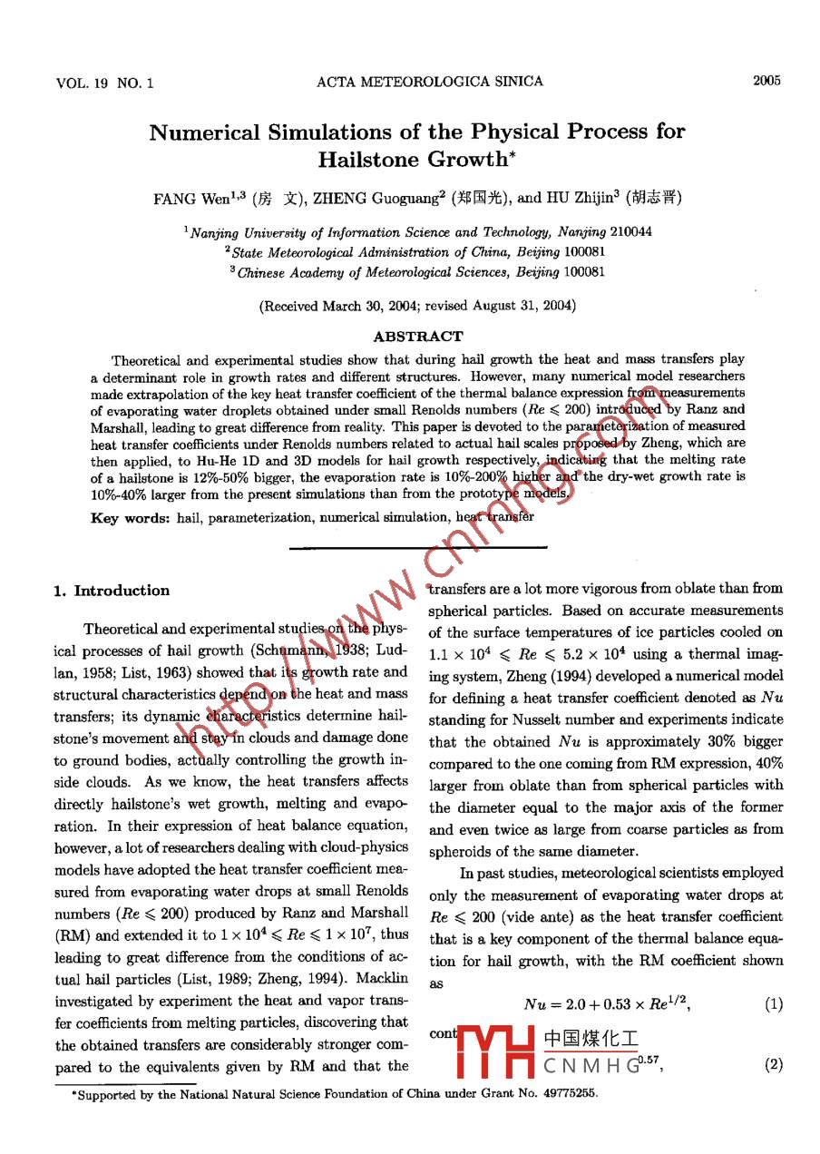 VOL.19 NO. 1ACTA METEOROLOGICA SINICA2005Numerical Simulations of the Physical Process forHailstone Growth*FANG Wen1,3 (房文), ZHENG Guoguang2 (鄭國光), and HU Zhjin3 (胡志晉)'Nanjing Univereity of Inforrmation Science and Technology, Nanjing 2100442 State Meteorological Administration of China, Beijing 1000813 Chinese Academy of Meterological Sciences, Bejjing 100081(Received March 30, 2004; revised August 31, 2004)ABSTRACTa determinant role in growth rates and different structures. However, many numerical model researchersmade extrapolation of the key heat transfer cofficient of the thermal balance expression from measurementsof evaporating water droplets obtained under small Renolds numbers (Re≤200) introduced by Ranz andMarshall, leading to great diference from reality. This paper is devoted to the parameterization of measuredheat transfer cofficients under Renolds numbers related to actual hail scales proposed by Zheng, which arethen applied, to Hu-He 1D and 3D models for hail growth respectively, indicating that the melting rateof a hailstone is 12% 50% bigger, the evaporation rate is 10%-20% higher and the dry-wet growth rate is10%-40% larger from the present simulations than from the prototype models.Key words: hail, paramneterization, numerical simulation, heat transfer1. Introductiontransfers are a lot more vigorous from oblate than fromspherical particles. Based on accurate measurementsTheoretical and experimental studies on the phys-of the surface temperatures of ice particles cooled onical processes of hail growth (Schumann, 1938; Lud-1.1 x 104≤Re≤5.2 x 104 using a thermal imag-lan, 1958; List, 1963) showed that its growth rate anding system, Zheng (1994) developed a numerical modelstructural characteristics depend on the heat and massfor defining a heat transfer coefficient denoted as Nutransfers; its dynamic characteristics determine hail-standing for Nusselt number and experiments indicatestone's movement and stay in clouds and damage donethat the obtained Nu is approximately 30% biggerto ground bodies, actually controlling the growth in-compared to the one coming from RM expression, 40%side clouds. As we know, the heat transfers affectslarger from oblate than from spherical particles withdirectly hailstone's wet growth, melting and evapo- the diameter equal to the major axis of the formerration. In their expression of heat balance equation,and even twice as large from coarse particles as fromhowever, a lot of researchers dealing with cloud-physicsspheroids of the same diamneter.models have adopted the heat transfer coefficient mea-In past studies, meteorological scientists employedsured from evaporating water drops at small Renoldsonly the measurement of evaporating water drops atnumbers (Re≤200) produced by Ranz and MarshallRe≤200 (vide ante) as the heat transfer cofficient(RM) and extended it to1x10≤Re≤1x 107, thus that is a key component of the thermal balance equa-leading to great difference from the conditions of ac-tion for hail growth, with the RM cofficient showntual hail particles (List, 1989; Zheng, 1994). Macklininvestigated by experiment the heat and vapor trans-Nu= 2.0+ 0.53 x Re-/2,(1)fer cofficients from melting particles, discovering thatcont中國煤化工the obtained transfers are considerably stronger com-pared to the equivalents given by RM and that theYHCNMHG.57,(2)"Supported by the National Natural Science Foundation of China under Grant No. 49775255.04ACTA METEOROLOGICA SINICAVOL.19Nu= 0.313 x Re0.599,(3)For convenience of later discussion Nu of Eqs.(1)Nu= 0.114 x Re0.74,(4to (4) are denoted as Nu1 through Nus, in order andother physical quantities calculated using Nu1 - Nuswhere Nu of Eqs.(2)-(4) measured at 1 x 104will be given by corresponding subscripts 1 throughRe≤5.2 x 104 proposed by Zheng who used a verti- 4. Nu1 to Nua, respectively, fom Eqs(1) to (4) atcally pesusenrtrollable wind tunnel for hail growth.1x103 ≤Re≤5.2x 104 are given in Table 1, in whichEquation (2) is applicable to smooth sphere, i.e., theirwe see that Nu2 is by 2%-30% larger than Nu, aboutaspect ratioa = 1; Eq.(3) holds for smooth oblate 14%, on average, higher; Nus exceeds Nu1 by 4%-particles witha= 0.67 and Eq.(4) is true for rough 69%, averaging roughly 35% larger; Nua(B = =2% par-oblate particles (a = 0.67) with surface having coarse ticle) is 83% greater compared to Nu, but at largerness β =2%.Re, Nus is by 150% larger than Nu1.Table 1. Comparison of Nu nunbers of hiltones with various characteristic at1x10°≤Re≤5.2x 10*R1x 1031.5x 1032.8x 1033.4 x 1034.4x 1035.2x 1036.5x 103Nu118.88722.68230.25733.13737.42140.50745.052u216.92421.32530.43633.99839.38143.41549.189Nu19.65125.05236.41040.90147.73152.75560.299Nua18.91925.53940.53246.79556.632 .64.08475.589Re7.6x 1039.4x 1031x 1042.2x 1043x 1043.7x 105.2x 10448.55353.77355.40081.20594.491104.717123.771Ne53.77560.70162.88098.559117.618132.551160.92966.21975.21178.051125.166150.720170.895209.538Nu484.86199.316103.97186.336234.409273.762352.166Equations (1)-(4) are parameterized and put, sep- interest in this study.arately, into the 1D and 3D time-dependent cumulusIn the derivation of the model expressions of Hu-models developed by Hu and He (1988; 1989), with He for wet-dry growth, melting and evaporation ofthe simulations for comparison.hailstones, the integral portion is approximated by anempirical expression. If, for example, the hail subli-2. Parameterization schememation expression were treated with that way,The 1D cloud model was employed to deriveSvh = πrkap(Qv - Qgo)NupooNoD'9exp( -入h D)dDthe specific water contents of in-cloud vepor, cloudJDgdroplets, the combination of graupels, ice crystals, rain= 2πkap(Qv - Qs0)0.29√pAvh/μwater and hail particles, and the conversion rate ofJ.NpDl-9exp(-AnD)dDspecific number concentration from 26 primary micro-physical processes, each of which is denoted by a cap-≈2πkap(Qv - Qso)0.29v pAvh/ μNnH:9ital letter for the process and two subs