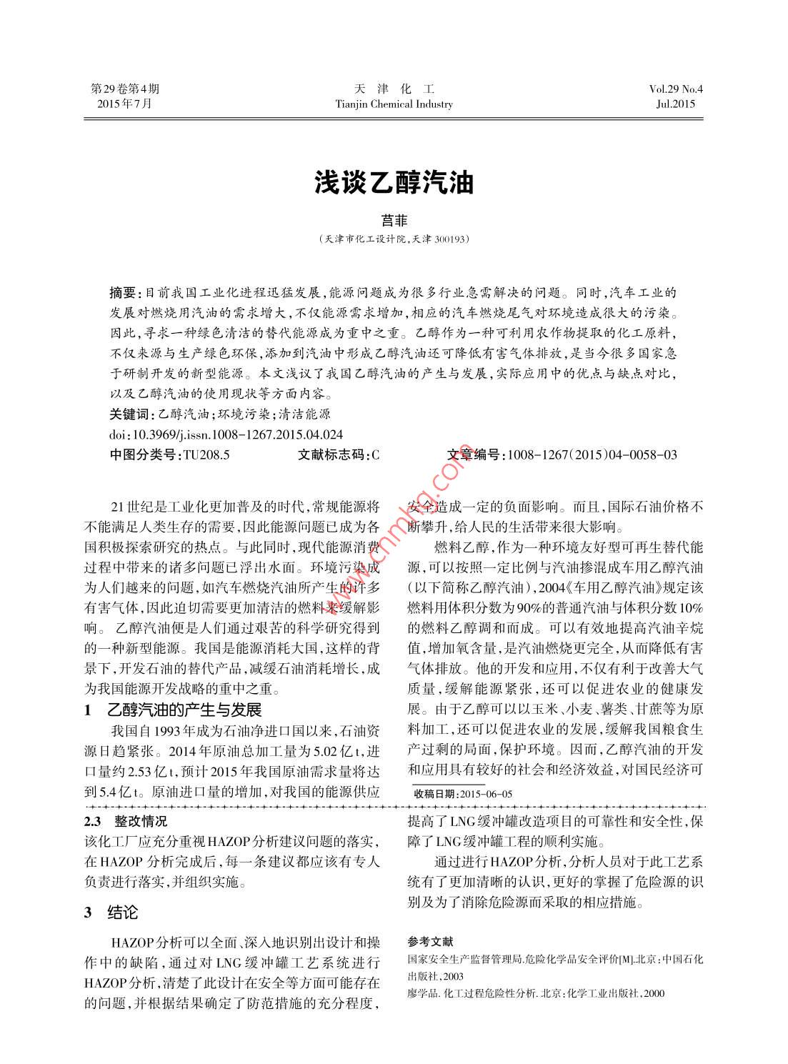 第29卷第4期天津化工 Vol.29 No.42015年7月 Tianjin Chemical IndustryJul.2015淺談乙醇汽油莒菲(天津市化工設(shè)計(jì)院,天津300193)摘要:目前我國(guó)工業(yè)化進(jìn)程迅猛發(fā)展,能源問(wèn)題成為很多行業(yè)急需解決的問(wèn)題。同時(shí),汽車(chē)工業(yè)的發(fā)展對(duì)燃燒用汽油的需求增大,不僅能源需求增加,相應(yīng)的汽車(chē)燃燒尾氣對(duì)環(huán)境造成很大的污染。因此,尋求一種綠色清潔的替代能源成為重中之重。乙醇作為一種可利用農(nóng)作物提取的化工原料,不僅來(lái)源與生產(chǎn)綠色環(huán)保,添加到汽油中形成乙醇汽油還可降低有害氣體排放,是當(dāng)今很多國(guó)家急于研制開(kāi)發(fā)的新型能源。本文淺議了我國(guó)乙醇汽油的產(chǎn)生與發(fā)展,實(shí)際應(yīng)用中的優(yōu)點(diǎn)與缺點(diǎn)對(duì)比,以及乙醇汽油的使用現(xiàn)狀等方面內(nèi)容關(guān)鍵詞:乙醇汽油;環(huán)境污染;清潔能源doi:10.3969issn.1008-1267.2015.04.024中圖分類(lèi)號(hào):TU208.5文獻(xiàn)標(biāo)志碼:C文章編號(hào):1008-1267(2015)04-0058-0321世紀(jì)是工業(yè)化更加普及的時(shí)代,常規(guī)能源將安全造成一定的負(fù)面影響。而且,國(guó)際石油價(jià)格不不能滿(mǎn)足人類(lèi)生存的需要,因此能源問(wèn)題已成為各斷攀升,給人民的生活帶來(lái)很大影響。國(guó)積極探索研究的熱點(diǎn)。與此同時(shí),現(xiàn)代能源消費(fèi)燃料乙醇,作為一種環(huán)境友好型可再生替代能過(guò)程中帶來(lái)的諸多問(wèn)題已浮出水面。環(huán)境污染成源,可以按照一定比例與汽油摻混成車(chē)用乙醇汽油為人們?cè)絹?lái)的問(wèn)題,如汽車(chē)燃燒汽油所產(chǎn)生的許多(以下簡(jiǎn)稱(chēng)乙醇汽油),2004《車(chē)用乙醇汽油》規(guī)定該有害氣體,因此迫切需要更加清潔的燃料來(lái)緩解影燃料用體積分?jǐn)?shù)為90%的普通汽油與體積分?jǐn)?shù)10%響。乙醇汽油便是人們通過(guò)艱苦的科學(xué)研究得到的燃料乙醇調(diào)和而成??梢杂行У靥岣咂托镣榈囊环N新型能源。我國(guó)是能源消耗大國(guó),這樣的背值,增加氧含量,是汽油燃燒更完全,從而降低有害景下,開(kāi)發(fā)石油的替代產(chǎn)品,減緩石油消耗增長(zhǎng),成氣體排放。他的開(kāi)發(fā)和應(yīng)用,不僅有利于改善大氣為我國(guó)能源開(kāi)發(fā)戰(zhàn)略的重中之重。質(zhì)量,緩解能源緊張,還可以促進(jìn)農(nóng)業(yè)的健康發(fā)1乙醇汽油的產(chǎn)生與發(fā)展展。由于乙醇可以以玉米、小麥、薯類(lèi)、甘蔗等為原我國(guó)自1993年成為石油凈進(jìn)口國(guó)以來(lái),石油資料加工,還可以促進(jìn)農(nóng)業(yè)的發(fā)展,緩解我國(guó)糧食生源日趨緊張。2014年原油總加工量為5.02億t,進(jìn)產(chǎn)過(guò)剩的局面,保護(hù)環(huán)境。因而,乙醇汽油的開(kāi)發(fā)口量約2.53億t,預(yù)計(jì)2015年我國(guó)原油需求量將達(dá)和應(yīng)用具有較好的社會(huì)和經(jīng)濟(jì)效益,對(duì)國(guó)民經(jīng)濟(jì)可到5.4億t原油進(jìn)口量的增加,對(duì)我國(guó)的能源供應(yīng)收稿日期:2015-06-052.3整改情況提高了LNG緩沖罐改造項(xiàng)目的可靠性和安全性,保該化工廠應(yīng)充分重視 HAZOP分析建議問(wèn)題的落實(shí),障了LNG緩沖罐工程的順利實(shí)施。在 HAZOP分析完成后,每一條建議都應(yīng)該有專(zhuān)人通過(guò)進(jìn)行 HAZOP分析,分析人員對(duì)于此工藝系負(fù)責(zé)進(jìn)行落實(shí),并組織實(shí)施。統(tǒng)有了更加清晰的認(rèn)識(shí),更好的掌握了危險(xiǎn)源的識(shí)3結(jié)論別及為了消除危險(xiǎn)源而采取的相應(yīng)措施。 HAZoP分析可以全面、深入地識(shí)別出設(shè)計(jì)和操參考文獻(xiàn)作中的缺陷,通過(guò)對(duì)LNG緩沖罐工藝系統(tǒng)進(jìn)行國(guó)家安全生產(chǎn)監(jiān)督管理局危險(xiǎn)化學(xué)品安全評(píng)價(jià)M北京中國(guó)石化 HAZOP分析,清楚了此設(shè)計(jì)在安全等方面可能存在的問(wèn)題,并根據(jù)結(jié)果確定了防范措施的充分程度,廖學(xué)品化工過(guò)程危險(xiǎn)性分析北京:化學(xué)工業(yè)出版社2000第29卷第4期莒菲:淺談乙醇汽油59持續(xù)發(fā)展具有重要戰(zhàn)略意義。也因此國(guó)內(nèi)外科研機(jī)用汽油的發(fā)動(dòng)機(jī)。構(gòu)在對(duì)乙醇汽油的生產(chǎn)與研發(fā)方面多是以農(nóng)作物纖2.2.2乙醇是一種優(yōu)良的溶劑,易對(duì)汽車(chē)密封橡膠維為原料,并已經(jīng)取得了突破性進(jìn)展。及其它合成非金屬材料產(chǎn)生一定的輕微腐蝕、容漲,2乙醇汽油性質(zhì)及優(yōu)缺點(diǎn)比較軟化或龜裂作用。同時(shí),其在燃燒過(guò)程中產(chǎn)生乙酸,乙醇汽油作為一種替代能源,主要由糧食及各對(duì)汽車(chē)金屬特別是銅具有腐蝕作用。有試驗(yàn)表明,種植物纖維加工的燃料乙醇與普通汽油按一定比例在汽油中乙醇含量在10%以下時(shí),對(duì)金屬基本沒(méi)有混配形成"。我國(guó)國(guó)家標(biāo)準(zhǔn)規(guī)定,乙醇汽油是用90%腐蝕,但乙醇超過(guò)15%時(shí),則必須添加有較的腐蝕抑的普通汽油與10%的燃料乙醇調(diào)和而成2制劑。2.1乙醇汽油的優(yōu)點(diǎn)2.2.3乙醇易于吸水,其在運(yùn)輸、銷(xiāo)售過(guò)程中易吸水燃料乙醇的理化
