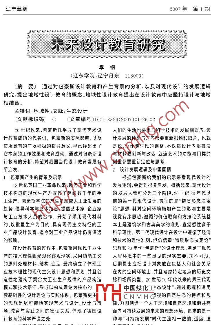 遼寧絲綢2007年第1期未來設計教育研究李鋼(遼東學院,遼寧丹東.118003)[摘要]通過對包豪斯設計教育和產(chǎn)生背景的分析,以及對現(xiàn)代設計的發(fā)展邏輯研究,提出地域性設計教育的概念。地域性設計教育提出在設計教育中應堅持設計與地域相結(jié)合。關鍵詞:地域性;文脈;生態(tài)設計(文獻標識碼] C [文 章編號]1671-3389(2007)01 -26-0220世紀以來,包豪斯幾乎成了現(xiàn)代藝術設人們的生活 也要求與科學技術的發(fā)展相適應,設計教育成功的代名詞。包豪斯的實際影響,以及計發(fā)展的種類與方向都要重新抑揚和取舍。也就它所具有的廣泛積極的指導意義,早已經(jīng)超出了是說,設計隨時代的調(diào)整,不僅指設計內(nèi)部技法它本身的工作效果和教育成就。通過對包豪斯設.與材料要創(chuàng)新與改變,就連藝術的功能與門類的計教育的分析,希望對我國當代設計教育發(fā)展有.側(cè)重都要重新定位與思考。所啟發(fā)。2設計發(fā)展邏輯及中國國情1包豪斯產(chǎn)生的背景及啟示根據(jù)包豪斯給我們的啟示來看現(xiàn)代設計的18世紀英國工業(yè)革命以來,現(xiàn)代工業(yè)和科學.發(fā)展邏輯,會得到很多啟發(fā)。概括起來,現(xiàn)代設計技術構成的現(xiàn)代生產(chǎn)力取代了延續(xù)數(shù)千年的手的發(fā)展大致可分為三個階段,20世紀20年代以工生產(chǎn)。包豪斯學院的產(chǎn)生是順應大工業(yè)發(fā)展的.前的第一代現(xiàn)代設計,貫徹的是“物質(zhì)形態(tài)決定趨勢,倡導科學與藝術結(jié)合,提倡藝術家、企業(yè)家論”思想,其對空間環(huán)境施加產(chǎn)生的影響主要是與工業(yè)技術人員的合作。開始了采用現(xiàn)代材料視覺有序思想,遵循的價值取向和方法論系統(tǒng)基的、以批量生產(chǎn)為目的、具有現(xiàn)代主義特征的工本上是建筑學和古典美學的準則,直覺感性多于業(yè)產(chǎn)品設計教育,迄今對工業(yè)產(chǎn)品設計仍有深遠科學理性。第二代現(xiàn)代設計在設計中遵循了經(jīng)濟的影響。和技術的理性準則,但仍信奉“物質(zhì)形態(tài)決定論'在設計教育的過程中,包豪斯用現(xiàn)代工業(yè)生思想和20年代“包豪斯”的設計理念,滿足了現(xiàn)代產(chǎn)的技術理性眼光觀察客觀現(xiàn)實,采用功能主義人 居環(huán)境中的一些顯見的現(xiàn)實需要,功不可沒。的原則處理材料、結(jié)構、造型,最終確立了體現(xiàn)工后 期提出應把設計對象放在包括人和社會關系業(yè)技術理性的現(xiàn)代主義設計思想和原則,并且創(chuàng)在內(nèi)的空間環(huán)境上,并且考慮特定地點的歷史文造性地建構了契合大工業(yè)生產(chǎn)規(guī)律的產(chǎn)品構造脈和場所類型。20世紀70年代以來的第三代現(xiàn)模式和技術語匯,形成以構成理論為核心的中國煤化工態(tài)設計”,通過把握和運用套基礎性的設計理論與實踐體系。包豪斯更主MYH.CNMHG&視的自然生態(tài)的特點和規(guī)的思想是盡可能地實現(xiàn)藝術與設計、設計與市律 ,力圖創(chuàng)造一個人工環(huán)境和自然環(huán)境和諧共存場、教育與實踐之間的密切關系,體現(xiàn)了德國設面向可持續(xù)發(fā)展的未來的理想環(huán)境。追求的是-計教育的科學嚴謹之處。種與“可持續(xù)發(fā)展”時代主流相一致的、適度、溫包豪斯給我們的啟示是,隨著時代的推進,和而平和的綠色設計。26遼寧絲綢2007年第1期根據(jù)我國目前的國情,我國的現(xiàn)代設計正處素,構成空間的設計可以抄襲,但一定地域的自在第二代現(xiàn)代設計的前期。如果我國的現(xiàn)代設計然景觀則是難以模仿的,它具有永恒的魅力。二按照西方現(xiàn)代設計的發(fā)展歷程進行發(fā)展,我們會是人地共生的思想,即人與環(huán)境不僅要共生,而永遠落在西方國家的后面,所以我國現(xiàn)代設計應且要共榮,人與自然必須共同發(fā)展、建設。該根據(jù)我國的具體國情發(fā)展現(xiàn)代設計,即發(fā)展地.3.4培養(yǎng)學生 既有動手能力,又有理論素養(yǎng)域性設計,以地域自然條件和人文條件特點為根要改變現(xiàn)在的藝術設計教育只注重理論的.本,把第二代設計的后期和第三代現(xiàn)代設計(生現(xiàn)狀,要培養(yǎng)學生既有動手能力,又有理論素養(yǎng)。態(tài)設計)結(jié)合起來,在現(xiàn)代設計中,既要考慮特定其重點在于實踐的過程,使學生的技能得到升地點的歷史文脈和場所類型,又要發(fā)展綠色生態(tài)華。強調(diào)理論與技能的結(jié)合,使理論成為真正實設計。用的東西。通過藝術教育為現(xiàn)代化的工業(yè)生產(chǎn)和.3未來設計教育的發(fā)展商品消費培養(yǎng)生產(chǎn)者和消費者,用現(xiàn)代人的觀點未來的設計教育-定要為未來設計服務。為和思想滿足現(xiàn)代人對環(huán)境和物品設計藝術的需了適應未來地域性設計的發(fā)展,設計教育必須做求。出改變以適應未來設計發(fā)展。3.5 將學校教育同社會生產(chǎn)掛鉤3.1 設計中強調(diào)自由創(chuàng)造,反對模仿因襲,墨守設計教育為社會生產(chǎn)服務,如果不了解生產(chǎn)陳規(guī)工藝,設計就不能轉(zhuǎn)化成產(chǎn)品,不能產(chǎn)生經(jīng)濟效地域性設計是全新的一種設計方式,需要在益,設計的價值就無法實現(xiàn)。學校教育要和社會結(jié)合地域特點的基礎上