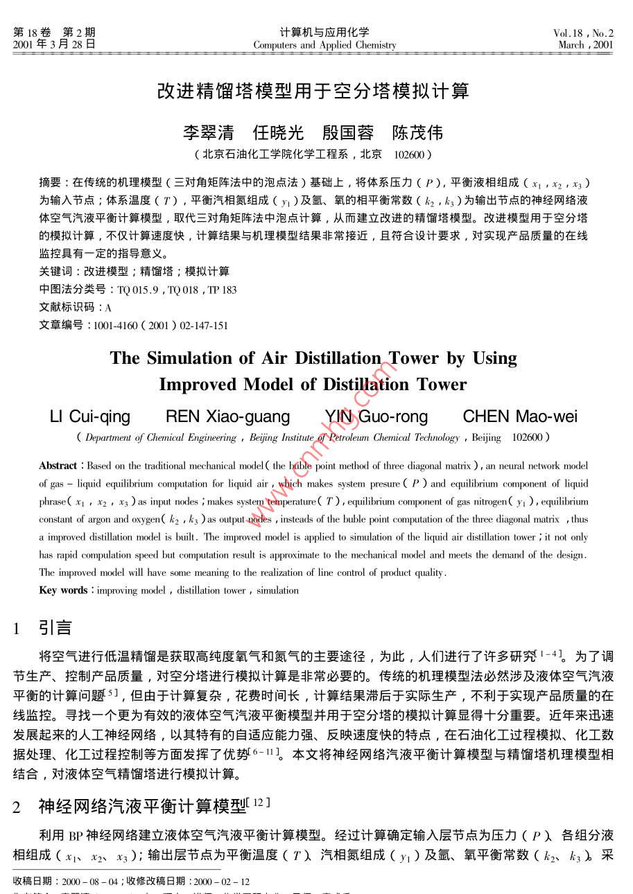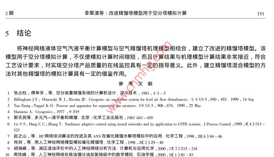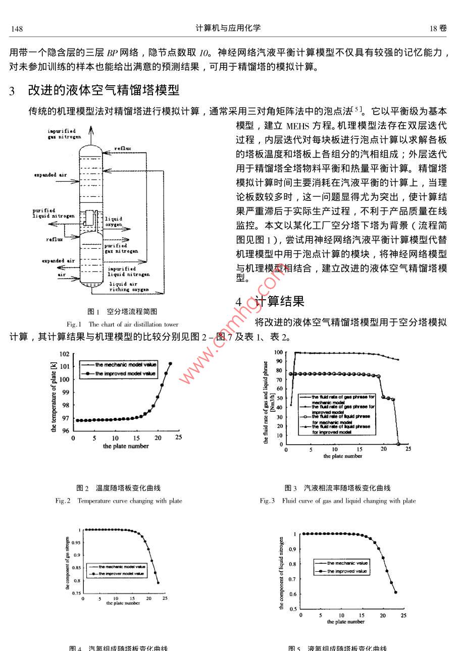 第18卷第2期計算機(jī)與應(yīng)用化學(xué)Vol. 182001年3月28日d Applied ChemistryMarck改進(jìn)精餾塔模型用于空分塔模擬計算李翠清任曉光殷國蓉陳茂偉北京石油化工學(xué)院化學(xué)工程系,北京102600)摘要∶在傳統(tǒng)的機(jī)理模型(三對角矩陣法中的泡點(diǎn)法)基礎(chǔ)上,將體系壓力(P),平衡液相組成(x,x2,x3)為輸入節(jié)點(diǎn);體系溫度(T),平衡汽相氮組成(y)及氬、氧的相平衡常數(shù)(k2,k3)為輸岀節(jié)點(diǎn)的神經(jīng)網(wǎng)絡(luò)液體空氣汽液平衡計算模型,取代三對角矩陣法中泡點(diǎn)計箅,從而建立改進(jìn)的精餾塔模型。改進(jìn)模型用于空分塔的模擬計算,不僅計算速度快,計算結(jié)果與機(jī)理模型結(jié)果非常接近,且符合設(shè)計要求,對實(shí)現(xiàn)產(chǎn)品質(zhì)量的在線監(jiān)控具有一定的指導(dǎo)意義。關(guān)鍵詞∶改進(jìn)模型;精餾塔;模擬計箅中圖法分類號:TQ015.9,TQ018,TP183文獻(xiàn)標(biāo)識碼:A文章編號:1001-4160(201)02-147-15The Simulation of Air Distillation Tower by UsingImproved Model of Distillation TowerLI Cui-qIngRENXⅰ ao-guauang YIN Guo-rong CHEN Mao-WeiDepartment of Chemical Engineering, Beijing Institute of Petroleum Chemical Technology, Beijing 102600)Abstract: Based on the traditional mechanical model( the buble point method of three diagonal matrix ) an neural network modelof gas-liquid equilibrium computation for liquid air, which makes system presure( P)and equilibrium component of liquidphrase( xi,x2,x3) as input nodes makes system temperature( T), equilibrium component of gas nitrogen( yi), equilibriumonstant of argon and oxygen k?, k3 )as output nodes, insteads of the buble point computation of the three diagonal matrix thusa improved distillation model is built. The improved model is applied to simulation of the liquid air distillation tower it not onlyhas rapid compulation speed but computation result is approximate to the mechanical model and meets the demand of the designto the realization of line control of product qu:Key words: improving model distillate1引言將空氣進(jìn)行低溫精餾是獲取高純度氧氣和氮?dú)獾闹饕緩?為此,人們進(jìn)行了許多研究1-4。為了調(diào)節(jié)生產(chǎn)、控制產(chǎn)品質(zhì)量,對空分塔進(jìn)行模擬計算是非常必要的。傳統(tǒng)旳杋理模型法必然涉及液體空氣汽液平衡的計算問題5,但由于計算復(fù)雜,花費(fèi)時間長,計算結(jié)果滯后于實(shí)際生產(chǎn),不利于實(shí)現(xiàn)產(chǎn)品質(zhì)量的在線監(jiān)控。尋找一個更為有效的液體空氣汽液平衡模型并用于空分塔的模擬計算顯得十分重要。近年來迅速發(fā)展起來的人工神經(jīng)網(wǎng)絡(luò),以其特有的自適應(yīng)能力強(qiáng)、反映速度快的特點(diǎn),在石油化工過程模擬、化工數(shù)據(jù)處理、化工過程控制等方面發(fā)揮了優(yōu)勢δ-]本文將神經(jīng)網(wǎng)絡(luò)汽液平衡計算模型與精餾塔機(jī)理模型相結(jié)合,對液體空氣精餾塔進(jìn)行模擬計算。2神經(jīng)網(wǎng)絡(luò)汽液平衡計算模型1利用BP神經(jīng)網(wǎng)絡(luò)建立液體空氣汽液平衡計算模型。經(jīng)過計算確定輸入層節(jié)點(diǎn)為壓力(P)各組分液相組成(x1、x2、x3);輸出層節(jié)點(diǎn)為平衡溫度(T)汽相氮組成(y1)及氬、氧平衡常數(shù)(k2、k3)采000-08-04日期:2000-02-12148計算機(jī)與應(yīng)用化學(xué)18卷用帶一個隱含層的三層B網(wǎng)絡(luò),隱節(jié)點(diǎn)數(shù)取10。神經(jīng)網(wǎng)絡(luò)汽液平衡計算模型不僅具有較強(qiáng)的記憶能力,對未參加訓(xùn)練的樣本也能給岀滿意的預(yù)測結(jié)果,可用于精餾塔旳模擬計算。3改進(jìn)的液體空氣精餾塔模型傳統(tǒng)的杋理模型法對精餾塔進(jìn)行模擬計算,通常采用三對角矩陣法中的泡點(diǎn)法5。它以平衡級為基本模型,建立MEHS方程。機(jī)理模型法存在雙層迭代nitr。gn過程,內(nèi)層迭代對每塊板進(jìn)行泡點(diǎn)計算以求解各板的塔板溫度和塔板上各組分的汽相組成;外層迭代用于精餾塔全塔物料平衡和熱量平衡計算。精餾塔expanded air模擬計算時間主要消耗在汽液平衡的計算上,當(dāng)理論板數(shù)較多時,這一問題顯得尤為突出,使計算結(jié)ifi.dquid nitro果嚴(yán)重滯后于實(shí)際生產(chǎn)過程,不利于產(chǎn)品質(zhì)量在線監(jiān)控。本文以某化工廠空分塔下塔為背景(流程簡圖見圖1),嘗試用神經(jīng)網(wǎng)絡(luò)汽液平衡計算模型代替機(jī)理模型中用于泡點(diǎn)計算的模塊,將神經(jīng)網(wǎng)絡(luò)模型與機(jī)理模型相結(jié)合,建立改進(jìn)的液體空氣精餾塔模seE liquidriching oxycen4計算結(jié)果圖1空分塔流程簡圖將改進(jìn)的液體空氣精餾塔模型用于空分塔模擬計算,其計算結(jié)果與機(jī)理模型的比較分別見圖2-圖7及表1、表2。101mechanic modelprayer meot1015dthe plate number圖2溫度隨塔板變化曲線板變化曲線Fig 2 Temperature curve changing with plateg 3 Fluid curve of gas and liquid chang期李翠清等:改進(jìn)精餾塔模型用于空分塔模擬計算1492.50E016.11圖6液氧組成隨塔板變化曲線圖7塔板壓力隨塔板變化曲線Fig. 6 The compoent curve of liquid oxygen changing with plateig. 7 The pressure curve of plate changing with plat表1改進(jìn)模型模擬計算結(jié)果及其與機(jī)理模型相對誤差Table 1 The computation result of improved model and the relative error with the mechanic modelfluid rate offluid rate ofumberpressure,[ atm] 