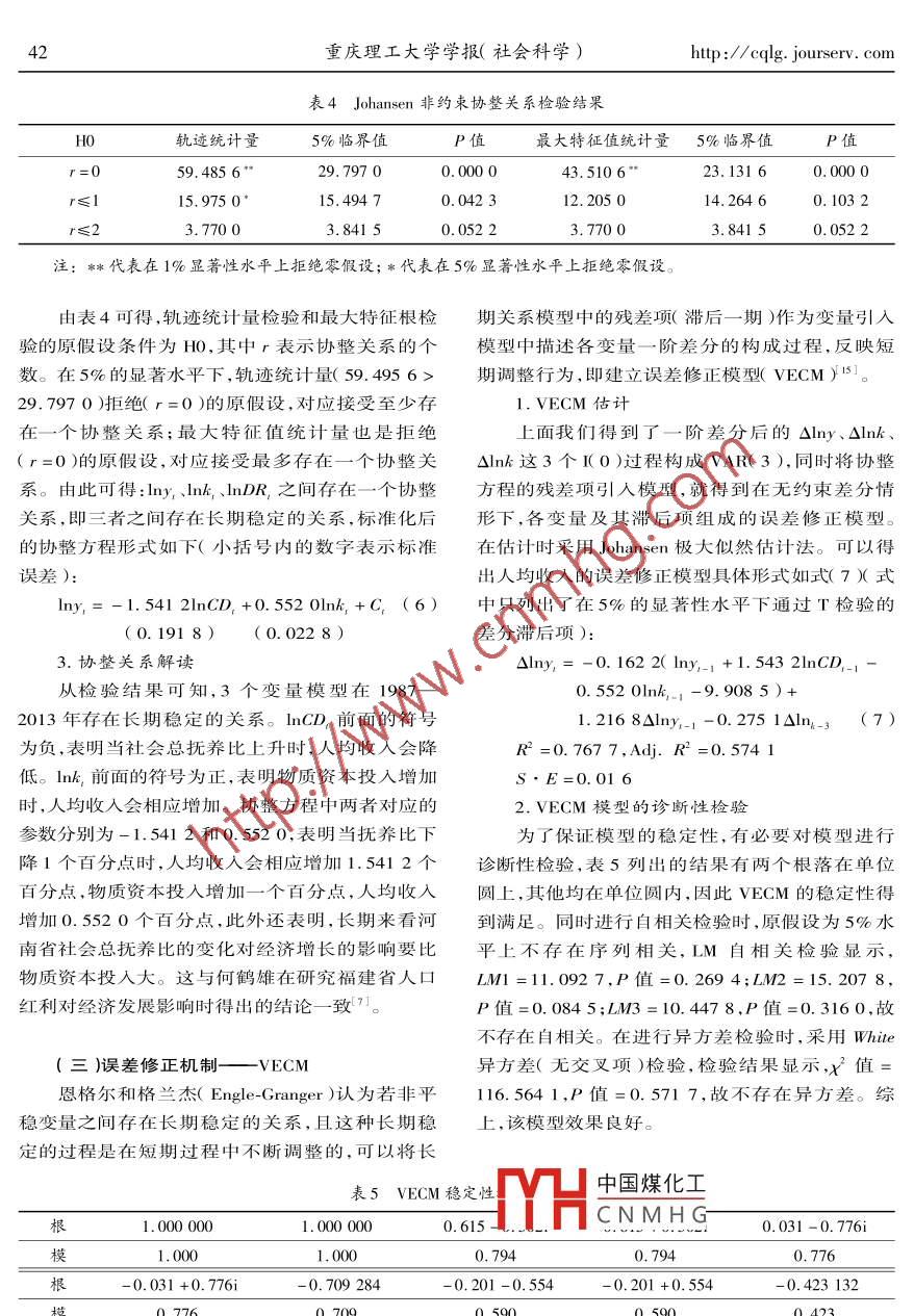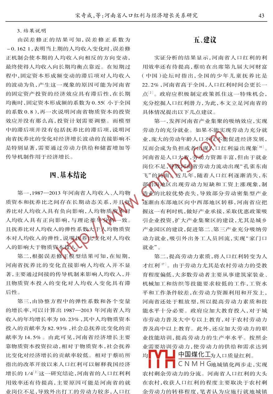 重慶理工大學(xué)學(xué)報(bào)(社會(huì)科學(xué))2016年第30卷第3期經(jīng)濟(jì)學(xué)Journal of Chongqing University of Technology( Social Science) Vol. 30 No. 32016doi: 10. 3969/j. issn. 1674- -8425( s ). 2016. 03. 007河南省人口紅利與經(jīng)濟(jì)增長(zhǎng)關(guān)系研究宋奇成,張亞飛(重慶理工大學(xué)經(jīng)濟(jì)與貿(mào)易學(xué)院,重慶400054 )摘要:基于柯布-道格拉斯生產(chǎn)函數(shù)的理論推導(dǎo),建立人均收入、人均物質(zhì)資本和總撫養(yǎng)比三者的計(jì)量模型,利用1987--2013年的時(shí)間序列數(shù)據(jù),通過協(xié)整理論對(duì)計(jì)量模型進(jìn)行檢驗(yàn),研究河南省人口紅利與經(jīng)濟(jì)增長(zhǎng)的關(guān)系。結(jié)果顯示:三者之間存在長(zhǎng)期穩(wěn)定關(guān)系,在長(zhǎng)期,總撫養(yǎng)比對(duì)人均收入具有負(fù)向影響,人均物質(zhì)資本對(duì)經(jīng)濟(jì)增長(zhǎng)具有正向影響,并且總撫養(yǎng)比變化對(duì)人均收入的影響比物質(zhì)資本投入大;在短期,撫養(yǎng)比變化并未直接作用于經(jīng)濟(jì)增長(zhǎng),物質(zhì)資本的投入對(duì)經(jīng)濟(jì)增長(zhǎng)的影響具有滯后性。關(guān)鍵詞:人口紅利;經(jīng)濟(jì)增長(zhǎng);總撫養(yǎng)比;協(xié)整理論中圖分類號(hào):C92-05文獻(xiàn)標(biāo)識(shí)碼:A文章編號(hào):1674 - 8425( 2016 )03 - 0038 -07Study on Relationship Between tDemographic Dividendand Economic Growth of Henan ProvinceSONG Qi-cheng, ZHANG Ya-fei( College of Economy & Trade, Chongqing University of Technology, Chongqing 400054,China )Abstract : The paper established the econometric model of per capita income , per capita physical cap-ital and total dependency ratio based on the theoretical derivation of Cobb-Douglas production functionto study on the relationship between the demographic dividend and economic growth in Henan prov-ince. Through the cointegration theory,we tested the measurement model by using the time series dataof 1987- -2013. The results show three variables have the long- term stability relationship. In the longterm,the total dependency ratio has negative impact on per capita income, and per capita physicalcapital has a positive impact on economic growth and the total dependency ratio on the impact of in-come per capita is larger than physical capital investment. In short term,the dependency ratio ’schanges has not significant contribution directly to economic growth and the physical capital invest-ment has lagged effect on economic growth.Key words: demographic dividend; economic growth; total dependency ratio; cointegration theory收稿日期:2014-12-29中國煤化工、2014244 )基金項(xiàng)目:重慶理I大學(xué)研究生創(chuàng)新基金項(xiàng)目“人才紅利效應(yīng)作者簡(jiǎn)介:宋奇成( 1955- ),男,湖南常德人,教授,研究方向::fHCNMHG引用格式:宋奇成,張亞飛.河南省人口紅利與經(jīng)濟(jì)增長(zhǎng)關(guān)系研究[ J].重慶理工大學(xué)學(xué)報(bào)(社會(huì)科學(xué)),2016( 3 ):38Citation format:SONG Qi-cheng, ZHANG Ya-fei. Study on Relationship Between tDemographic Dividend and EconomicGrowth of Henan Province[ J ]. Journal of Chongqing University of Technology( Social Science ), 2016( 3 ):38 -44.宋奇成,等:河南省人口紅利與經(jīng)濟(jì)增長(zhǎng)關(guān)系研究39河南省作為人口大省,年齡結(jié)構(gòu)的轉(zhuǎn)變?yōu)槠淞|(zhì)量貢獻(xiàn)占10. 4%[7]。李魁從消費(fèi)、儲(chǔ)蓄、進(jìn)出.提供了人口紅利機(jī)遇期,2013年勞動(dòng)年齡人口占.口三個(gè)方面提出了年齡結(jié)構(gòu)變動(dòng)作用于經(jīng)濟(jì)增長(zhǎng)總?cè)丝诘谋戎貫?3.9%,總撫養(yǎng)系數(shù)為43.2%,的“三條子傳導(dǎo)機(jī)制”,實(shí)證分析了年齡結(jié)構(gòu)變動(dòng)老年撫養(yǎng)系數(shù)為9.1%,按照國際統(tǒng)計(jì)標(biāo)準(zhǔn),目前.對(duì)消費(fèi)、儲(chǔ)蓄、進(jìn)出口的影響,得出,少兒撫養(yǎng)負(fù)擔(dān)河南省仍處于人口紅利期。由于河南省勞動(dòng)力供對(duì)儲(chǔ)蓄率的影響在10%的水平上顯著為負(fù),對(duì)消.給充足并且成本較低,勞動(dòng)力主要以輸出為主,年費(fèi)率存在顯著影響;老年贍養(yǎng)負(fù)擔(dān)對(duì)儲(chǔ)蓄率的影.齡結(jié)構(gòu)轉(zhuǎn)變下產(chǎn)生的人口紅利主要被東部地區(qū)吸響為正,老年贍養(yǎng)負(fù)擔(dān)對(duì)儲(chǔ)蓄率和消費(fèi)率的影響收,將少兒撫養(yǎng)負(fù)擔(dān)和老年贍養(yǎng)負(fù)擔(dān)留在本地。均不顯著;年齡結(jié)構(gòu)變動(dòng)對(duì)凈出口貢獻(xiàn)率的影響但是近幾年隨著我國人口紅利逐漸消失,東部沿主要表現(xiàn)為勞動(dòng)力負(fù)擔(dān)的減輕將促使經(jīng)常項(xiàng)目盈海地區(qū)出現(xiàn)勞動(dòng)力短缺和工資水平上漲,勞動(dòng)密.余8。何鶴雄實(shí)證分析了福建省年齡結(jié)構(gòu)變動(dòng)下集型制造業(yè)的比較優(yōu)勢(shì)正在喪失,產(chǎn)業(yè)也逐漸由的人口紅利通過勞動(dòng)力供給、人力資本、儲(chǔ)蓄、消東部沿海地區(qū)向中西部轉(zhuǎn)移[]。蔡昉在出席第九.費(fèi)對(duì)經(jīng)濟(jì)增長(zhǎng)的影響程度,得出結(jié)論認(rèn)為撫養(yǎng)比.屆大河財(cái)富(中國)論壇時(shí)指出,與全國相比,河南的減輕對(duì)勞動(dòng)力供給具有促進(jìn)作用。相對(duì)于物質(zhì)省的人口紅利延長(zhǎng)的時(shí)間可以更長(zhǎng)-一些,河南省資本,人力資本的積累和撫養(yǎng)比的下降對(duì)經(jīng)濟(j