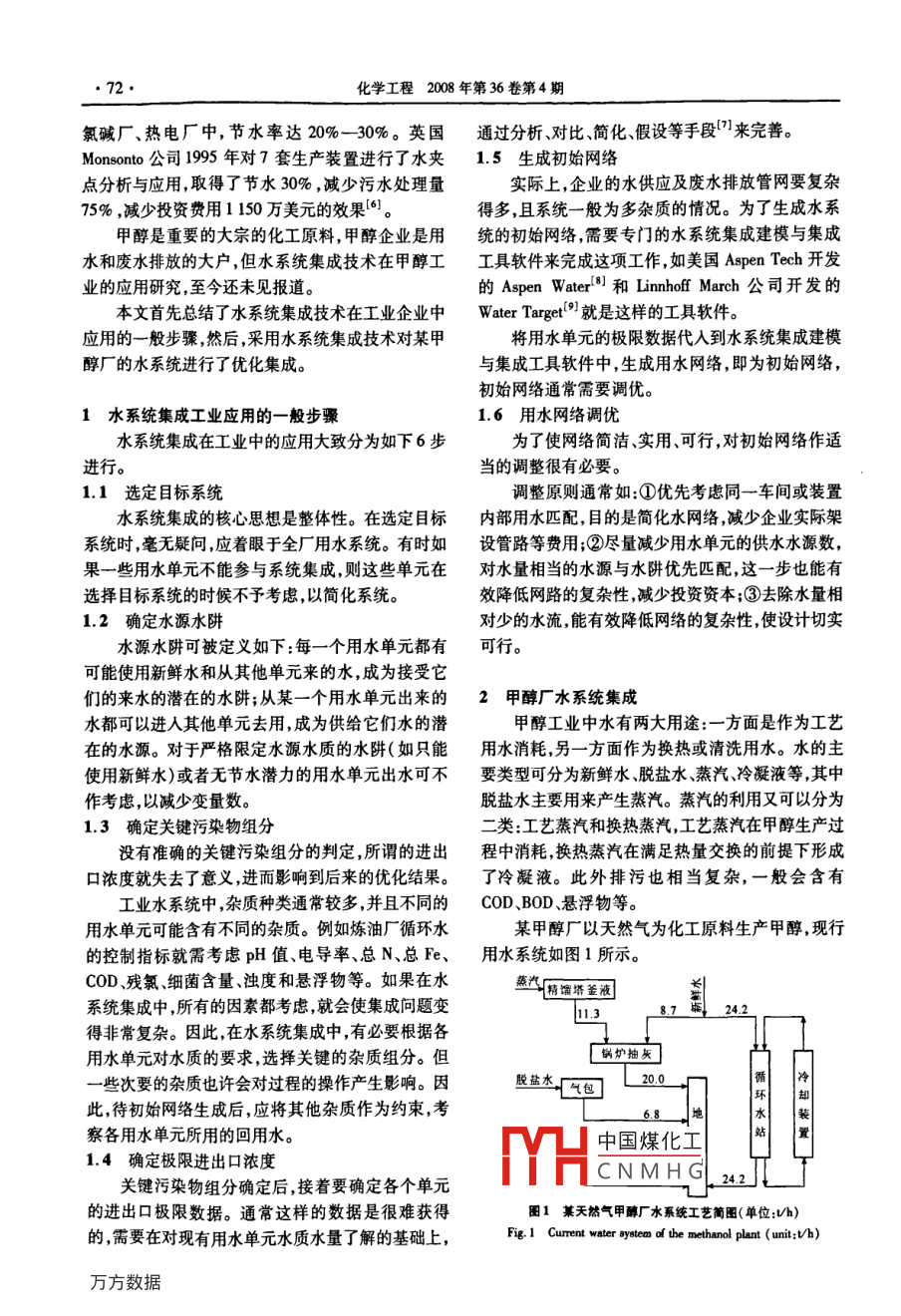 第36卷第4期化學(xué)工程v.36No.42008年4月CHEMICAL ENGINEERING( CHINA)水系統(tǒng)集成技術(shù)在甲醇廠的應(yīng)用王天華,馮霄(西安交通大學(xué)化學(xué)工程系,陜西西安710049)摘要:水系統(tǒng)集成技術(shù)是把整個工業(yè)用水系統(tǒng)作為一個整體來看待并考慮水質(zhì)、水量的分配從而使系統(tǒng)用水的重復(fù)利用率達到最大,同時廢水排放量最小。甲醇企業(yè)是用水和廢水排放的大戶將水系統(tǒng)集成技術(shù)應(yīng)用于甲醇工業(yè),具有重要意義。文中結(jié)合水系統(tǒng)集成技術(shù)的工業(yè)應(yīng)用現(xiàn)狀,總結(jié)了水系統(tǒng)集成技術(shù)在工業(yè)企業(yè)中應(yīng)用的般步驟,具體分為以下幾步:選定目標系統(tǒng),明確水源水阱,確定關(guān)鍵污染物組分和極限進出口濃度生成初始網(wǎng)絡(luò)和用水網(wǎng)絡(luò)調(diào)優(yōu)。并以某甲醇廠簡化的用水系統(tǒng)為實例,采用文中所提出的一般應(yīng)用步驟對用水網(wǎng)絡(luò)進行了優(yōu)化,獲得了新鮮水節(jié)水率達34.5%的節(jié)水效果關(guān)鍵詞:水系統(tǒng)集成;甲醇廠;夾點技術(shù)中圖分類號:TQ021.8文獻標識碼:A文章編號:10059954(2008)040071Application of water system integration technique in a methanol plantWANG Tian-hua, FENG XiaoDepartment of Chemical Engineering, Xi'an Jiaotong University, Xi'an 710049, Shaanxi Province, China)Abstract: Water system integration considers how to allocate water in a water system with the water utilizationprocesses in a plant treated as an organic whole, and thus increasing water reuse and decreasing wastewaterdischarge. Methanol industries consume a large amount of freshwater and discharge a large amount of wastewaterSo the application of water system integration in methanol plants is very important. Combined with the present statusof application of water system integration, the general steps about the application of water system integration inindustries were summarized. The major steps are as follows: selecting the system, specifying water sources andwater sinks, determining the key contaminants and the limiting inlet and outlet concentrations of contaminantsgenerating the initial network, and adjusting the water network. The application of water system integration in amethanol plant was discussed by using the steps proposed. At last, the optimal design of water utilization networkswas achieved by combination of water pinch analysis and mathematical programming, and a good result of saving34. 5% freshwater was obtainedKey words: water system integration; methanol plant; pinch technology隨著工業(yè)生產(chǎn)的發(fā)展,水資源匱乏及污染加劇水夾點技術(shù))與數(shù)學(xué)規(guī)劃法。已嚴重制約著經(jīng)濟的發(fā)展。與此同時,國內(nèi)許多工水夾點技術(shù)于20世紀90年代中期提出,主業(yè)企業(yè)的新鮮水單耗、廢水單排均比工業(yè)發(fā)達國家要適用于單雜質(zhì)用水系統(tǒng),是水系統(tǒng)集成技術(shù)中使大,節(jié)水減排已成為企業(yè)發(fā)展過程中不能回避的重用最為廣泛的方法之一。它是將用水單元操作簡化要問題之為一個從富雜質(zhì)過程流股到水流股之間的質(zhì)量傳遞水系統(tǒng)集成技術(shù)就是把整個用水網(wǎng)絡(luò)作為一個過程。水夾點可以給出用水系統(tǒng)的瓶頸。整體來對待,考慮如何分配各用水單元的水量和水數(shù)學(xué)規(guī)劃法2主要用于多雜質(zhì)復(fù)雜系統(tǒng)中質(zhì)使系統(tǒng)的重復(fù)利用率達到最大同時廢水排放量能有效地優(yōu)化用水網(wǎng)絡(luò),并且可以同時得到系統(tǒng)的達到最小。最優(yōu)中國煤化工的水網(wǎng)絡(luò)。水系統(tǒng)集成方法可分為兩大類,即圖示法(如CNMHG應(yīng)用于煉油廠的、基金項目:國家自然科學(xué)基金資助項目(20436040)作者簡介:王天華(1984-),男,碩士研究生,研究方向為水系統(tǒng)集成電話:(029)82668980;馮霄通訊聯(lián)系人,E-mail:xeng@mail.xju化學(xué)工程2008年第36卷第4期氯堿廠、熱電廠中,節(jié)水率達20%-30%。英國通過分析對比簡化假設(shè)等手段來完善。Monsanto公司1995年對7套生產(chǎn)裝置進行了水夾1.5生成初始網(wǎng)絡(luò)點分析與應(yīng)用,取得了節(jié)水30%,減少污水處理量實際上,企業(yè)的水供應(yīng)及廢水排放管網(wǎng)要復(fù)雜75%,減少投資費用1150萬美元的效果得多,且系統(tǒng)一般為多雜質(zhì)的情況。為了生成水系甲醇是重要的大宗的化工原料,甲醇企業(yè)是用統(tǒng)的初始網(wǎng)絡(luò)需要專門的水系統(tǒng)集成建模與集成水和廢水排放的大戶,但水系統(tǒng)集成技術(shù)在甲醇工工具軟件來完成這項工作如美國 Aspen Tech開發(fā)業(yè)的應(yīng)用研究,至今還未見報道的 Aspen Water0和 Linnhoff March公司開發(fā)的本文首先總結(jié)了水系統(tǒng)集成技術(shù)在工業(yè)企業(yè)中 Water Target就是這樣的工具軟件。應(yīng)用的一般步驟然后,采用水系統(tǒng)集成技術(shù)對某甲將用水單元的極限數(shù)據(jù)代入到水系統(tǒng)集成建模醇廠的水系統(tǒng)進行了優(yōu)化集成與集成工具軟件中,生成用水網(wǎng)絡(luò),即為初始網(wǎng)絡(luò),初始網(wǎng)絡(luò)通常需要調(diào)優(yōu)。1水系統(tǒng)集成工業(yè)應(yīng)用的一般步驟1.6用水網(wǎng)絡(luò)調(diào)優(yōu)水系統(tǒng)集成在工業(yè)中的應(yīng)用大致分為如下6步為了使網(wǎng)絡(luò)簡潔、實用、可行,對初始網