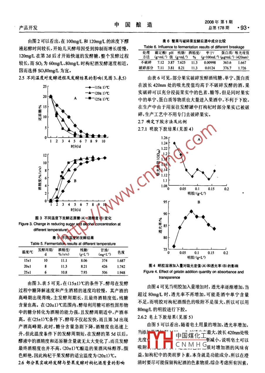 產(chǎn)品開(kāi)發(fā)中國(guó)釀造08年第1期總第178期·91·枸杞酒加工工藝研究安冬梅,易慶平(荊門職業(yè)技術(shù)學(xué)院生物工程分院,湖北荊門448000摘要:以栒杞為原料,采用控溫發(fā)酵技術(shù)研究了釀制栒杞果酒的工藝流程。通過(guò)對(duì)比試驗(yàn)確定最佳工藝參數(shù)為:發(fā)酵溫度為Q0±1)℃,發(fā)酵前果汁調(diào)糖至20%,用8mgL明膠直接澄清。并對(duì)工序中影響產(chǎn)品質(zhì)尅的其他因素如SO2的添加量、果實(shí)破碎發(fā)酵與整果發(fā)酵等進(jìn)行了探討關(guān)鍵詞:枸杞:果酒:工藝中圖分類號(hào):TS2627文獻(xiàn)標(biāo)識(shí)碼:B文章編號(hào):0254-5071(2008)01-0091-04Study on the production processing of medlar wineAN Dongmei, YI Qingpi(ingmen Vocational and Technical College, Jingmen 448000)Abstract: Taking medlar as main material, the production flow of medlar wine was studied by fermentation at controlled temperature. Bycomparative experiments, the optimum processing parameters were determined as follows: fermentation temperature was (20tDC, sugar concentrationof the juice before fermentation was adjusted to 20%, and 80 mg/L gelatin was used for clarification. Other factors in production, such as additionquantity of SO2 and crash degree of medlar which affected product quality, were also discussed.Key words: medlar: fruit wine: production processing寧夏枸杞含有多種活性物質(zhì),具有增強(qiáng)免疫力、防衰糖20‰酸6g幾添加酵母老、抗腫瘤、抗氧化等方面的藥理作用,是一種十分名貴枸杞子→分選→配料→調(diào)整成分→發(fā)酵→分離倒罐→后發(fā)酵→的中藥材,譽(yù)稱為我國(guó)的“道地藥材”。同時(shí),枸杞中含有澄清→過(guò)濾→調(diào)配→裝瓶胡蘿卜素維生素及微量礦質(zhì)元素等人類必需的營(yíng)養(yǎng)物1.5試驗(yàn)內(nèi)容質(zhì),是理想的藥用食用植物資源151不同初始酸度的選擇枸杞酒是以枸杞發(fā)酵而成的含酒精飲料,其酒精度低,保將分選好的枸杞子按1:6配料,用酒石酸將酸度調(diào)整留了構(gòu)杞原有的糖類氨基酸和礦物質(zhì)等較以糧食酒為為5gL、6gL、7gL、8gL進(jìn)行發(fā)酵,發(fā)酵條件為接種量原料的蒸餾酒有較高的營(yíng)養(yǎng)價(jià)值。由于枸杞酒符合當(dāng)今酒07g1,溫度(20±l)℃,So80mg,糖度20%,每天測(cè)定類消費(fèi)所侶導(dǎo)的以低度酒取代高度酒果酒取代糧食酒的pH值及滴定酸變化潮流,因此,發(fā)展枸杞酒酒業(yè)具有廣闊的市場(chǎng)前景。152不同配比對(duì)枸杞酒質(zhì)量的影響1材料與方法將分選好的枸杞子,按141:5、16與水混合進(jìn)行發(fā)酵,11材料發(fā)酵條件為接種量07gL,酸度選擇15中最佳酸度溫度寧夏產(chǎn)中寧構(gòu)杞(20±1)℃,SO8mgL,糖度20,發(fā)酵結(jié)束后分別測(cè)定果酒12主要儀器的酒精度、殘?zhí)恰⒈戎?、滴定酸pH值甘油、色度、蛋白質(zhì)、單寧分光光度計(jì),電冰箱,發(fā)酵罐,干燥箱,酒精計(jì),磁力1.53S02添加量選擇攪拌器等。分選枸杞按152中最佳配料進(jìn)行發(fā)酵,SO2添加量13分析方法參照分別為60mgL,80mgL-100mg120mgL,其他條件與總糖、還原糖的測(cè)定:斐林試劑法;酒精度:參照1.51相同,每天測(cè)定還原糖變化GBT1503894《葡萄酒果酒通用試驗(yàn)方法》:總酸:(GB/1:54不同發(fā)酵溫度對(duì)發(fā)酵進(jìn)程及發(fā)酵結(jié)果的影響T503894)酸堿滴定法(以酒石酸計(jì));pH值測(cè)定:pH-0A分選枸杞,按1.52中最佳配料進(jìn)行發(fā)酵,設(shè)發(fā)酵溫?cái)?shù)字酸度計(jì);澄清度:在波長(zhǎng)733m處用cm比色杯測(cè)度為(15±1)℃、(20+1)℃、(25±1)℃,發(fā)酵條件同上,每24h定透光率(%,蒸餾水作空白:色度:用722型可見(jiàn)分光光測(cè)試還原糖、酒精度和溫度的變化,發(fā)酵結(jié)束后測(cè)定酒精度計(jì)在波長(zhǎng)420m處用cm比色杯測(cè)定吸光度值(A值),度、可溶性固形物滴定酸pH值、甘油。蒸餾水作空白;單寧:高錳酸鉀氧化法;蛋白質(zhì):考馬1.5VT苗“對(duì)枸杞酒質(zhì)量的影響斯亮藍(lán)G-250分別將枸杞果實(shí)部分4生產(chǎn)工藝流程破碎CNMH上.發(fā)酵結(jié)束后,測(cè)定收稿日期:200605-10作者簡(jiǎn)介:安冬梅(1980),女,講師研究方向?yàn)楣麑?shí)發(fā)育生2008No.192· Serial No178China BrewingProduct Development酒精度、還原糖、單寧、pH值、可滴定酸、蛋白質(zhì)。某些有機(jī)酸被吸收代謝而導(dǎo)致酸度下降,發(fā)酵開(kāi)始分泌156下膠方法及比列檸檬酸,后期被酵母吸收。 ROMOM(1999)等的研究認(rèn)為,明膠與皂土用量設(shè)計(jì)見(jiàn)表1。發(fā)酵過(guò)程中各種有機(jī)酸的分泌與微生物的生長(zhǎng)有關(guān)表1明膠與皂土下膠用量ⅴAsY(193年)等報(bào)道,發(fā)酵后蘋果酒的滴定酸上升了Table 1. Addition quantity of gelatin and bentonite2g-2.5g,所有這些都有助于解釋圖中的現(xiàn)象。由圖IB看出,與發(fā)酵過(guò)程中滴定酸的變化相對(duì)應(yīng),pH實(shí)驗(yàn)號(hào)/(mg"L)20406080100120140值在發(fā)酵過(guò)程中也發(fā)生著有規(guī)律的變化,在發(fā)酵初期,隨皂土/(mgL20406080100120140著酵母產(chǎn)酸量的增多,發(fā)酵液pH值迅速下降并于發(fā)酵2結(jié)果與討論3d后降至最低值,這與 CYZYCKI1999年)的研究相似。21枸杞基本成分分析(見(jiàn)表2)到達(dá)最低值后,隨著發(fā)酵的繼續(xù),部分滴定酸被利用發(fā)酵液滴定酸度降低pH值回升,最后穩(wěn)定在一定范圍內(nèi)表2